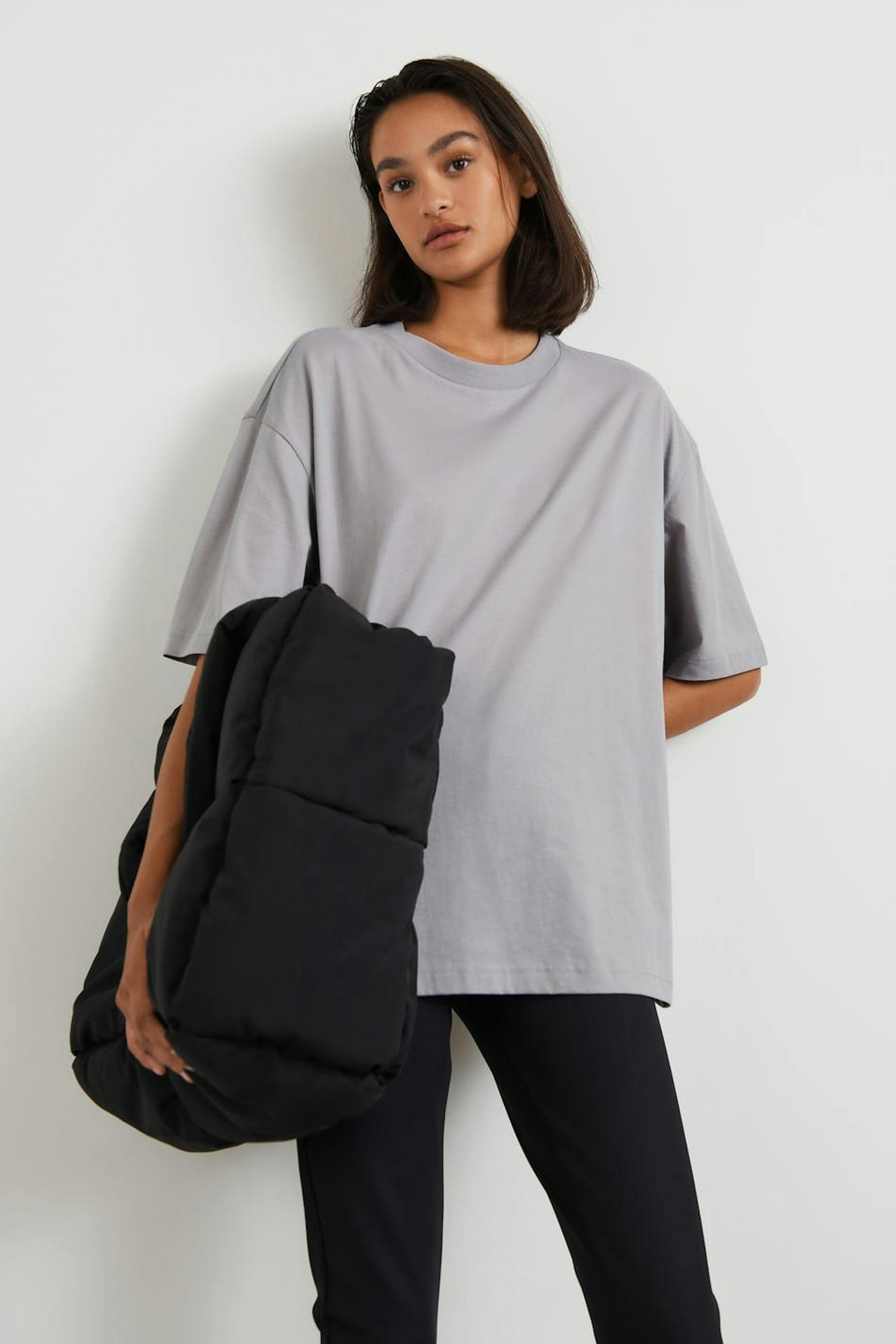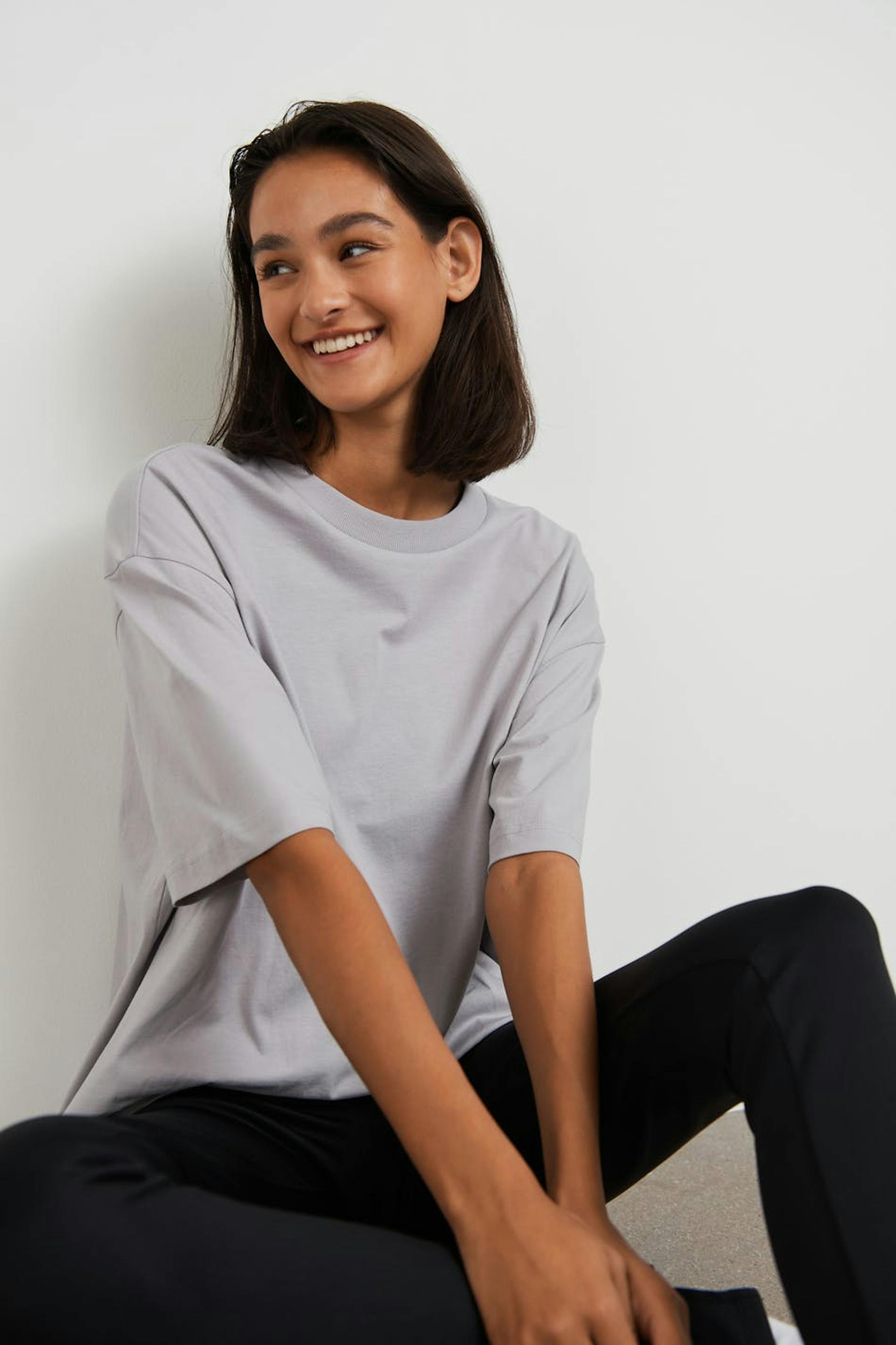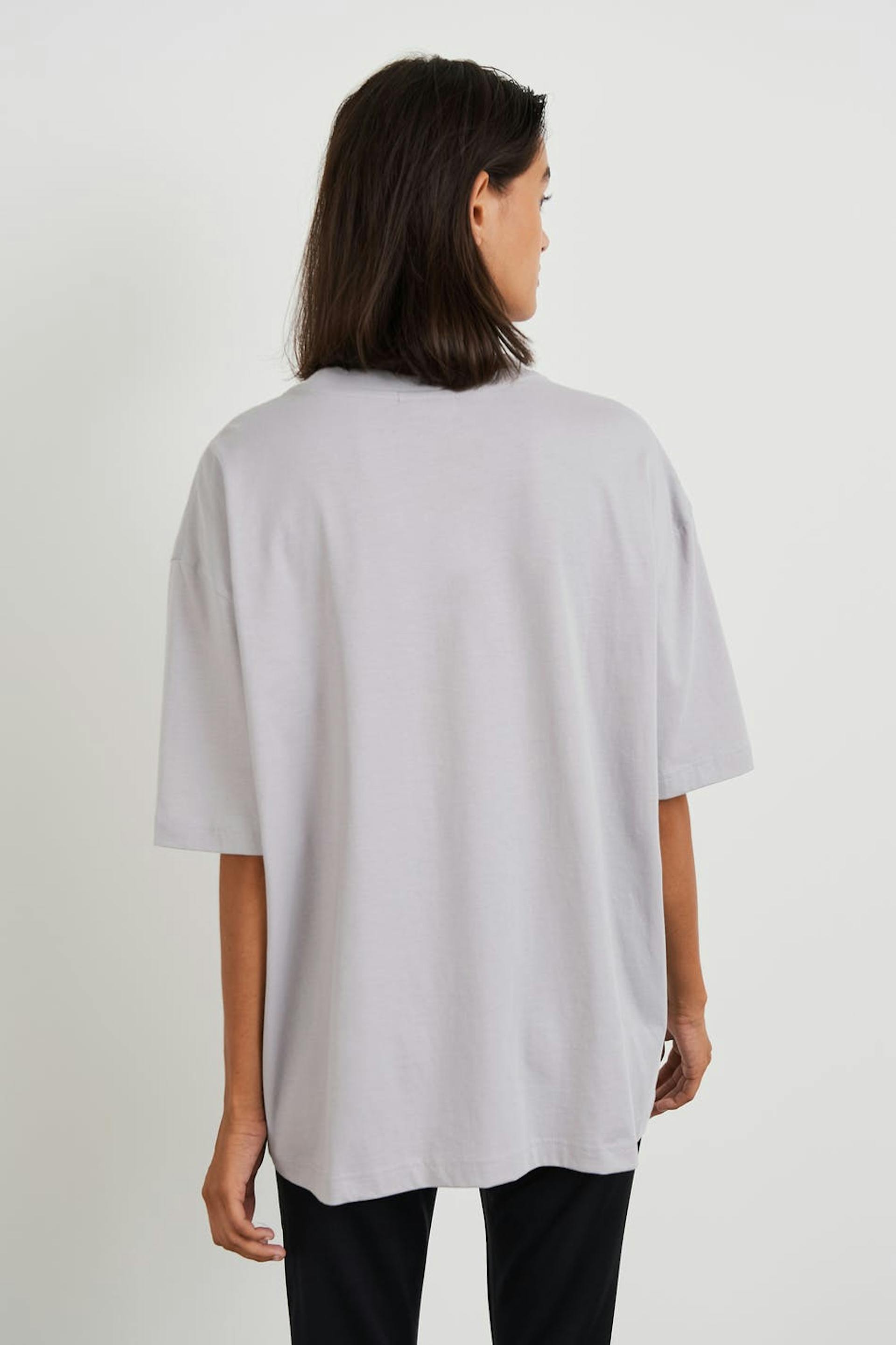 T-paita ylisuuri istuvuudella. T-paita on hopea ja siinä on pehmeä materiaali puuvillasta. Siinä on ribbed mansetti kaula-aukossa.