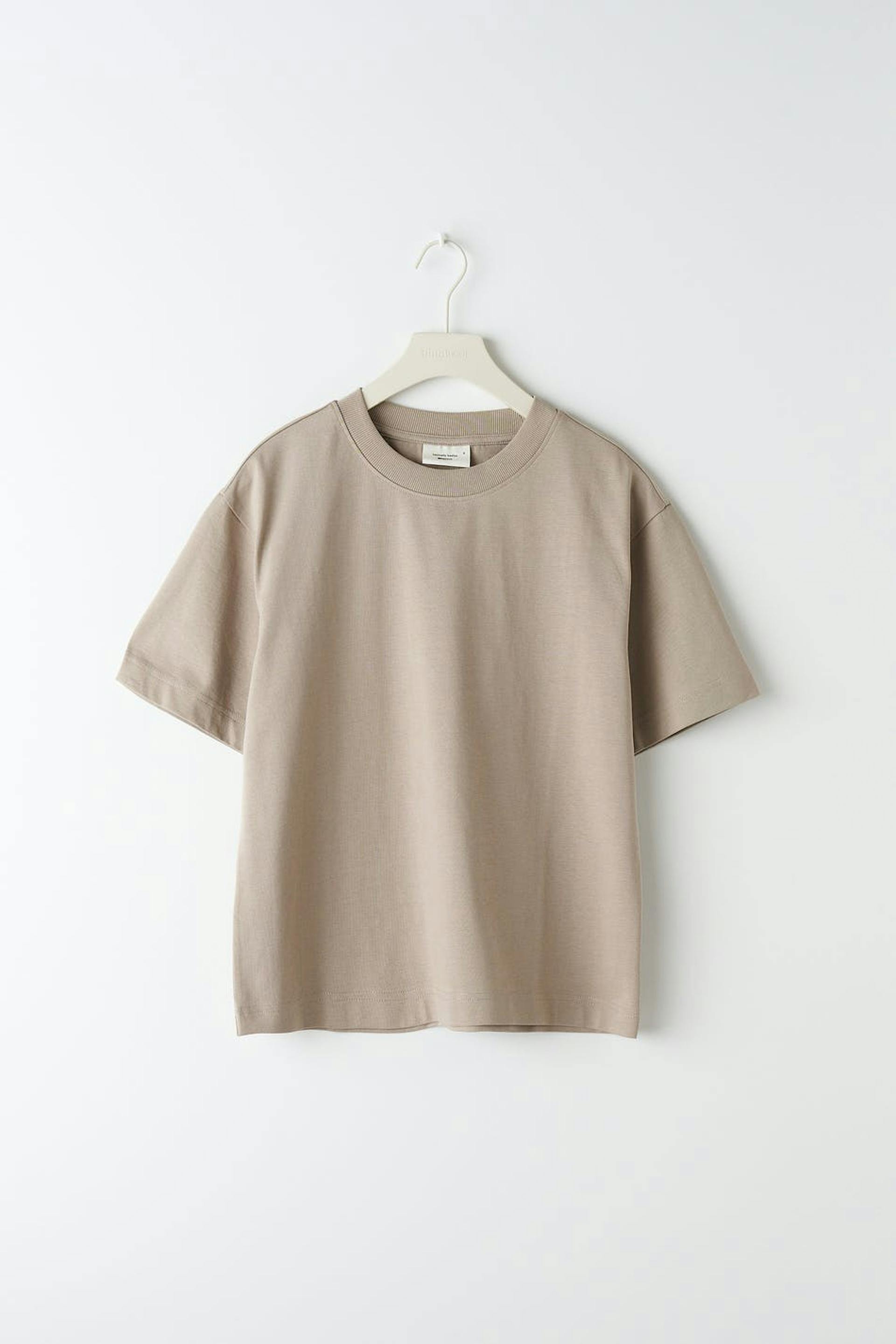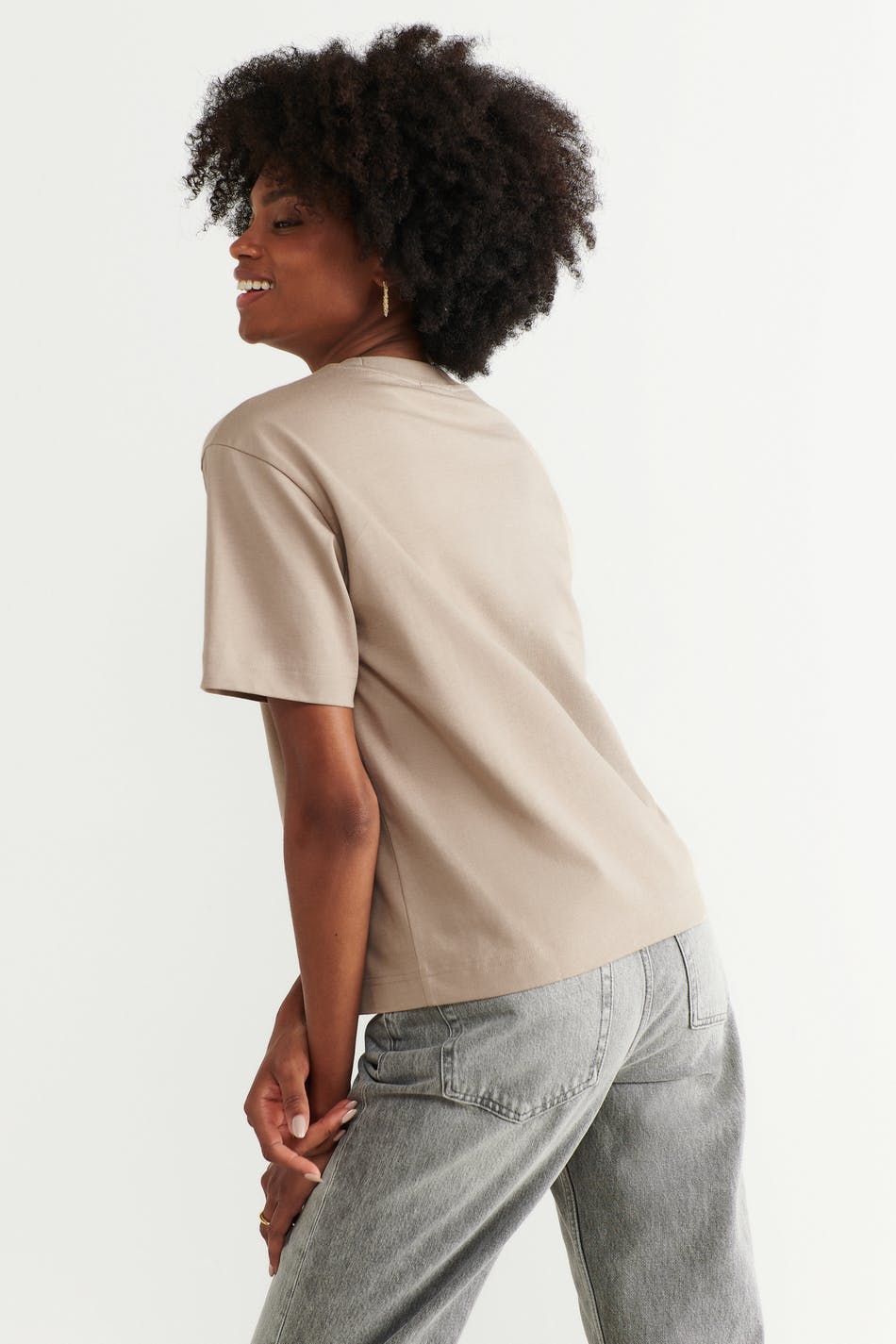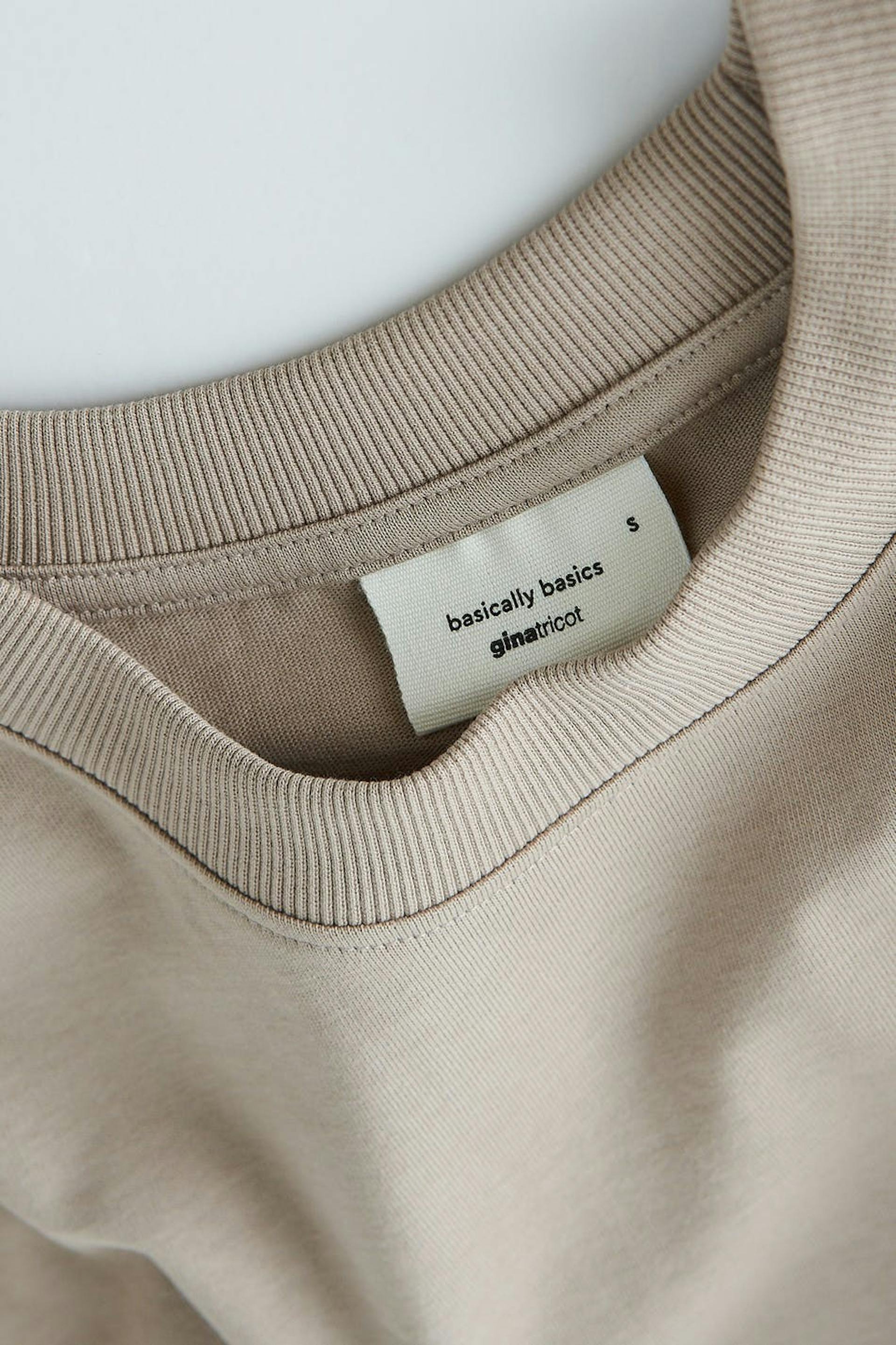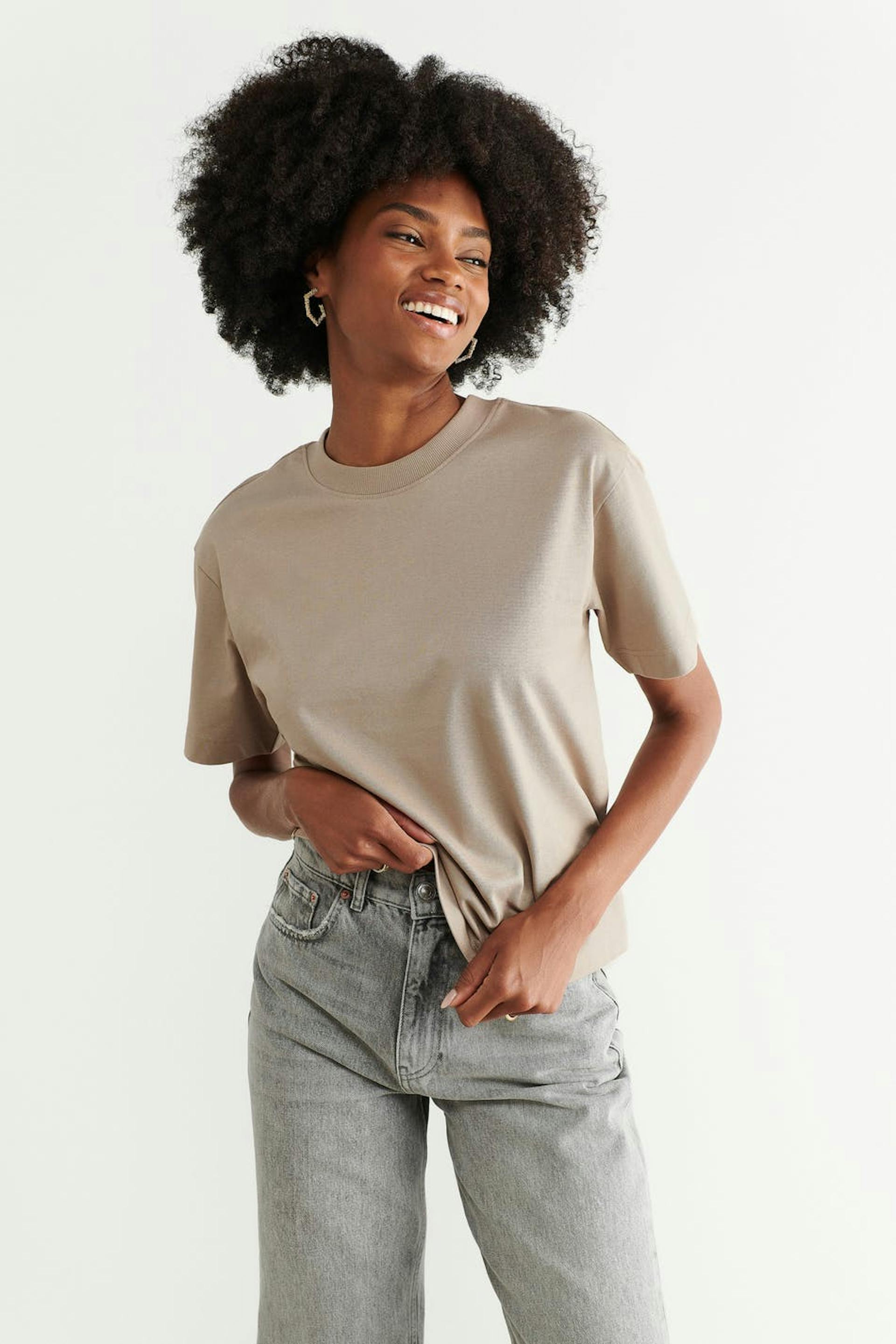 T-paita oversized-mallilla. T-paita on beige ja siinä on pehmeä, paksu materiaali puuvillasta. Siinä on ribbiresori kaula-aukossa.