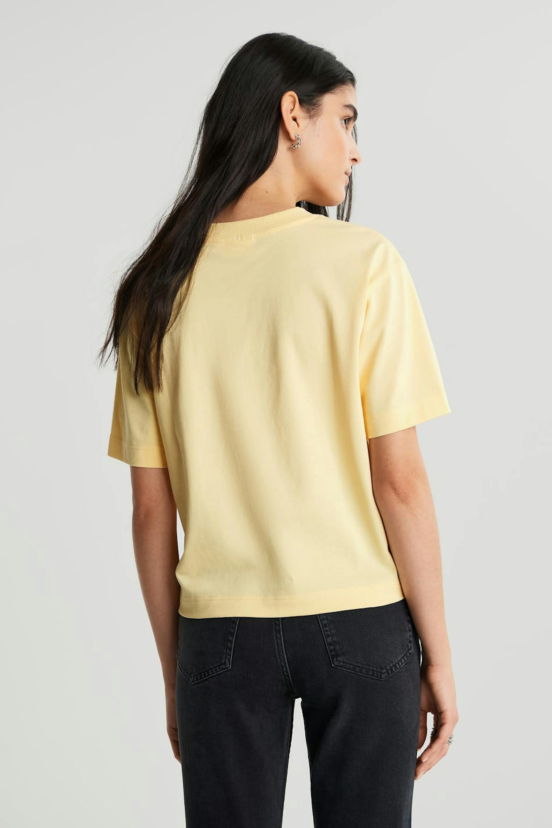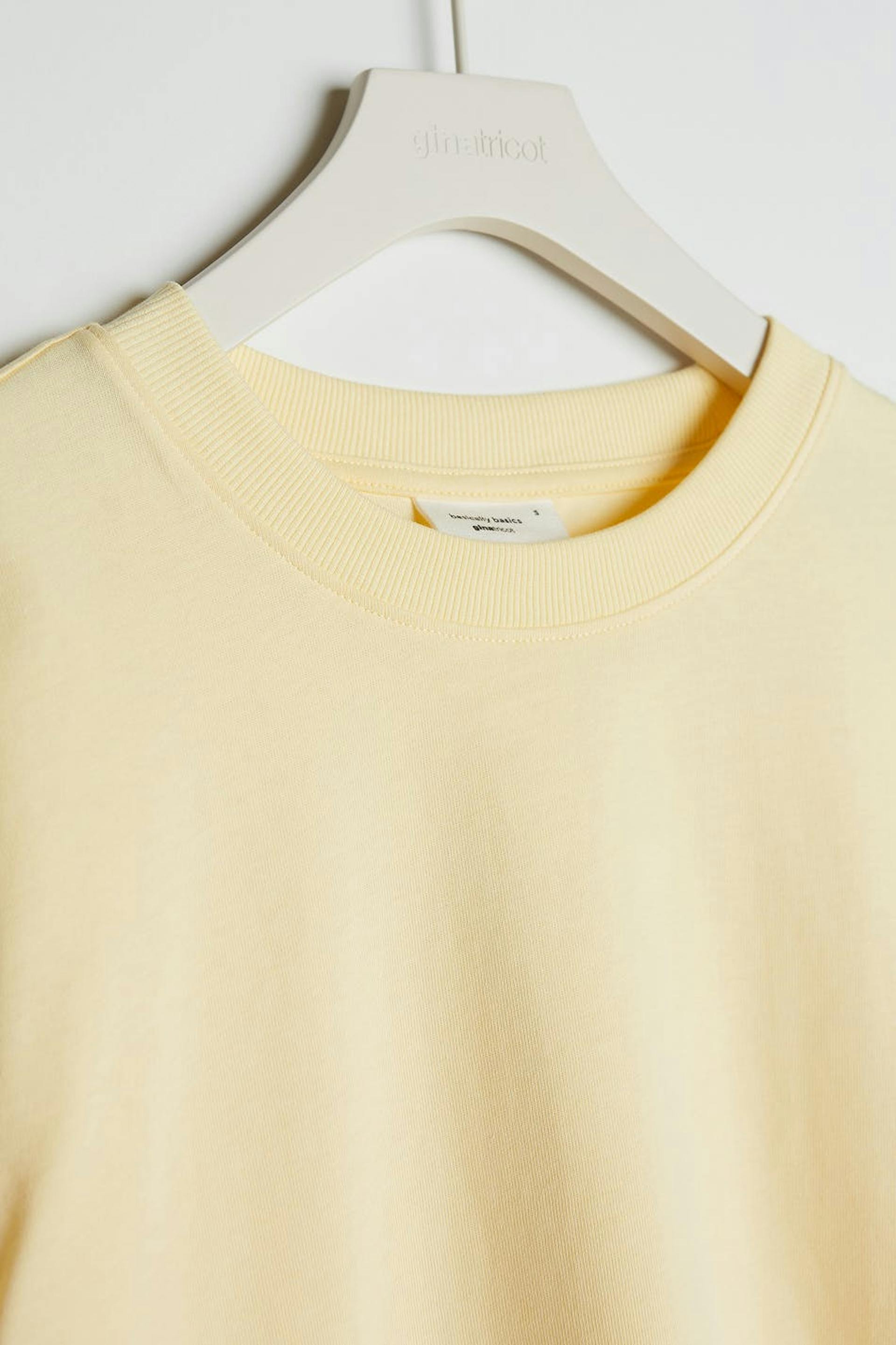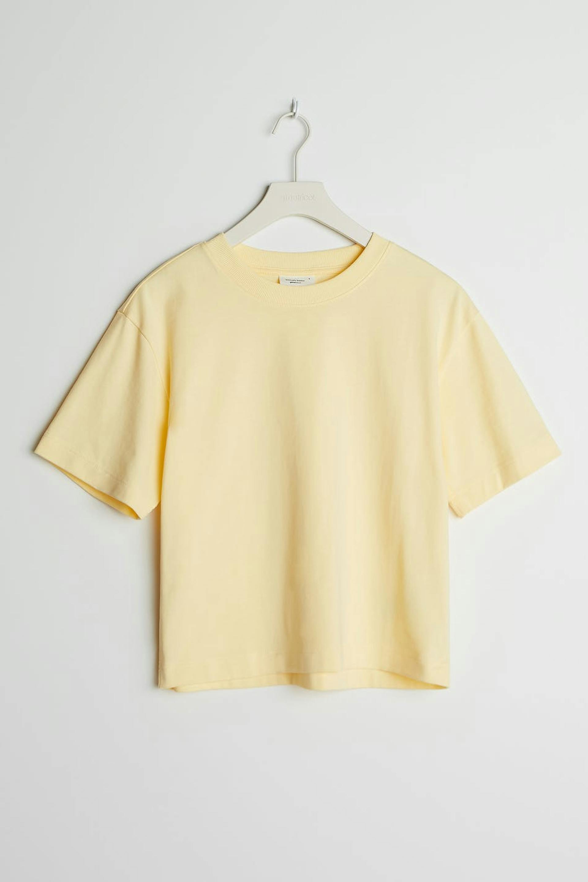 T-paita ylisuuri istuvuudella. T-paita on keltainen ja siinä on paksu materiaali. Siinä on ribbed mansetti kaula-aukossa.