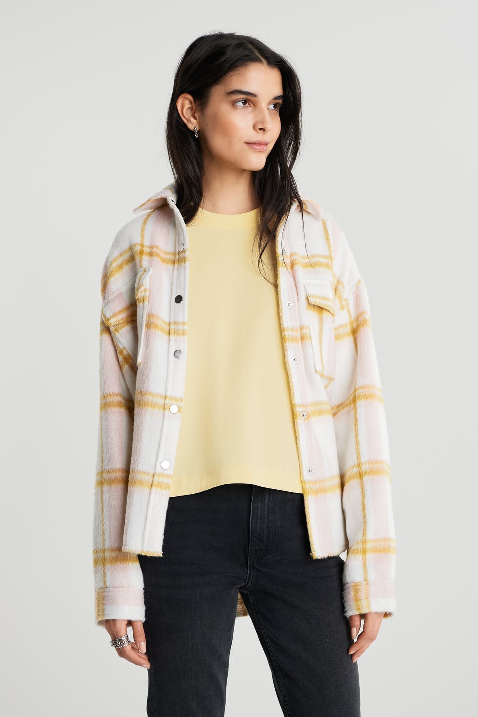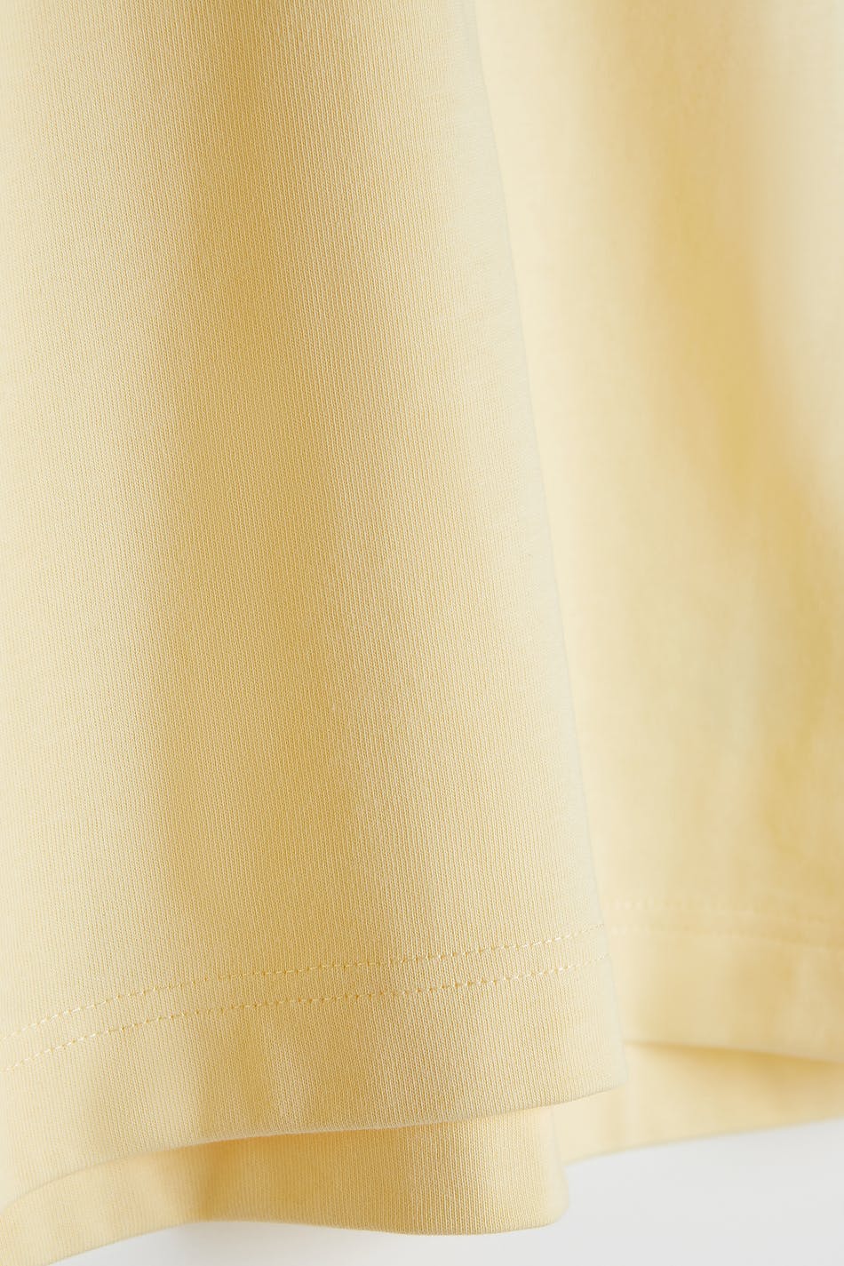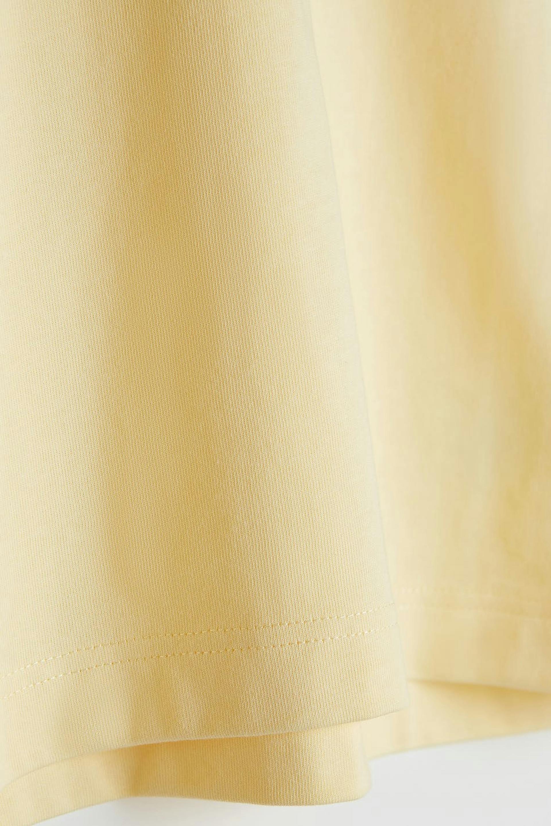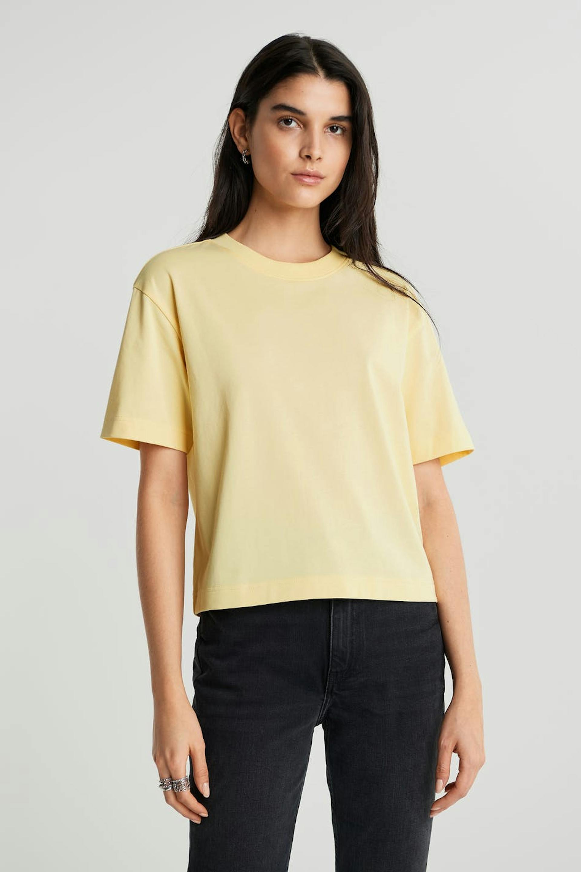 T-paita ylisuuri istuvuudella. T-paita on keltainen ja siinä on paksu materiaali. Siinä on ribbed mansetti kaula-aukossa.