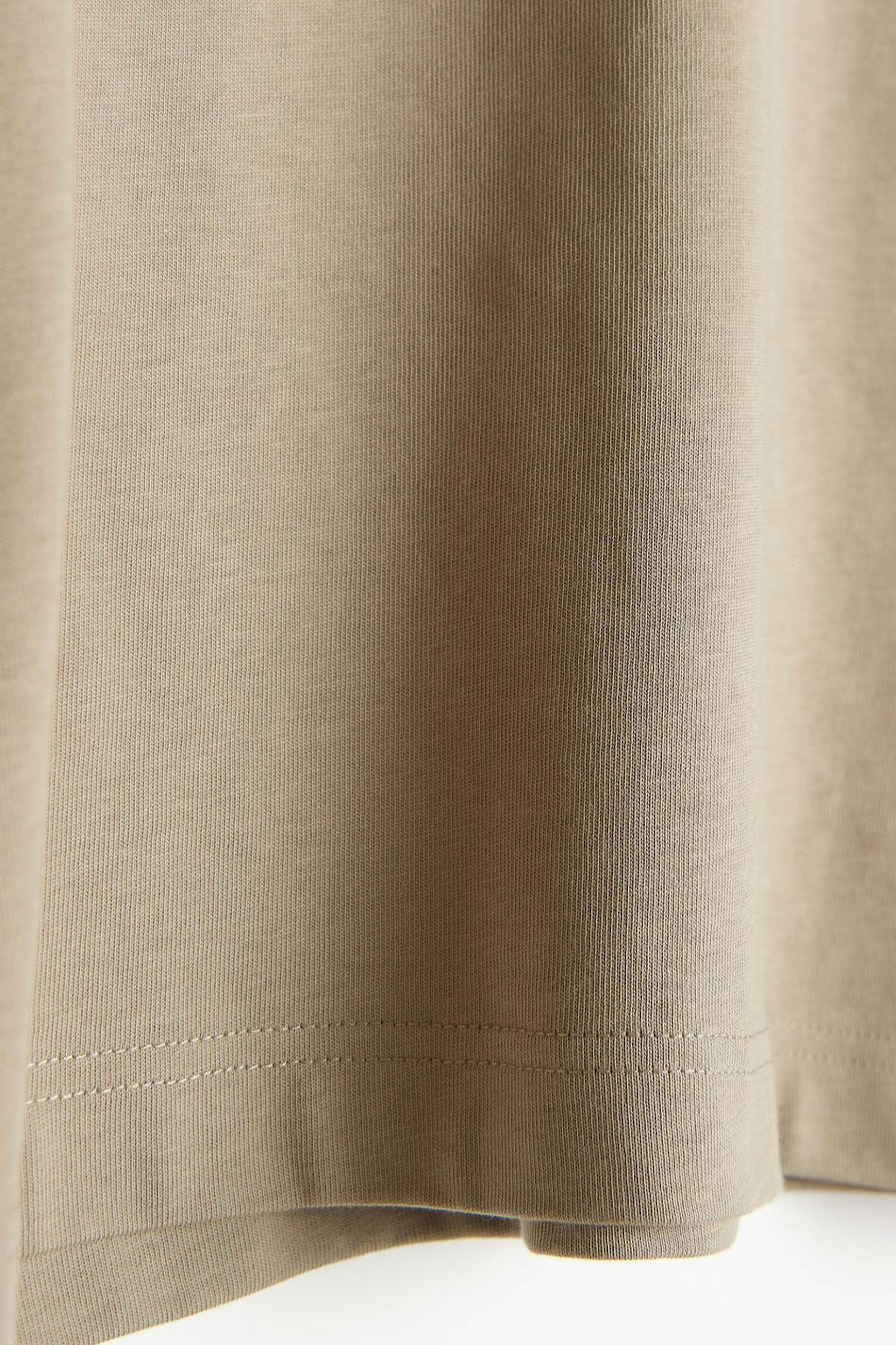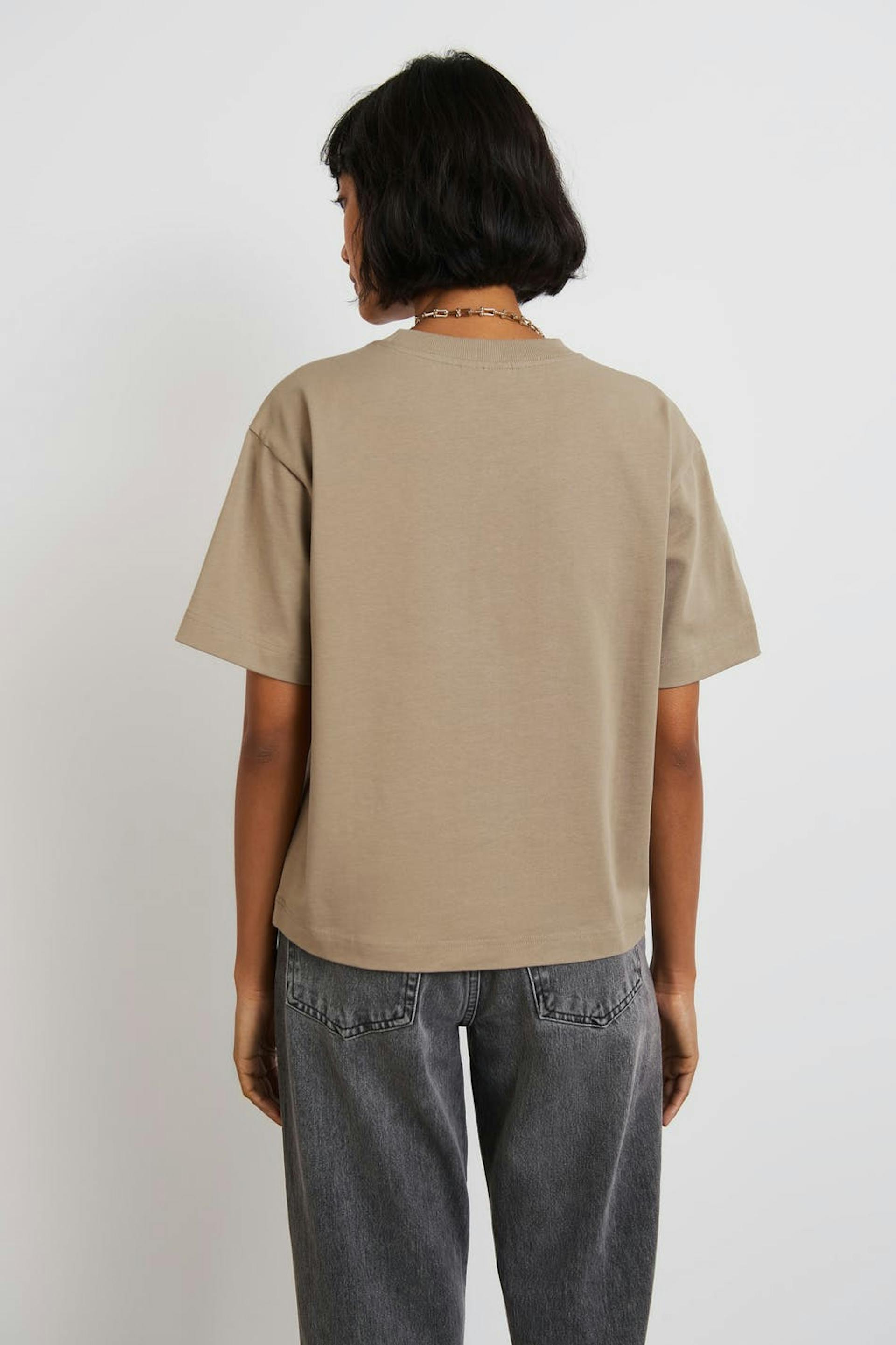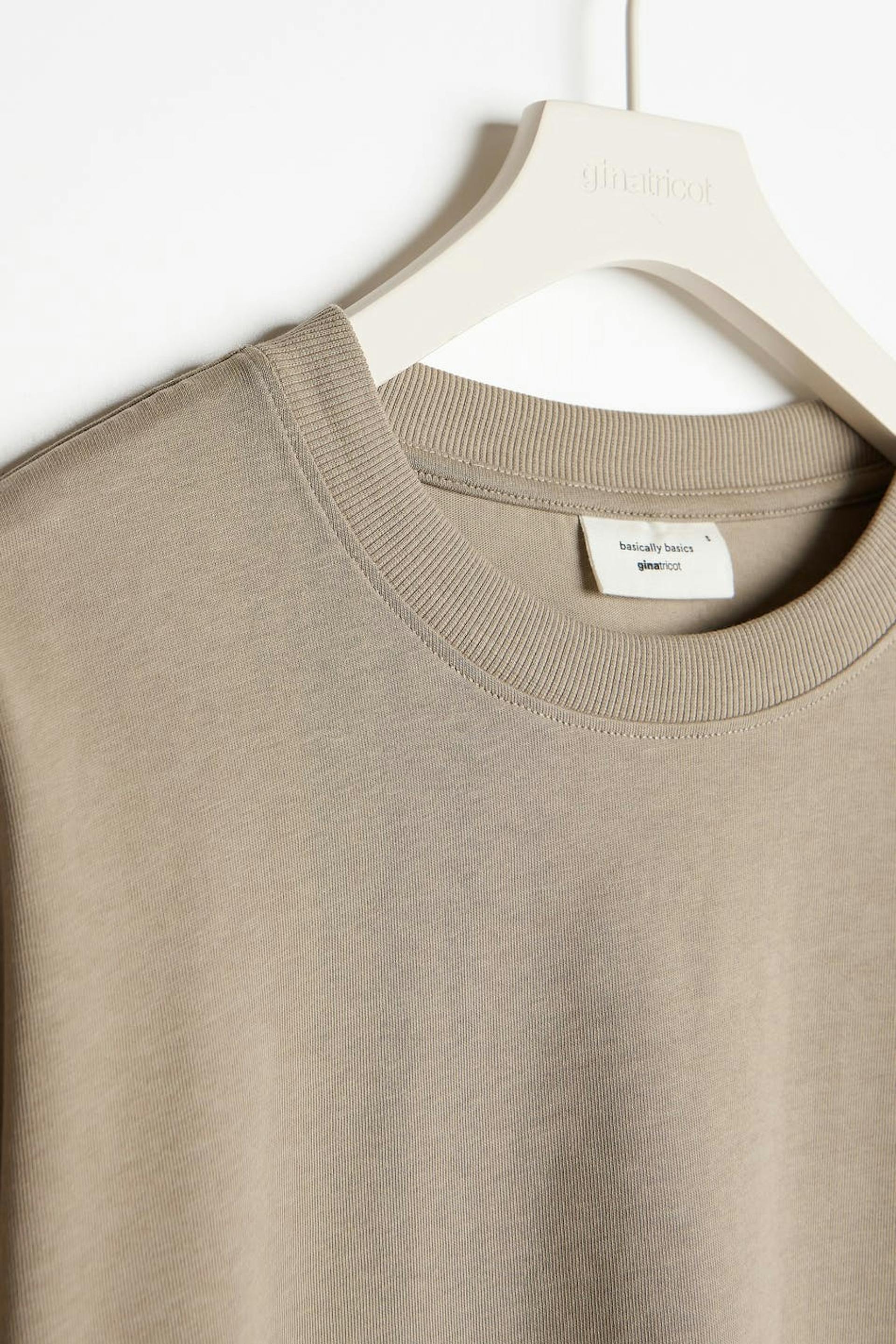 T-paita oversized-mallilla. T-paita on beige ja siinä on pehmeä materiaali puuvillasta. Siinä on ribbiresori kaula-aukossa.