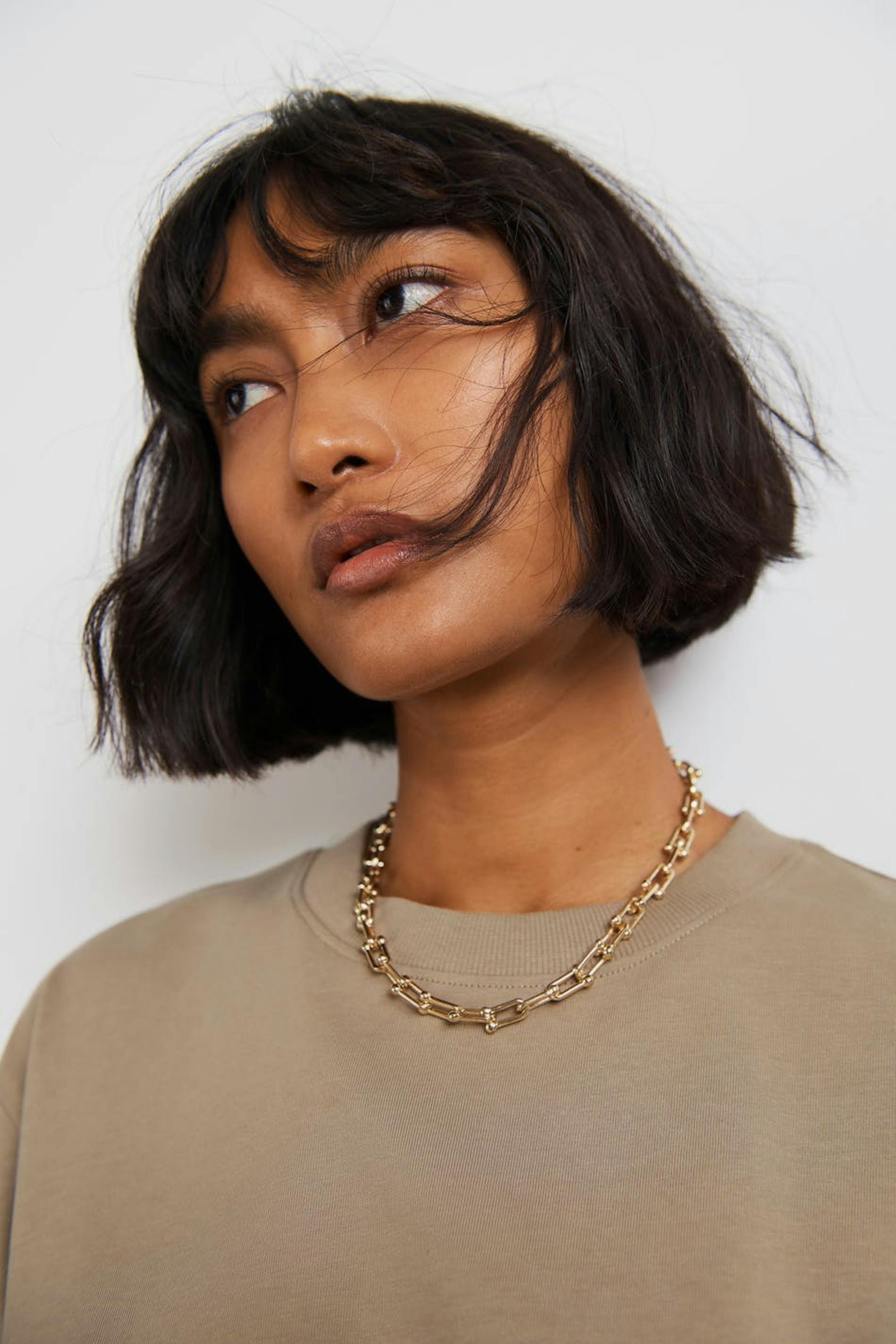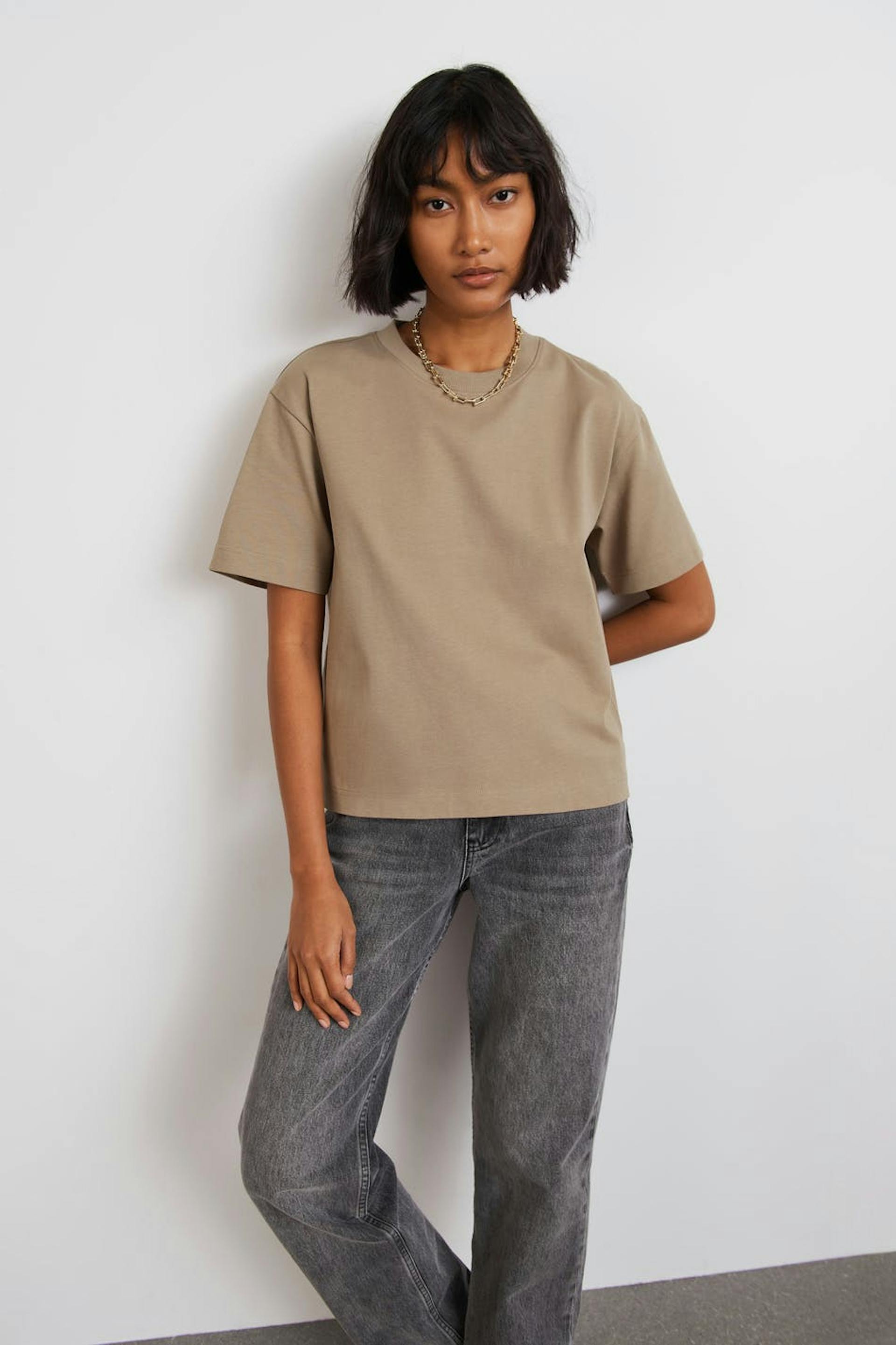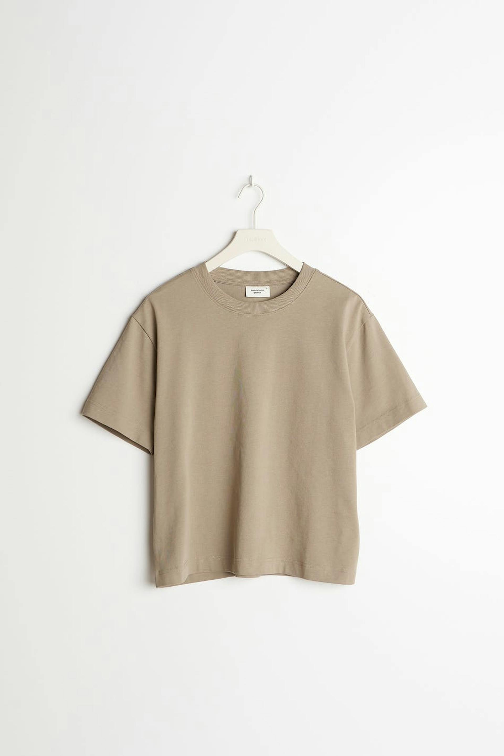 T-paita oversized-mallilla. T-paita on beige ja siinä on pehmeä materiaali puuvillasta. Siinä on ribbiresori kaula-aukossa.
