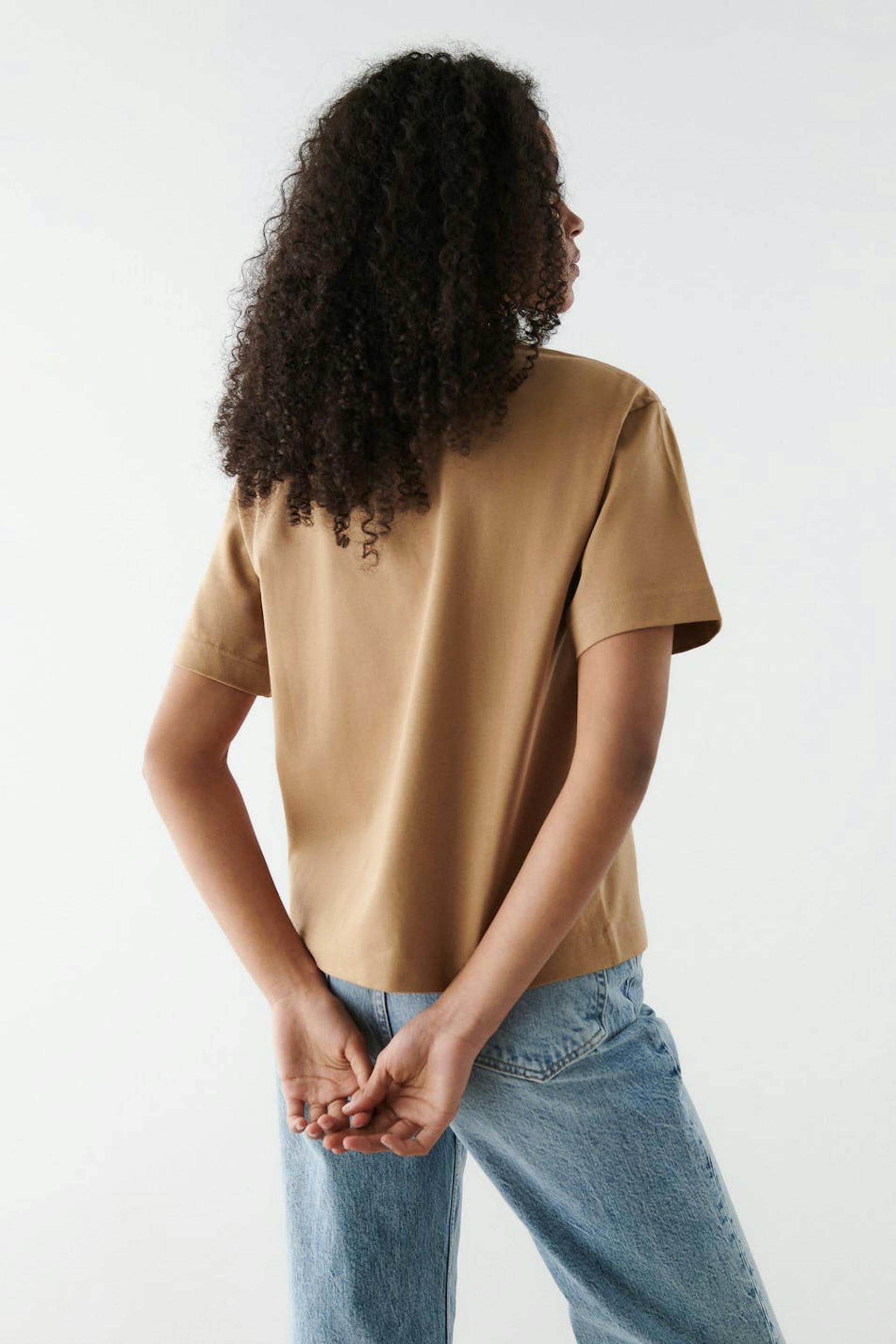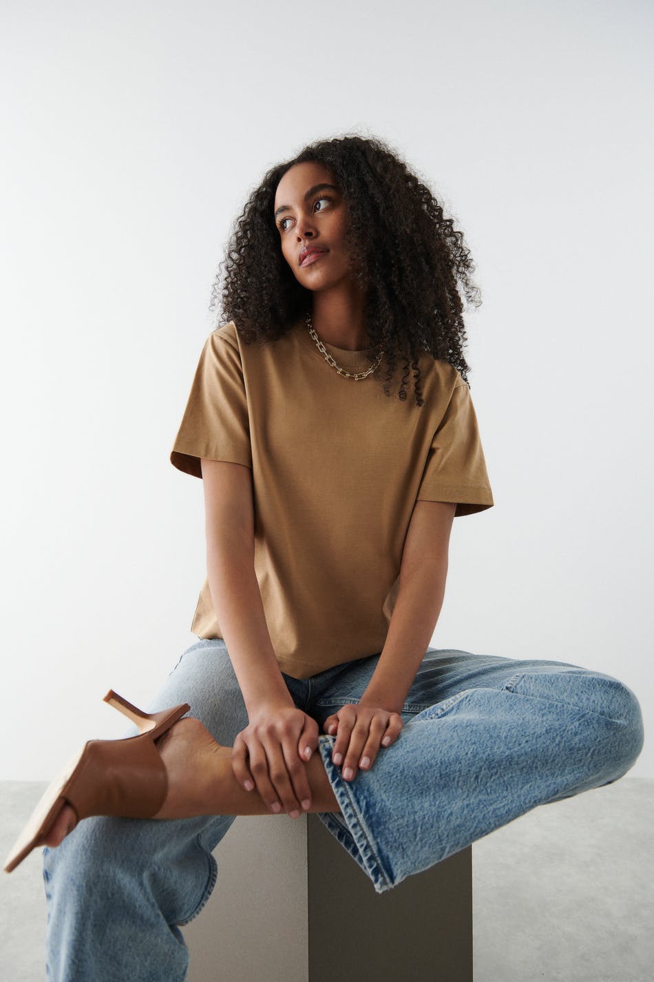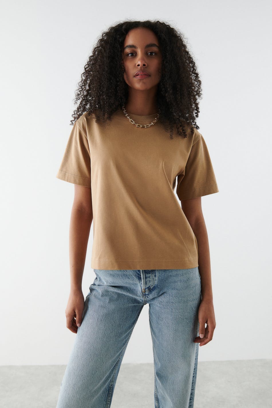 T-paita oversized-mallilla. T-paita on beige ja siinä on pehmeä, paksu materiaali puuvillasta. Siinä on ribbiresori kaula-aukossa.