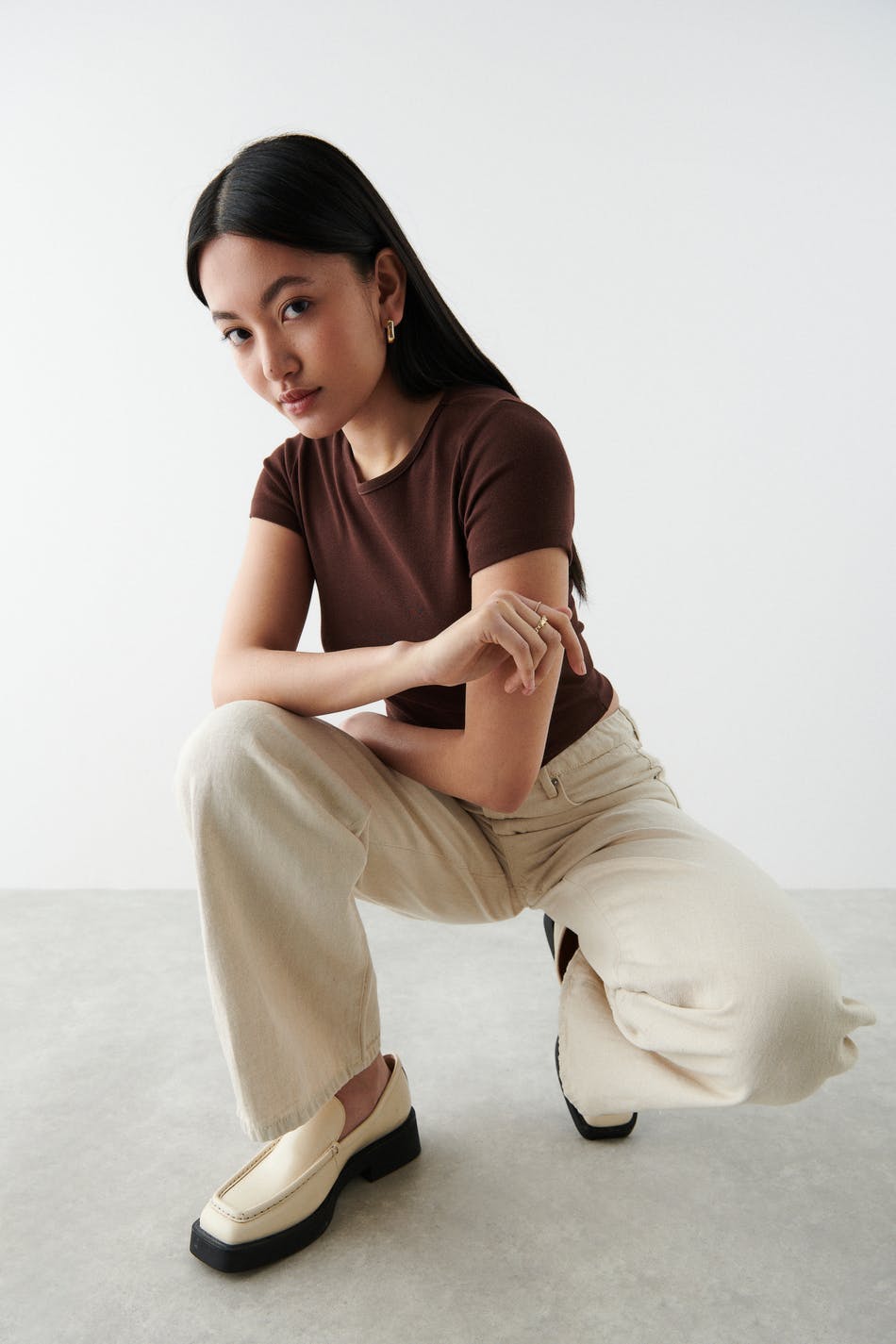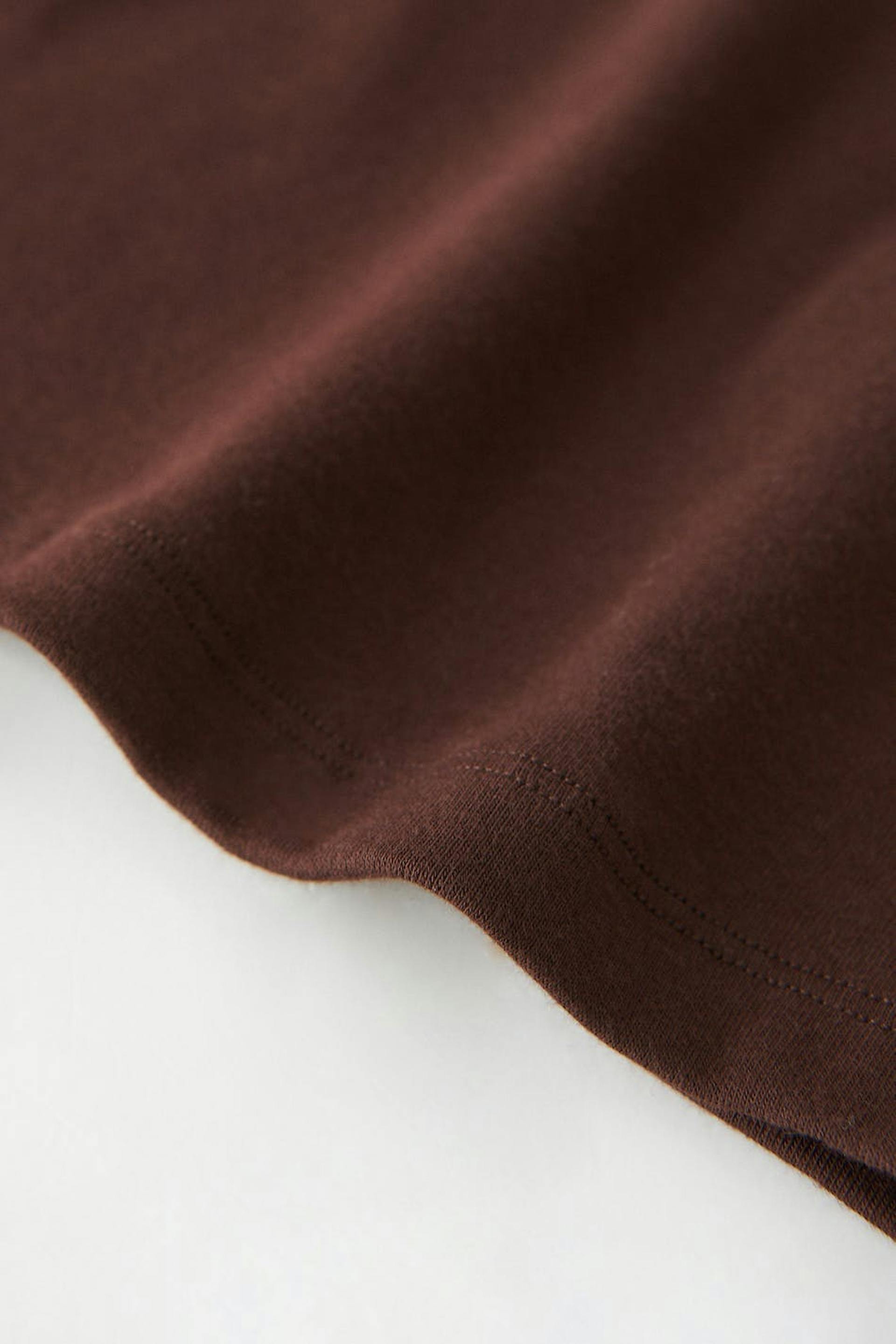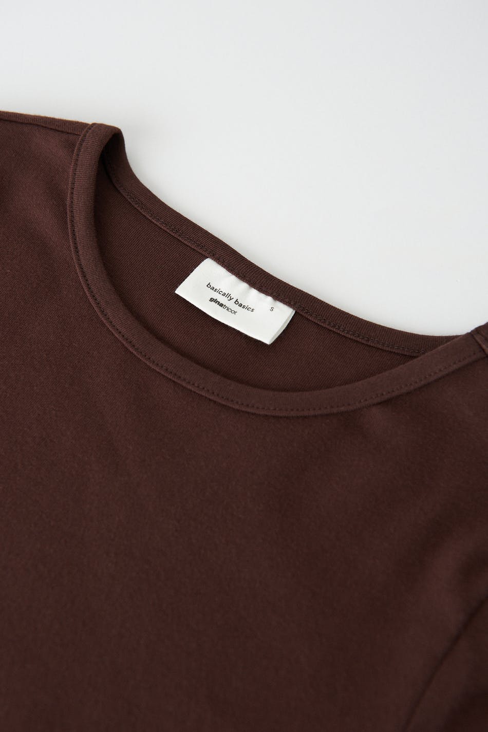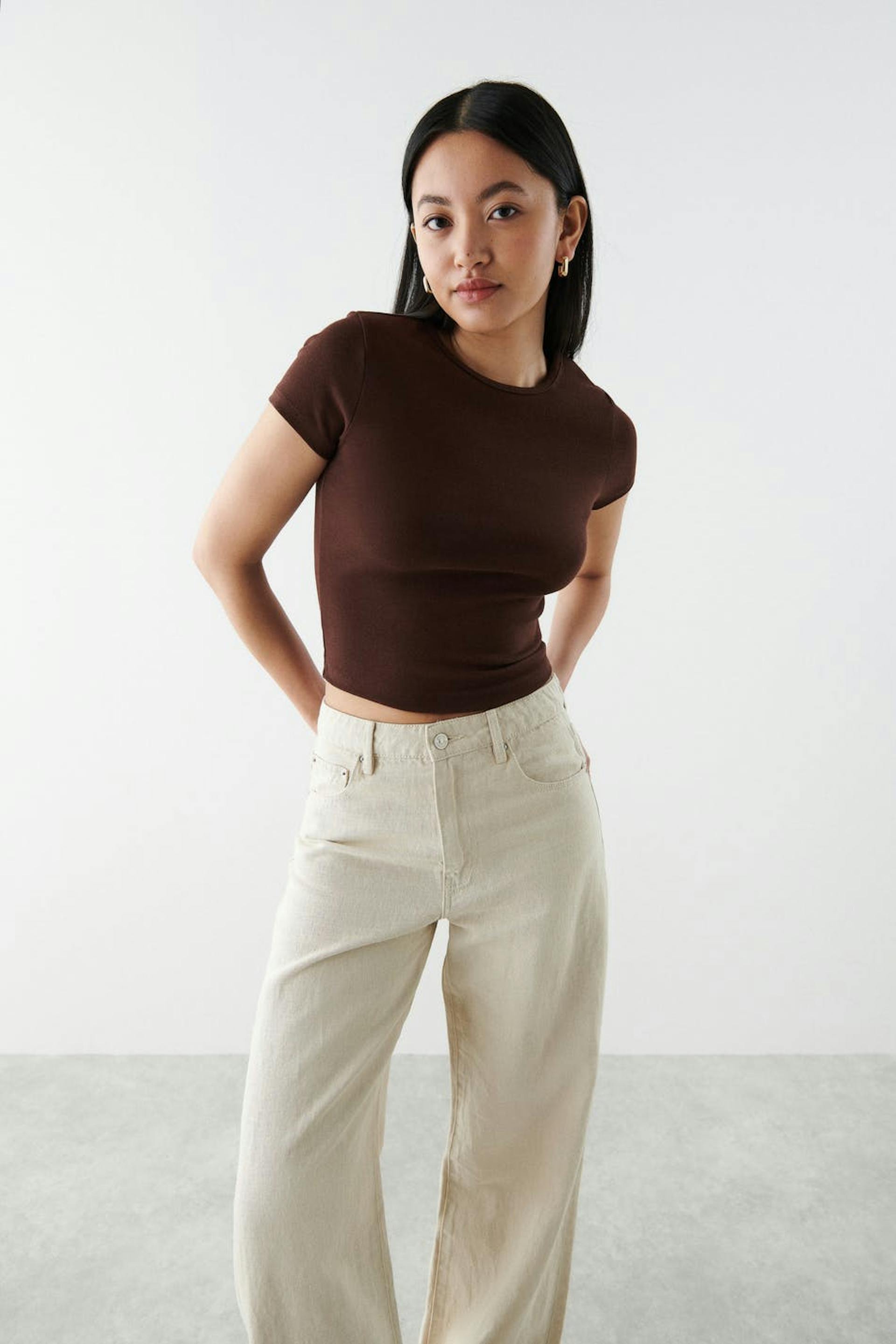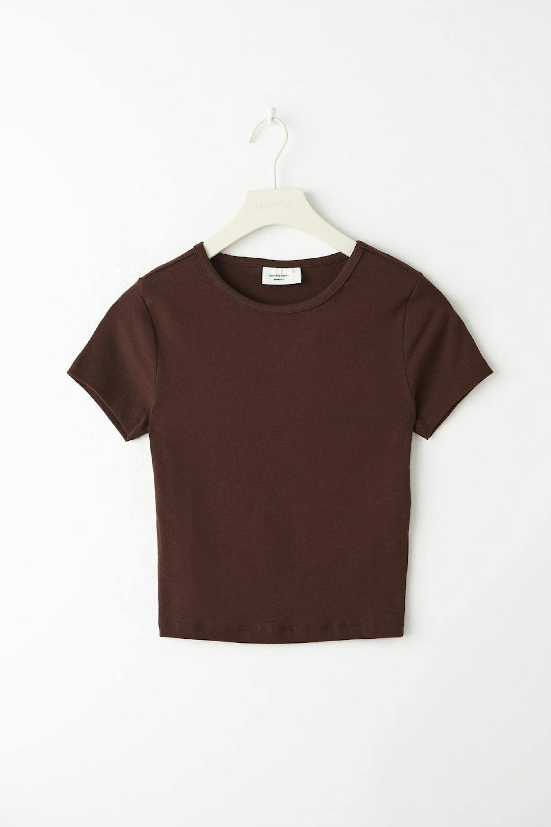 Lyhythihainen trikootoppi vartalonmyötäisellä istuvuudella. Trikootoppi on ruskea ja siinä on cropattu pituus.