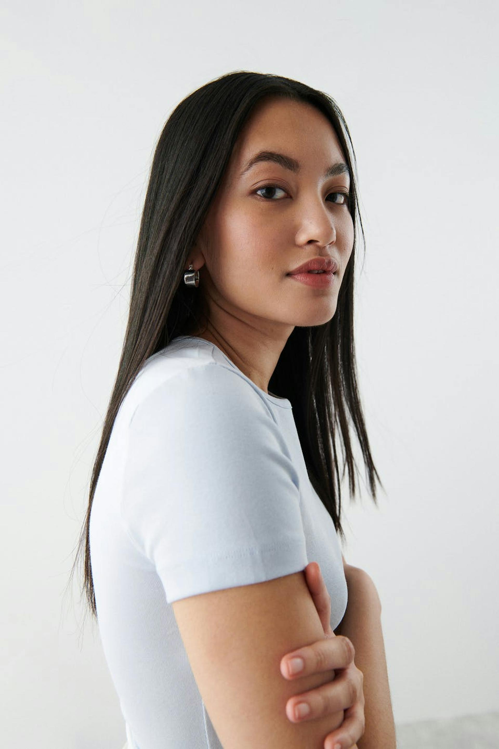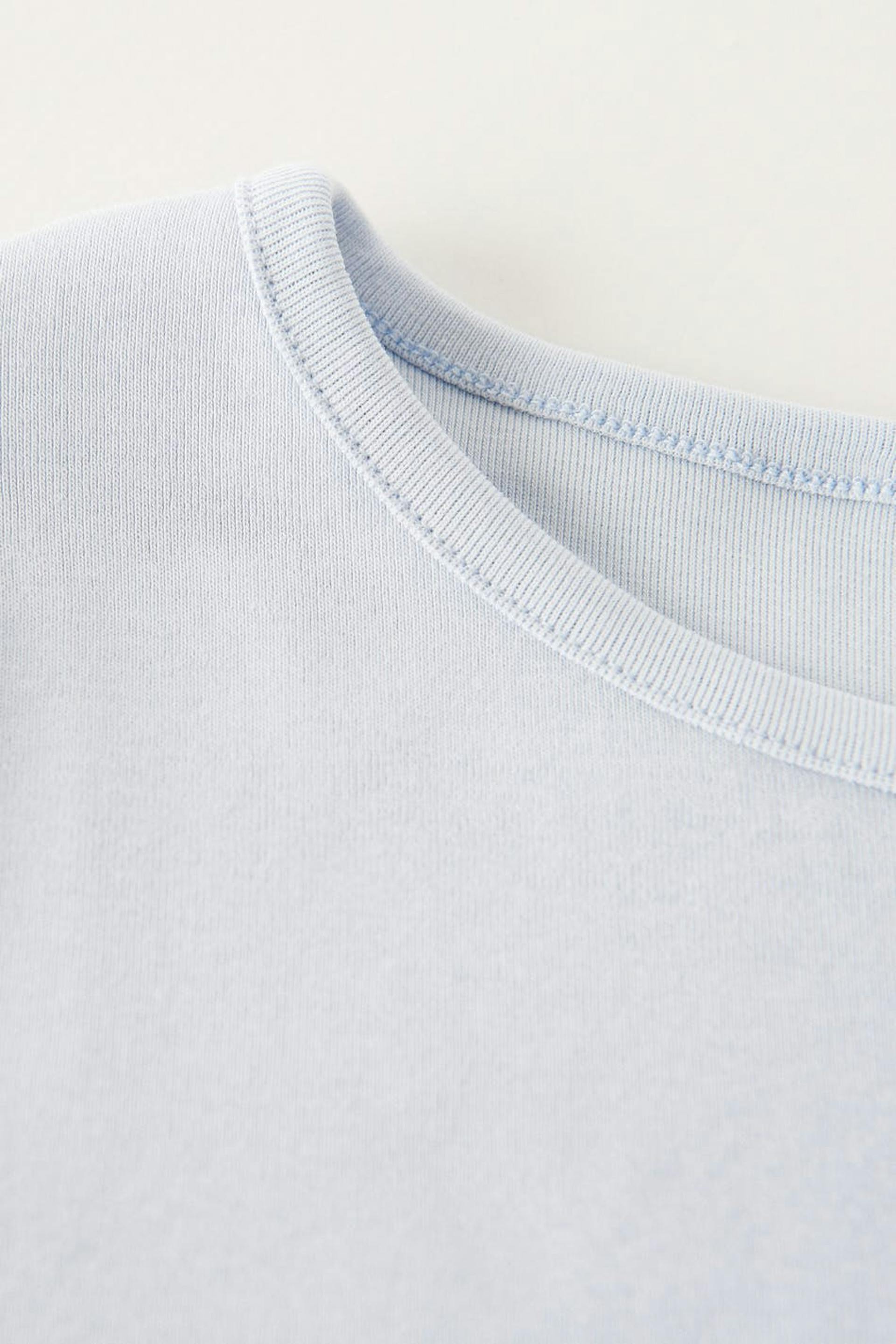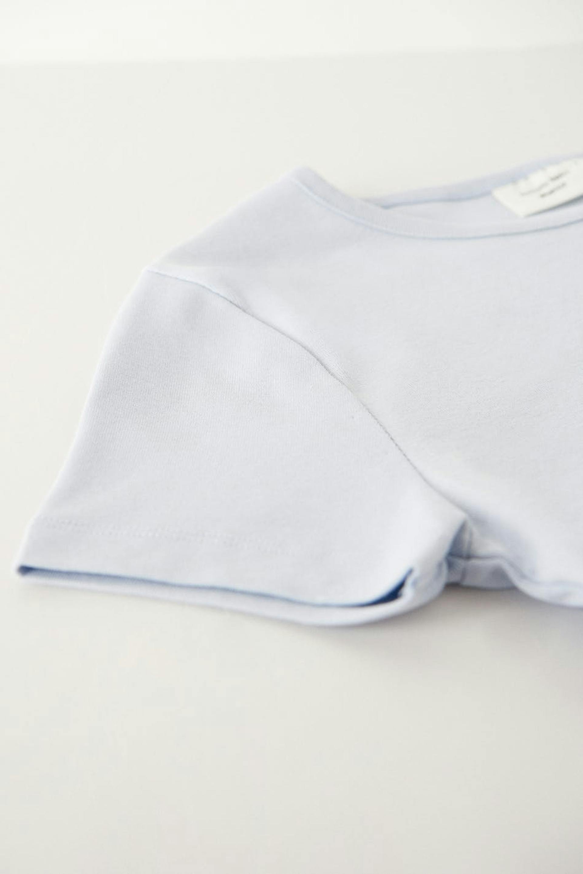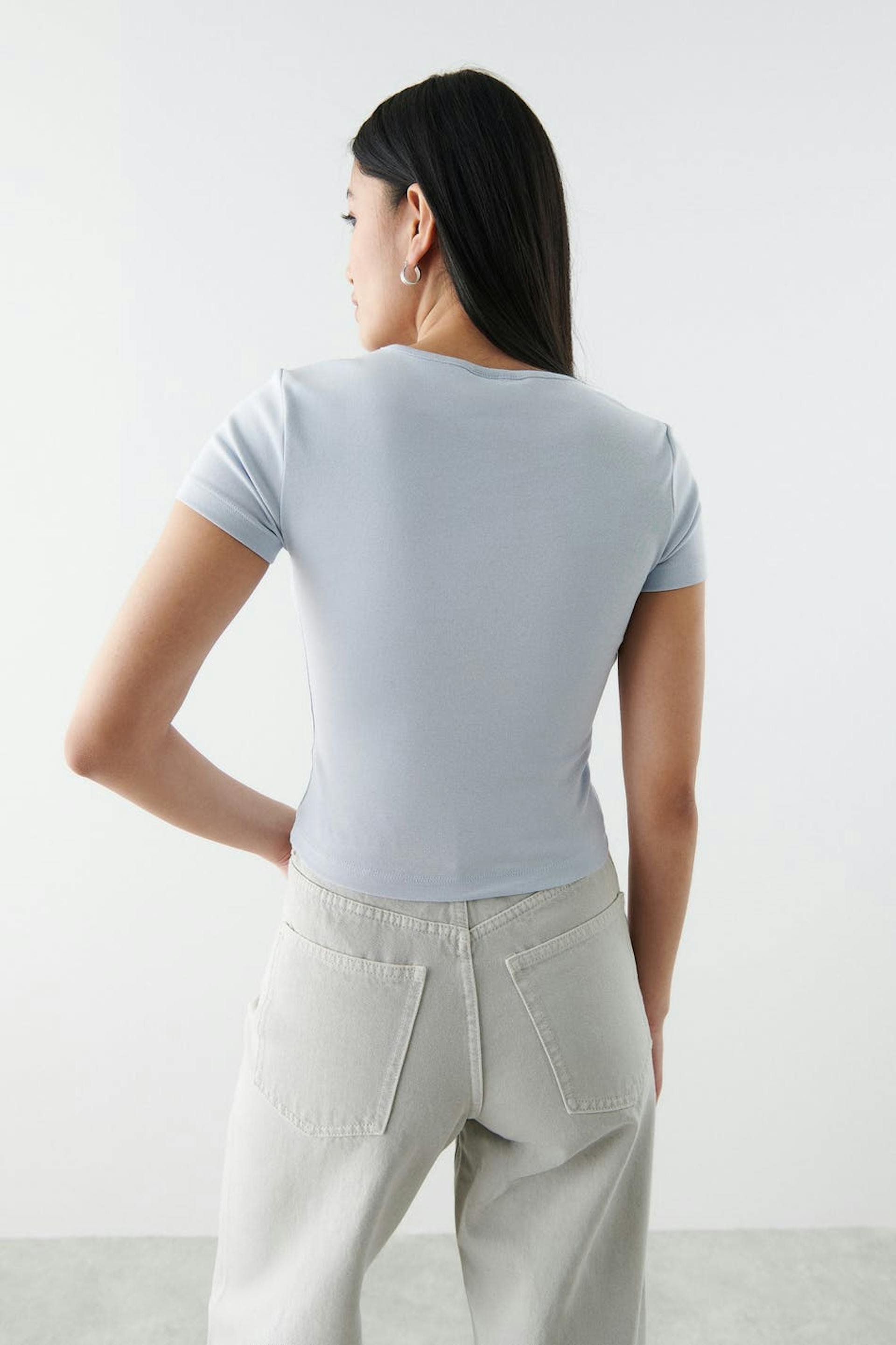 Lyhythihainen trikootoppi vartalonmyötäisellä istuvuudella. Trikootoppi on sininen ja siinä on cropattu pituus.