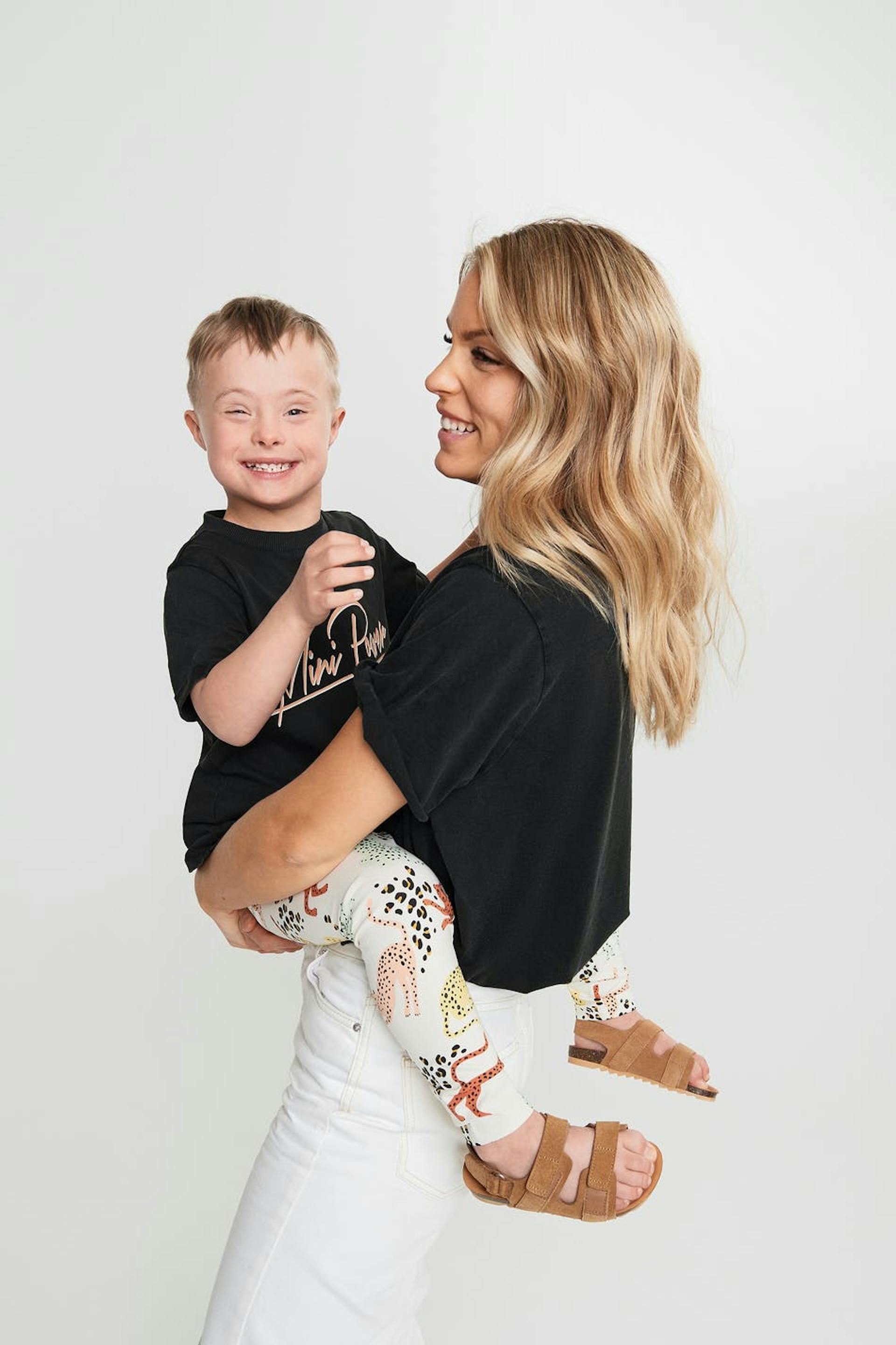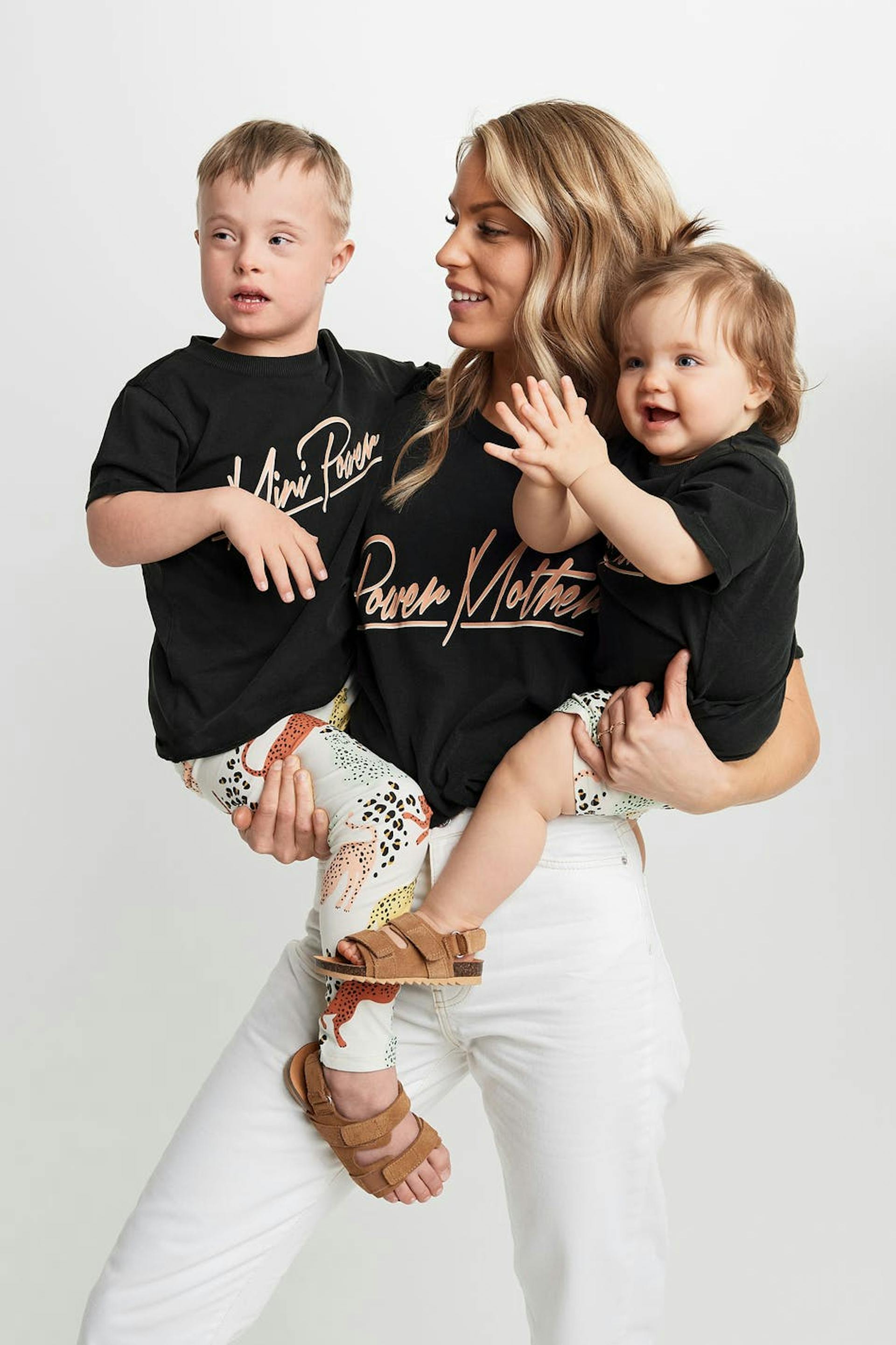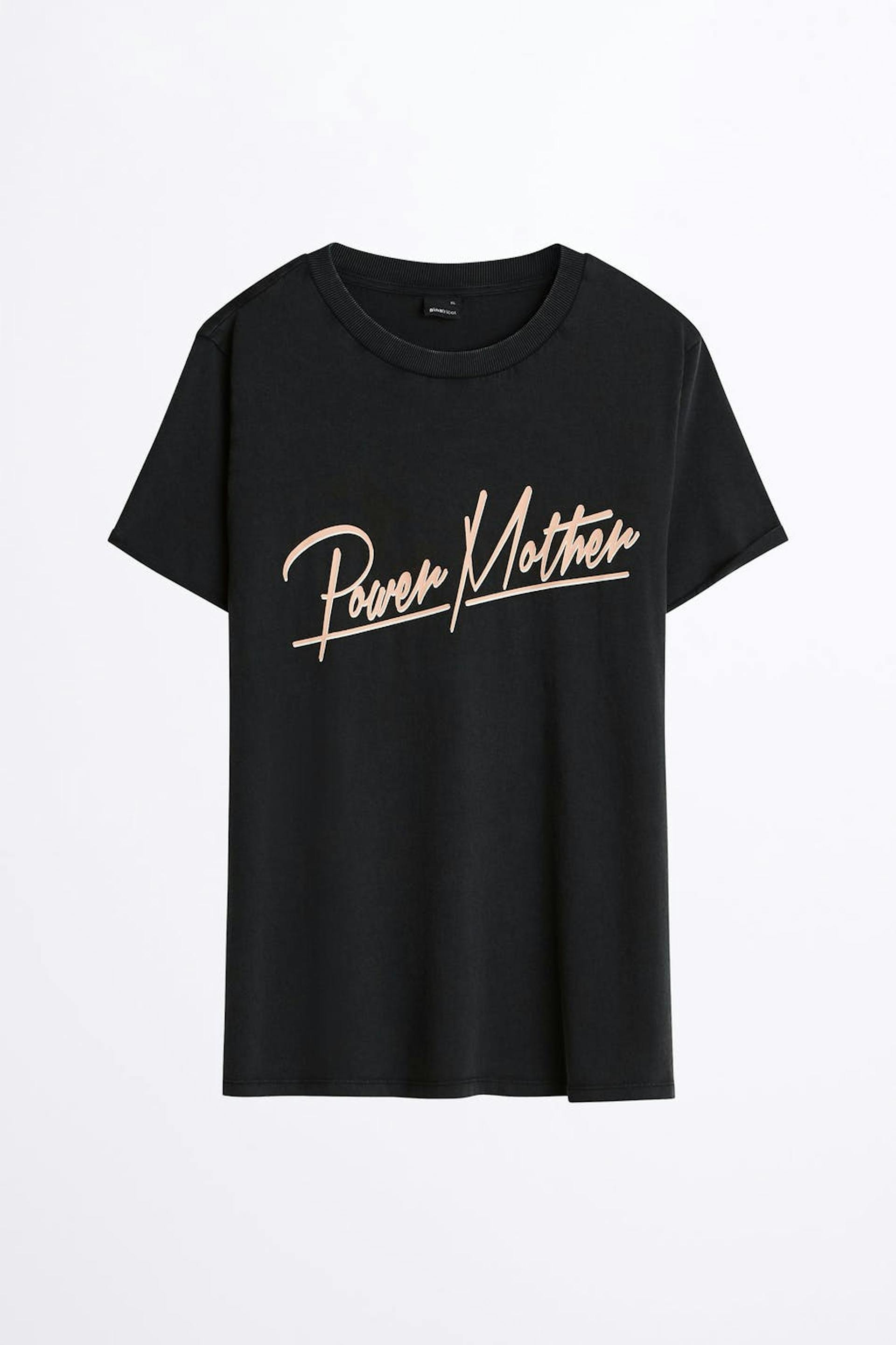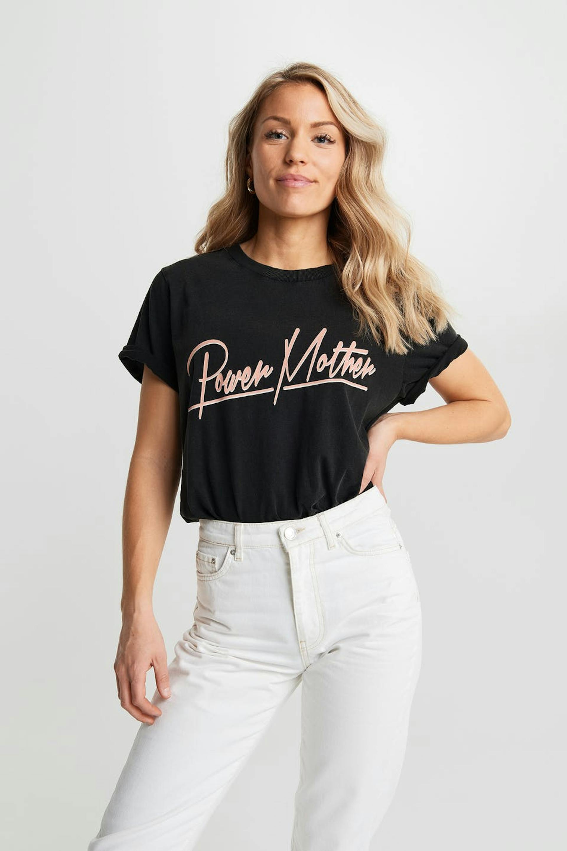Lyhythihainen T-paita printillä pinkillä tekstillä edessä. T-paita on musta.