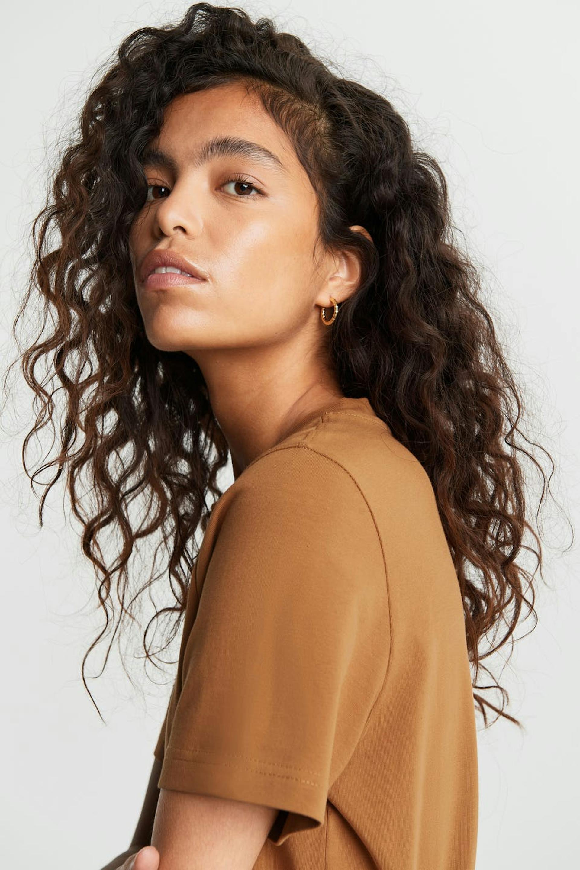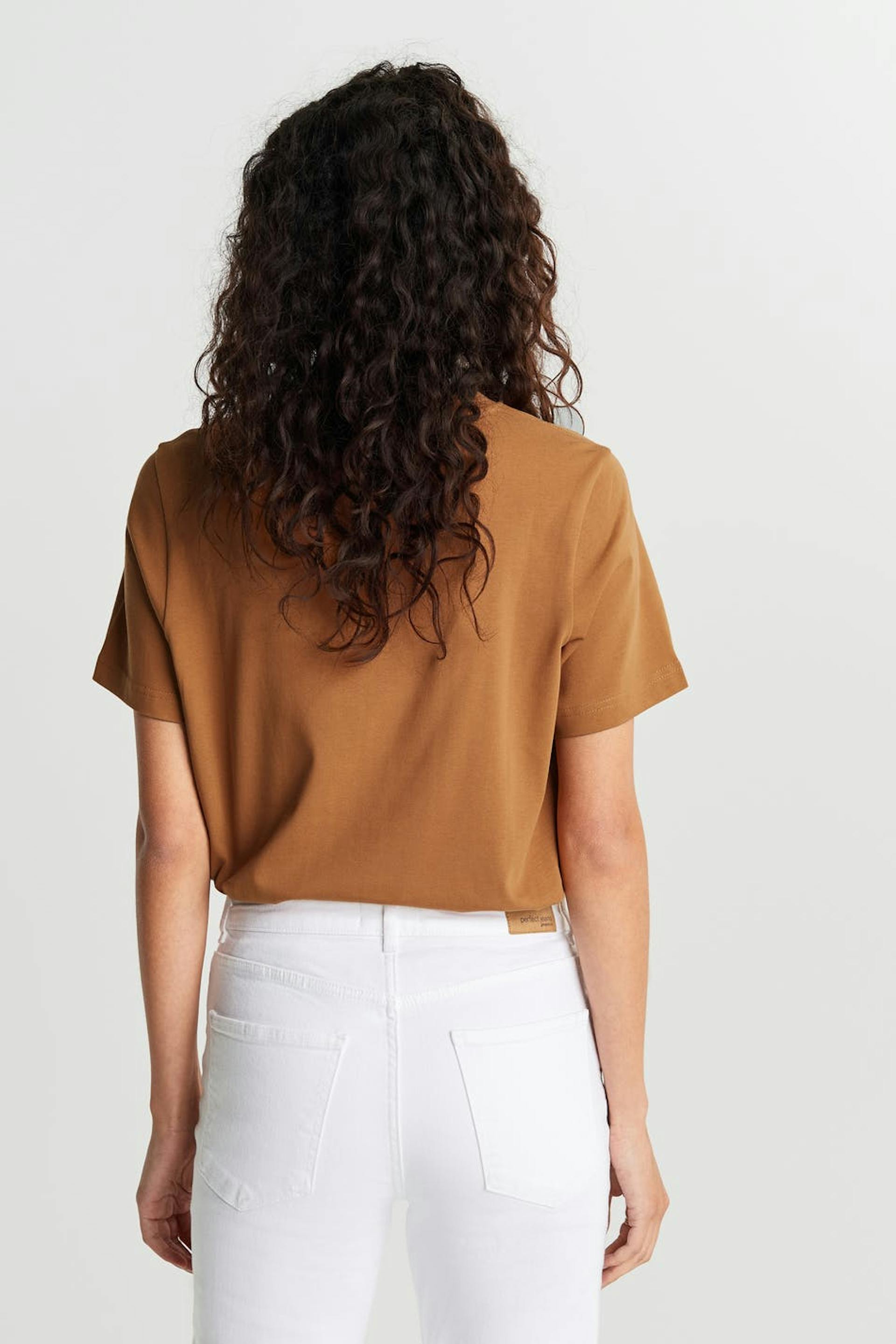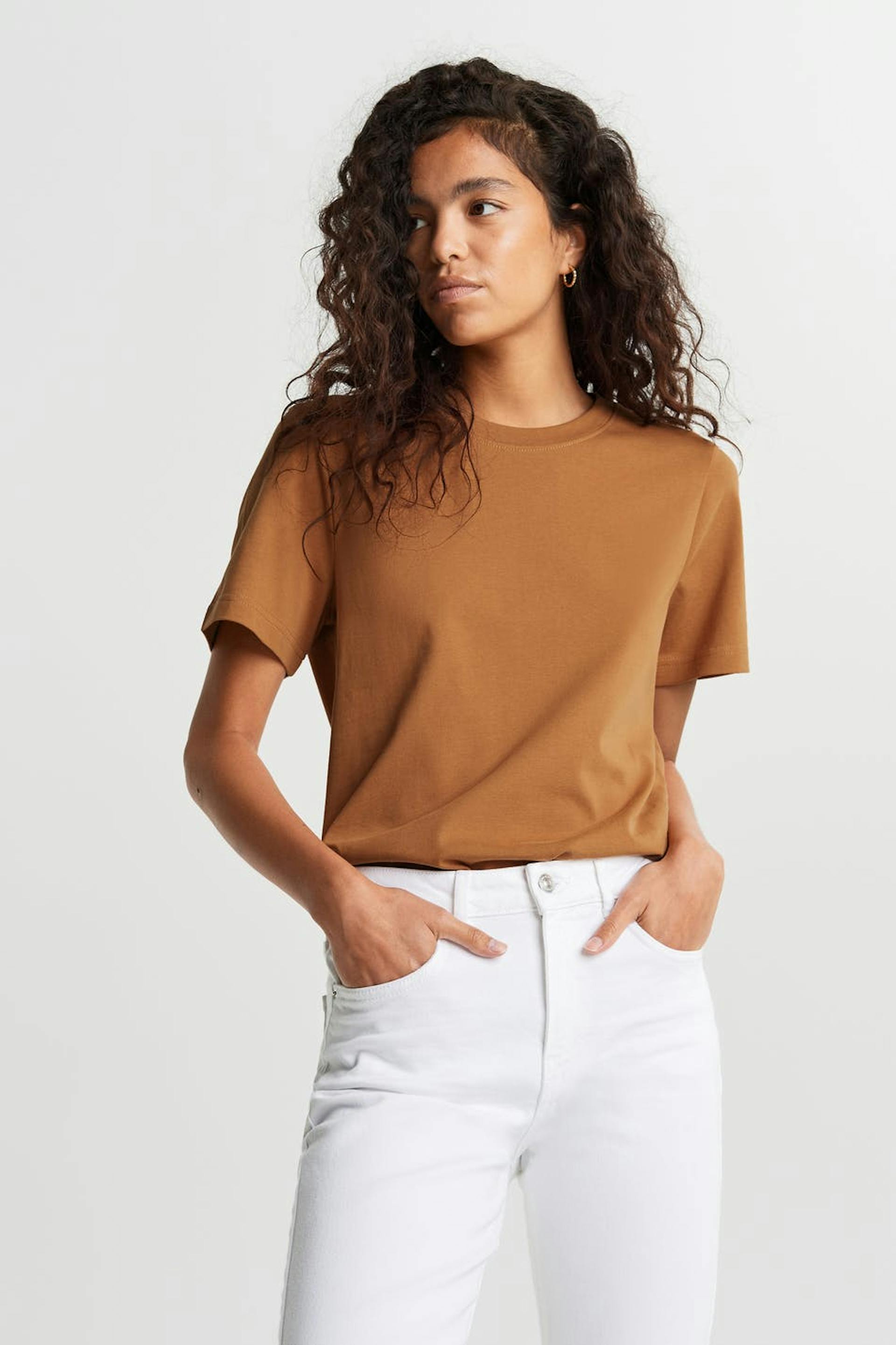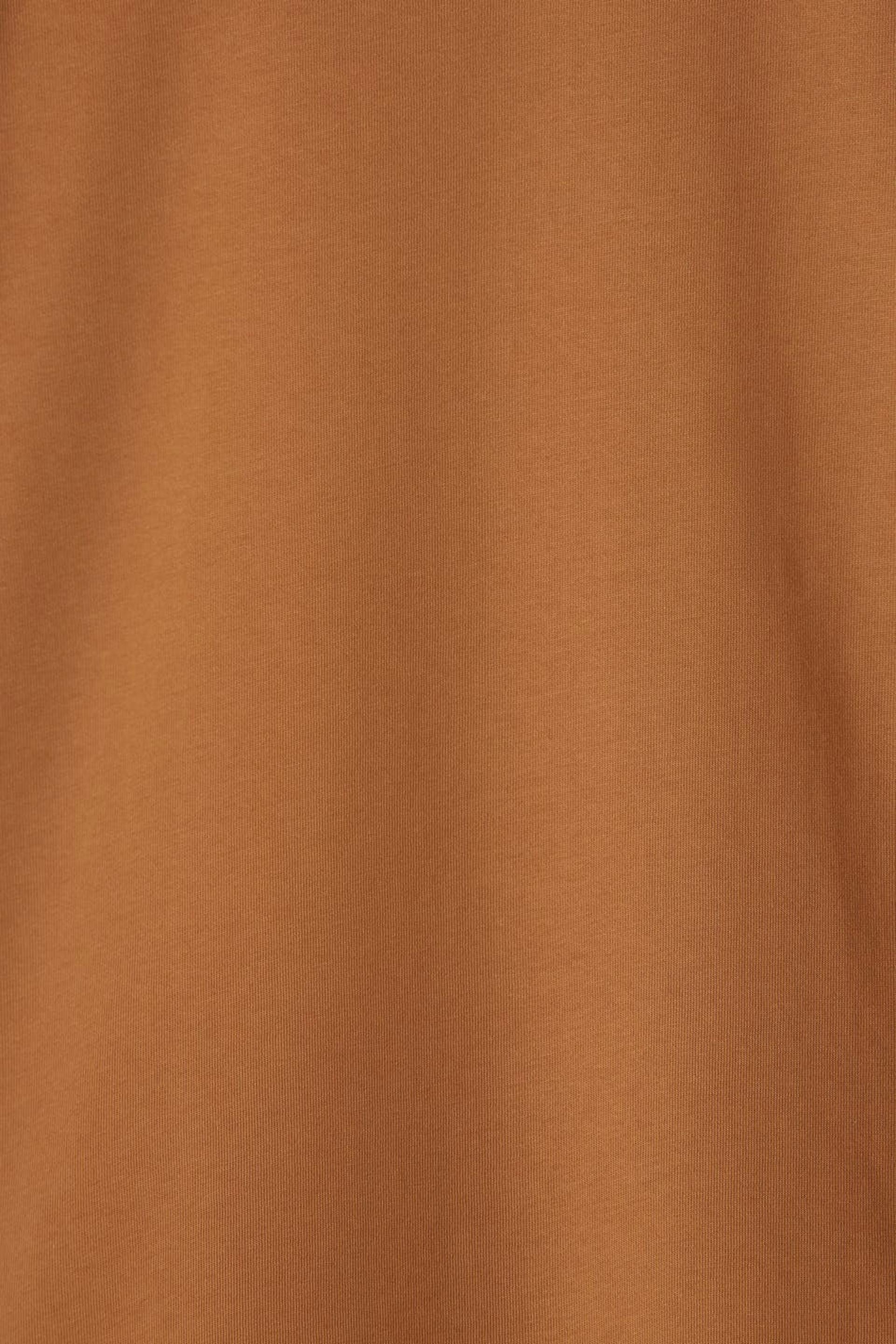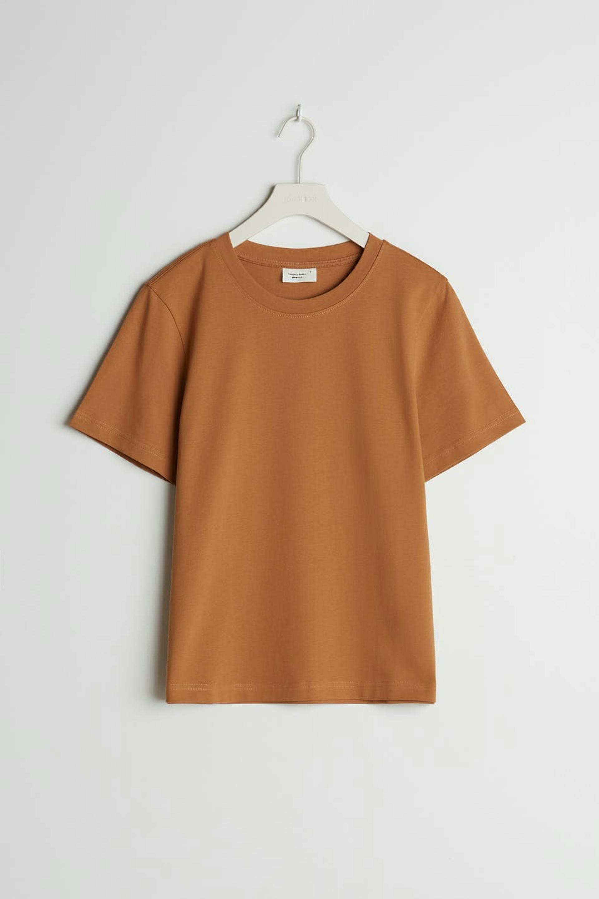 T-paita normaalilla leikkauksella. T-paita on ruskea ja siinä on suora malli. Se valmistetaan trikoosta ja siinä on korkea kaula-aukko.