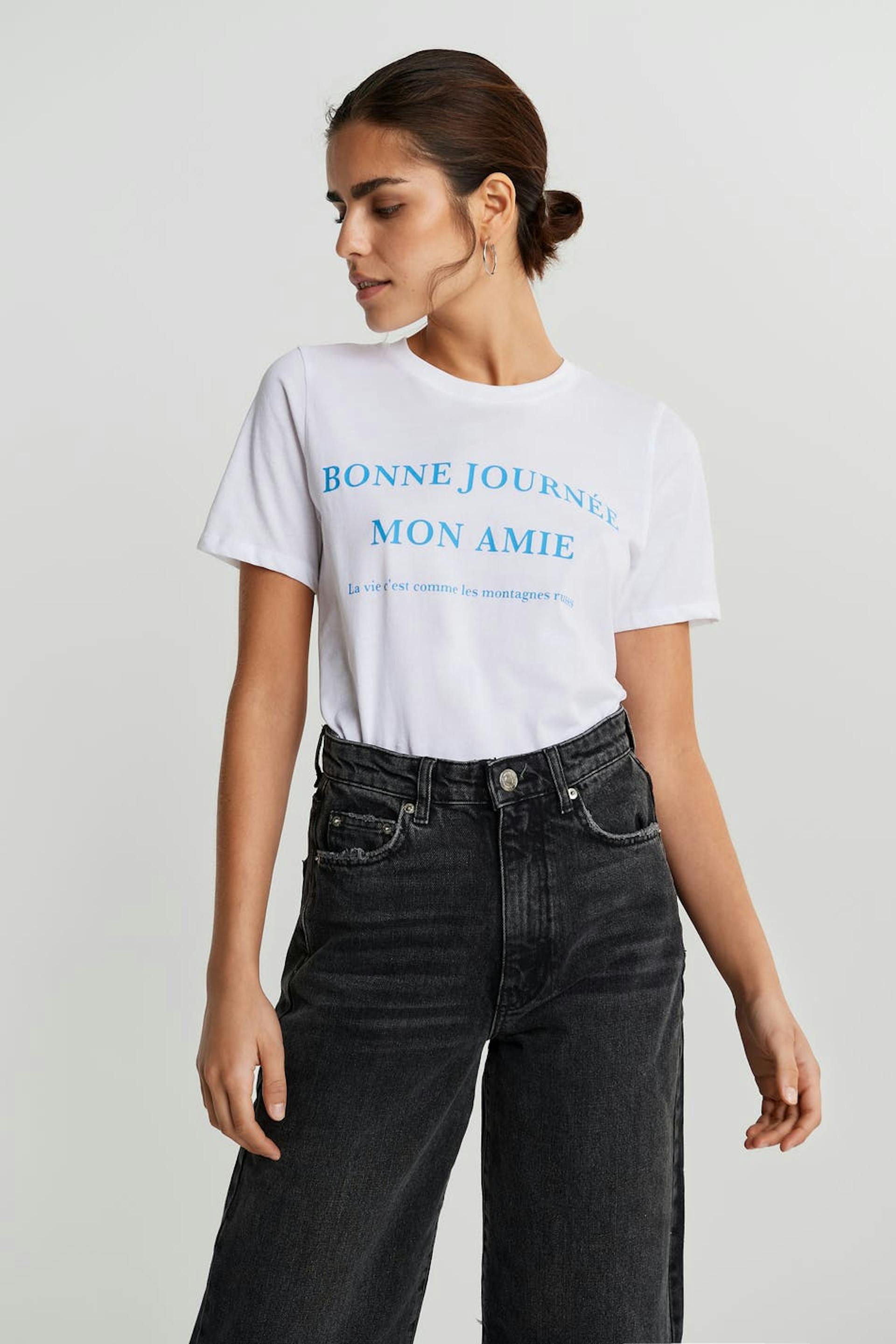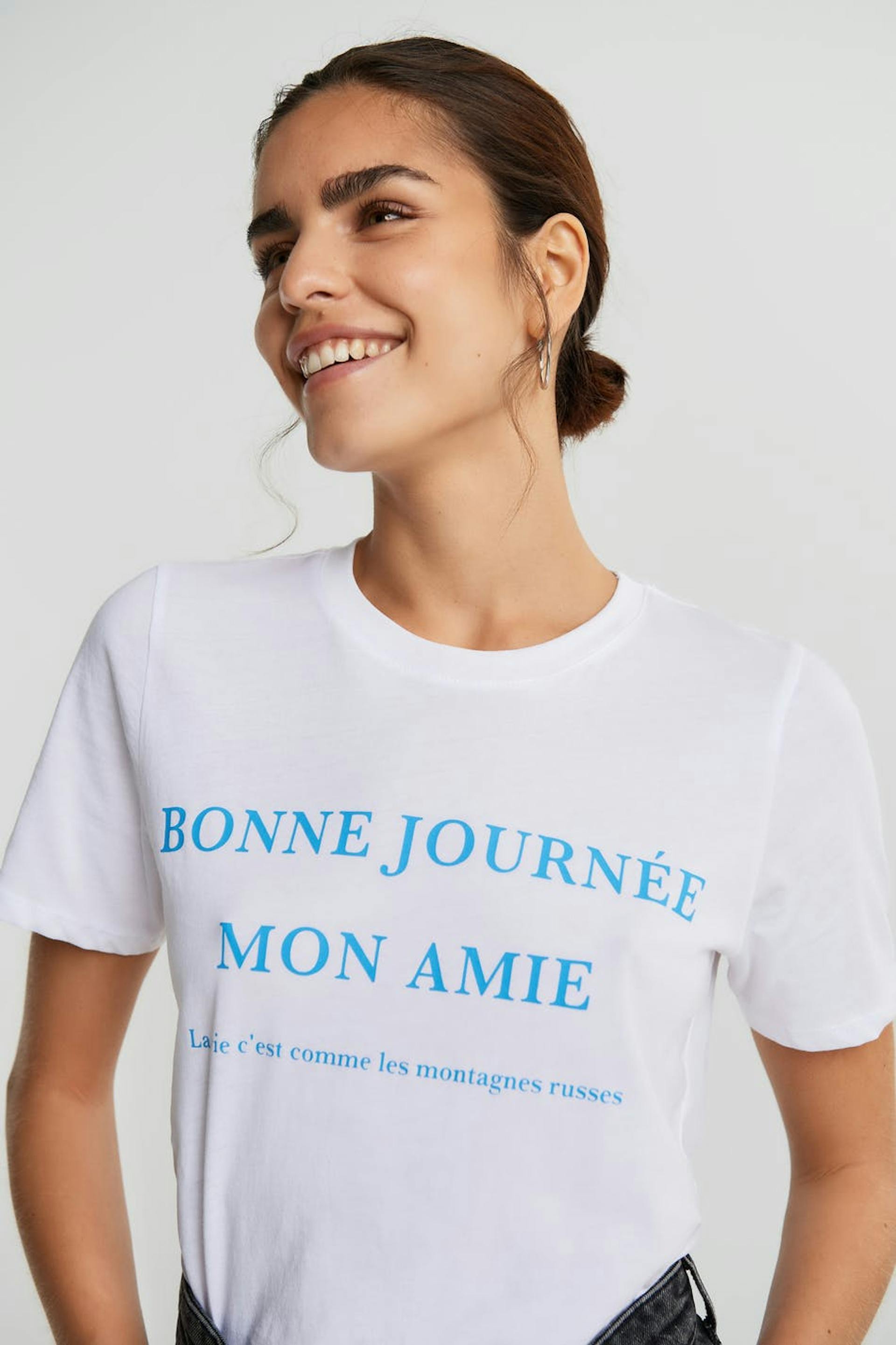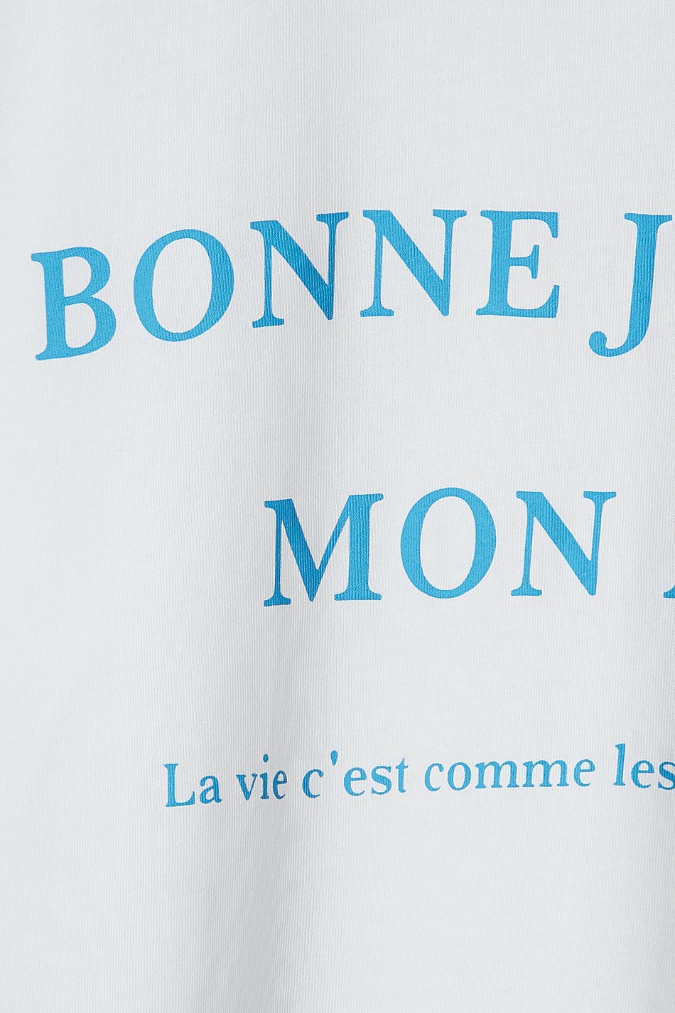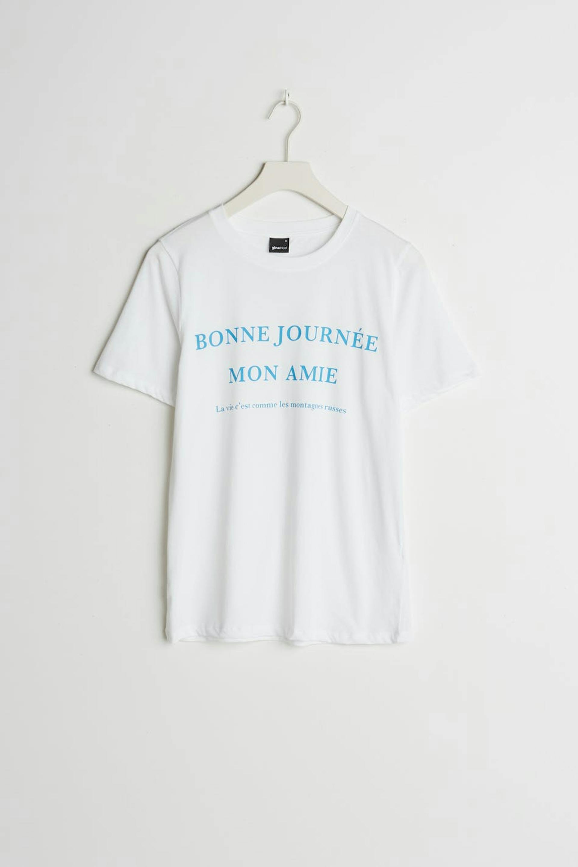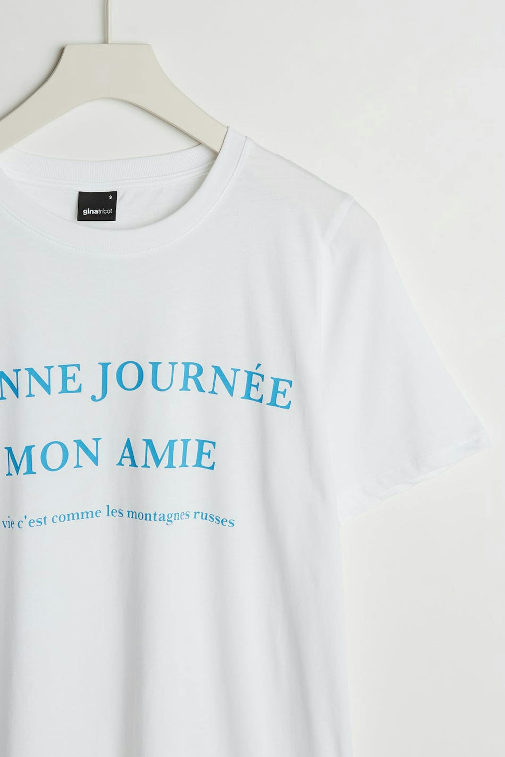 T-paita normaalilla leikkauksella. T-paita on valkoinen ja siinä on vaaleansininen teksti edessä. Siinä on veneen muotoinen kaula-aukko ja kapea ribbed mansetti.