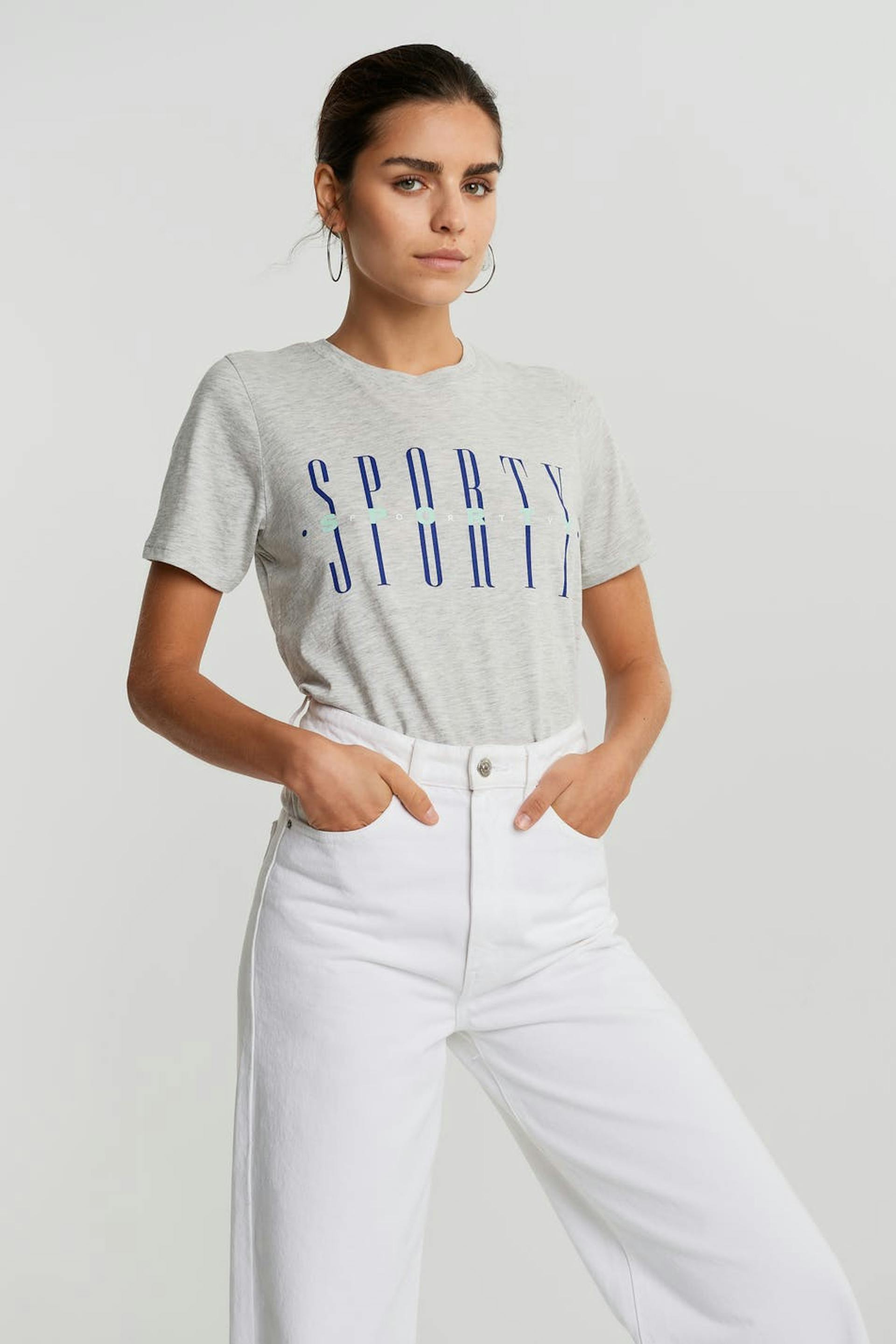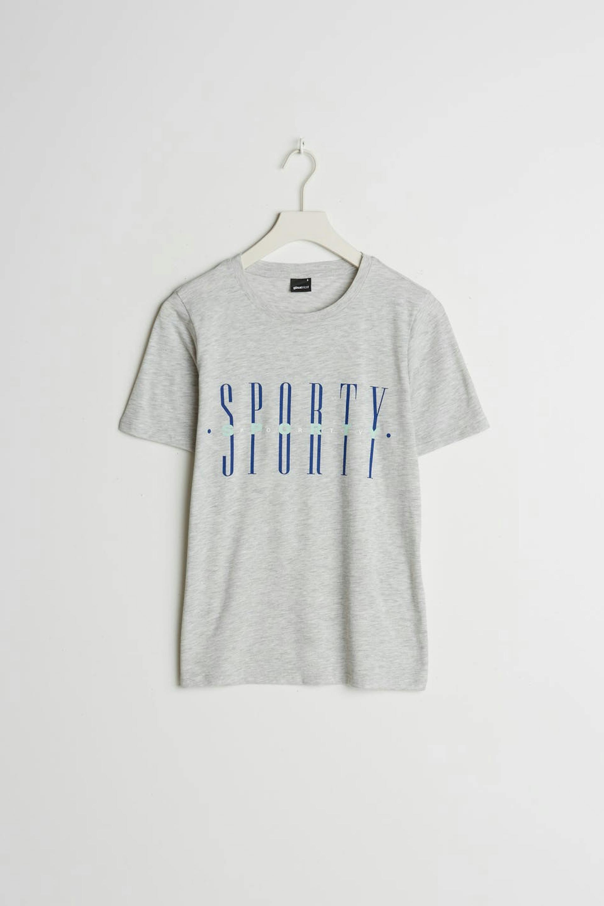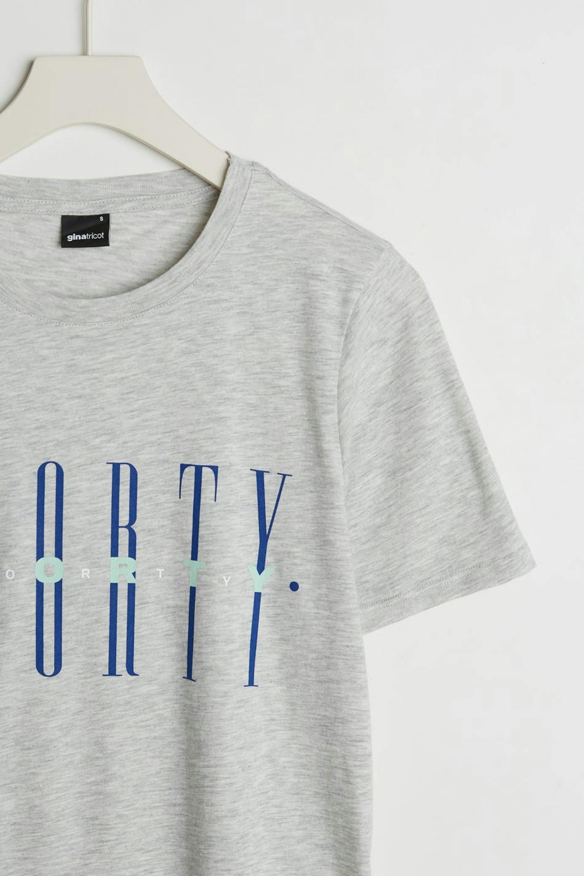 T-paita printtikuviolla tekstillä edessä. T-paita on harmaa ja siinä on veneen muotoinen kaula-aukko. Siinä on kapea ribbed mansetti.