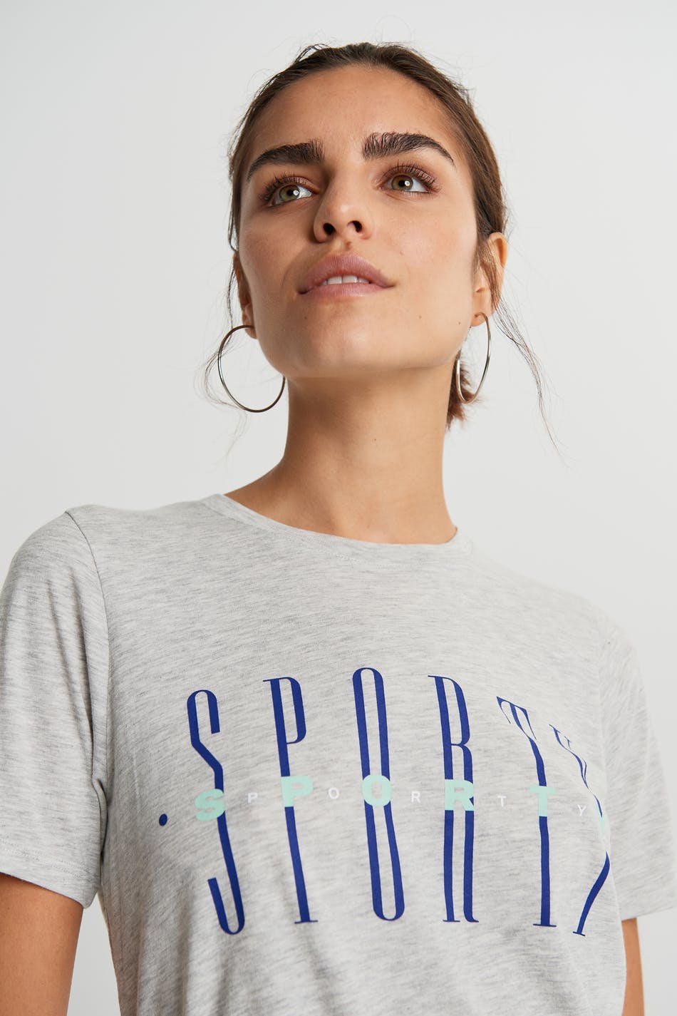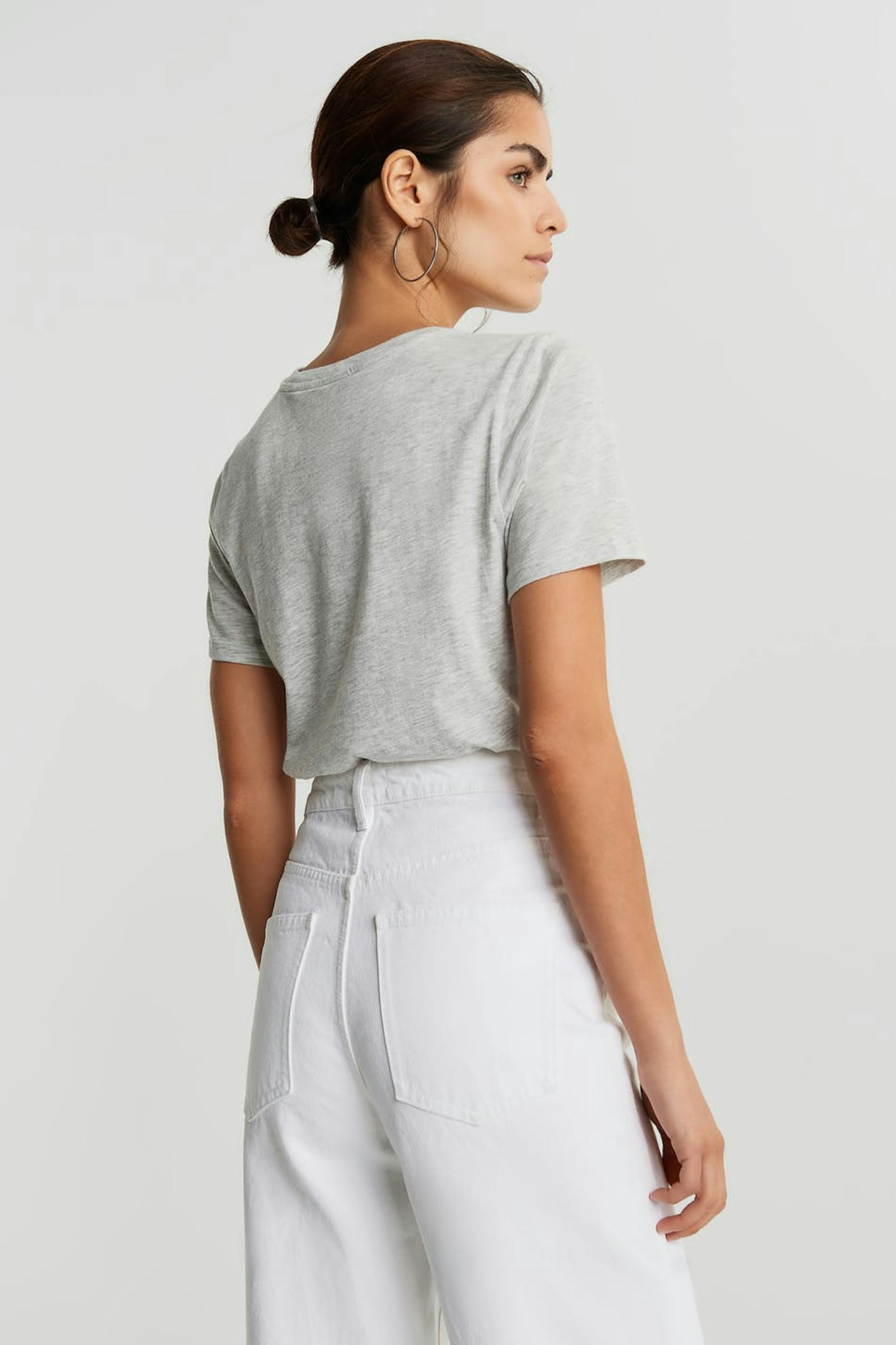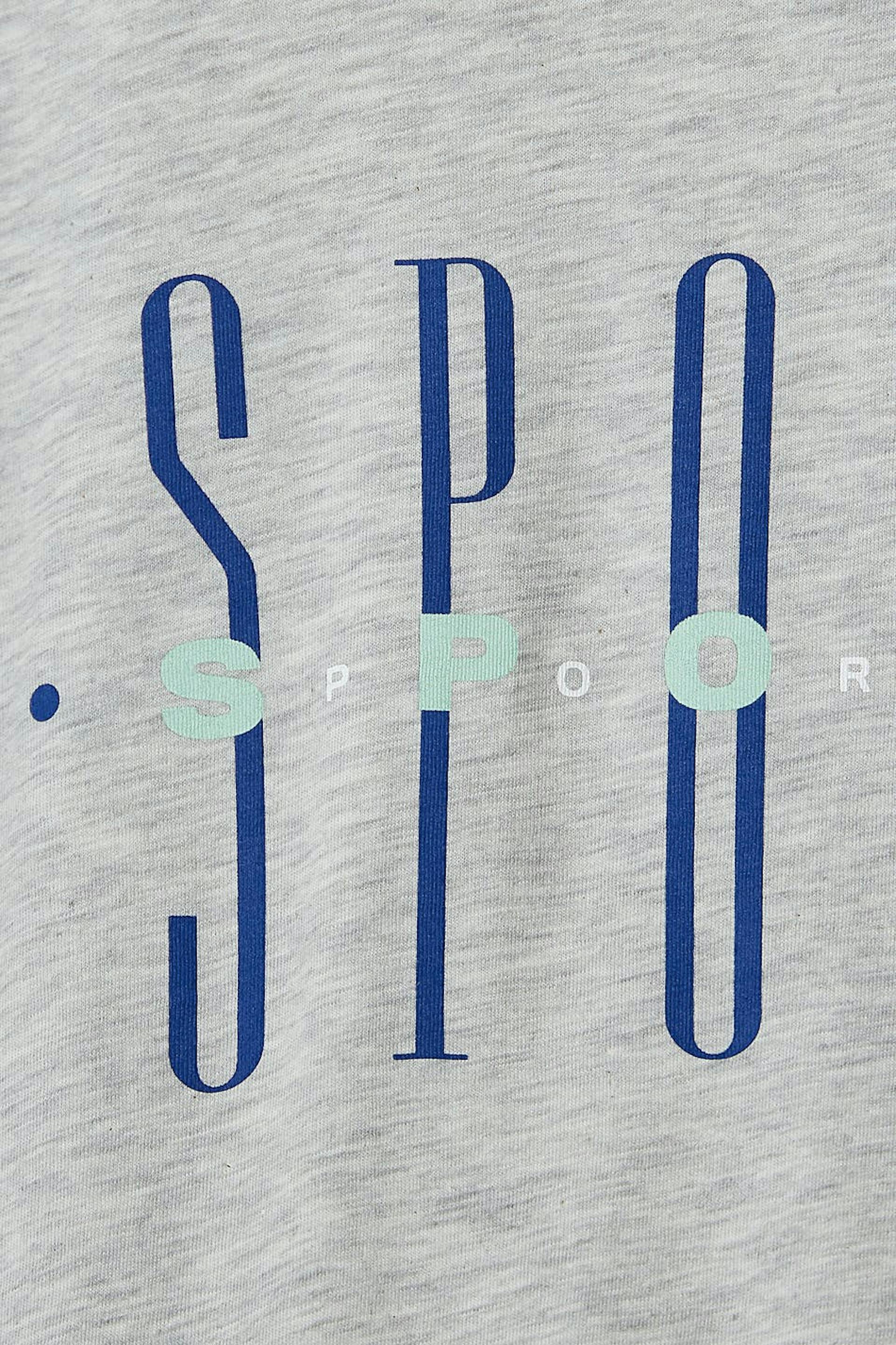 T-paita printtikuviolla tekstillä edessä. T-paita on harmaa ja siinä on veneen muotoinen kaula-aukko. Siinä on kapea ribbed mansetti.