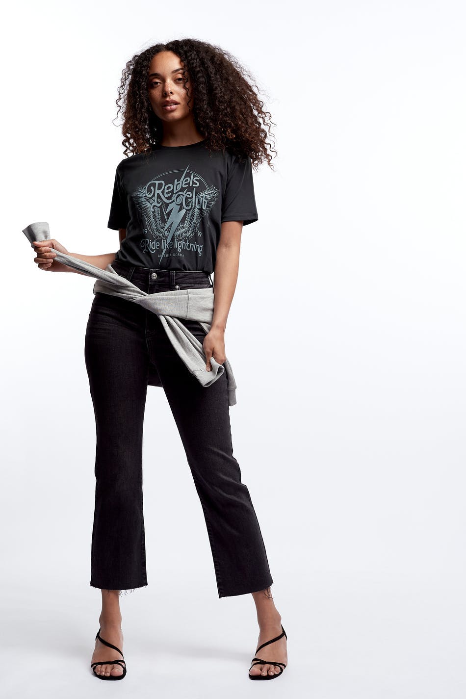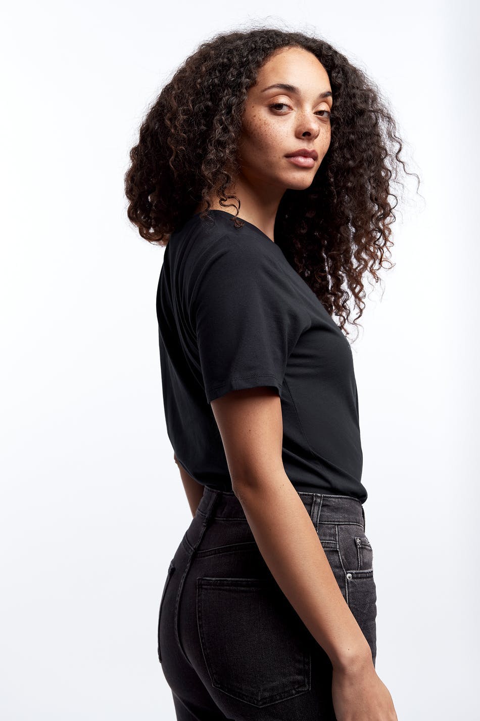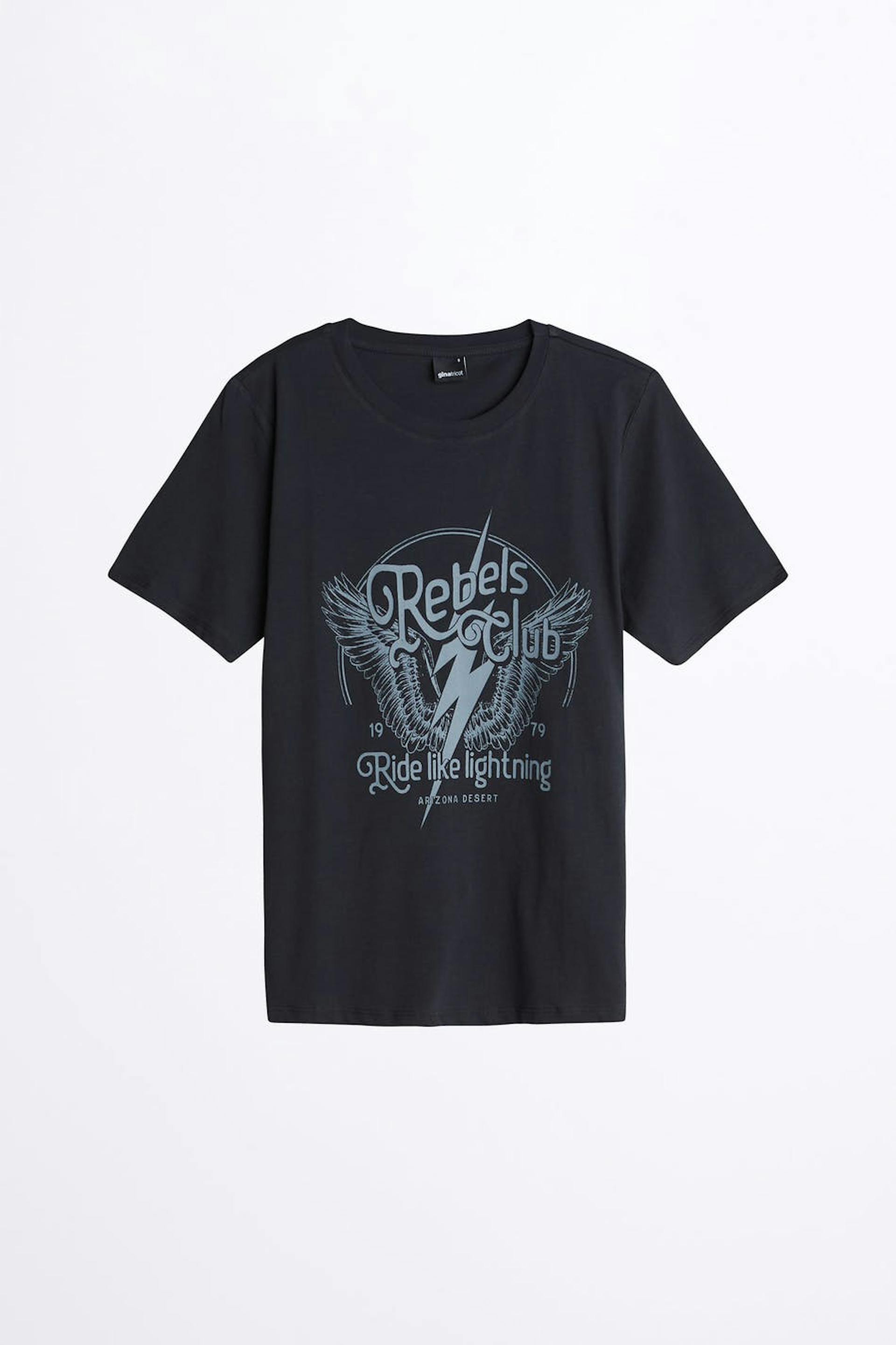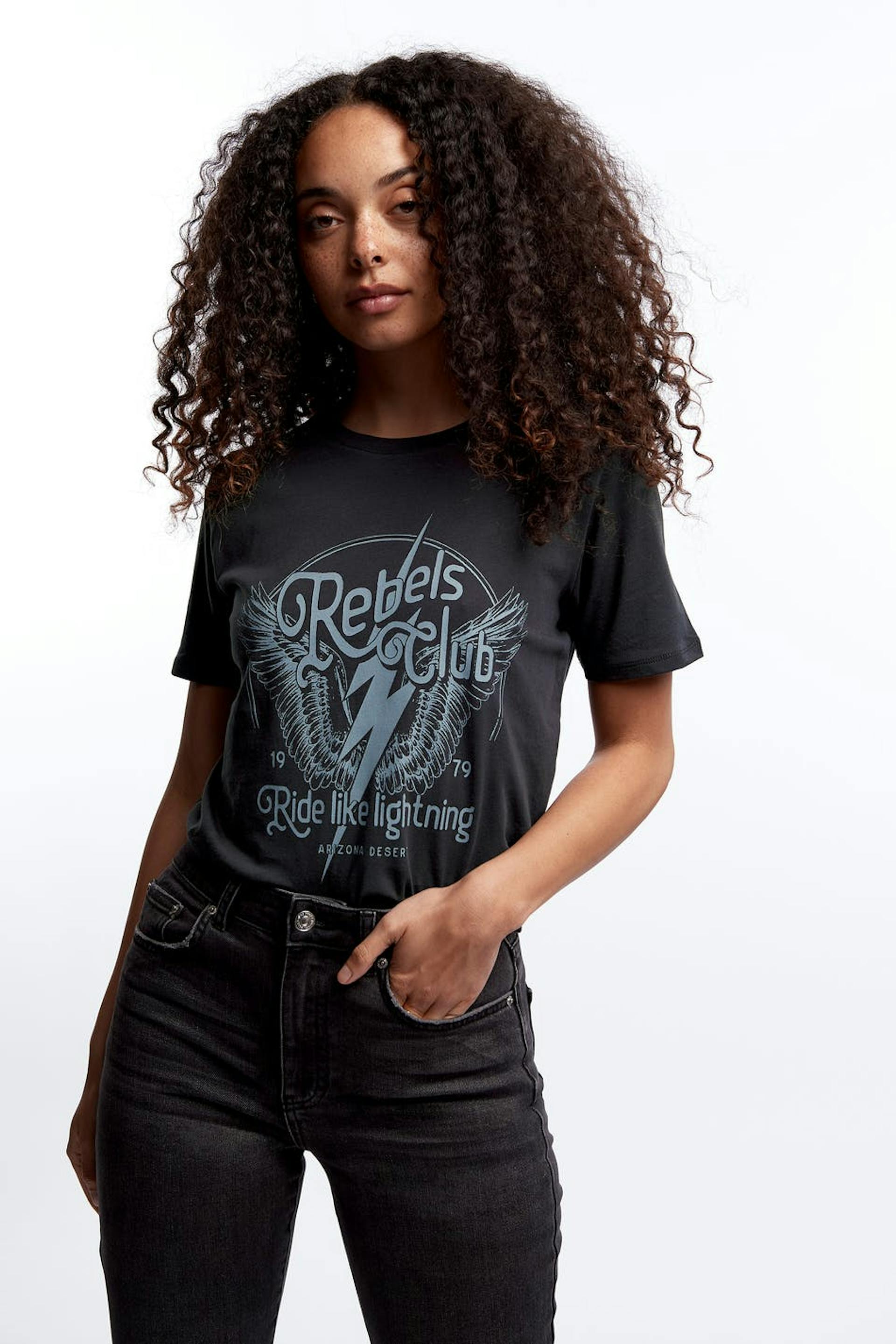 T-paita normaalilla leikkauksella. T-paita on musta ja siinä on veneen muotoinen kaula-aukko. Siinä on kapea ribbed mansetti ja printti edessä.