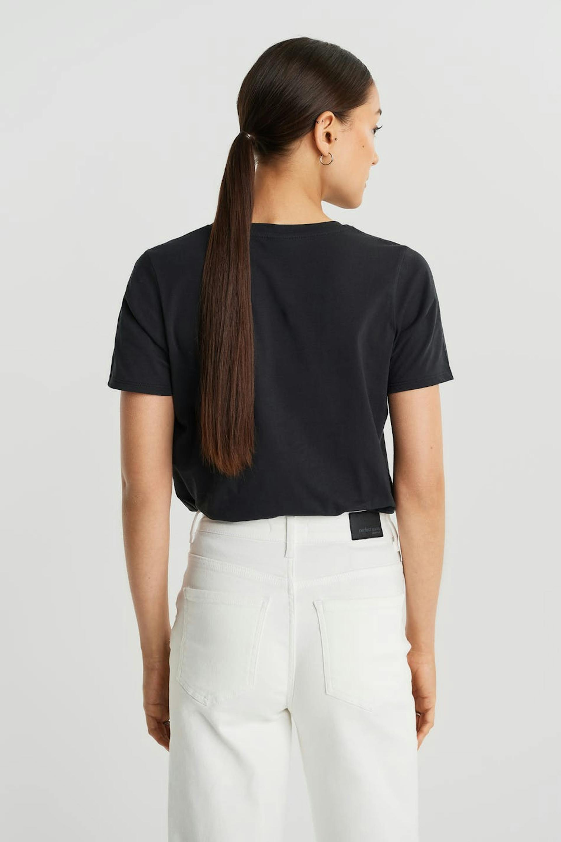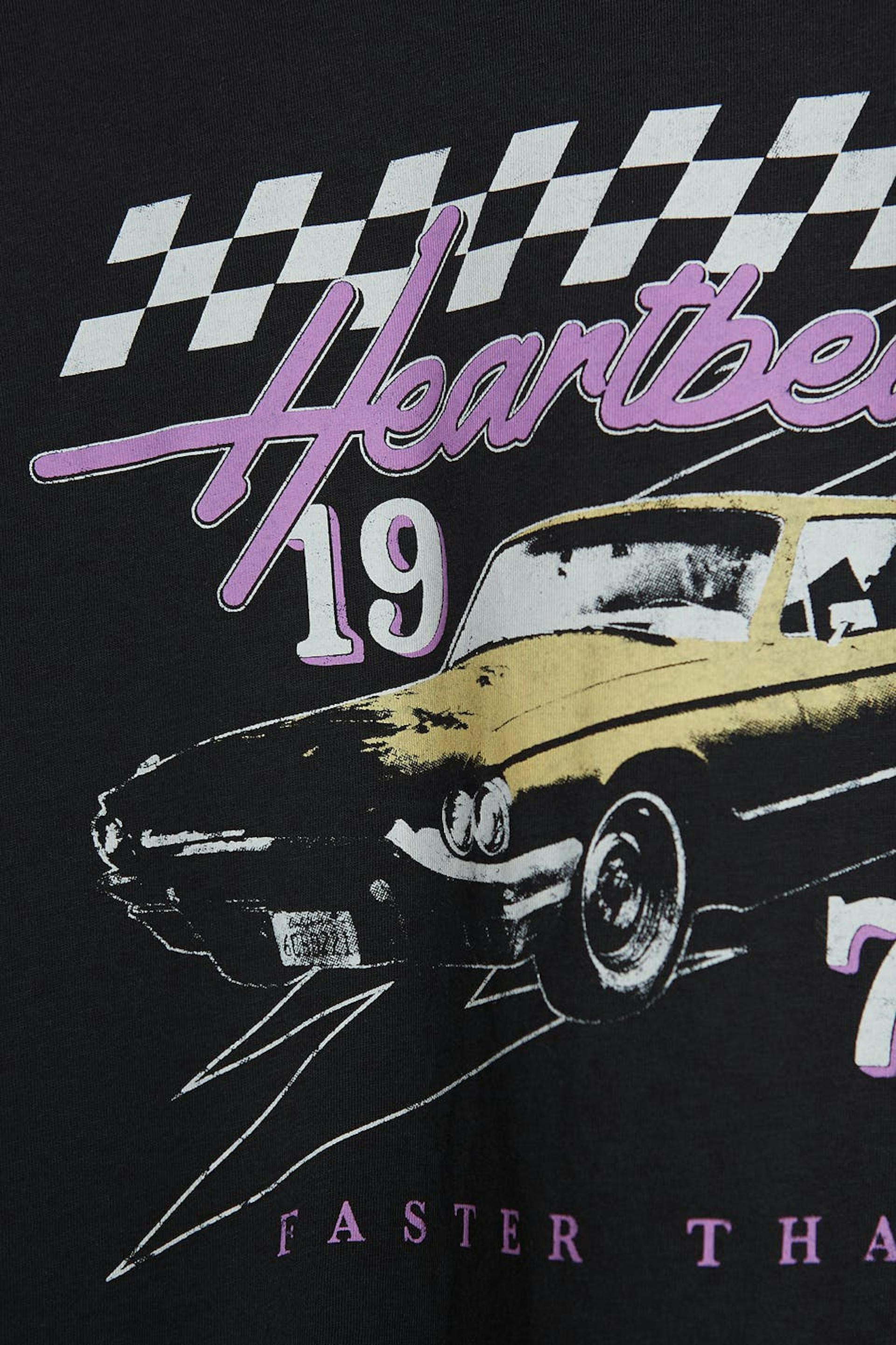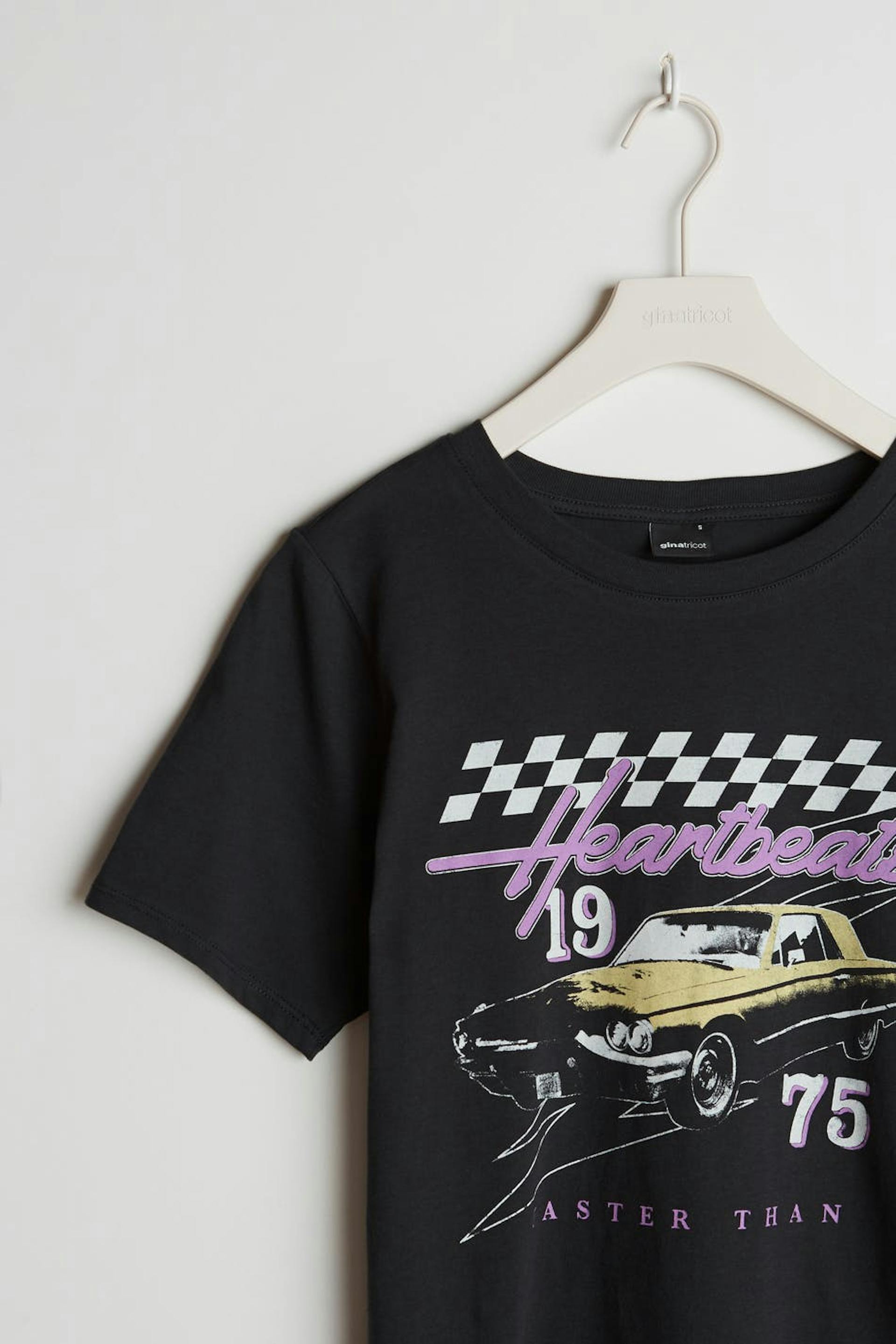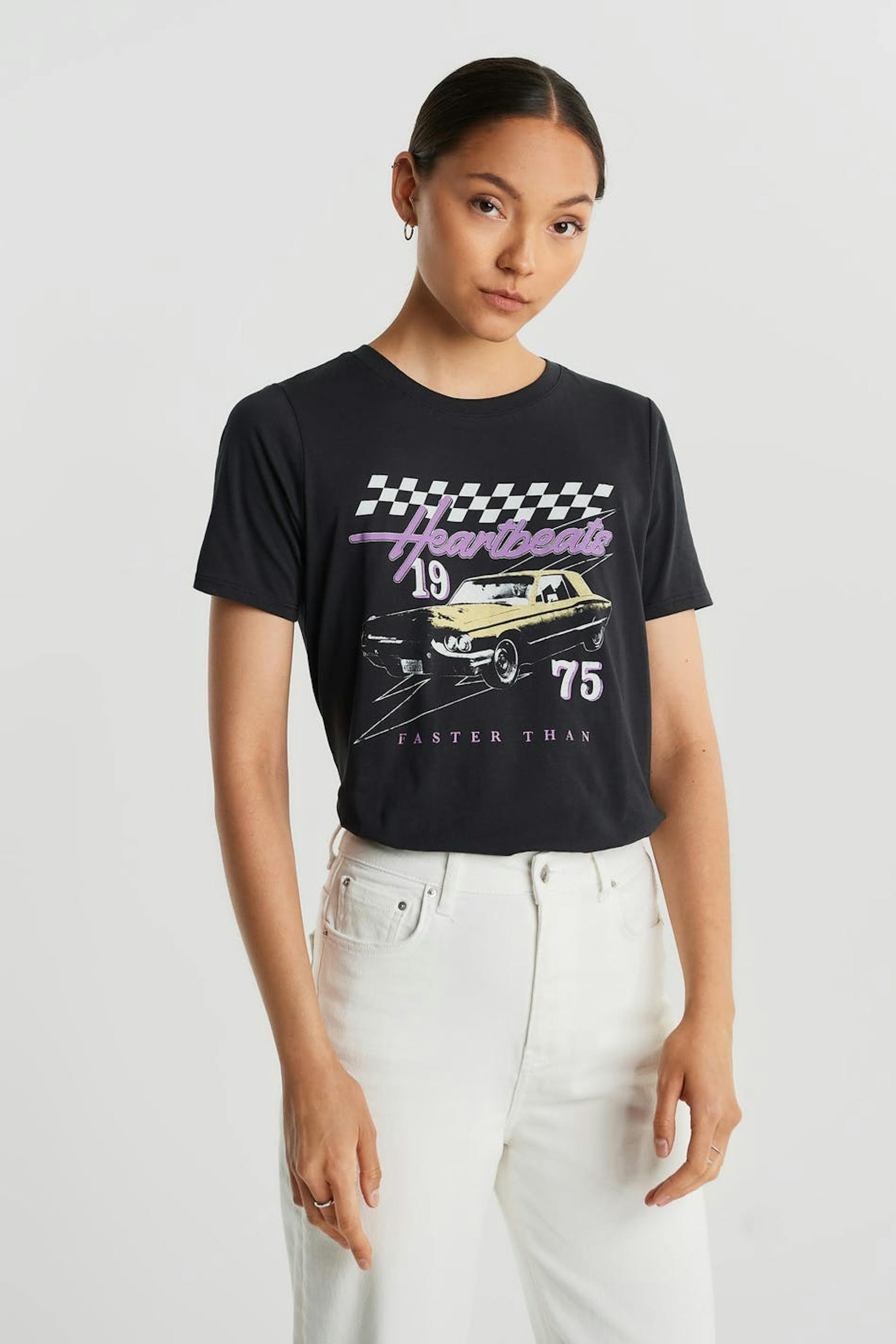 Toppi normaalilla leikkauksella. Toppi on musta ja siinä on veneen muotoinen kaula-aukko. Siinä on kapea ribbed mansetti ja printti edessä.