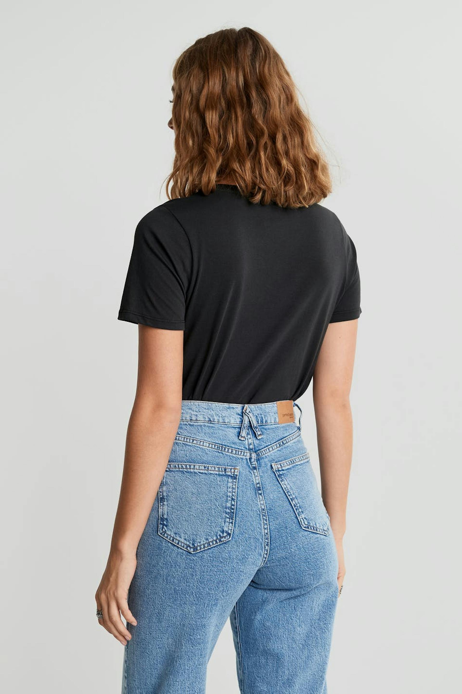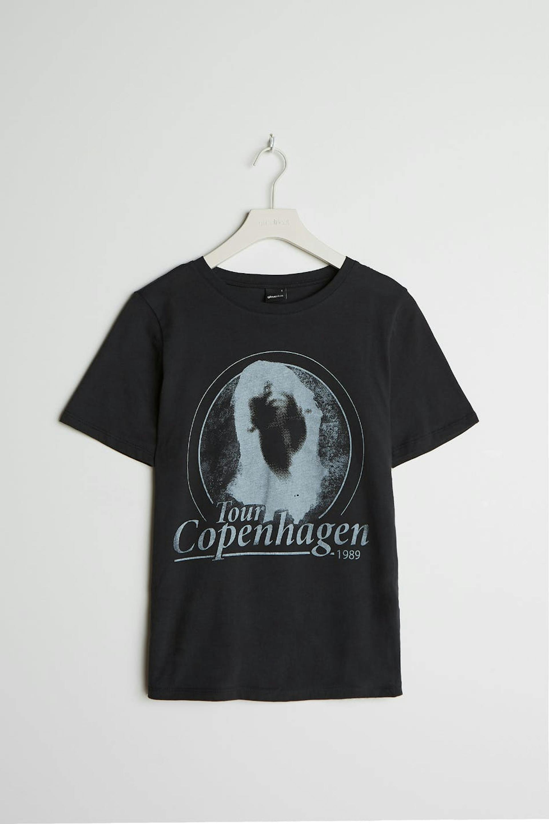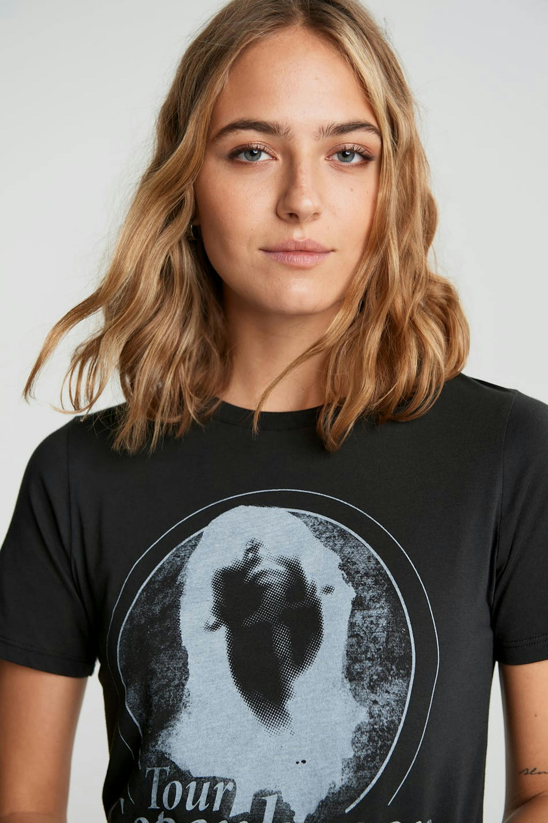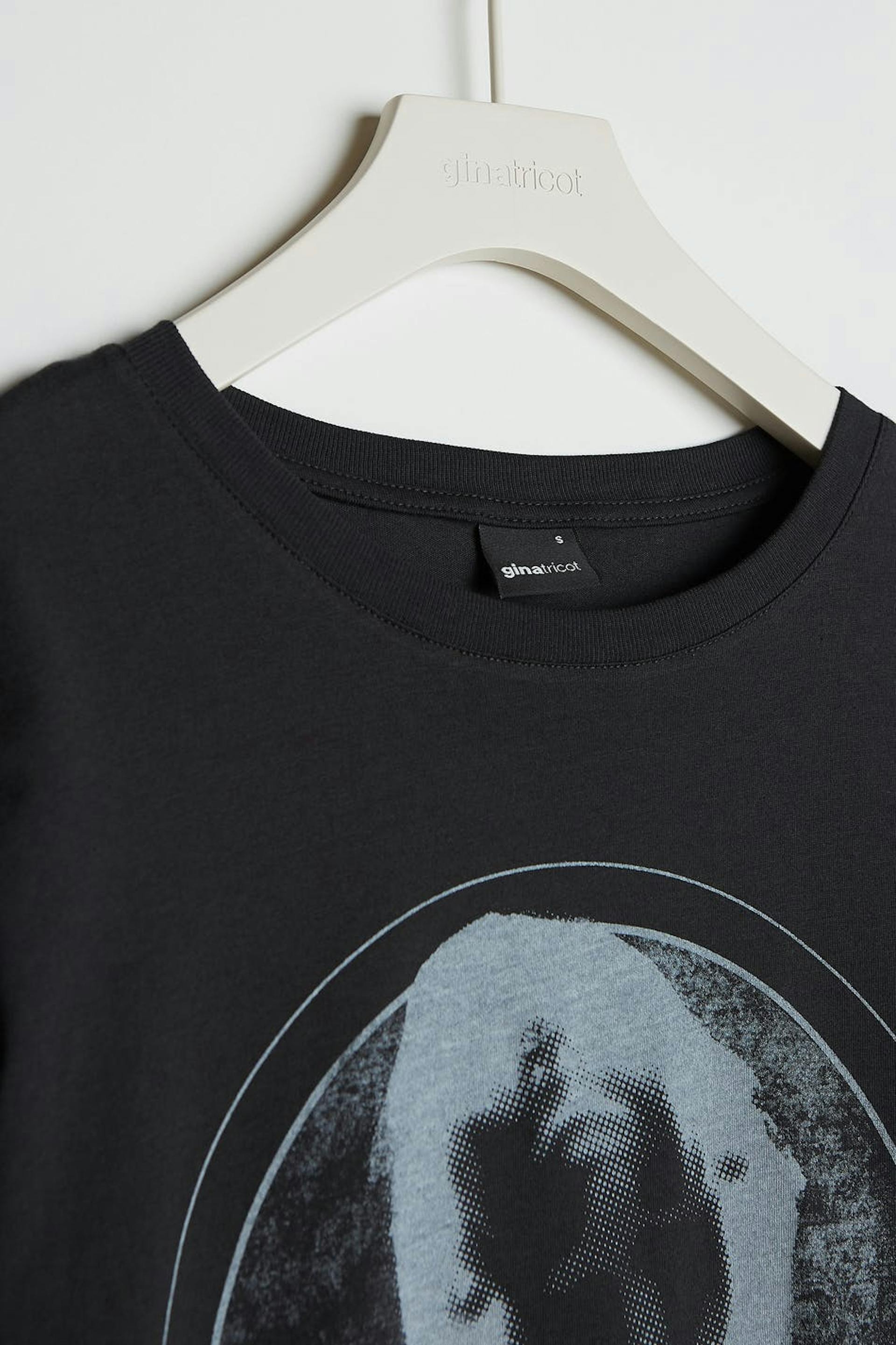 Toppi printillä. Toppi on musta ja siinä on normaali leikkaus. Siinä on veneen muotoinen kaula-aukko ja kapea ribbed mansetti.
