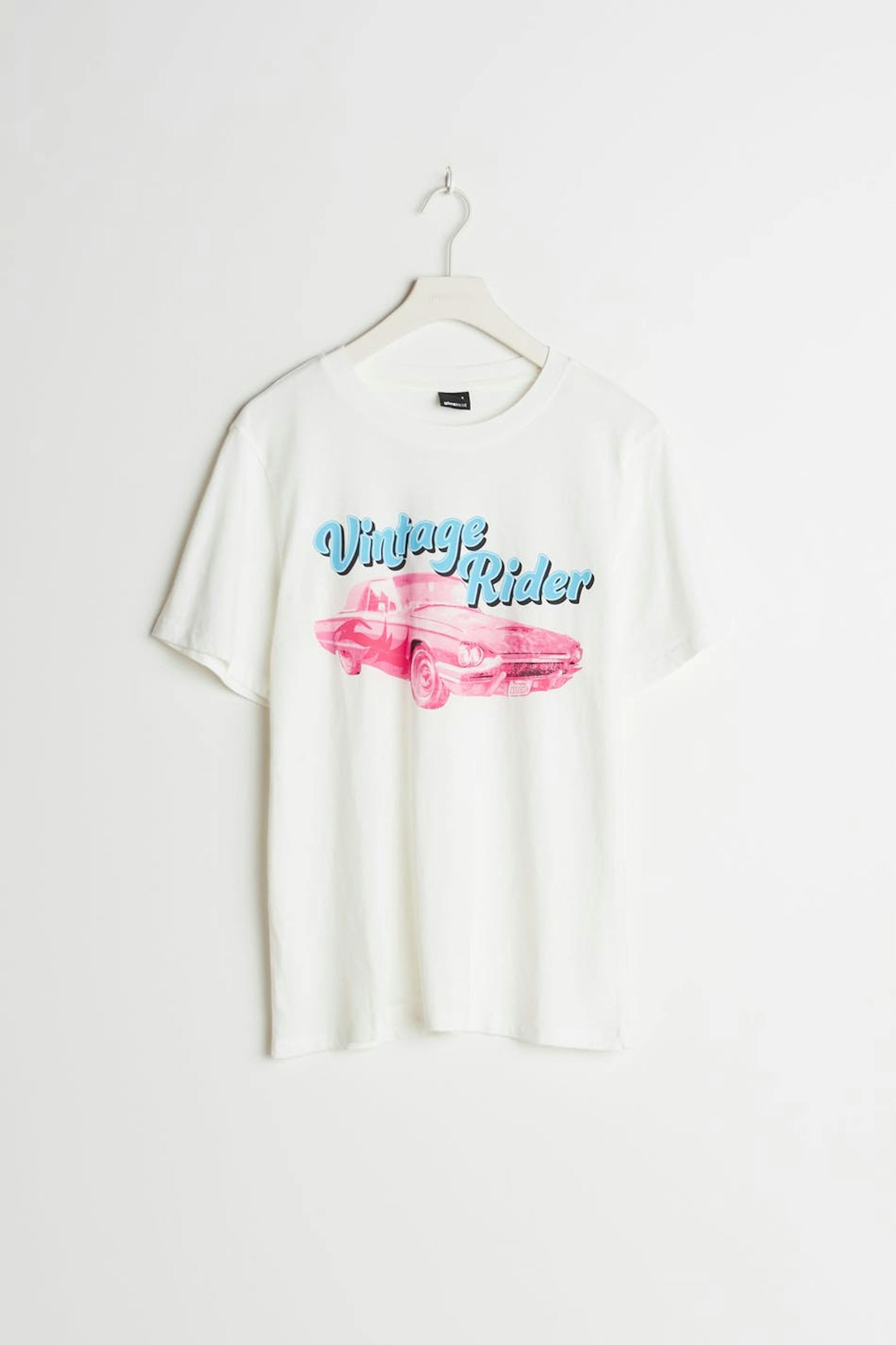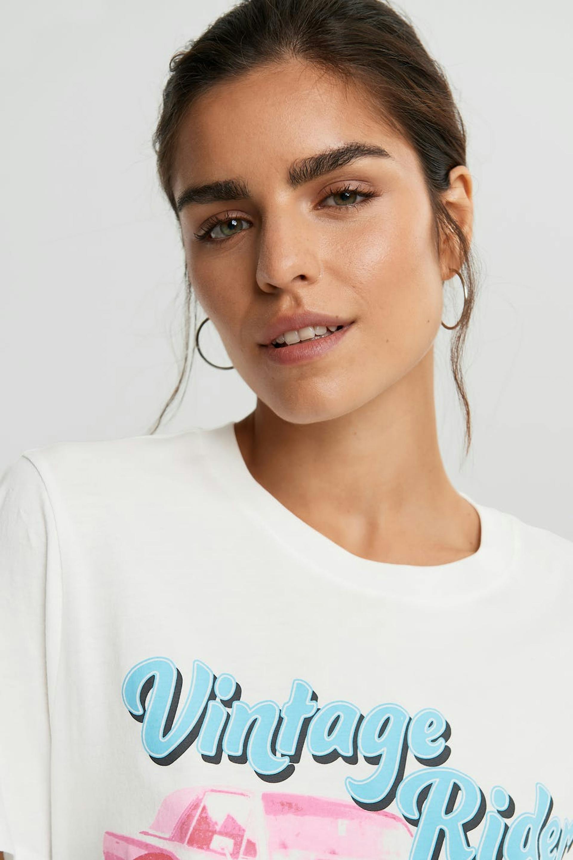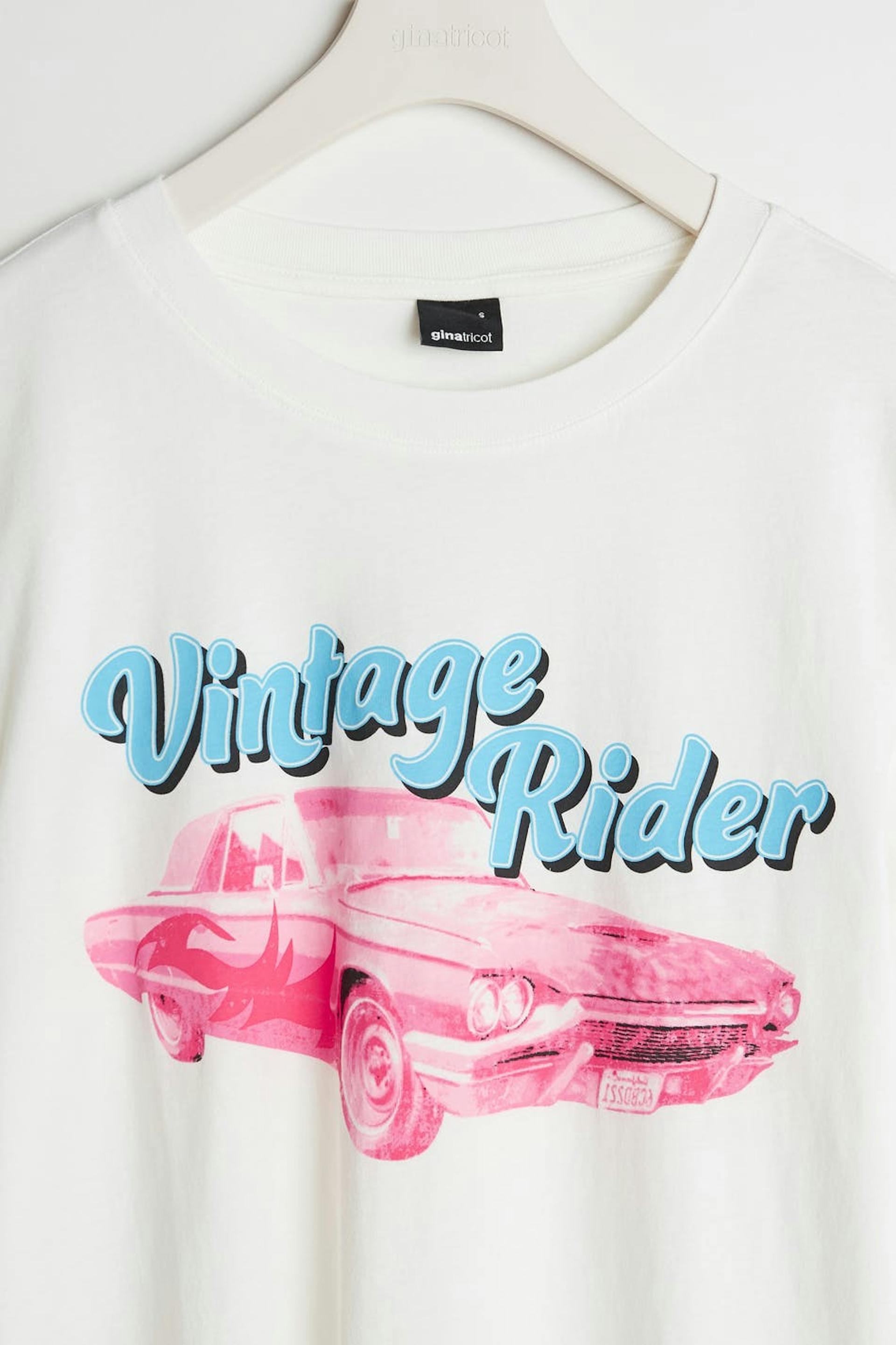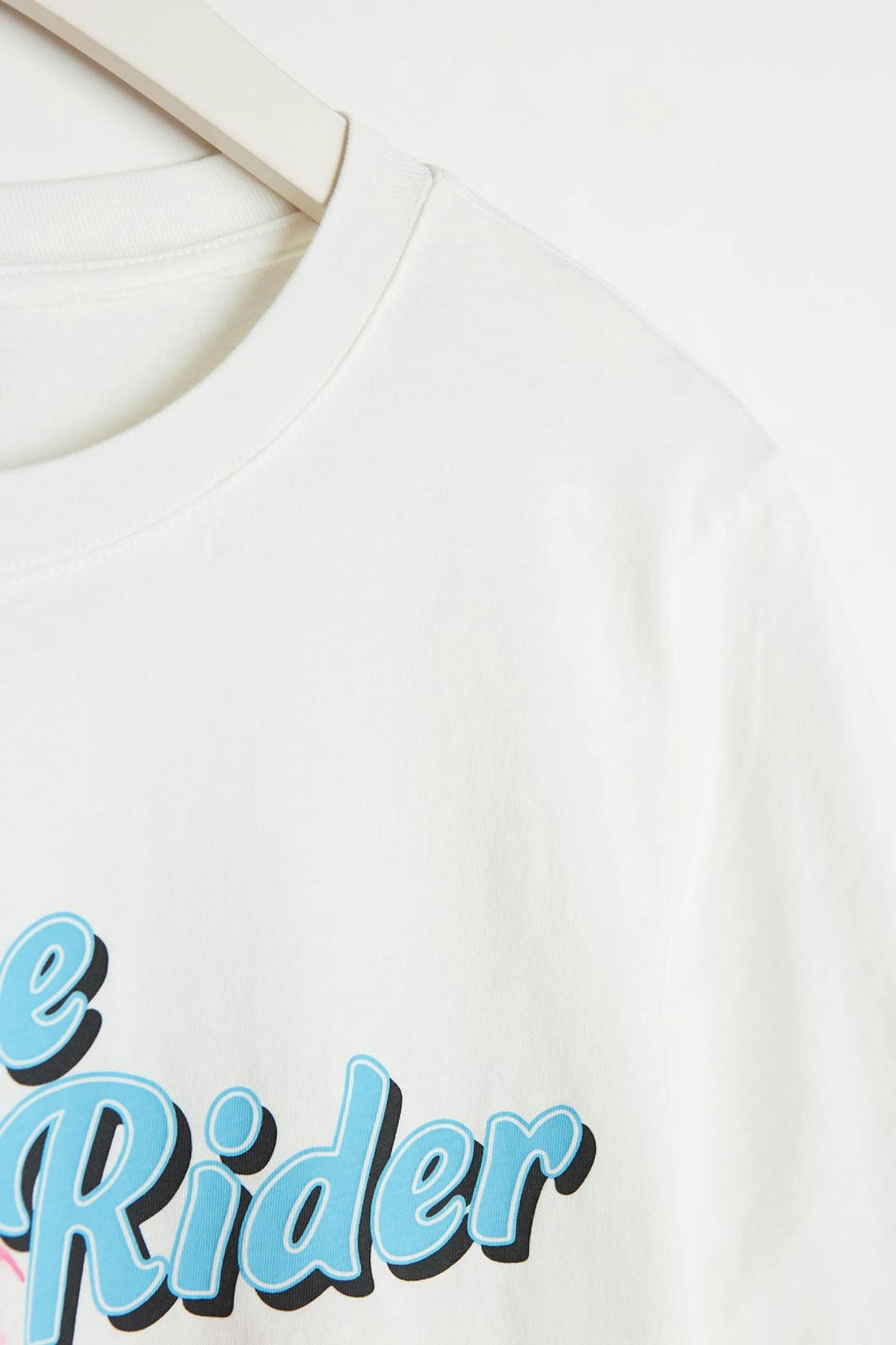 T-paita normaalilla leikkauksella. T-paita on valkoinen ja siinä on printti edessä.