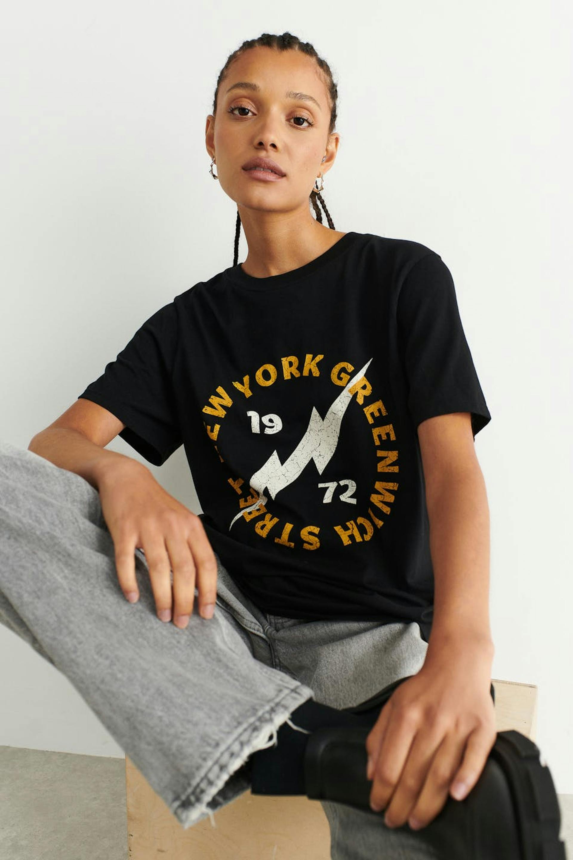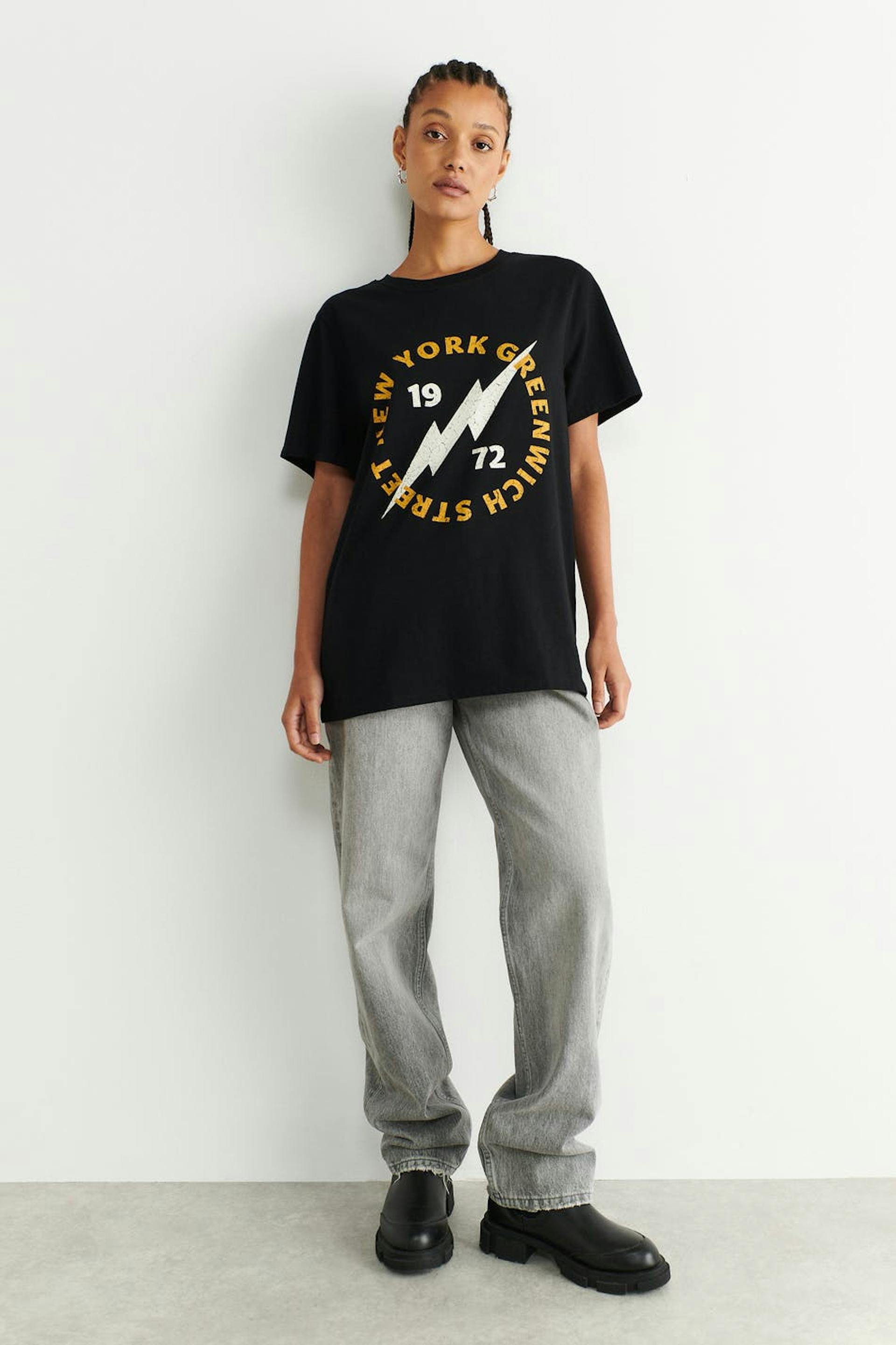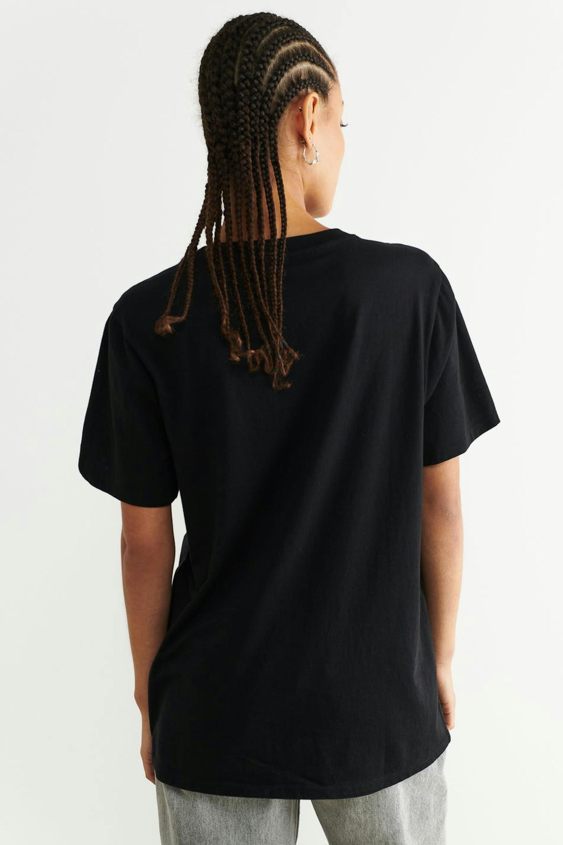 Lyhythihainen T-paita printillä edessä. T-paita on musta ja siinä on oversized-malli mukavaan ja väljään siluettiin.