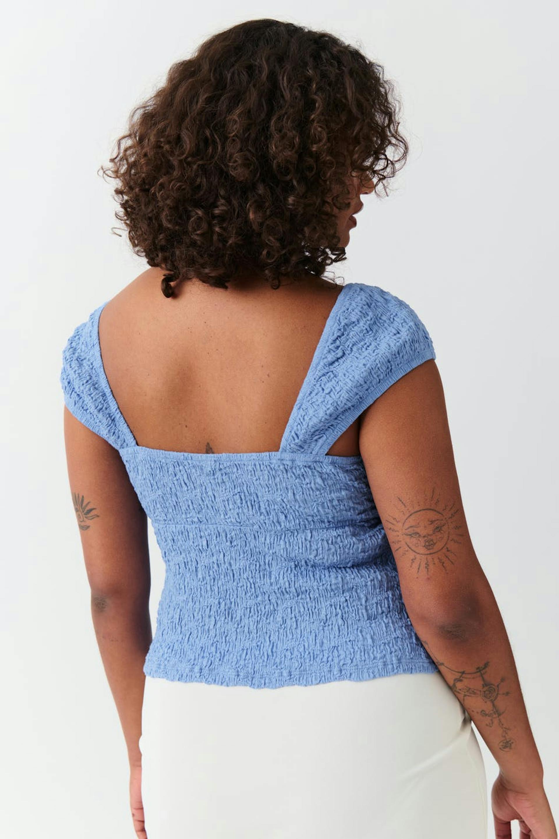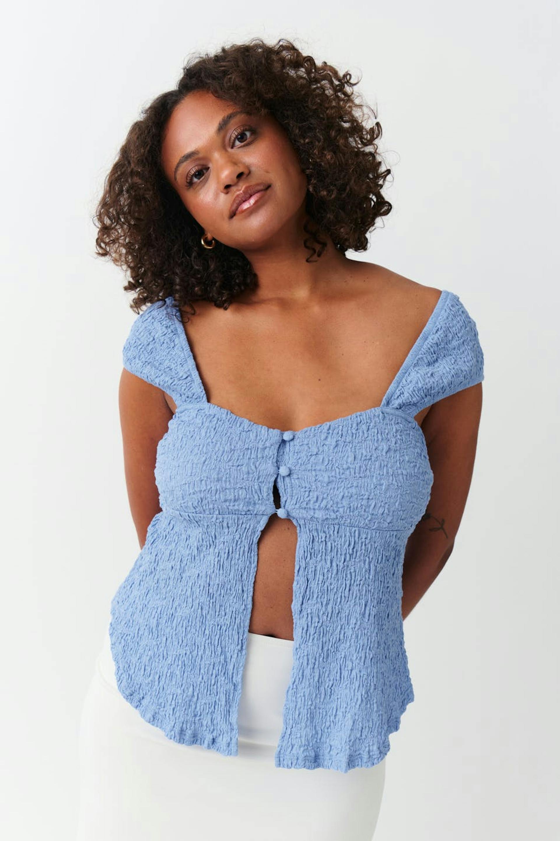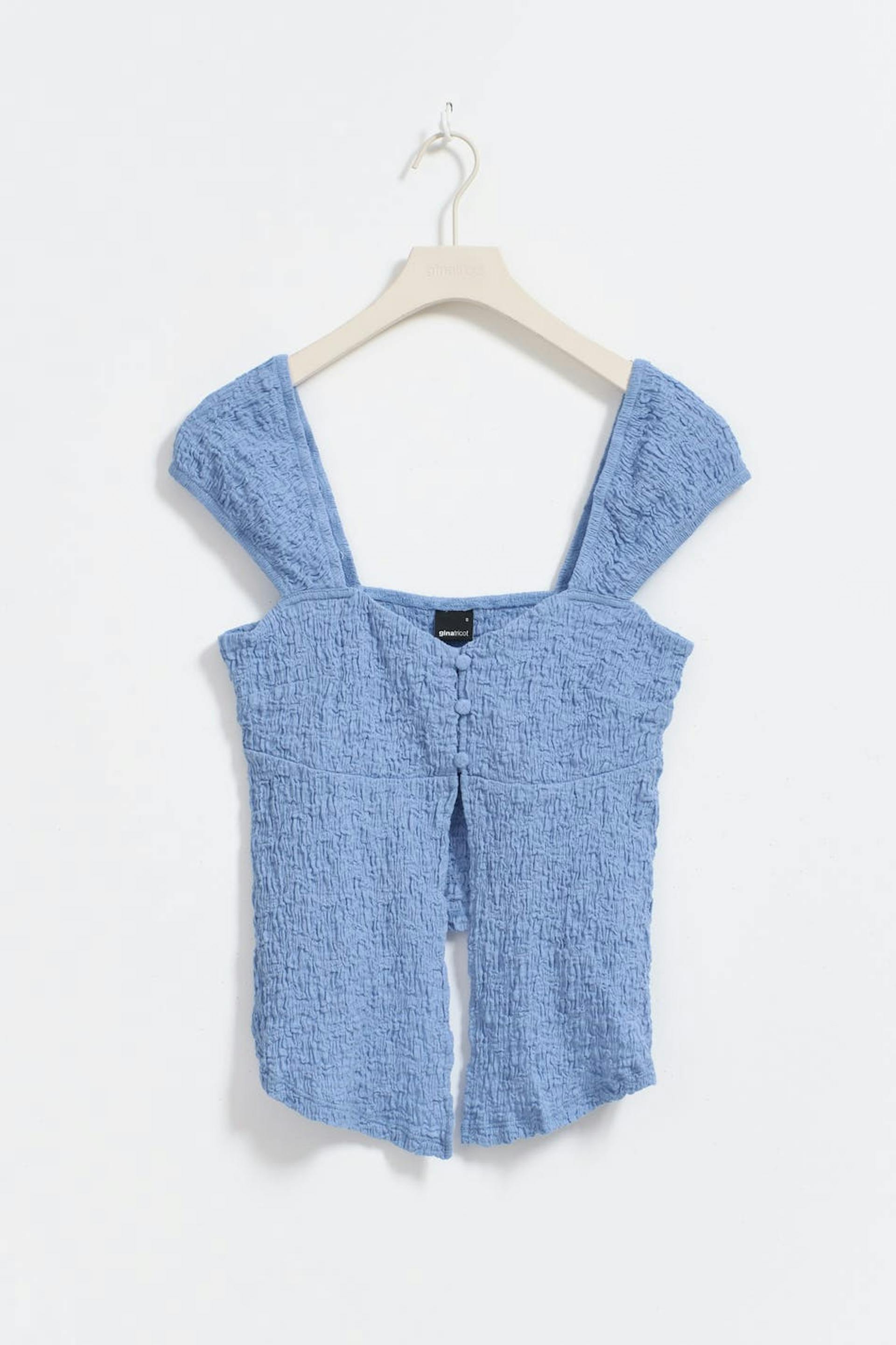 Rakenteinen toppi trikoosta avoimella etuosalla. Toppi on sininen ja siinä on napit edessä. Siinä on tyköistuva istuvuus, lyhyet holkkihihat, saumayksityiskohta rintojen alapuolella ja cropattu pituus.