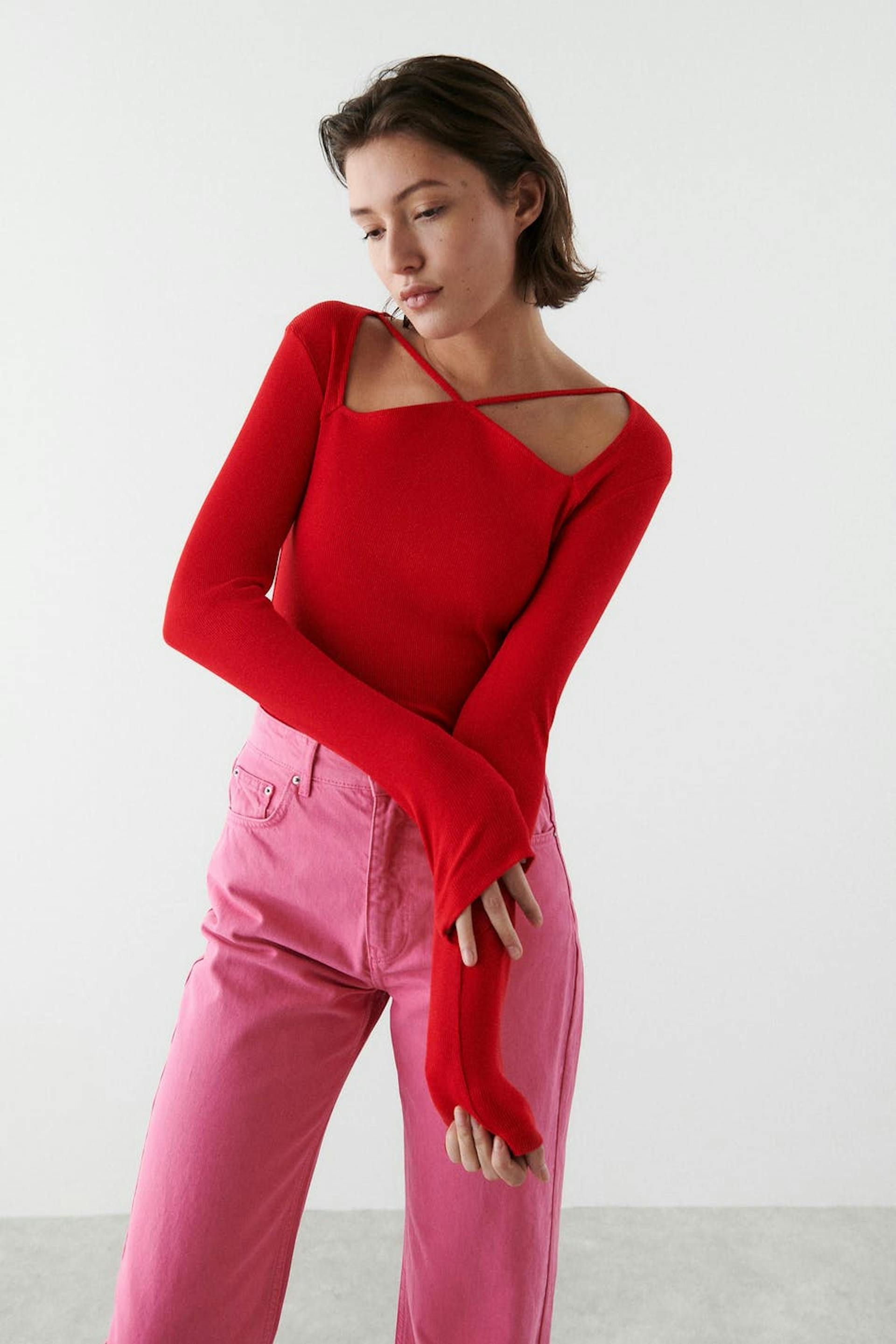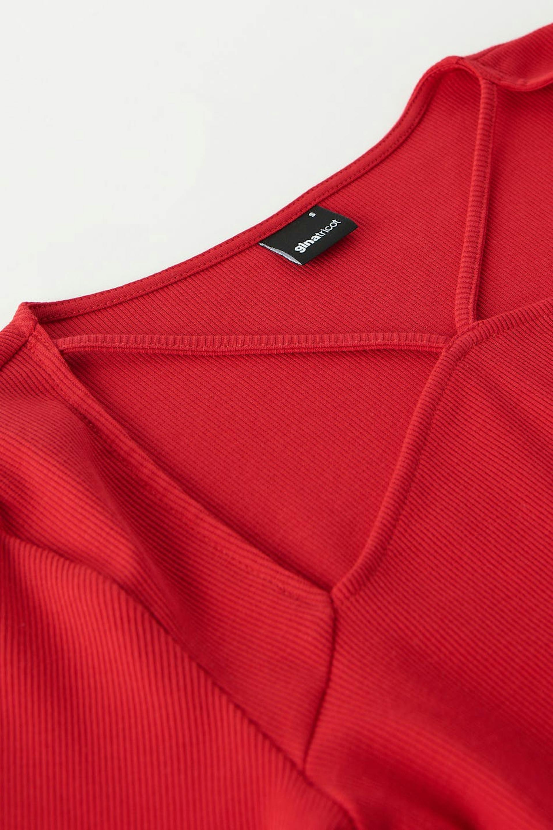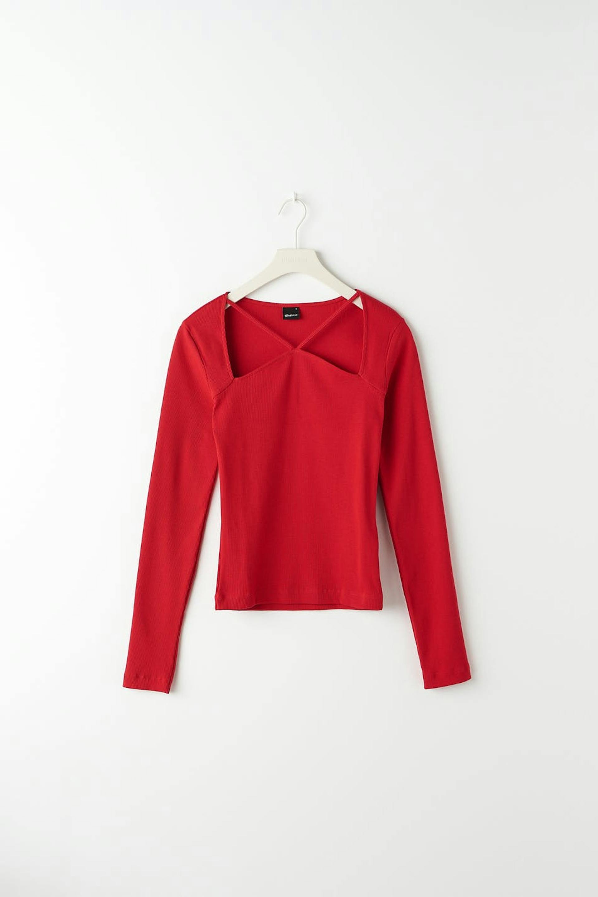 Pitkähihainen toppi neliöpääntiellä ohuilla olkaimilla. Toppi on punainen ja siinä on vartalonmyötäinen sopivuus. Se valmistetaan trikoosta ja siinä on ribattu laatu.