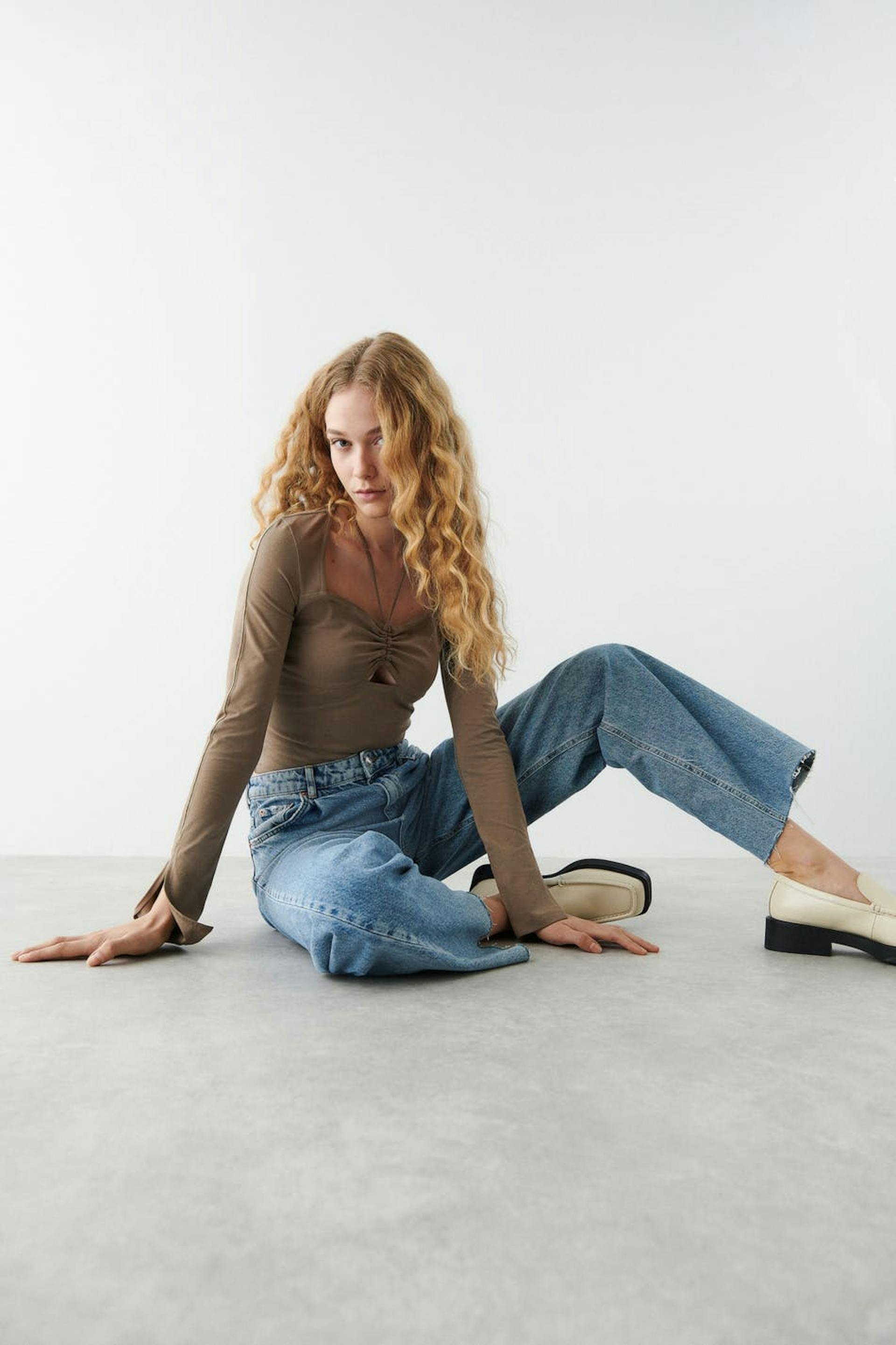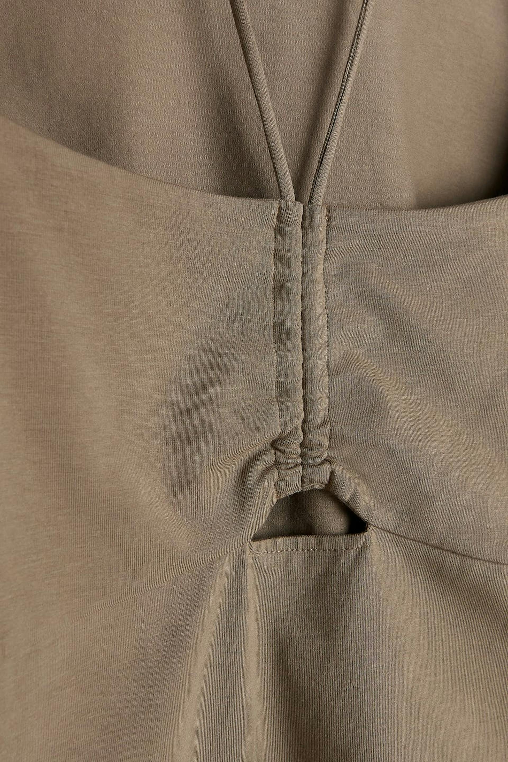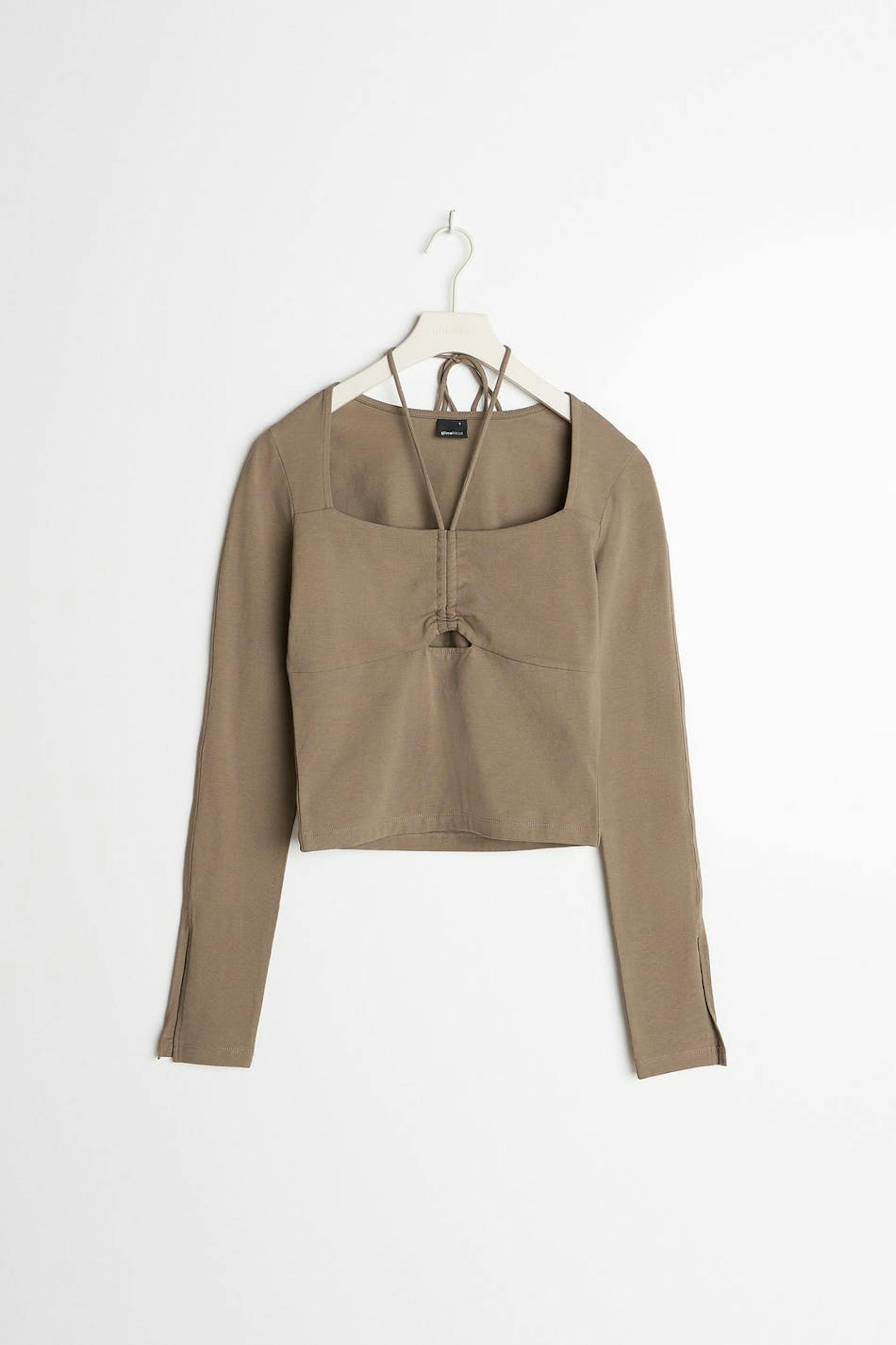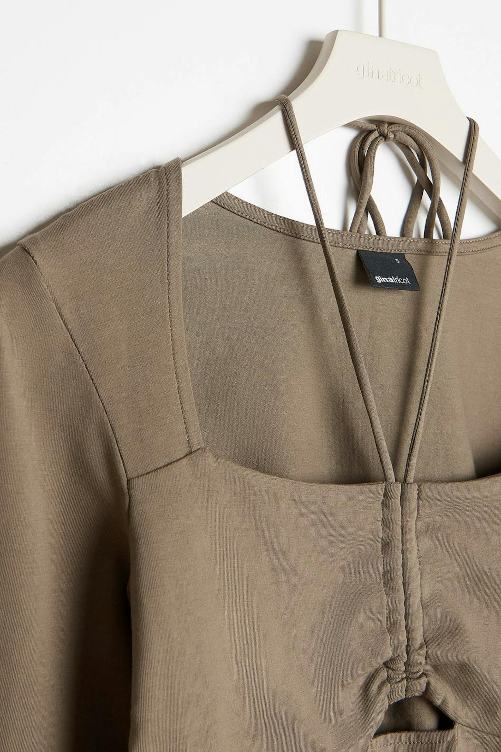 Pitkähihainen toppi halterneck-mallilla. Toppi on beige ja siinä on vartalonmyötäinen istuvuus. Siinä on neliöpääntie, solmittava vyö kaulassa, halkio hihansuissa ja saumayksityiskohta rintojen alapuolella avaimenreikäaukolla.