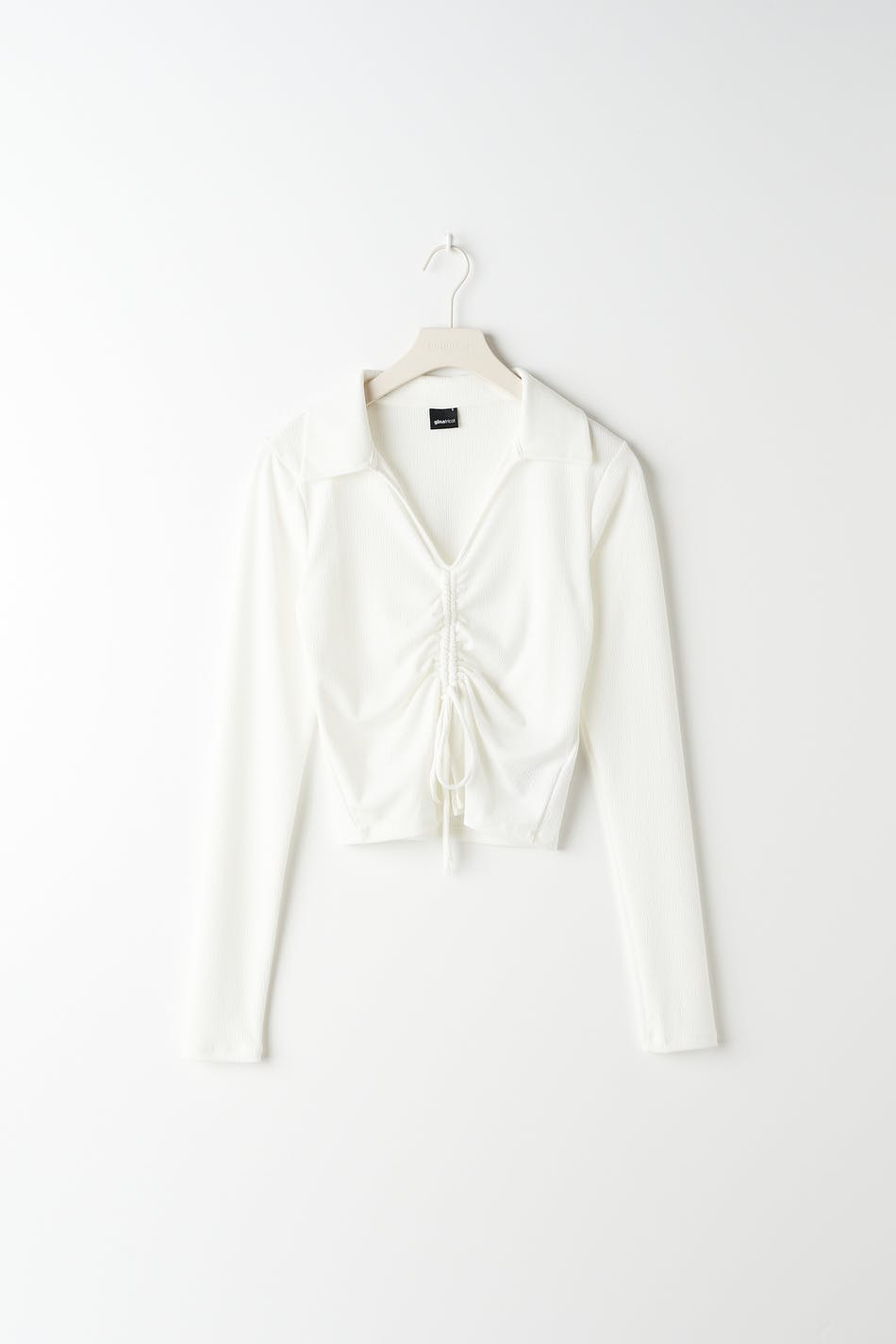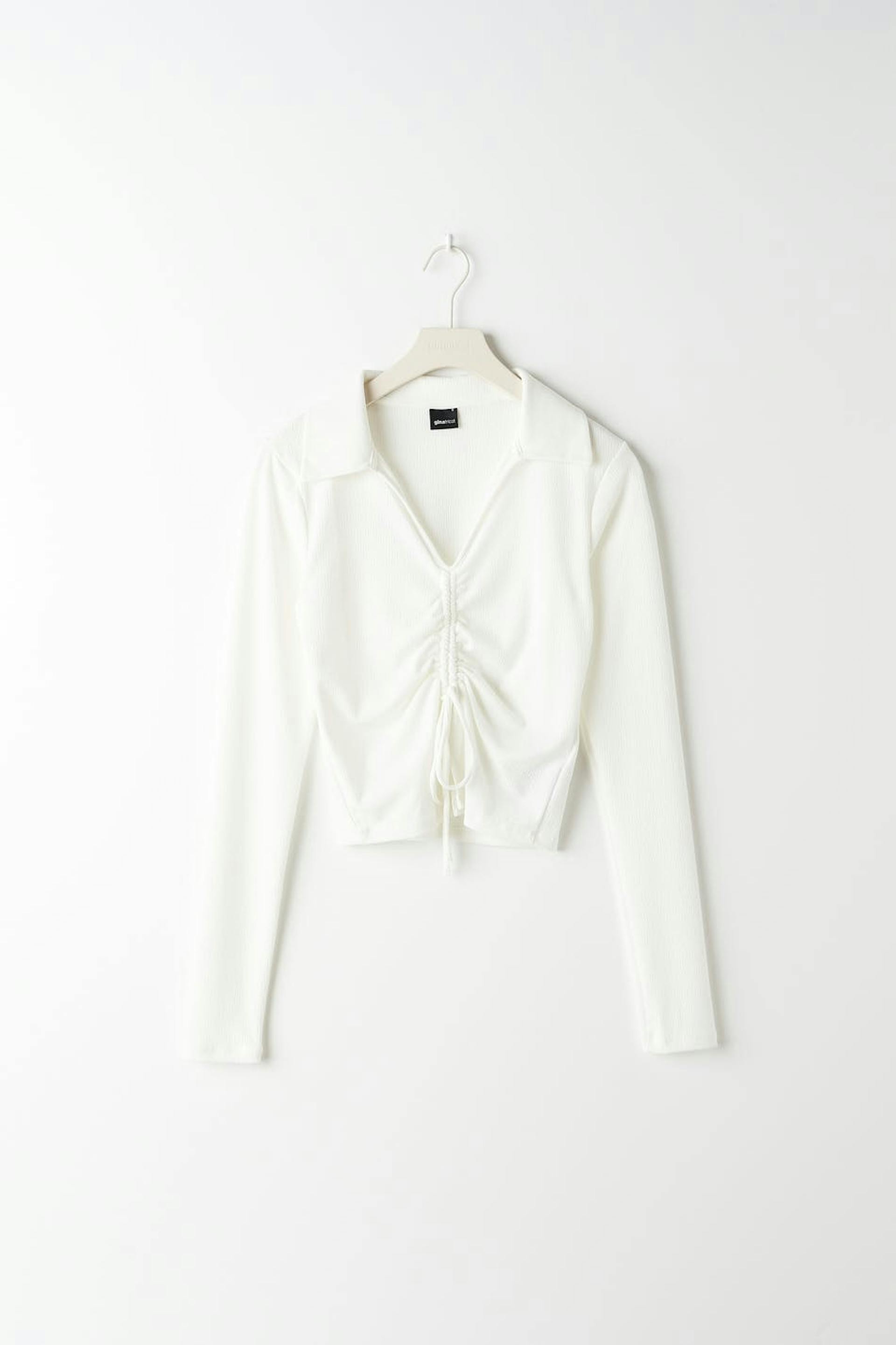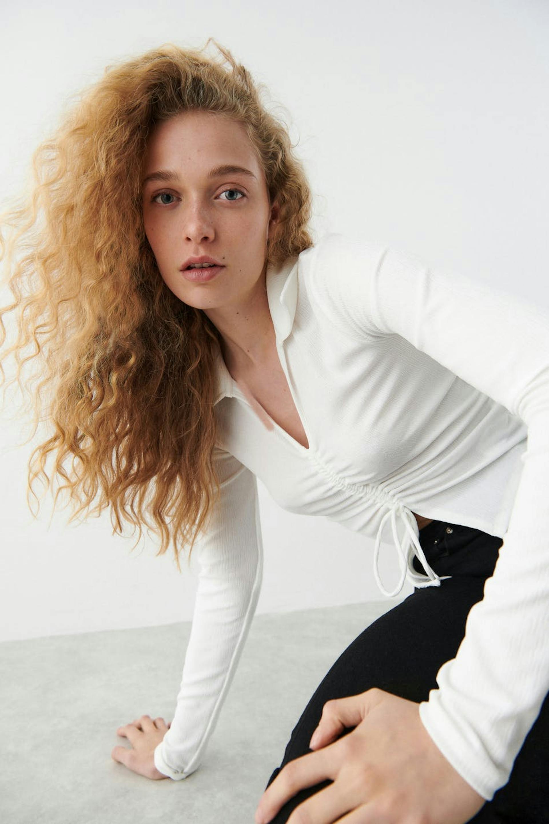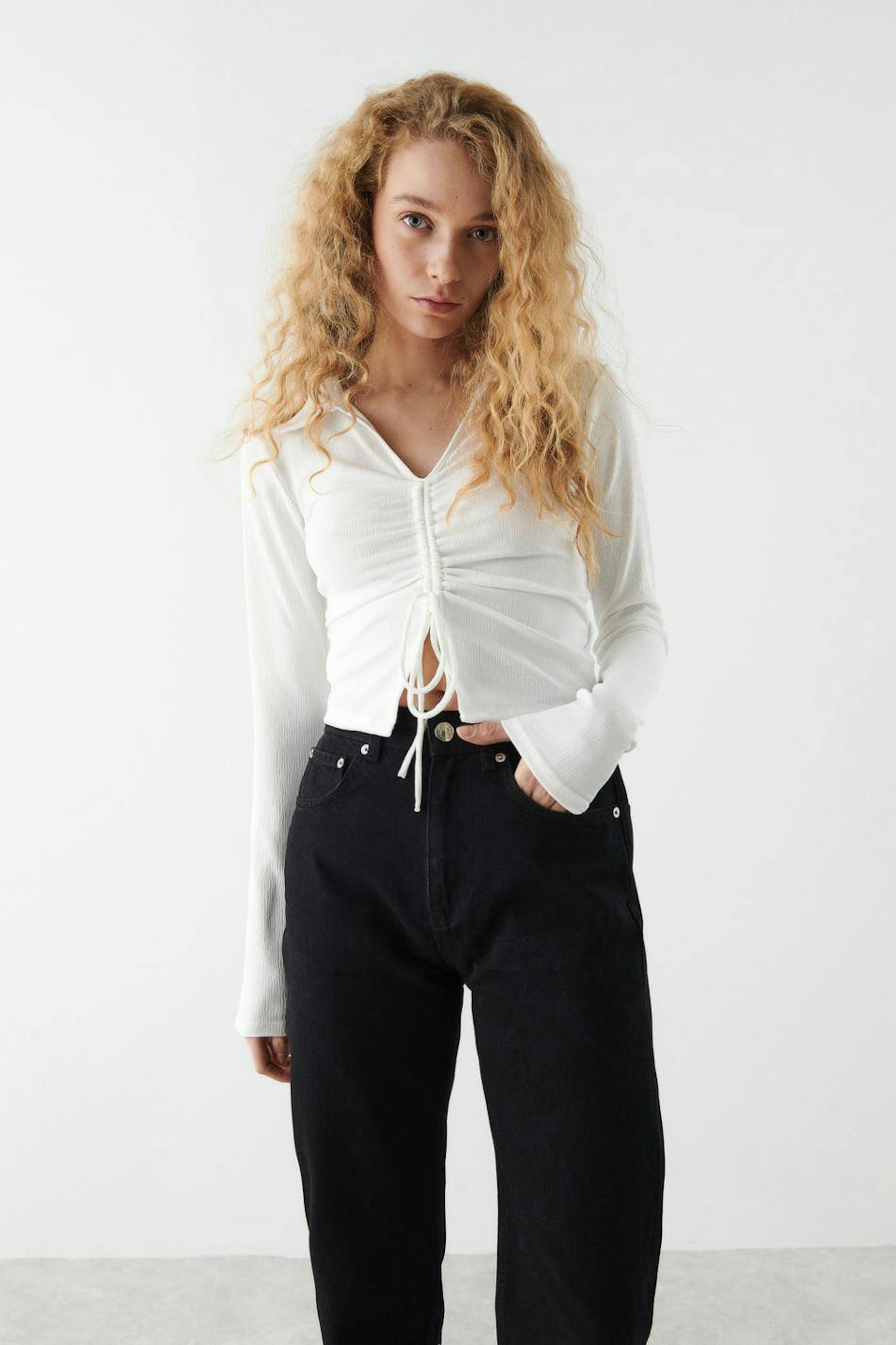 Pitkähihainen toppi kauluksella. Toppi on valkoinen ja siinä on V-aukko. Siinä on cropattu pituus ja poimutetut yksityiskohdat kiristysnyörillä edessä.
