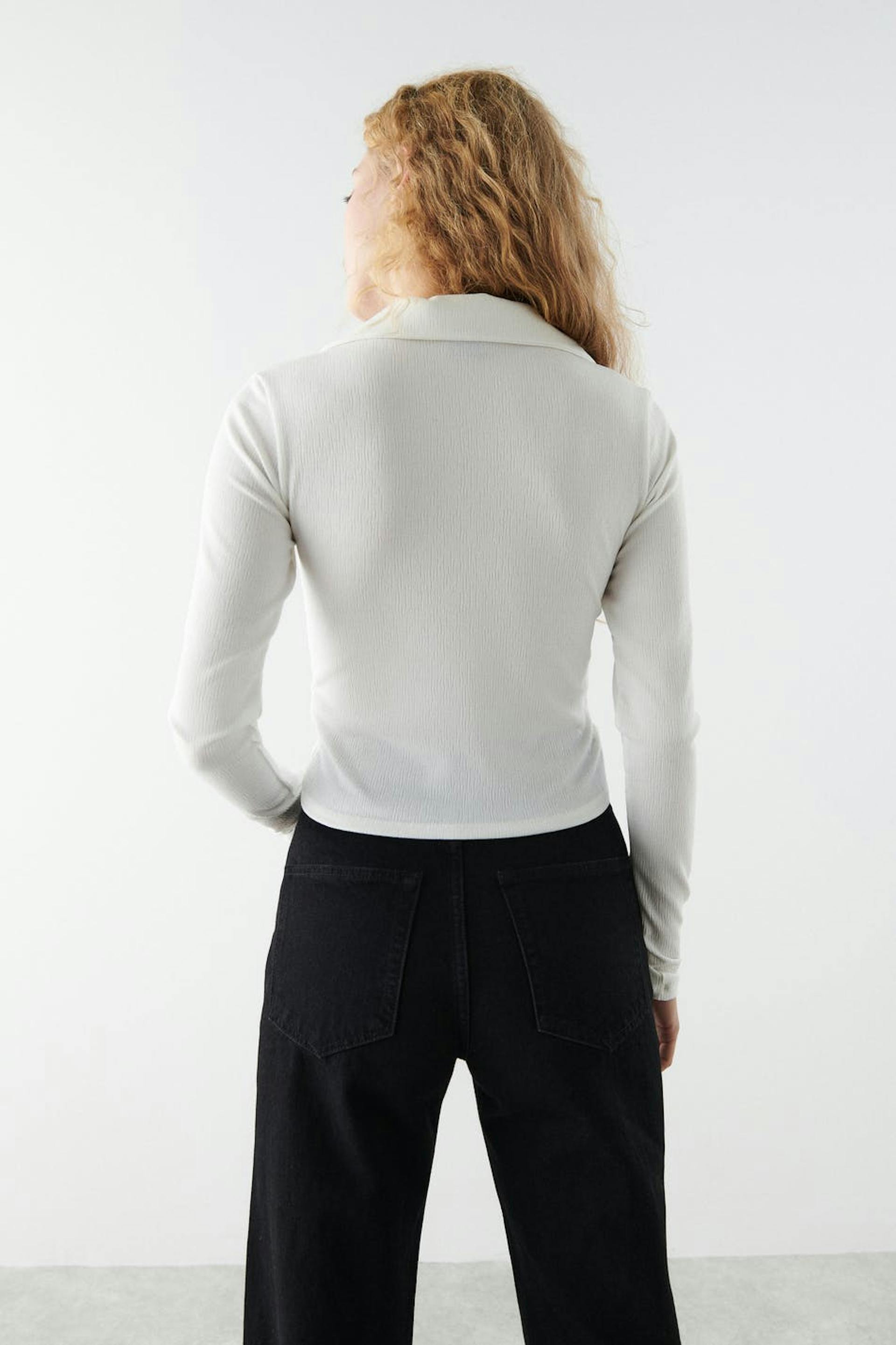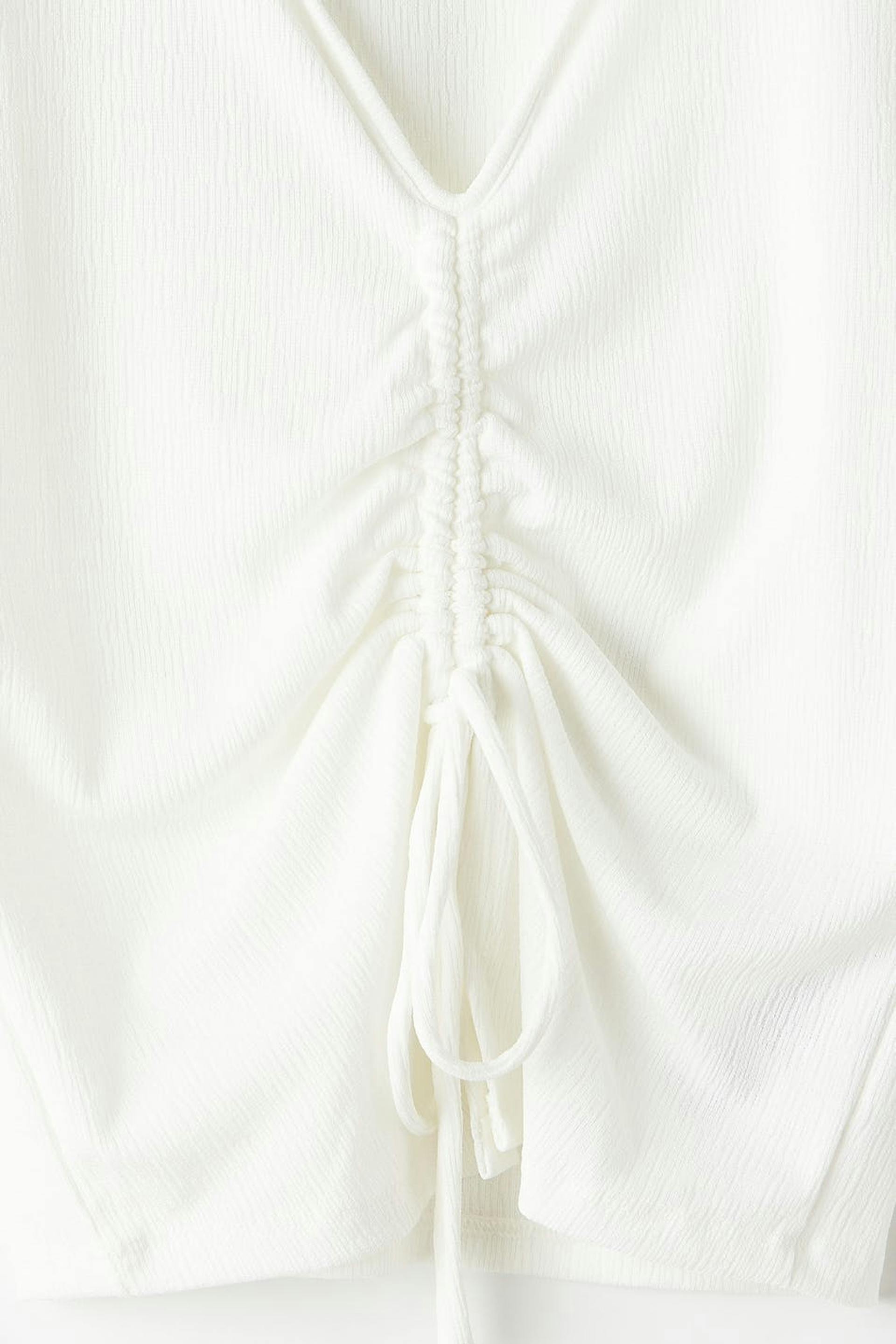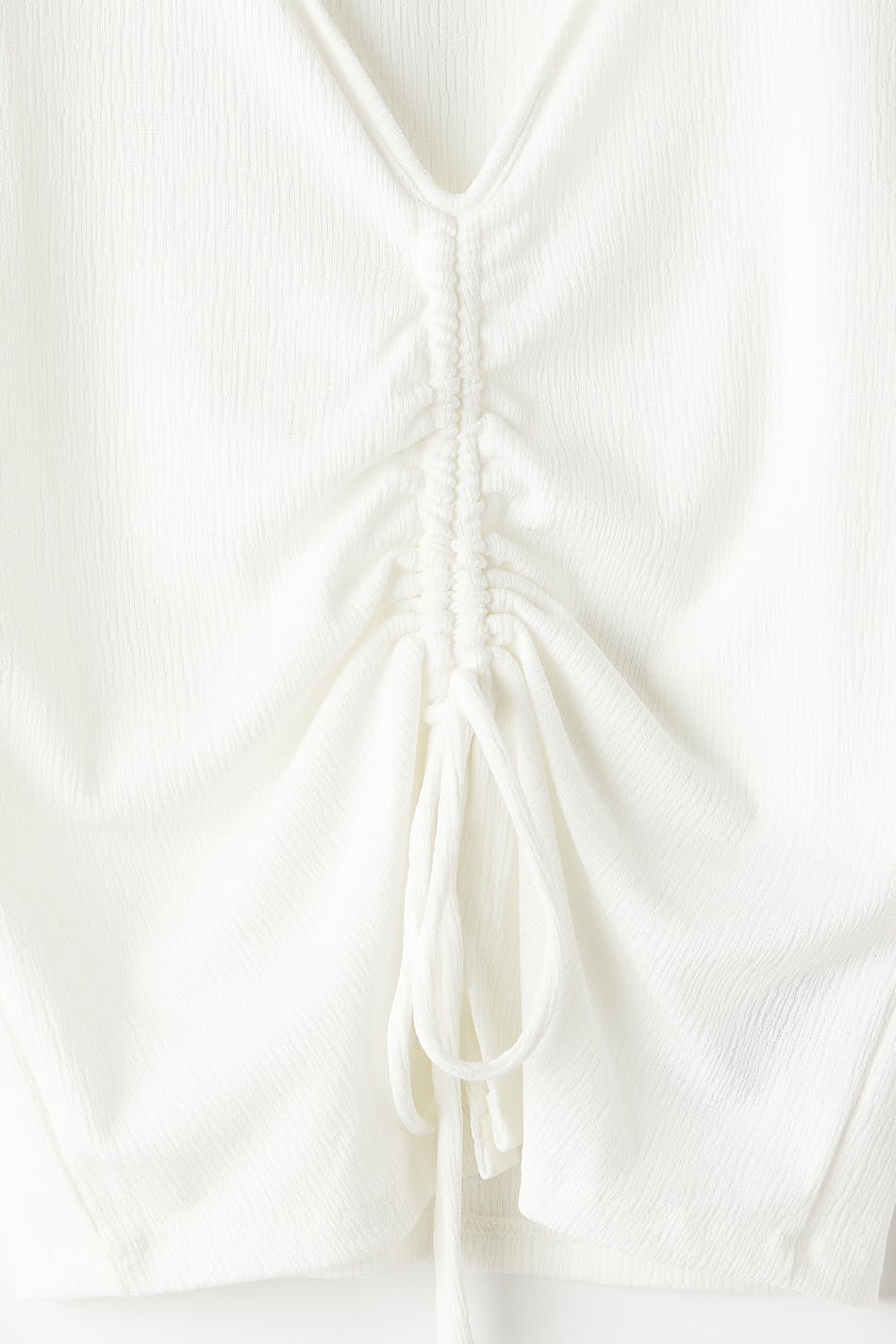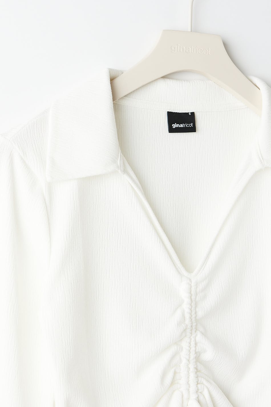 Pitkähihainen toppi kauluksella. Toppi on valkoinen ja siinä on V-aukko. Siinä on cropattu pituus ja poimutetut yksityiskohdat kiristysnyörillä edessä.