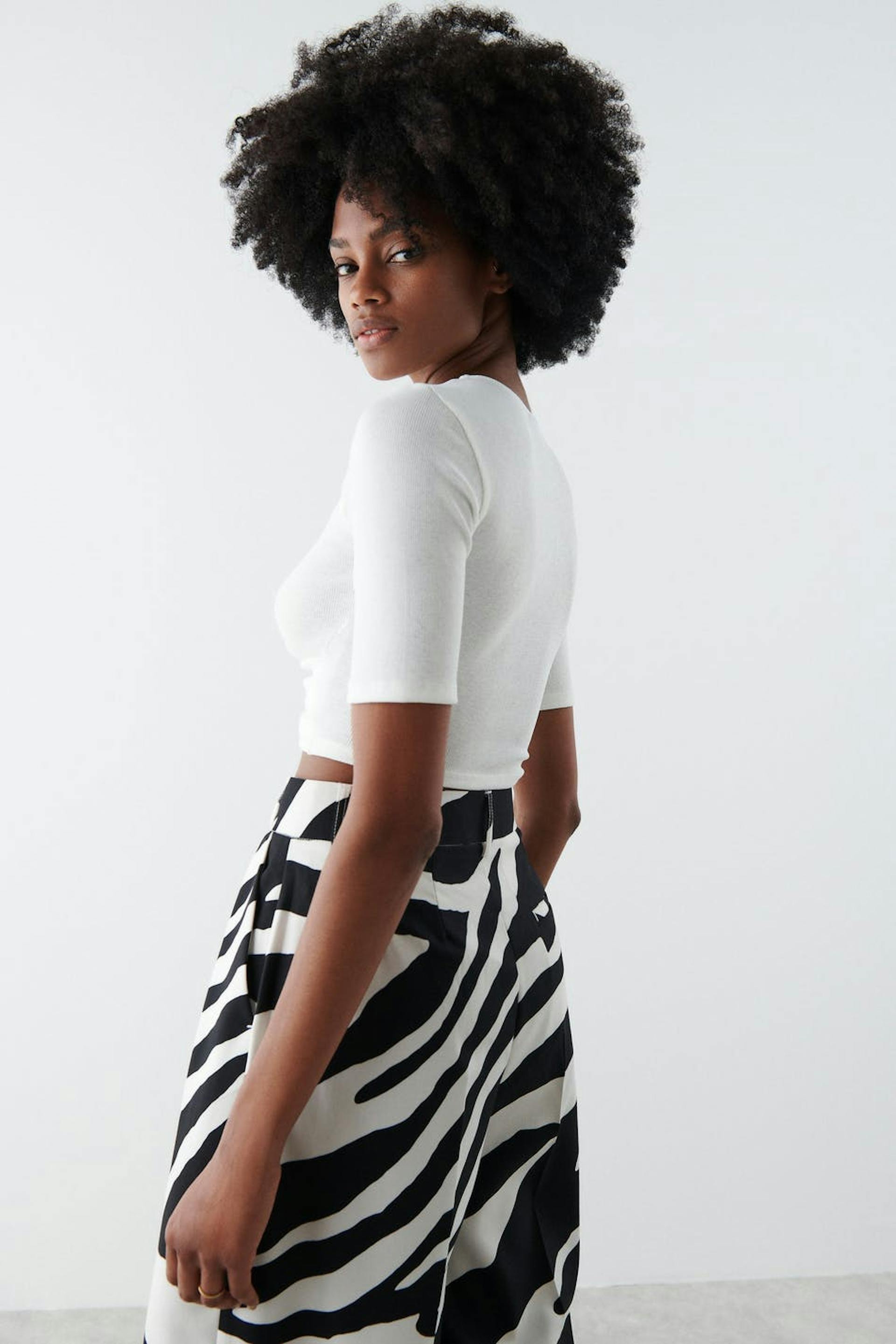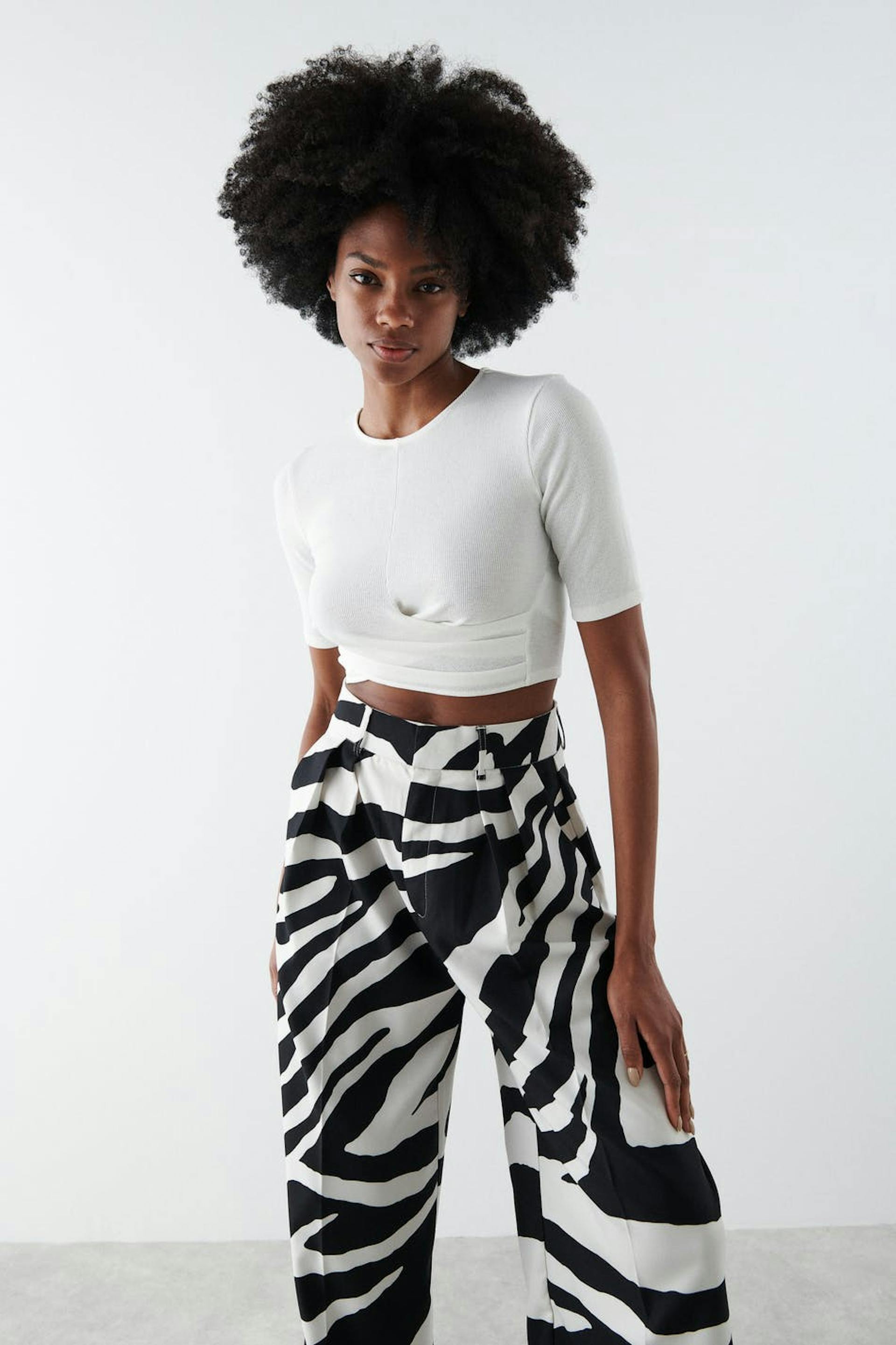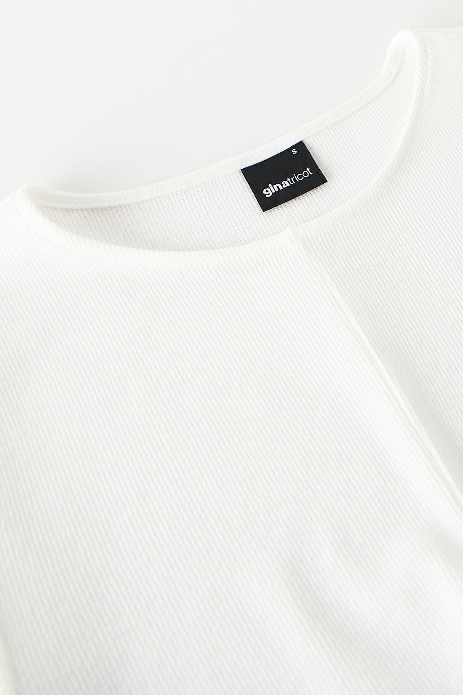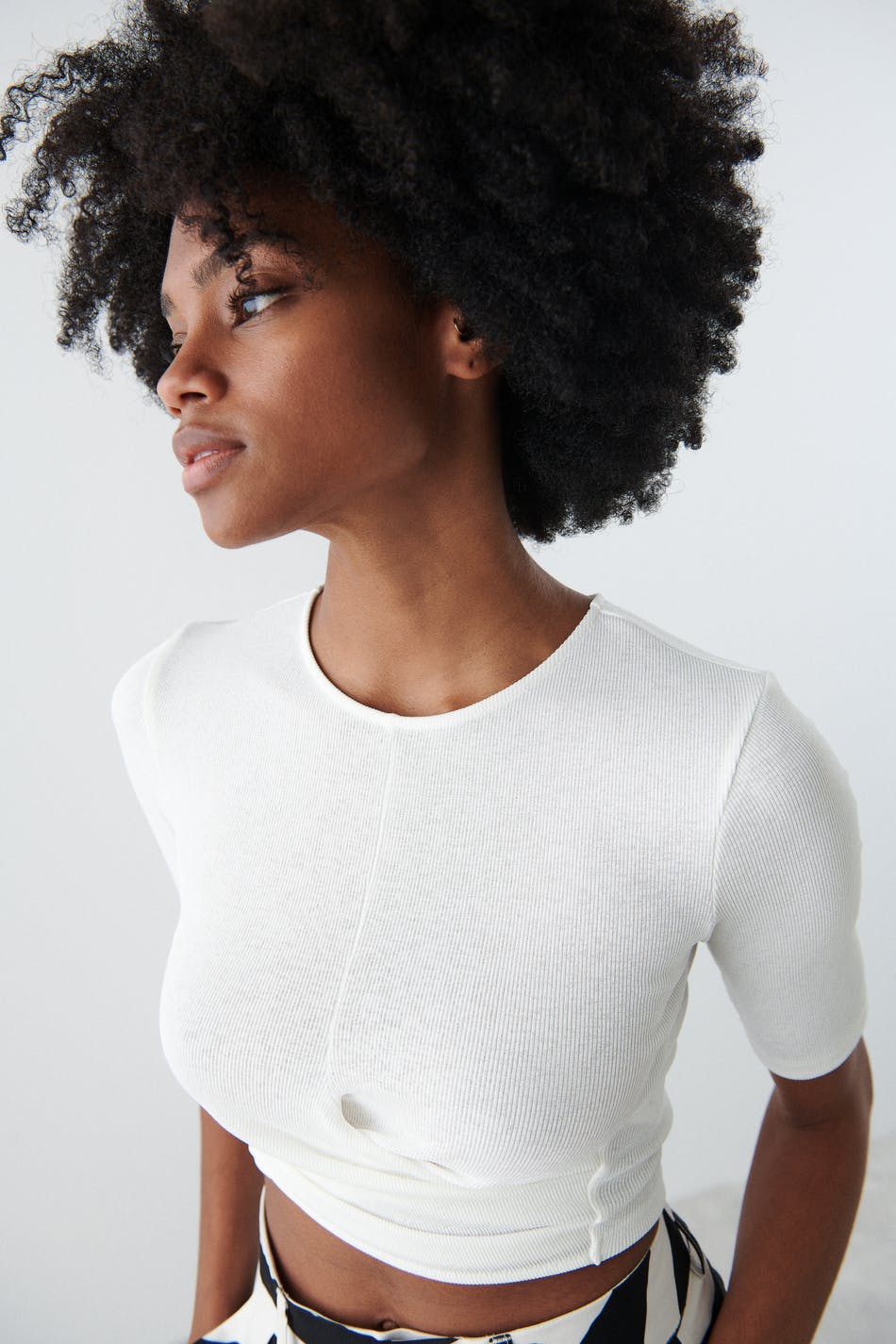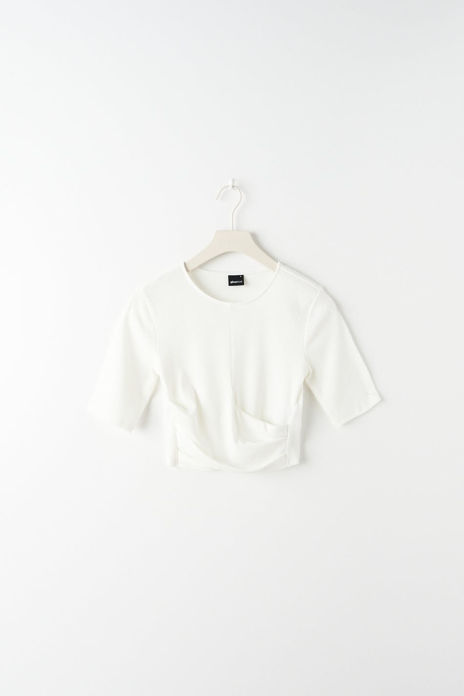Lyhythihainen kietaisutoppi vartalonmyötäisellä istuvuudella. Topissa on rypytetyt yksityiskohdat sivuilla.