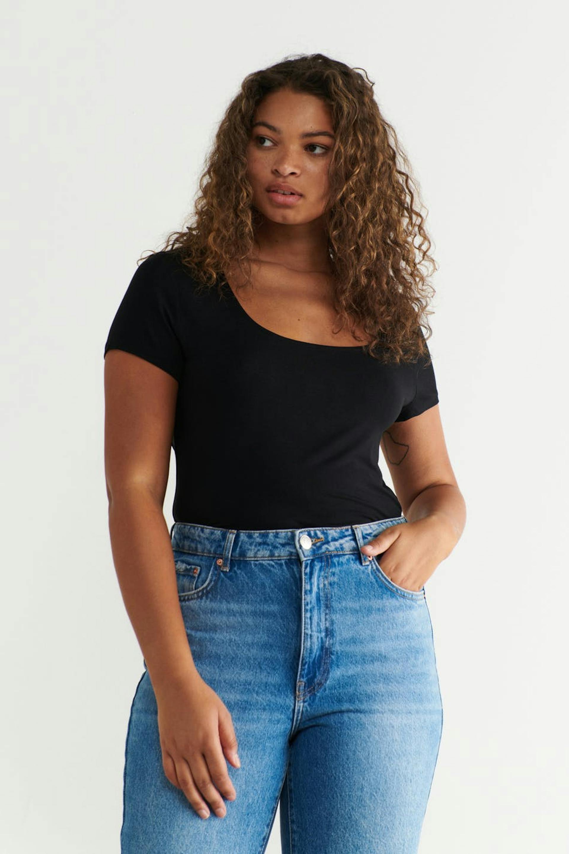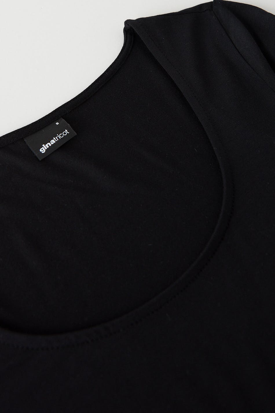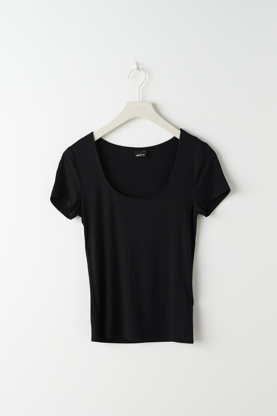 Lyhythihainen trikootoppi vartalonmyötäisellä istuvuudella. Trikootoppi on musta ja siinä on pyöreä pääntie.