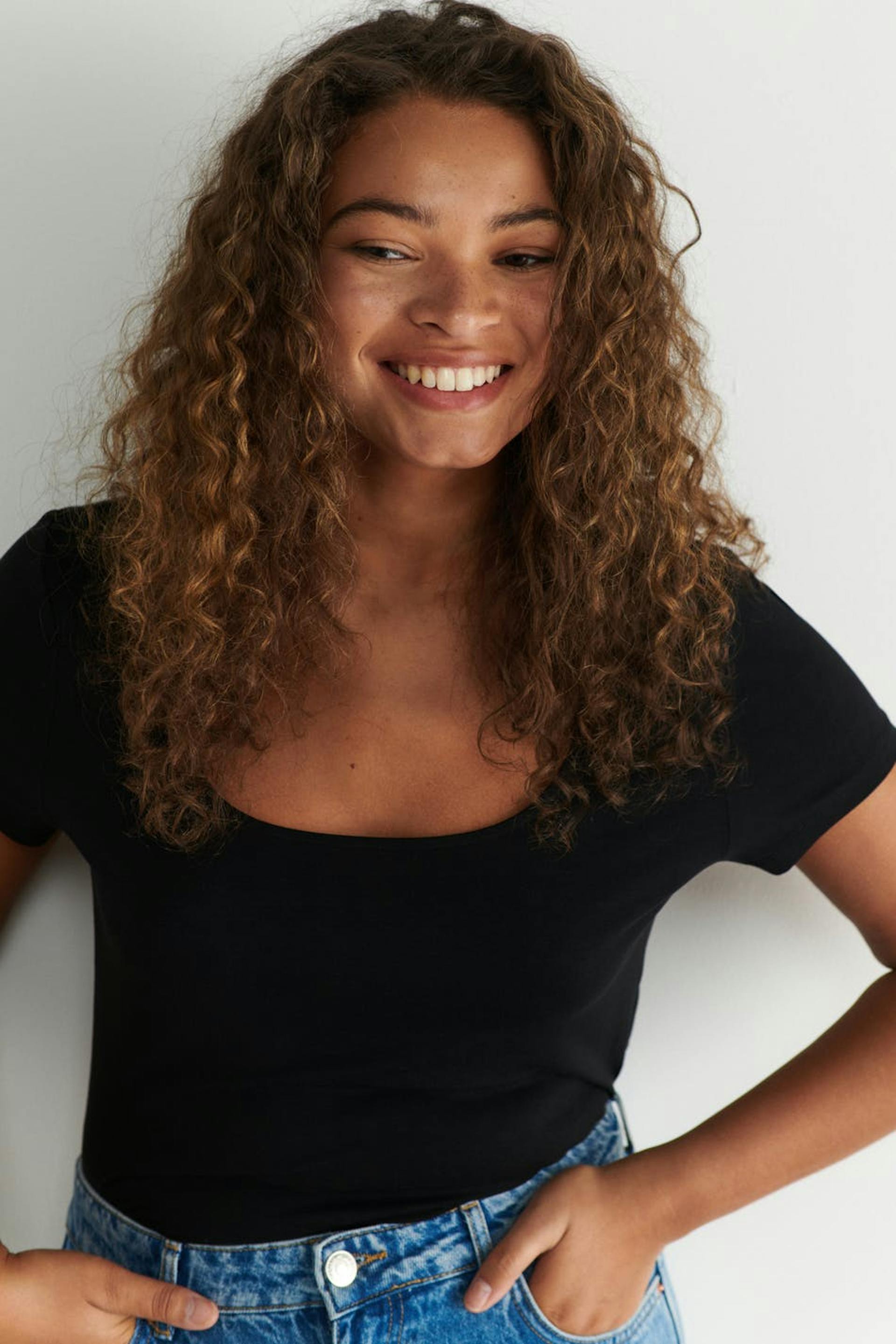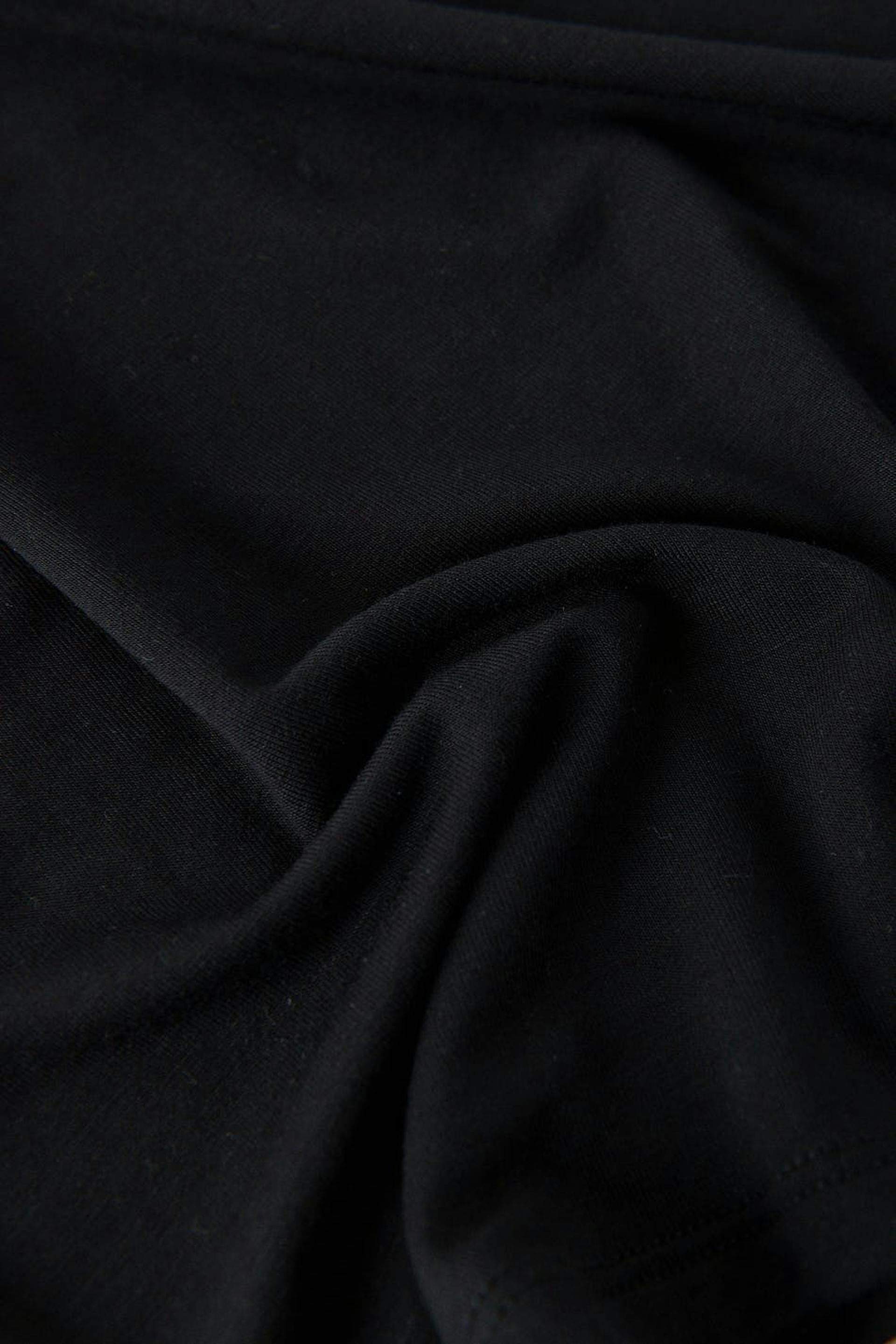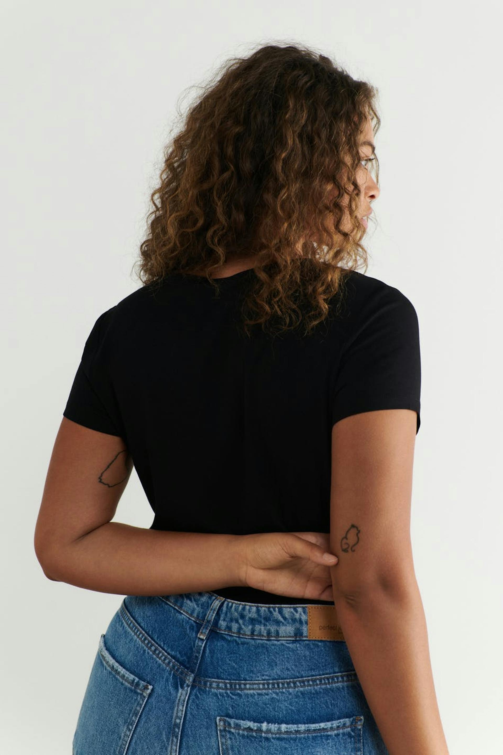 Lyhythihainen trikootoppi vartalonmyötäisellä istuvuudella. Trikootoppi on musta ja siinä on pyöreä pääntie.