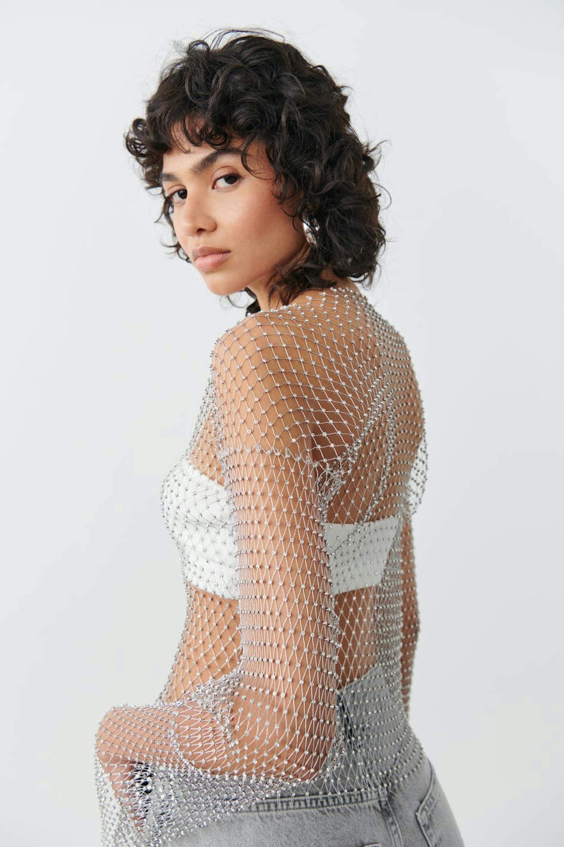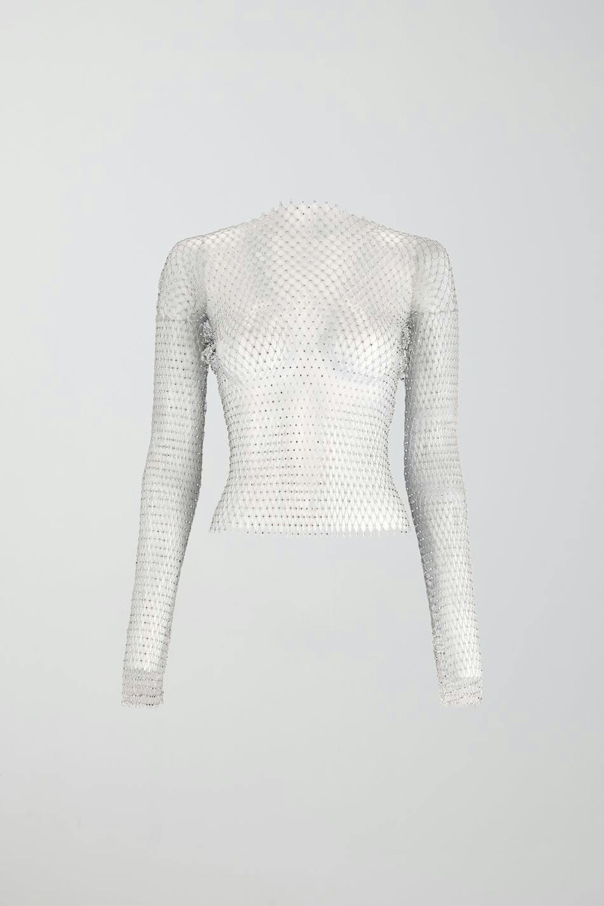 Pitkähihainen strassitoppi verkkomallilla. Toppi on hopea ja siinä on joustava laatu.
