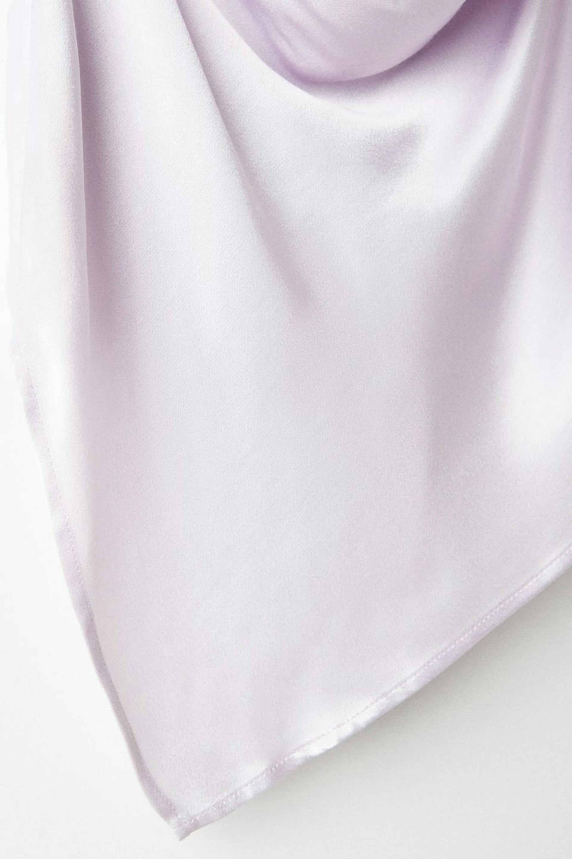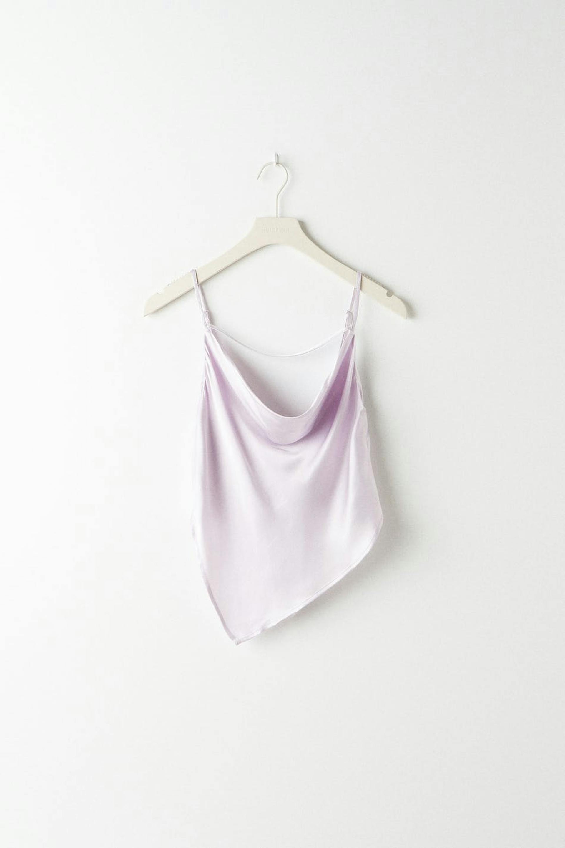 Toppi poimutetulla kauluksella. Toppi on juhliin täydellisesti sopiva ja liila ja siinä on ohuet, säädettävät olkaimet. Siinä on solmittava vyö selässä ja epäsymmetrinen helma.