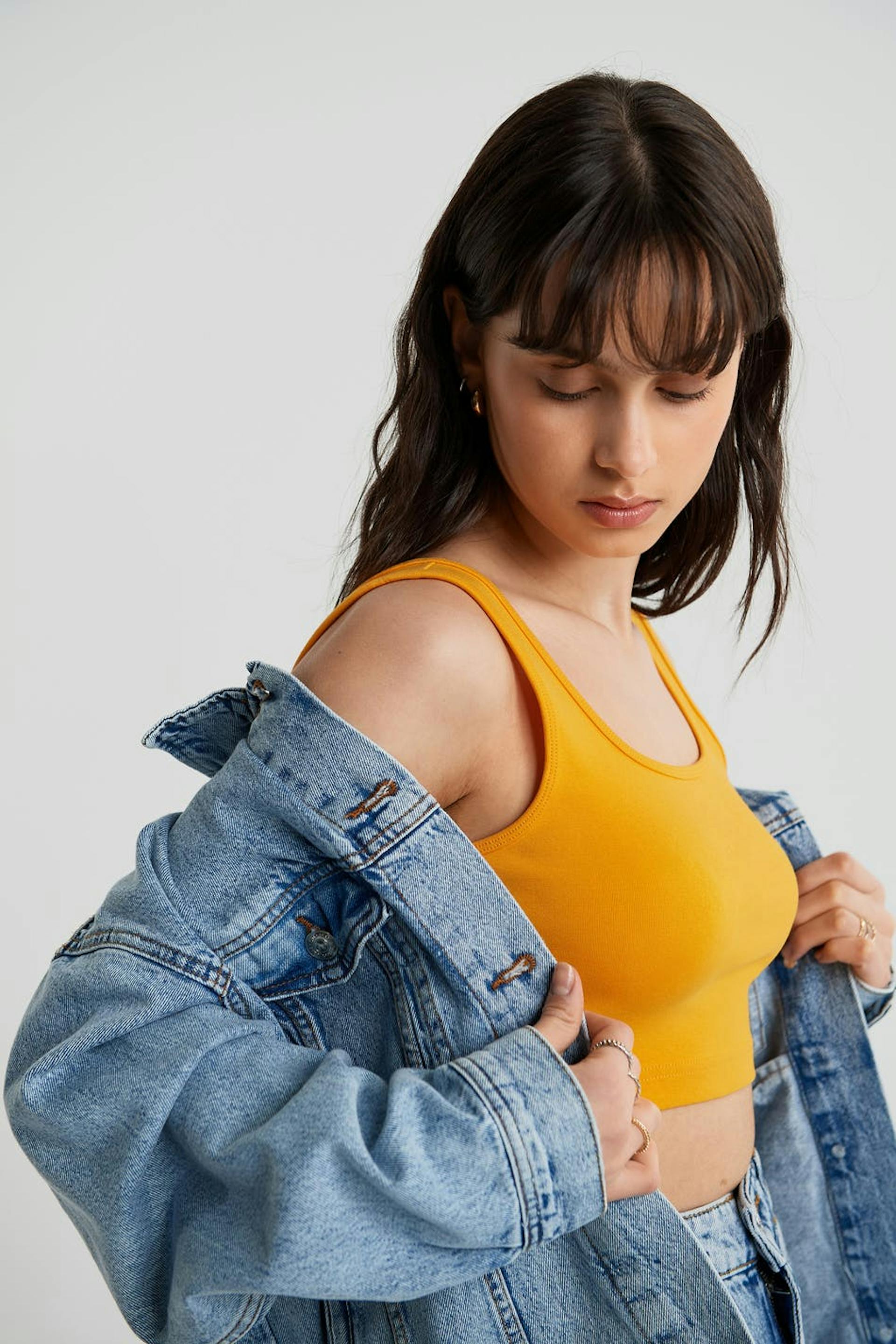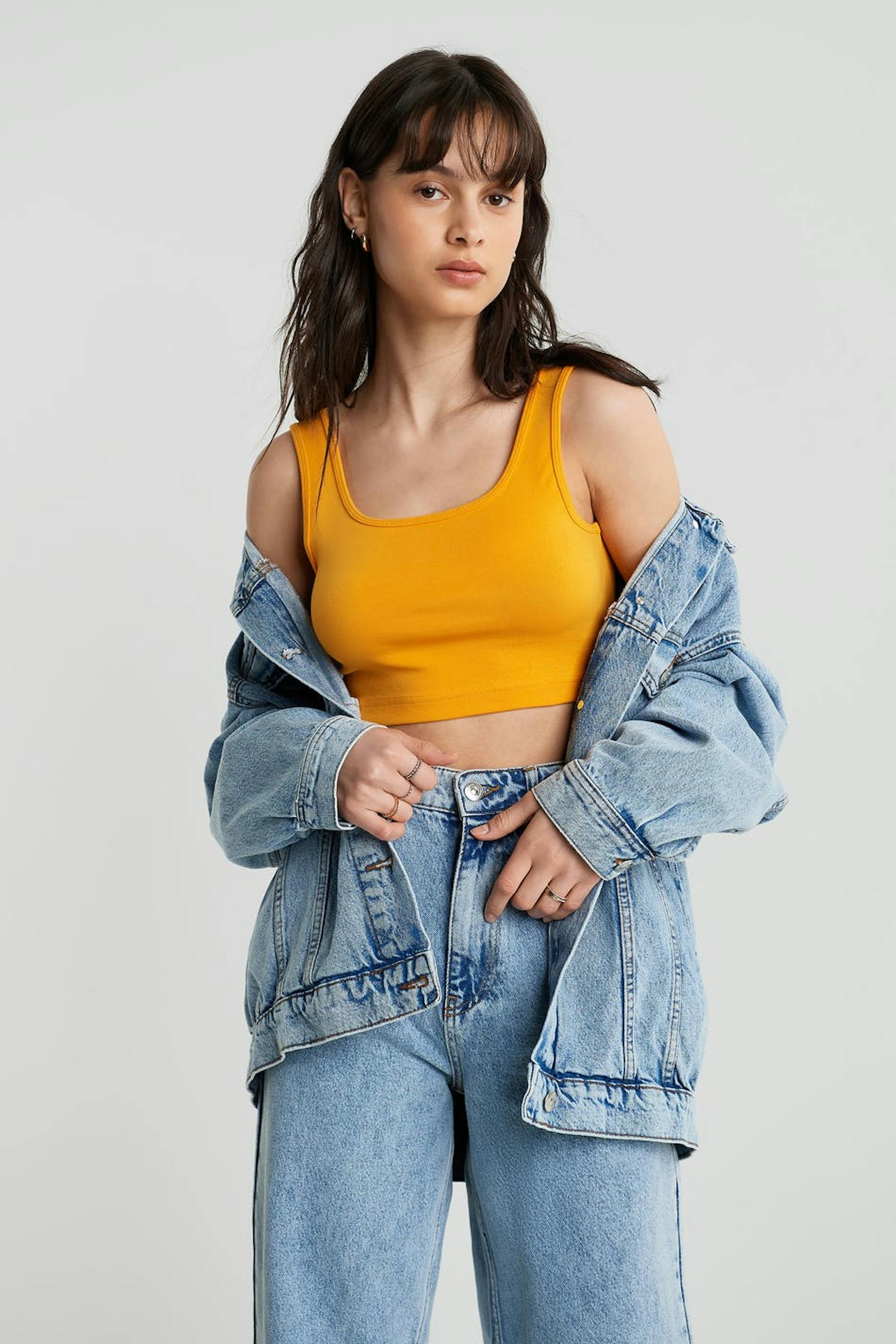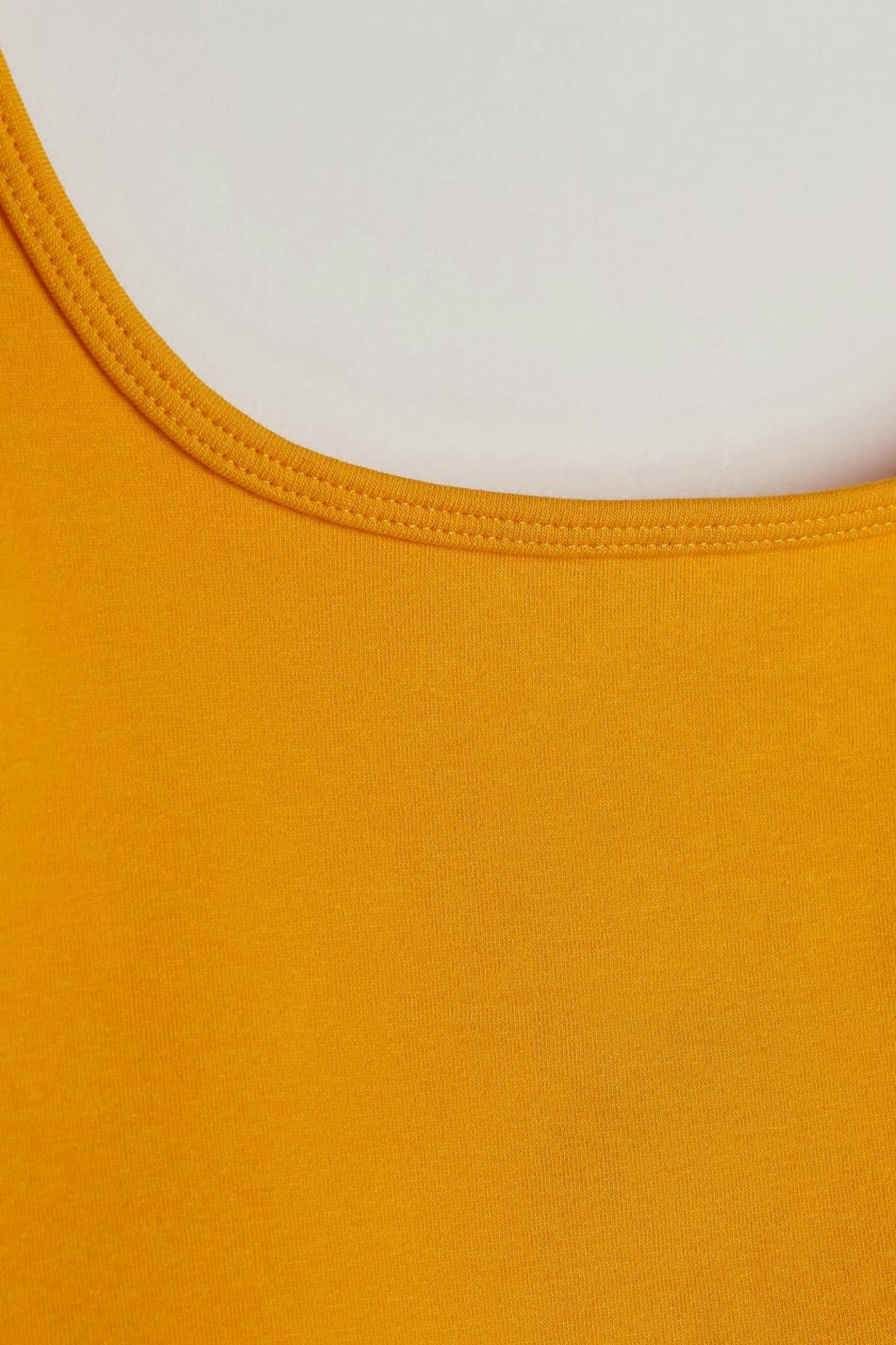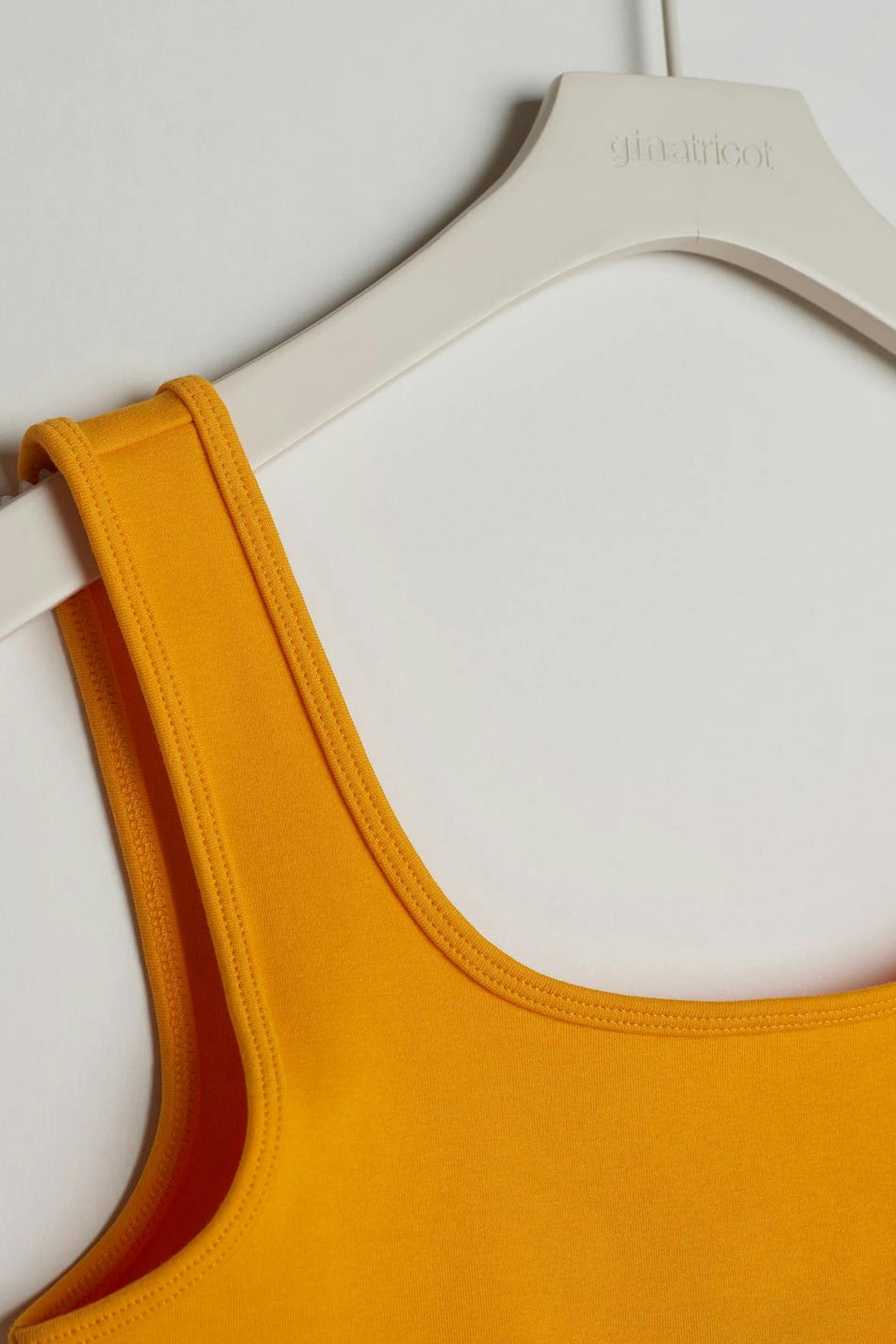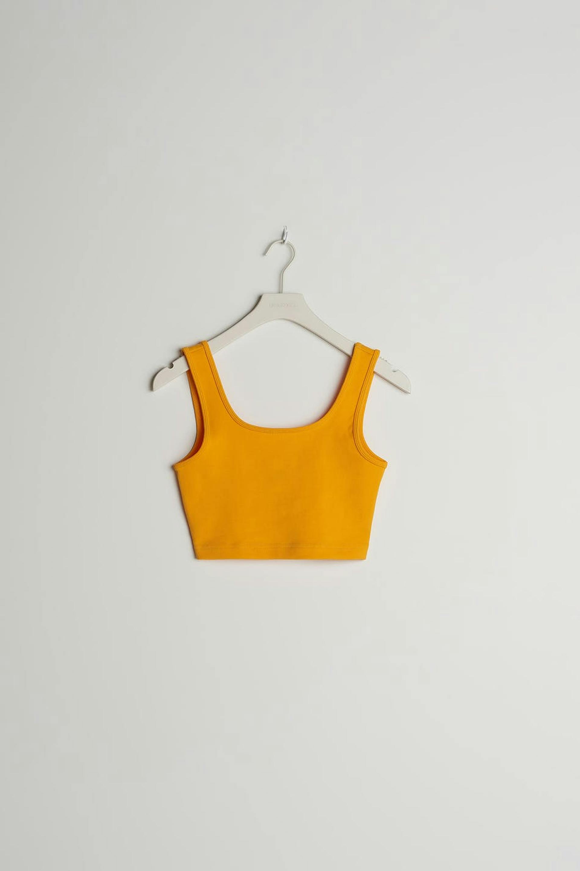 Hihaton toppi vartalonmyötäisellä istuvuudella. Toppi on keltainen ja erittäin joustava ja siinä on cropattu pituus.