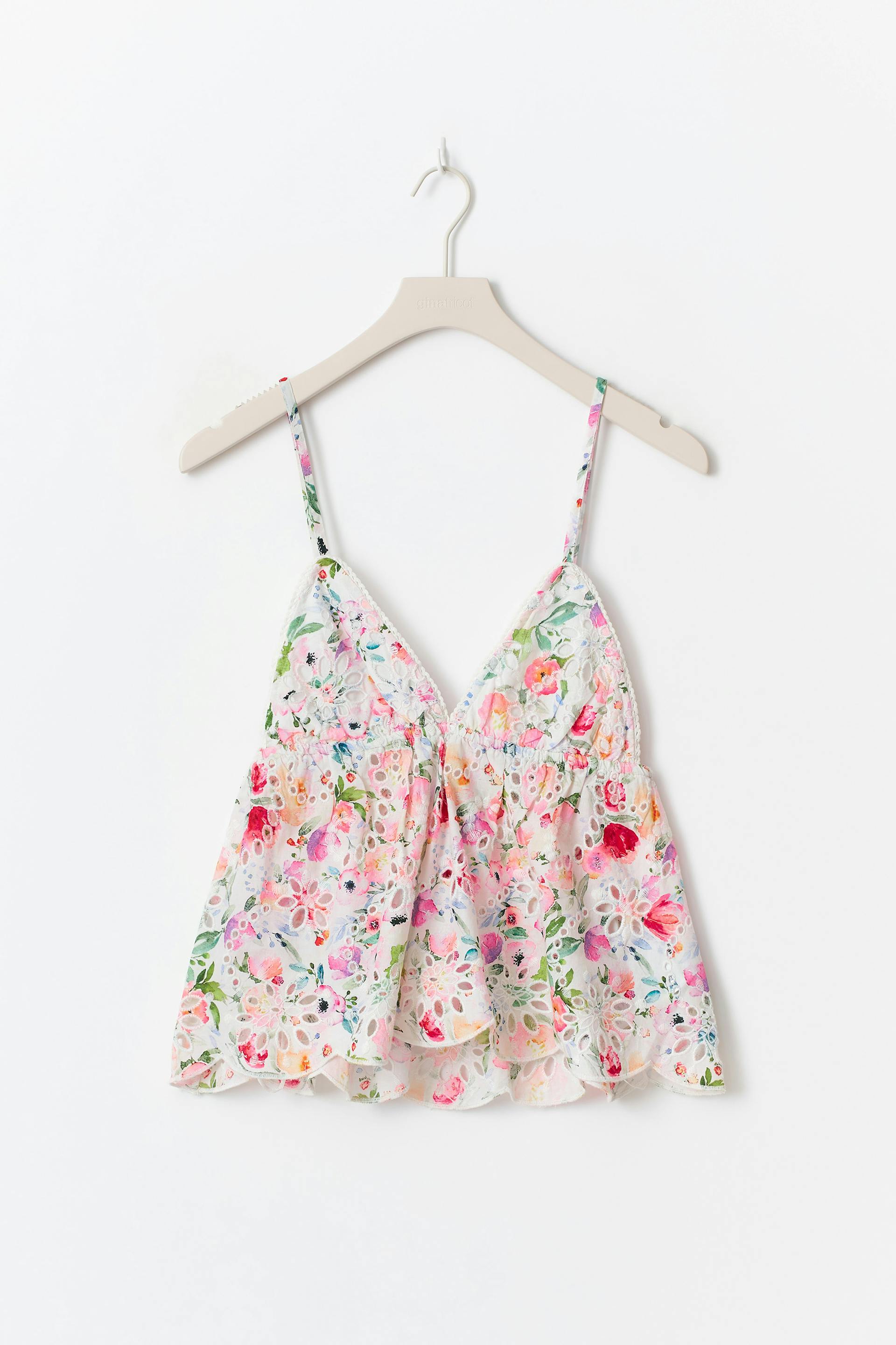 Kukallinen aluspaita kirjailulla. Aluspaidassa on v-pääntie. Siinä on säädettävät olkaimet, normaali leikkaus ja vuorattu rintaosa.