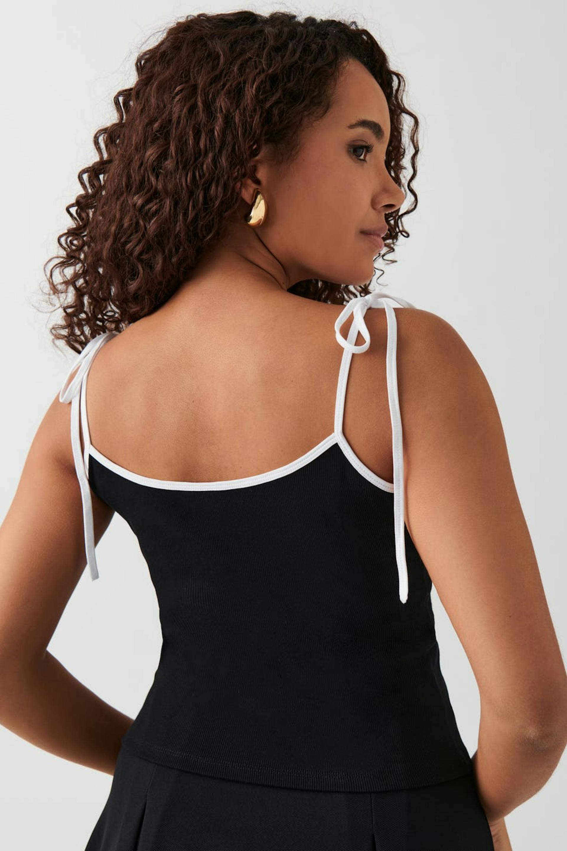 Toppi vartalonmyötäisellä istuvuudella. Toppi on musta.