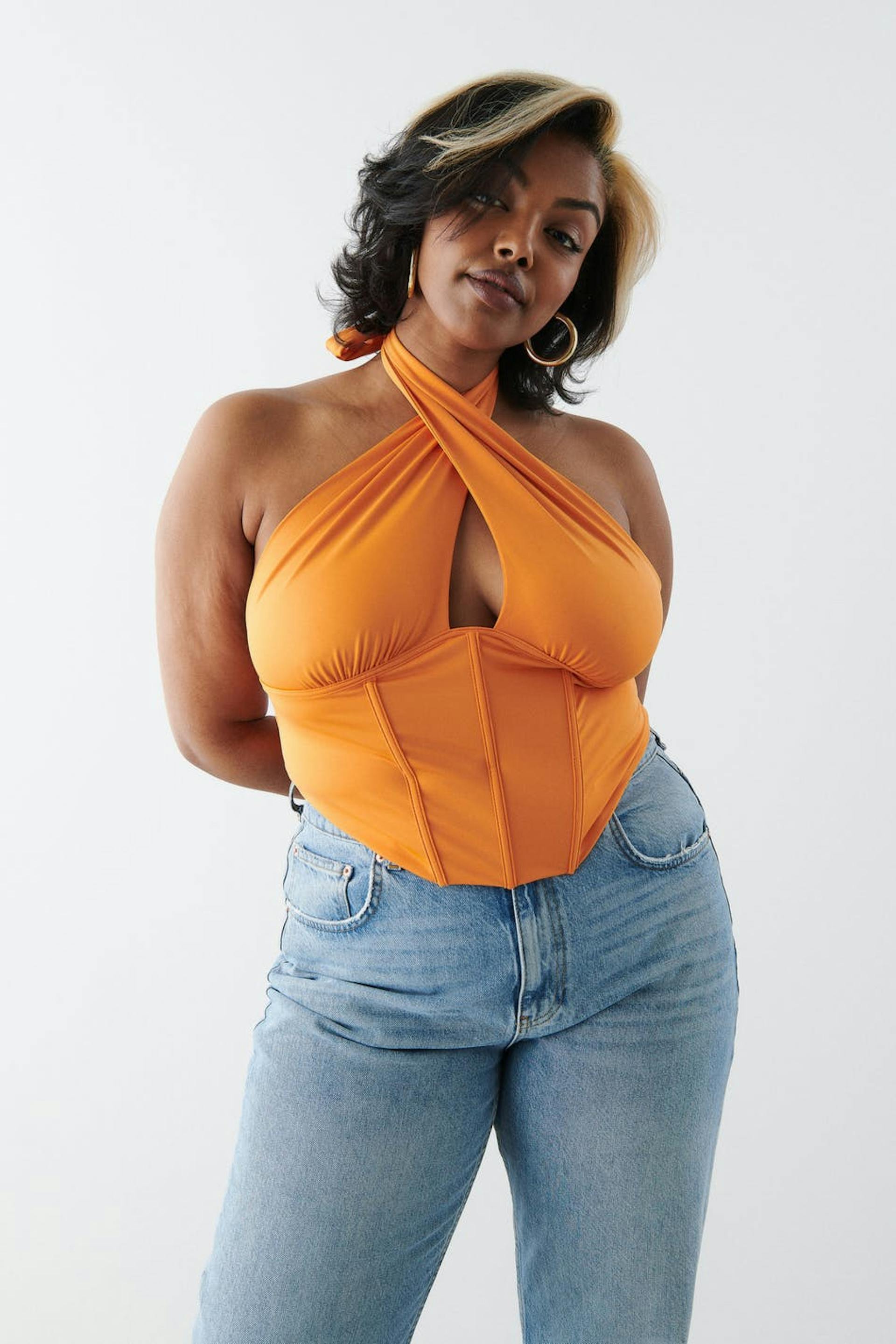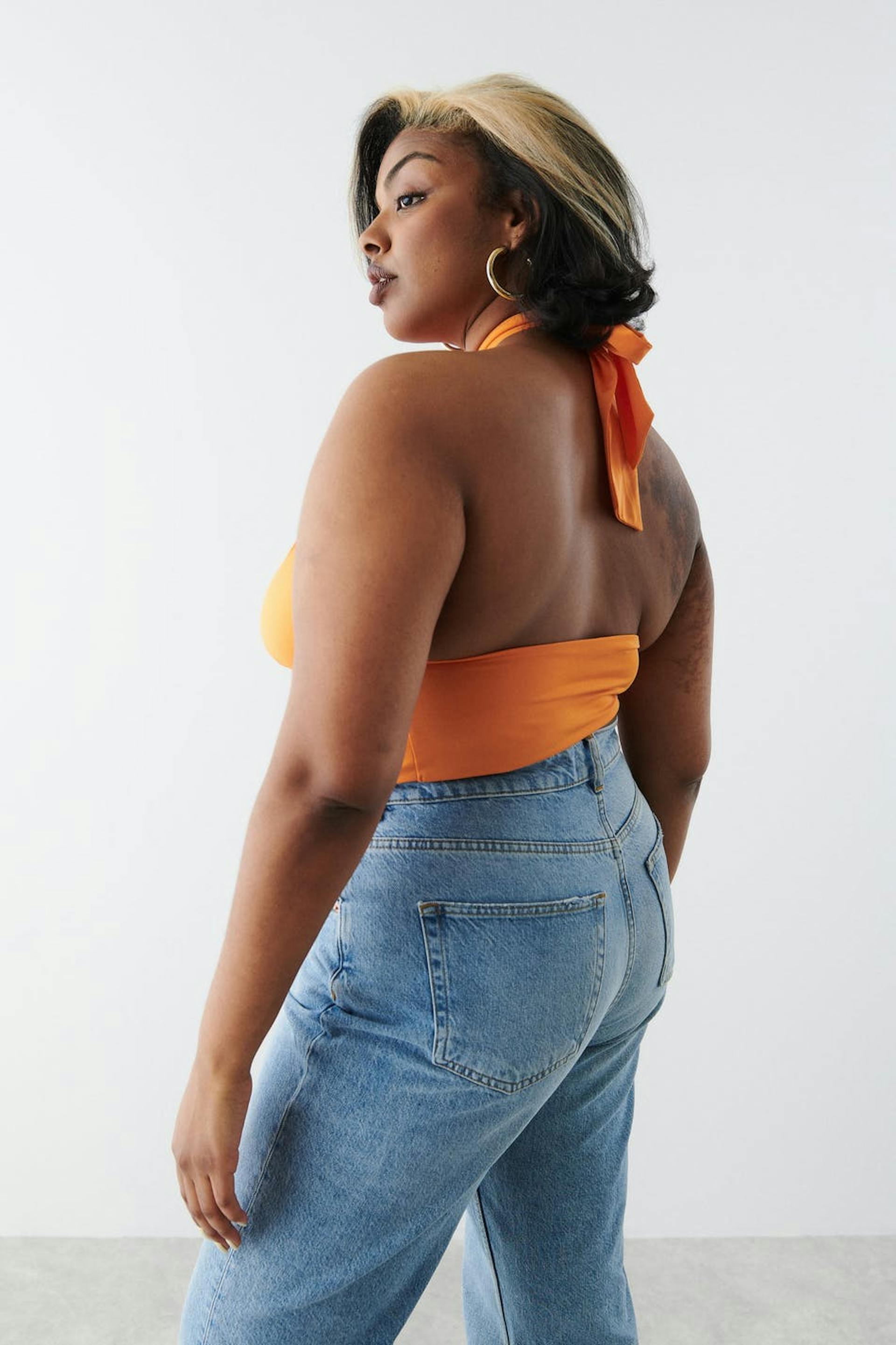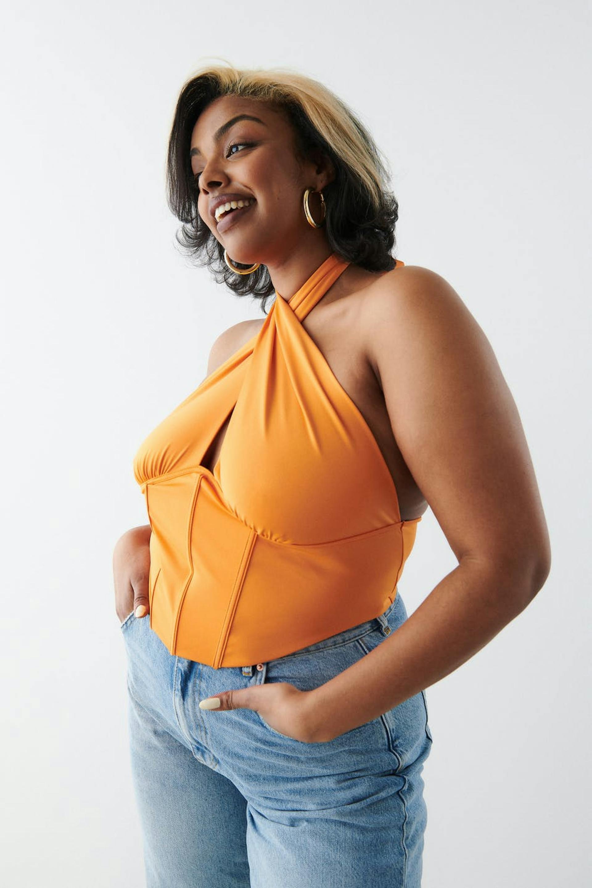 Korsettiyläosa avonaisella selällä. Toppi on juhliin täydellisesti sopiva ja oranssi ja siinä on ristiolkaimet edessä. Siinä on vartalonmyötäinen istuvuus, luurakenteet edessä, stretch-kangas, cropattu pituus, saumayksityiskohta rintojen alapuolella ja halterneck-malli solmittavalla vyöllä kaulassa.