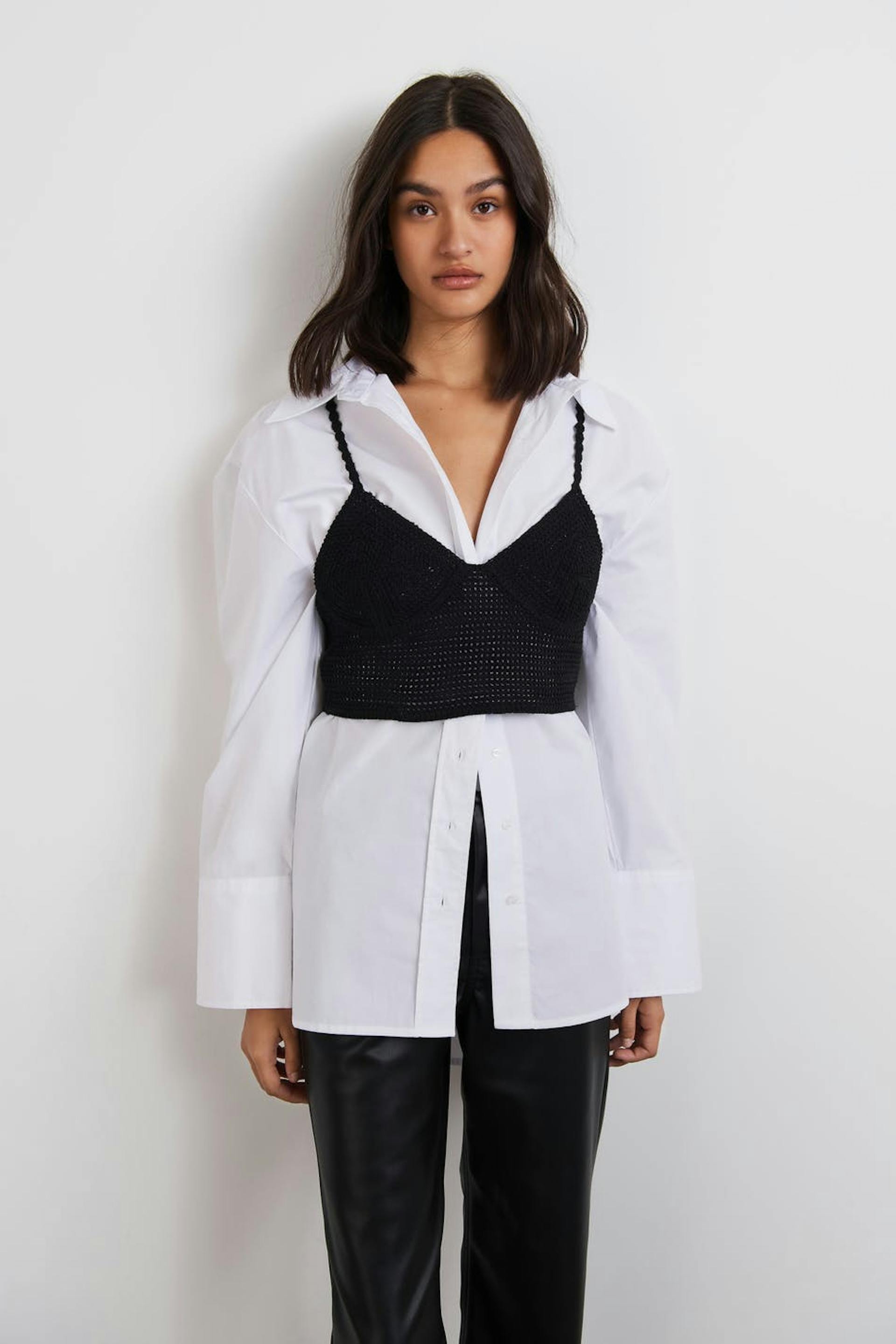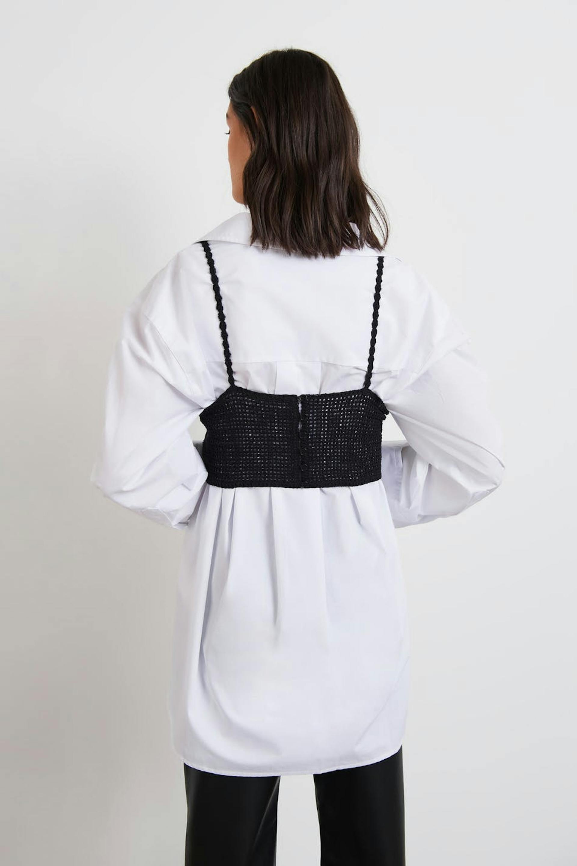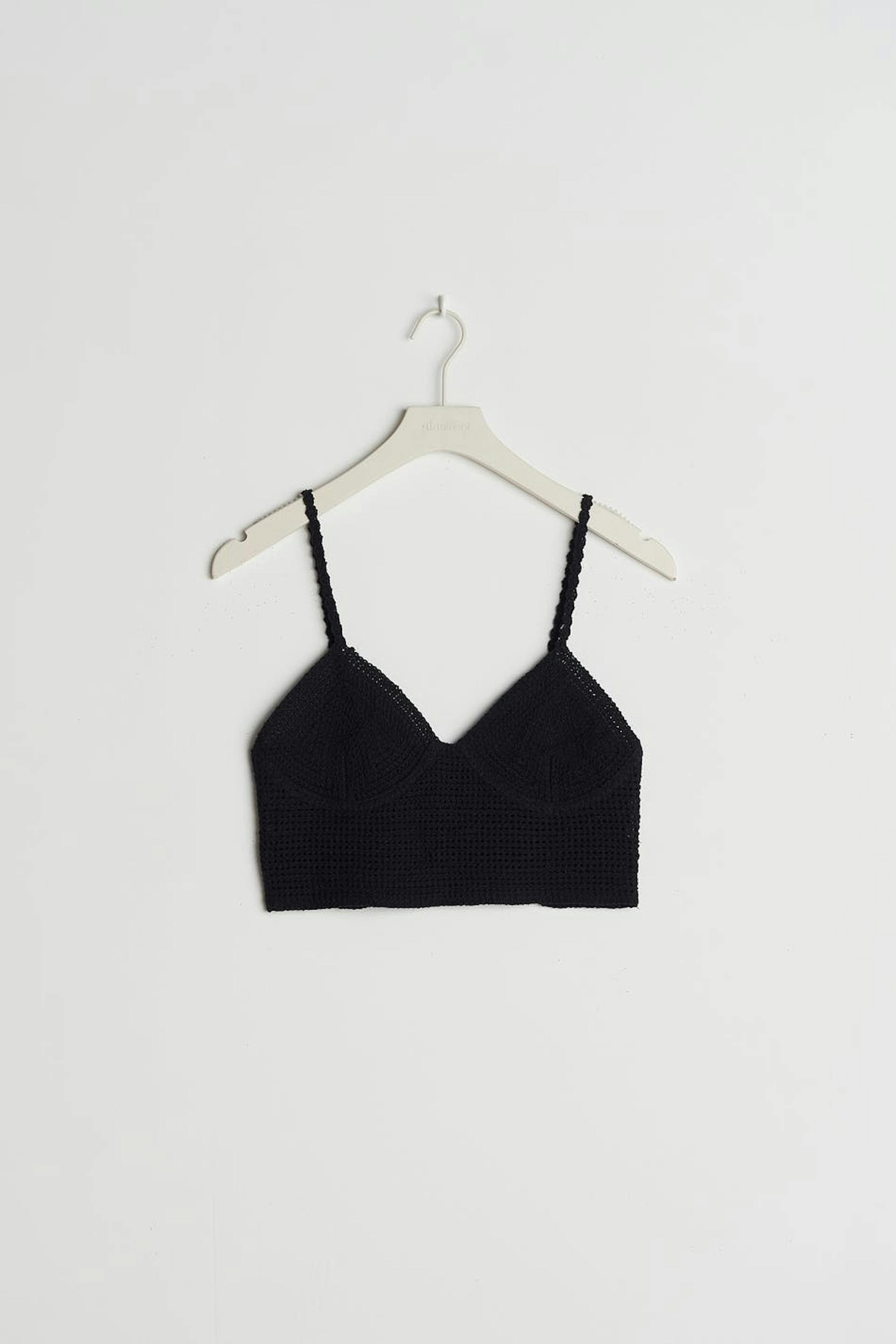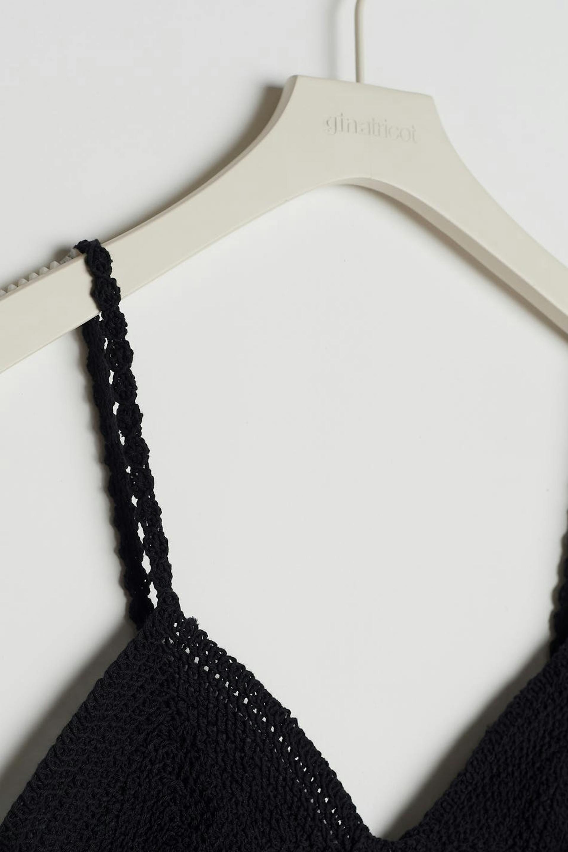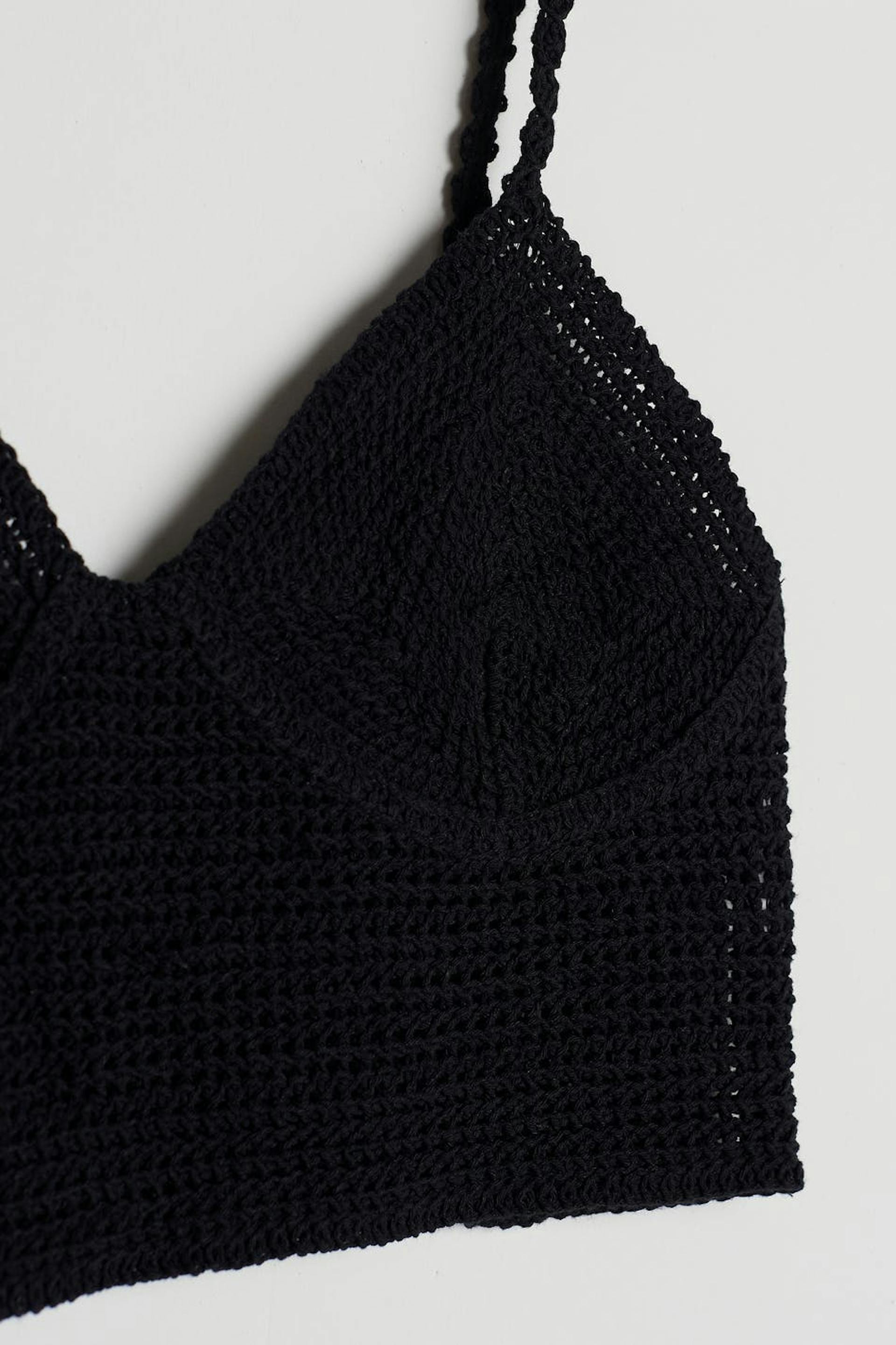 Virkattu toppi vartalonmyötäisellä istuvuudella. Toppi on juhliin täydellisesti sopiva, musta ja cropattu. Siinä on ohuet olkaimet ja napituslista selässä.