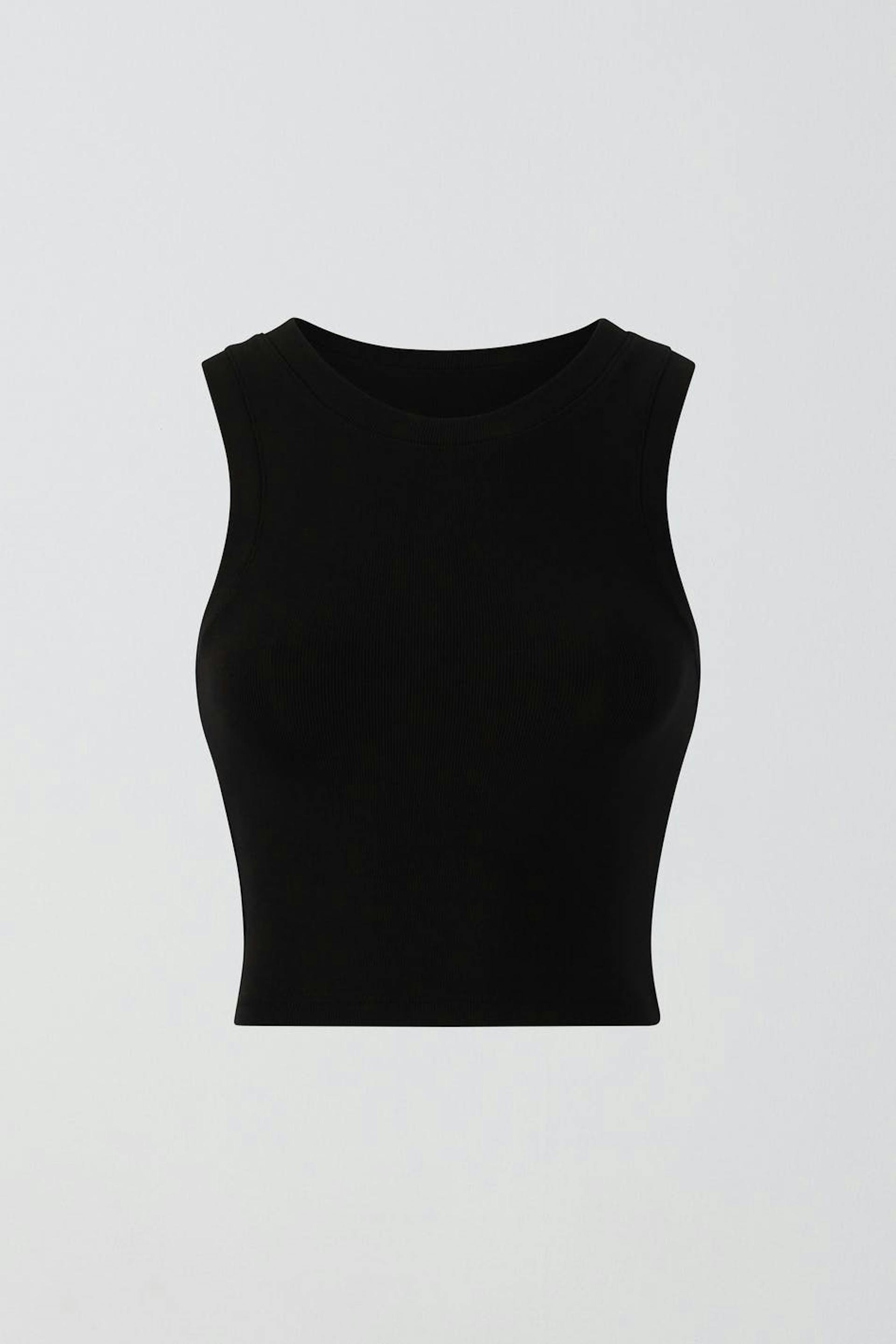 Cropattu toppi trikoosta tyköistuvalla istuvuudella. Toppi on musta ja siinä on pyöreä pääntie.