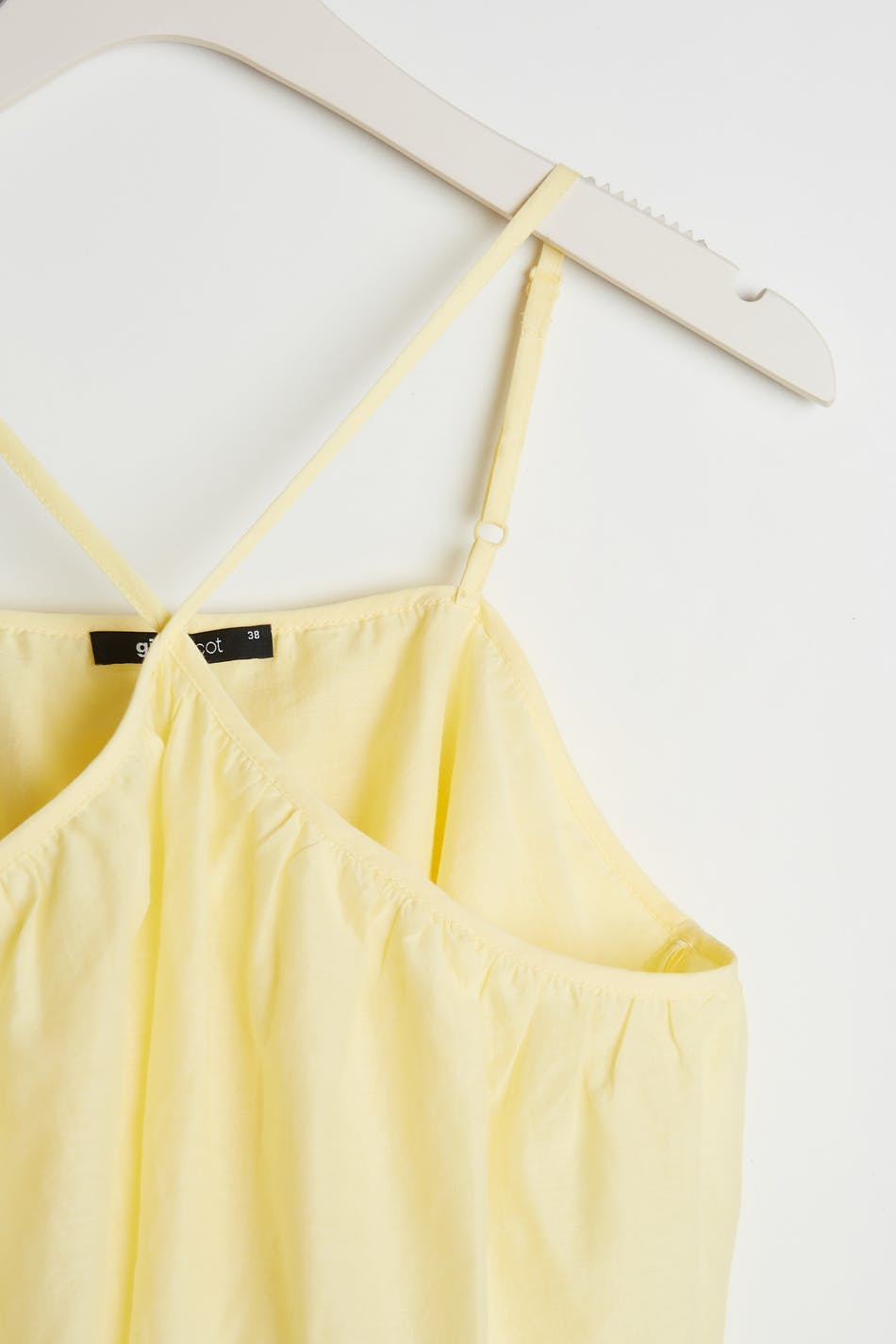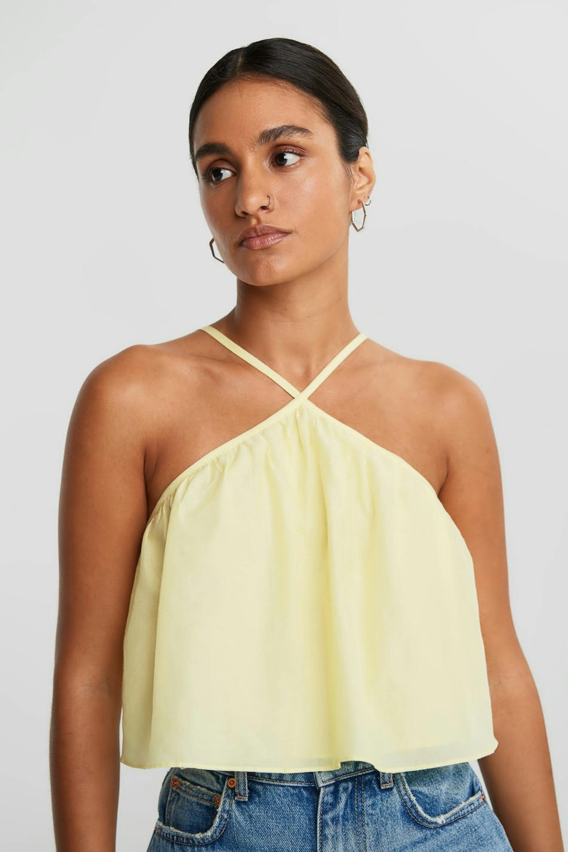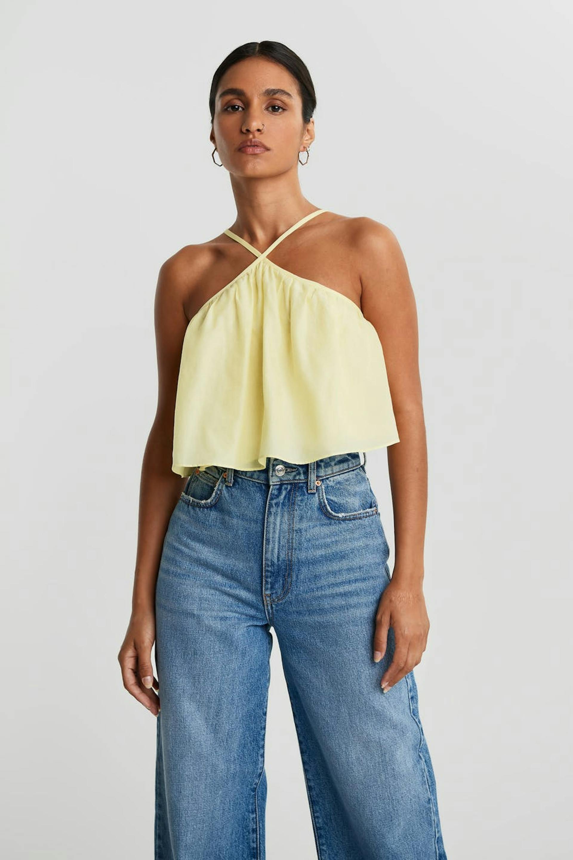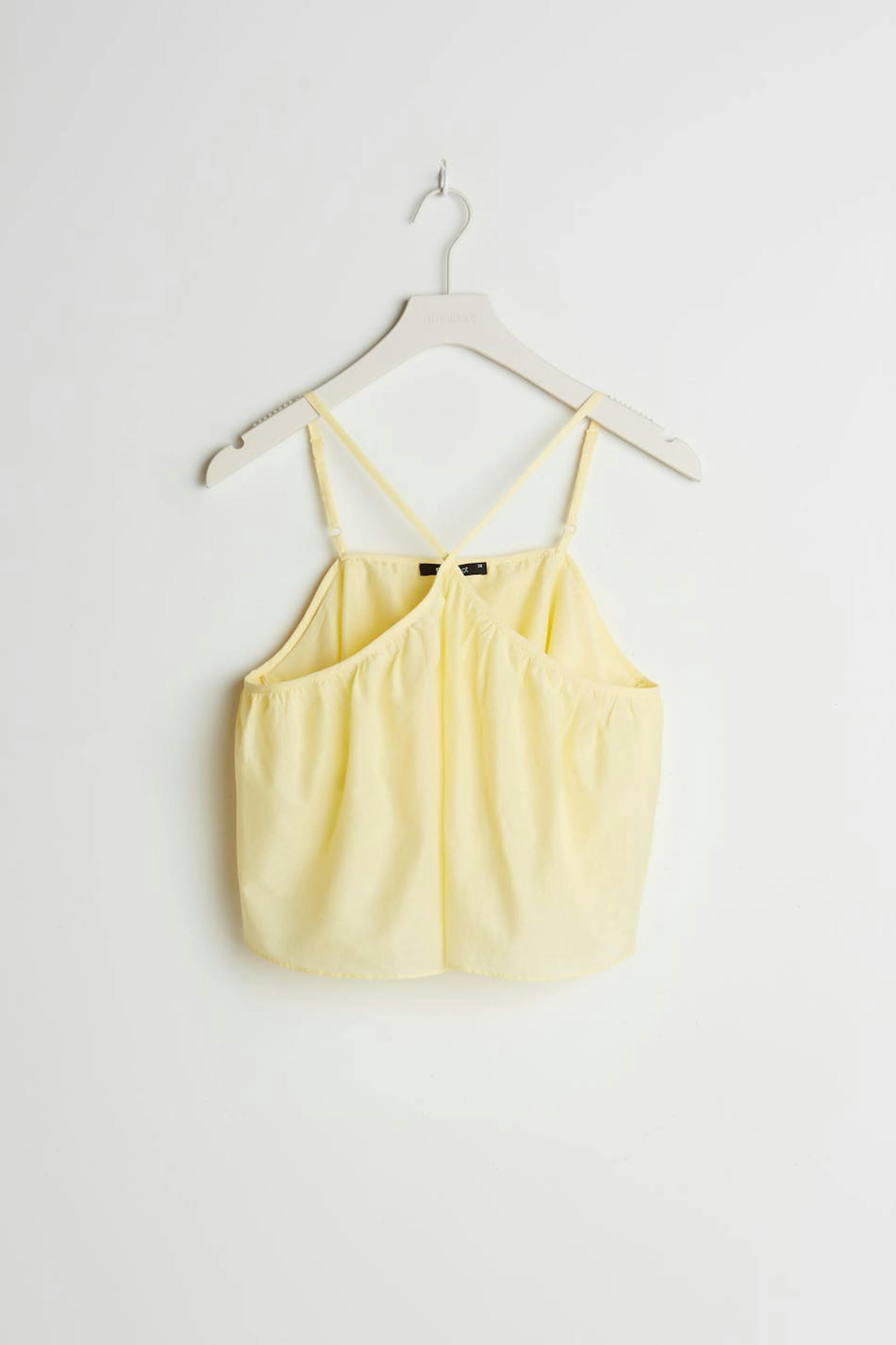 Lyhyt toppi ohuilla olkaimilla. Toppi on keltainen.