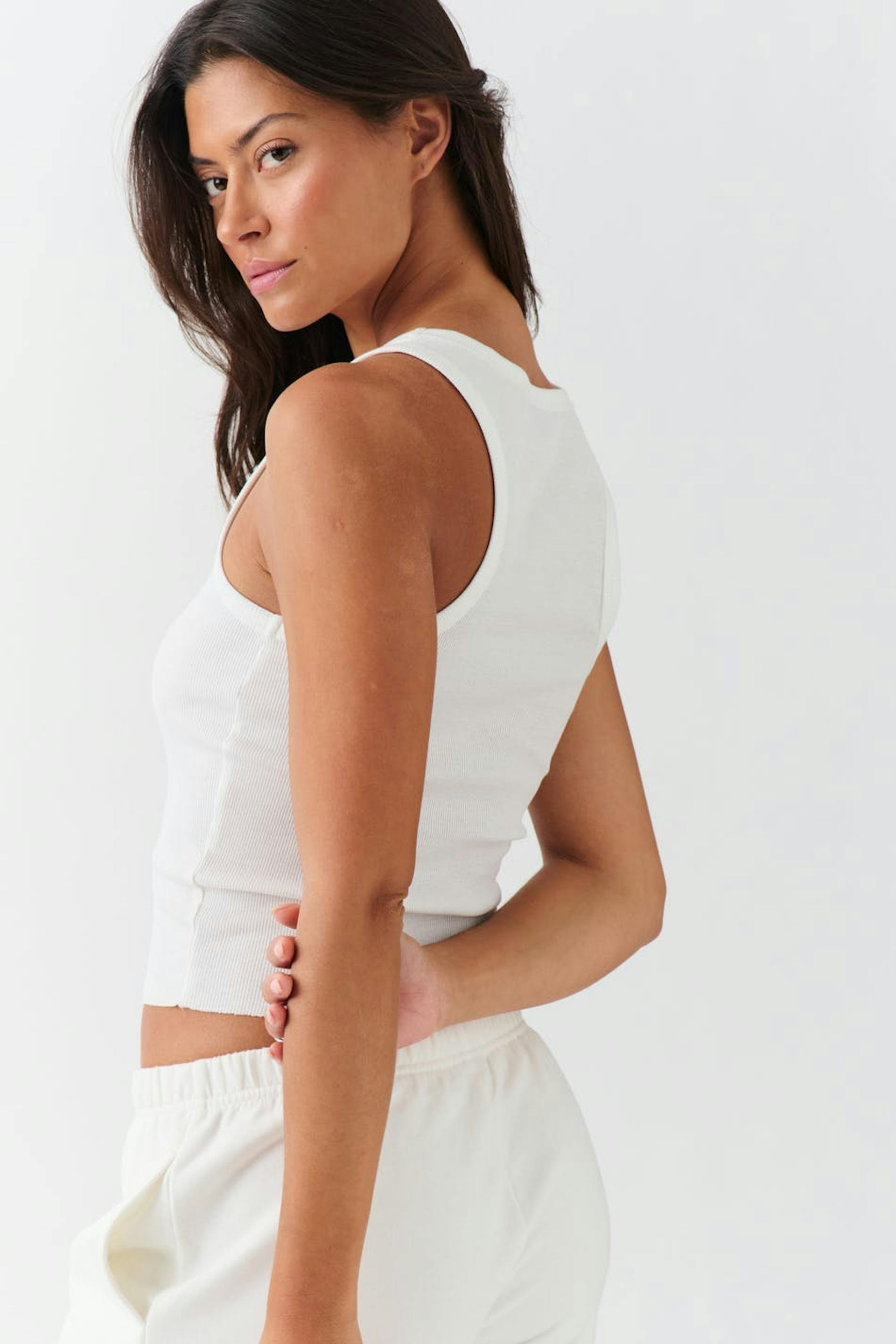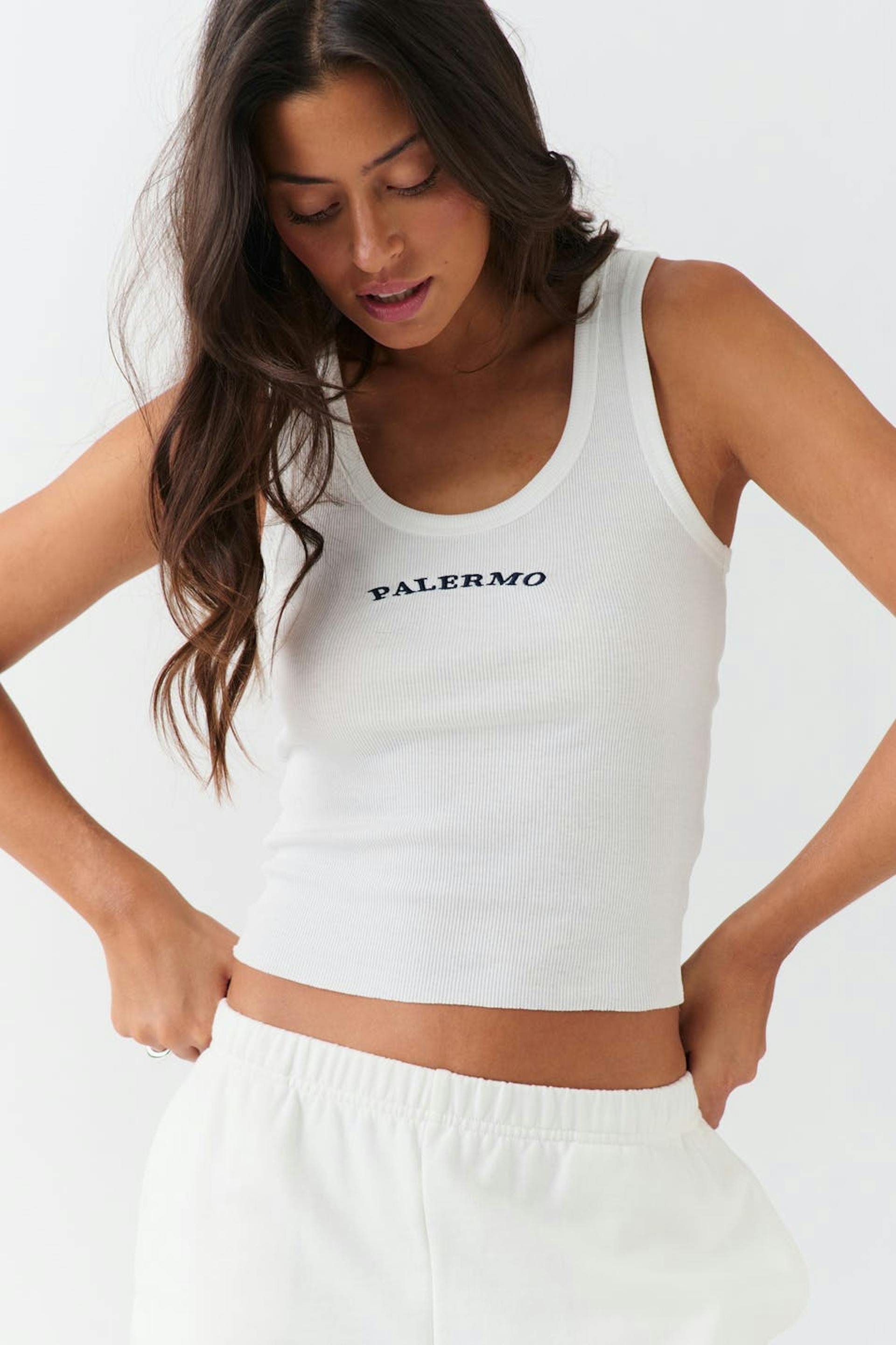 Ribattu toppi kirjaillulla tekstillä edessä. Toppi on valkoinen ja siinä on syvä u-aukko. Siinä on tyköistuva istuvuus, käsittelemätön reuna alhaalla ja cropattu pituus.