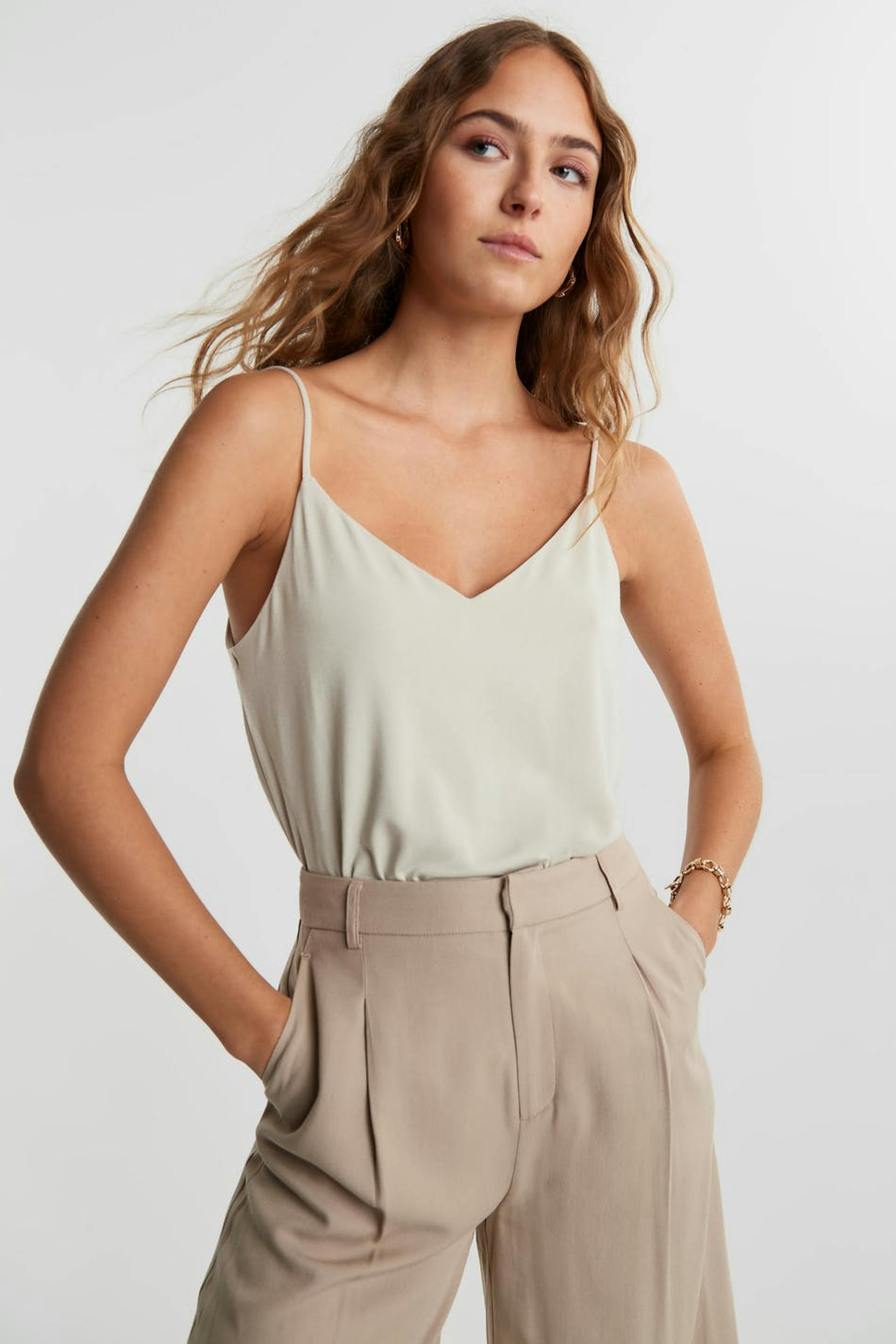 Toppi v-pääntiellä ja normaalilla leikkauksella. Toppi on beige ja siinä on ohuet olkaimet. Se valmistetaan trikoosta.