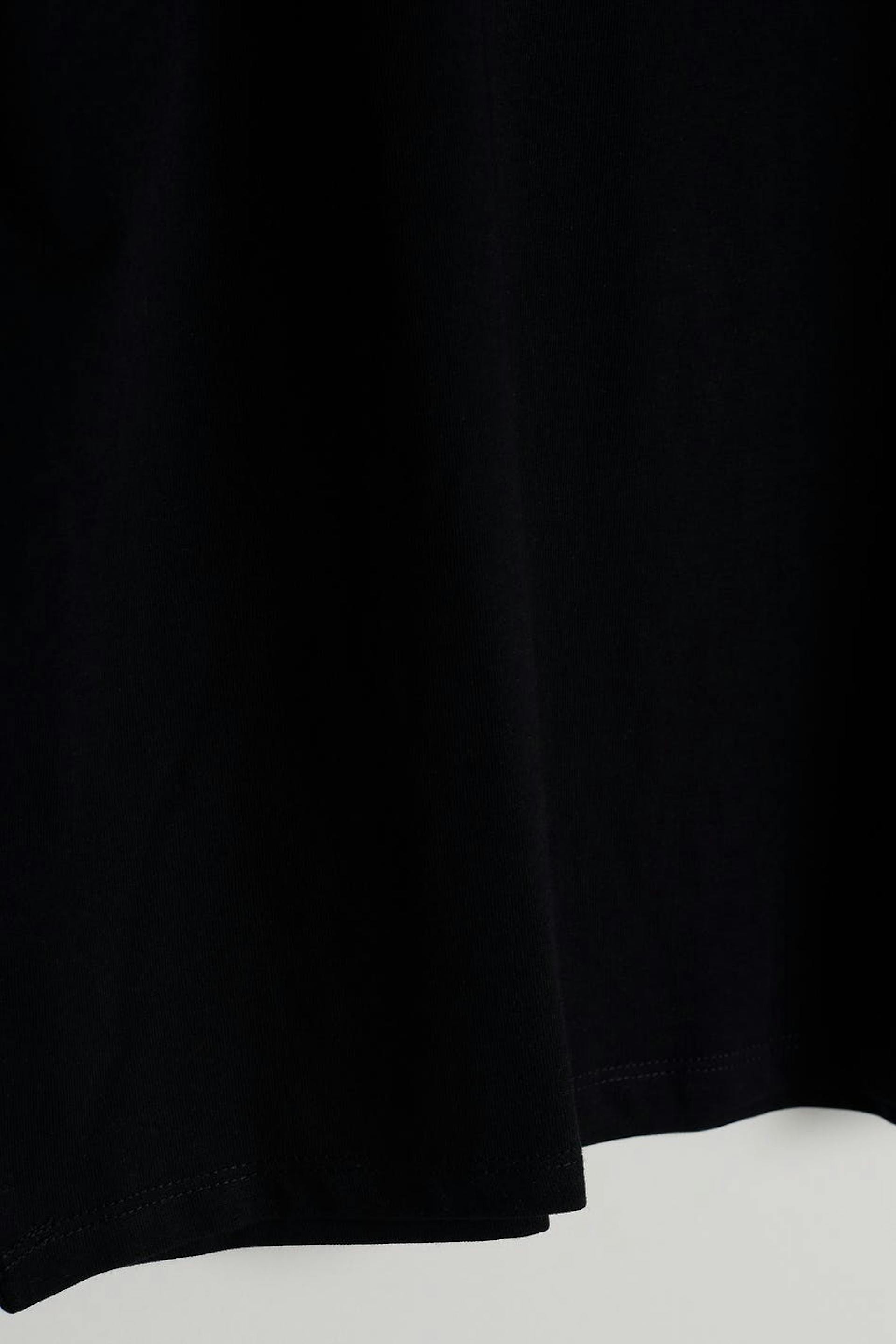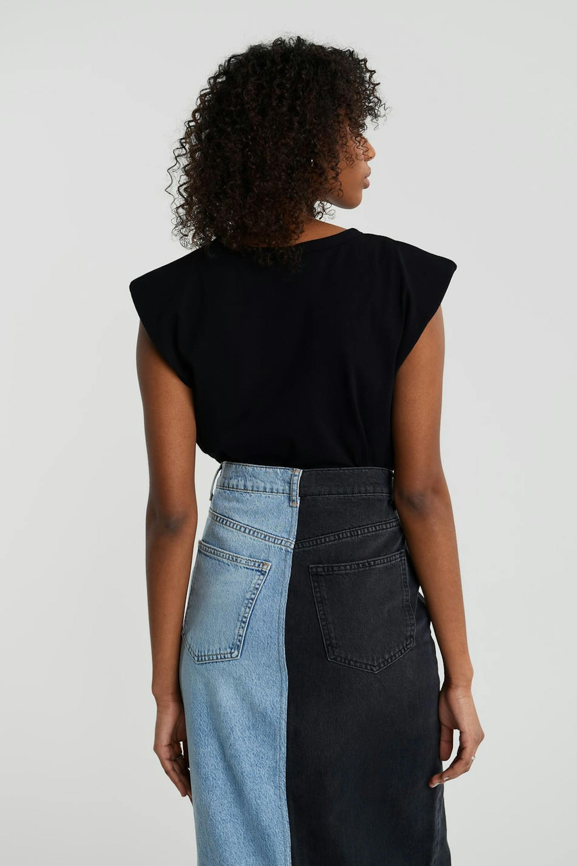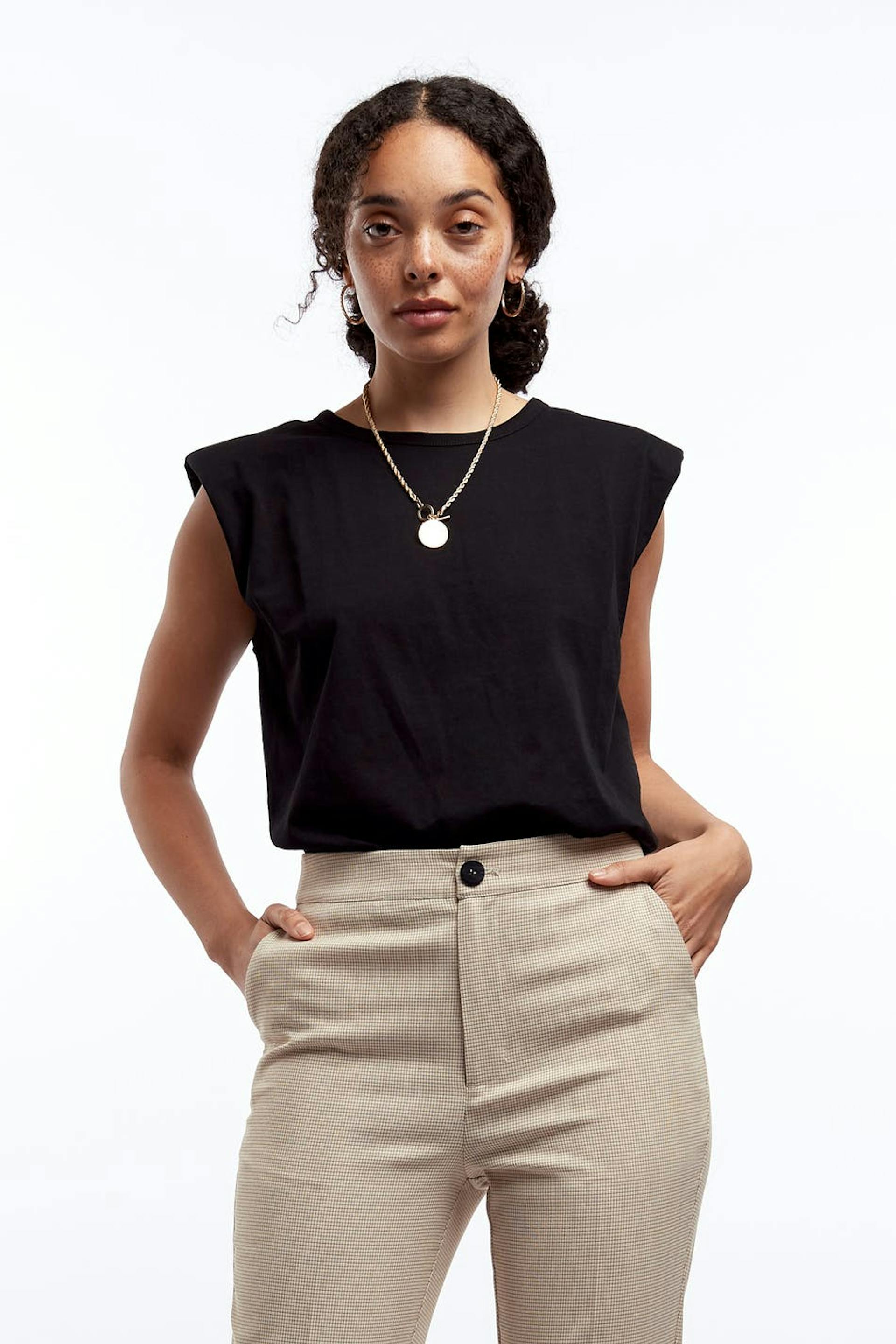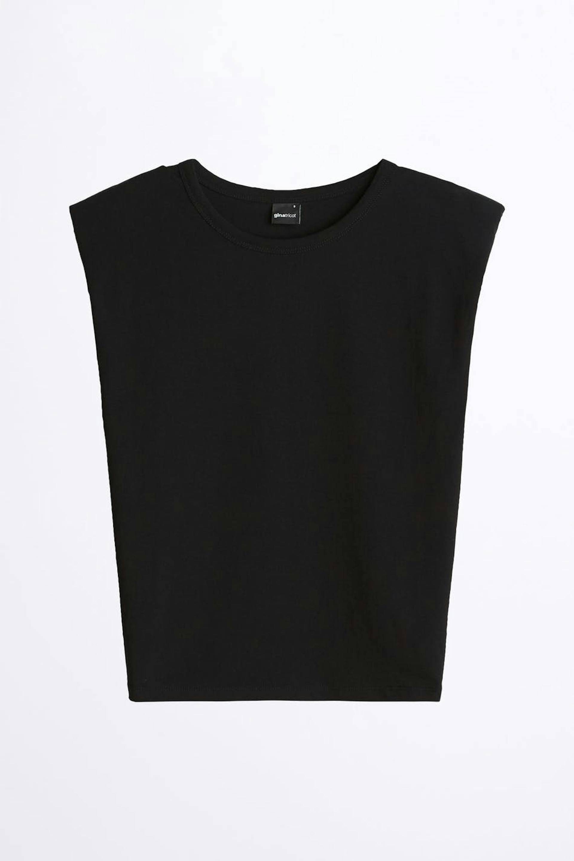Hihaton toppi topatuilla olkapäillä. Toppi on musta ja suora ja siinä on rento istuvuus.
