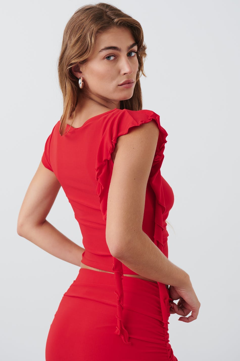 Hihaton toppi venepääntiellä. Toppi on punainen ja siinä on lyhyt hiha röyhelöyksityiskohdilla.