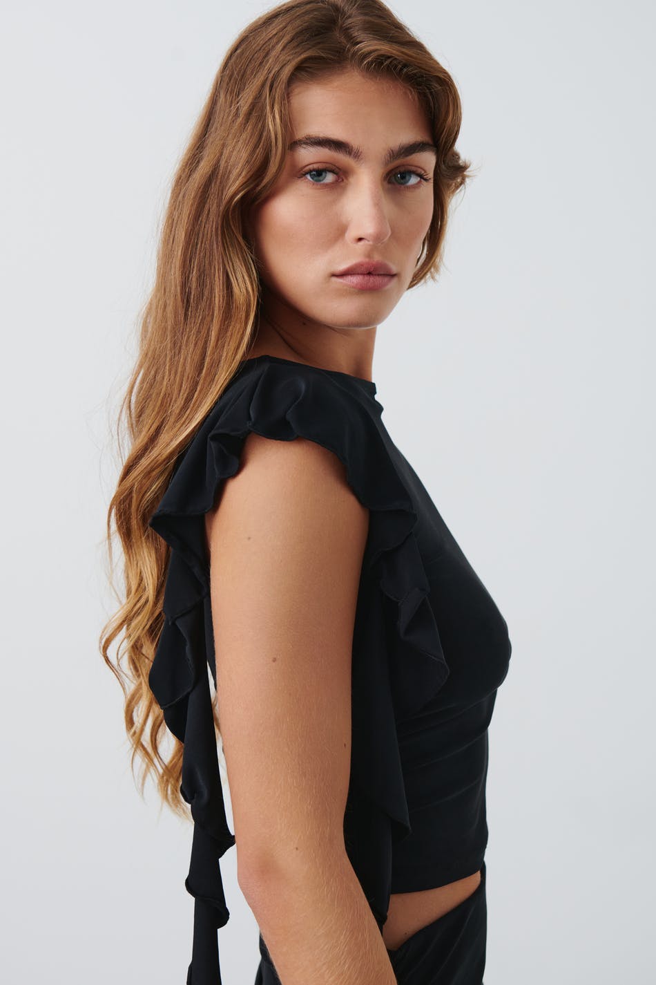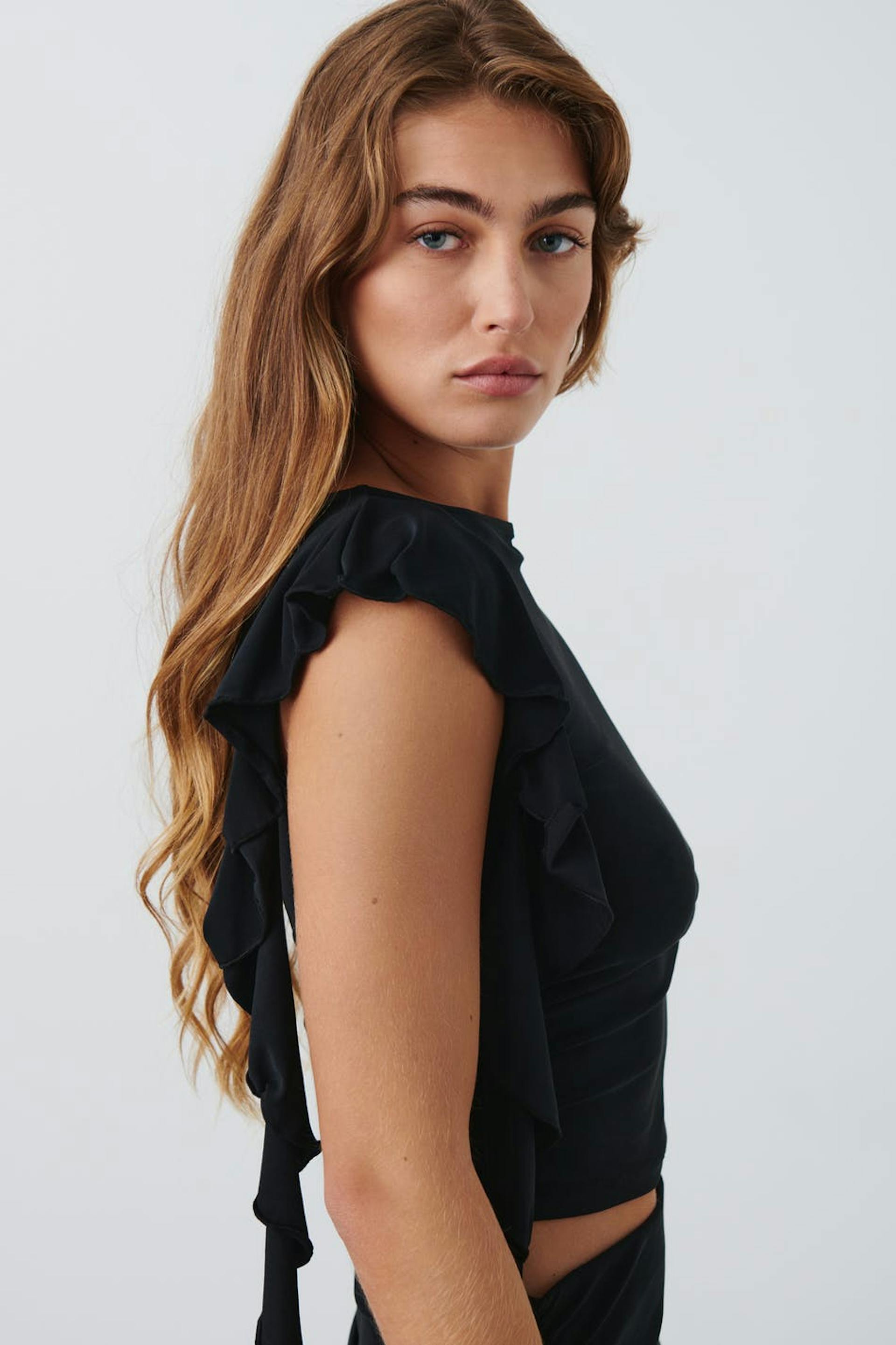 Hihaton toppi venepääntiellä. Toppi on musta ja siinä on lyhyt hiha röyhelöyksityiskohdilla.