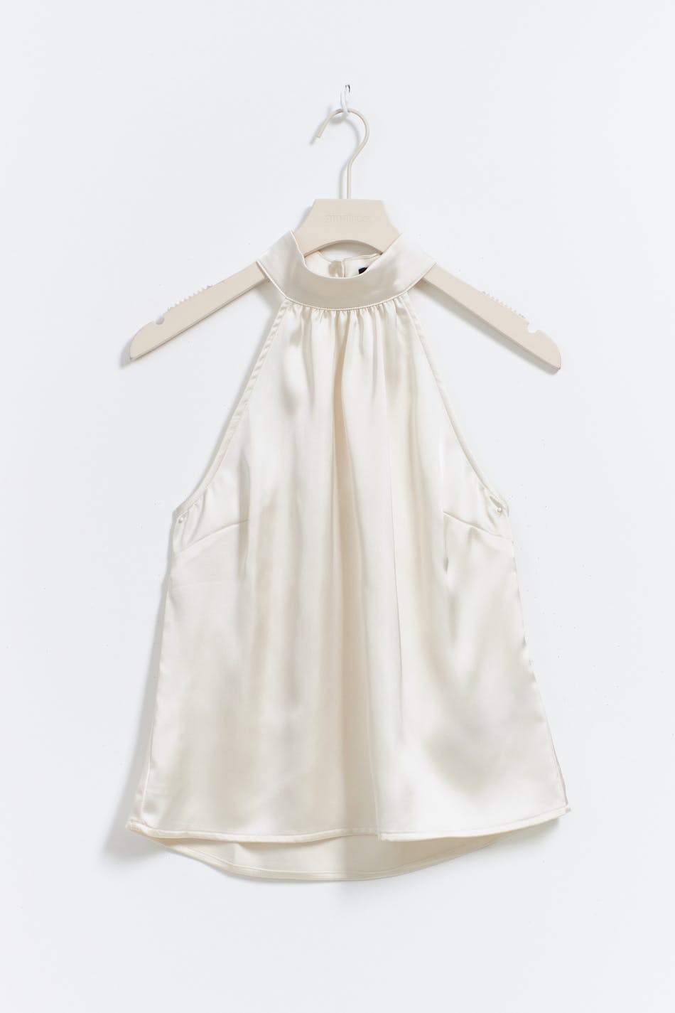 Hihaton toppi satiinista halterneck-mallilla. Toppi on valkoinen ja siinä on rako takana. Siinä on väljä malli ja napitus kaulassa.