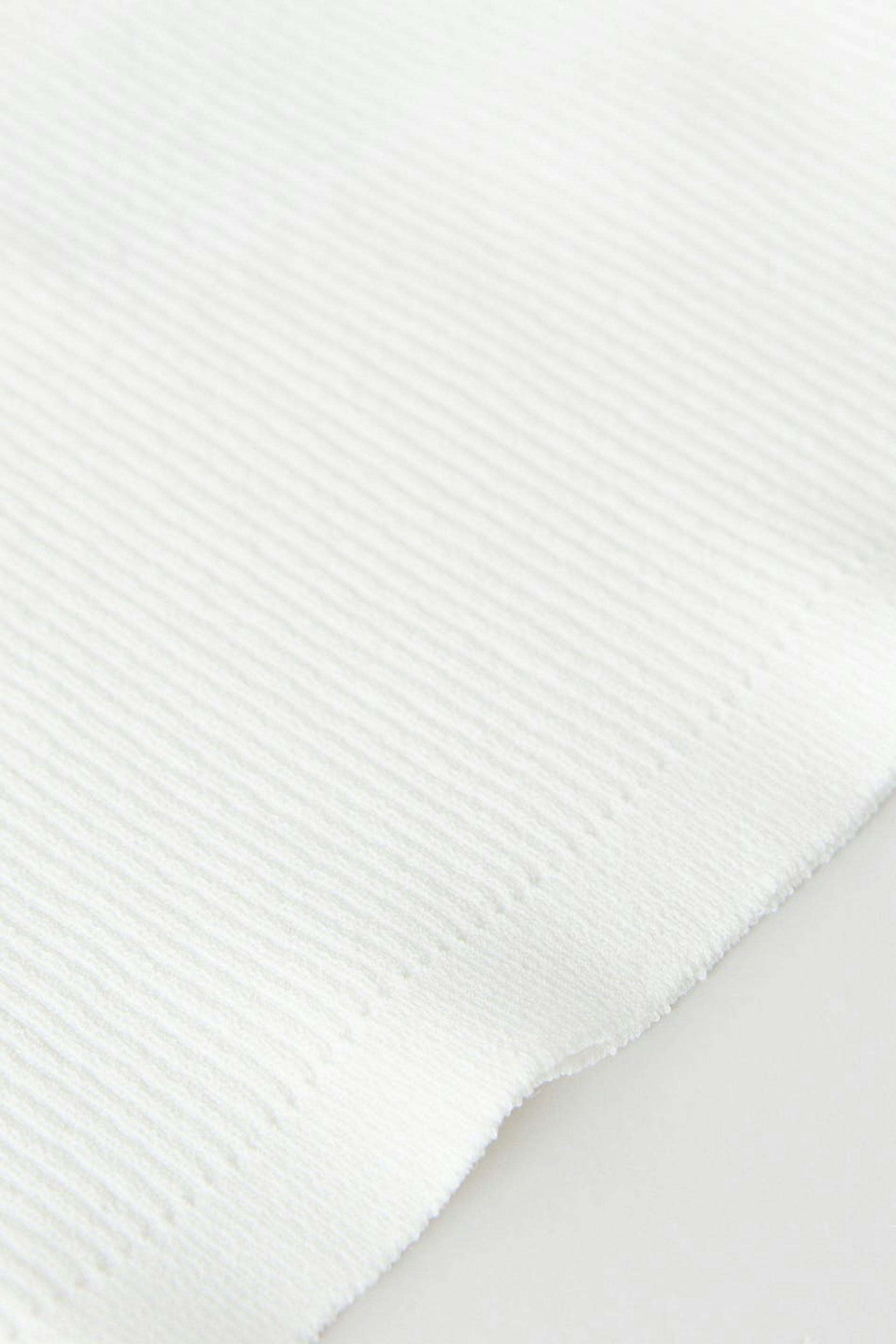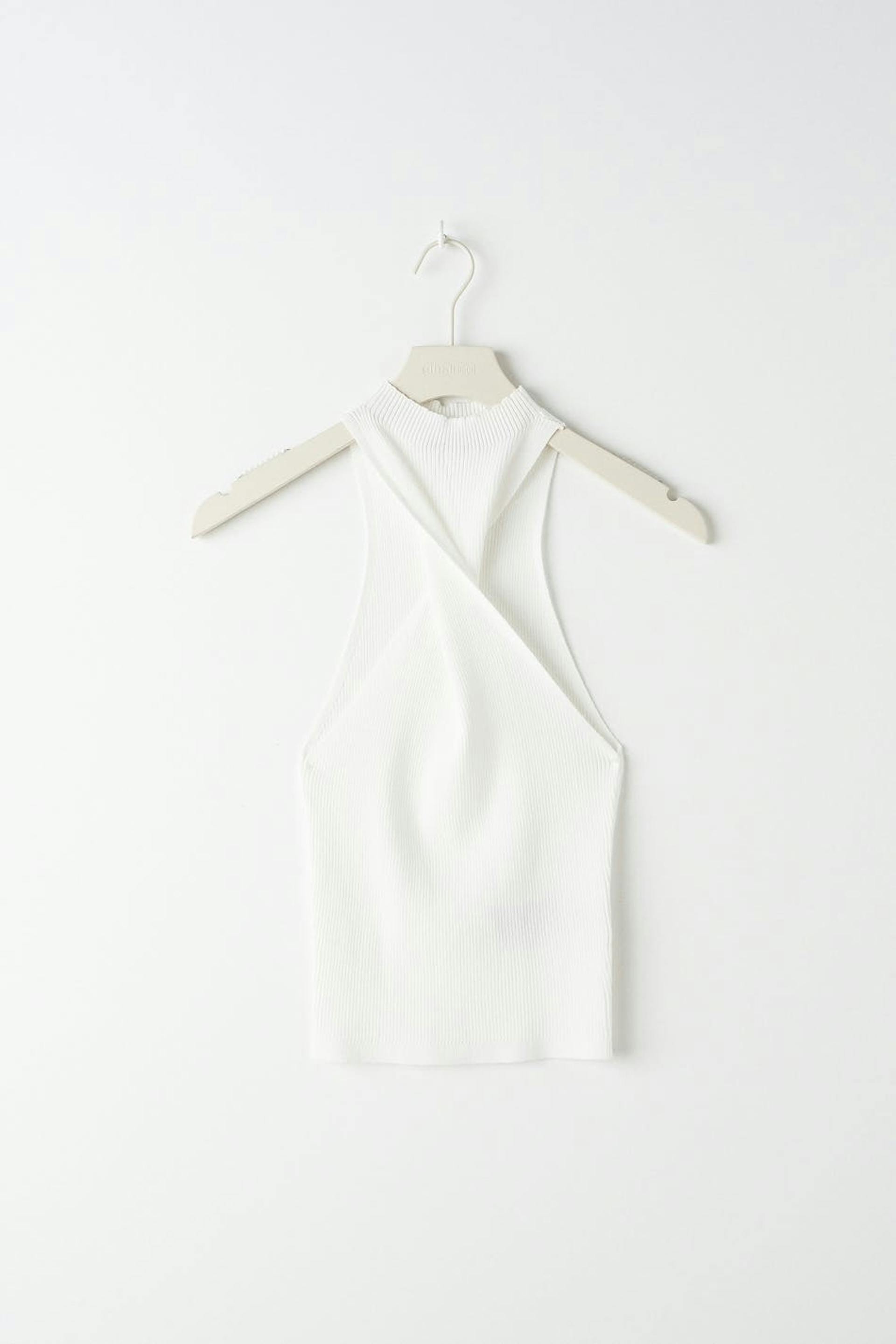 Resorimainen toppi kiemuraisella kaula-aukolla. Toppi on juhliin täydellisesti sopiva, valkoinen ja hihaton. Siinä on vartalonmyötäinen istuvuus.