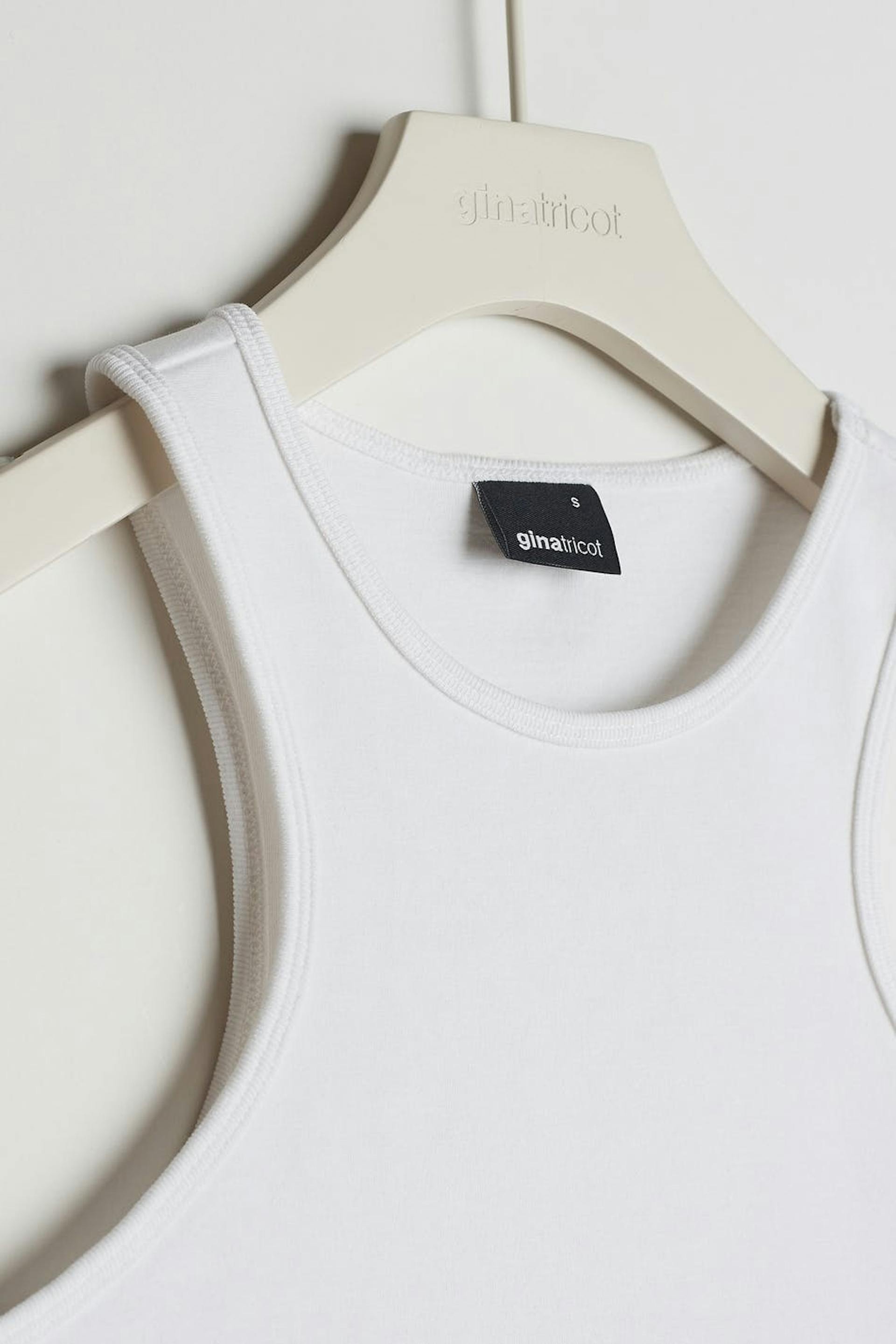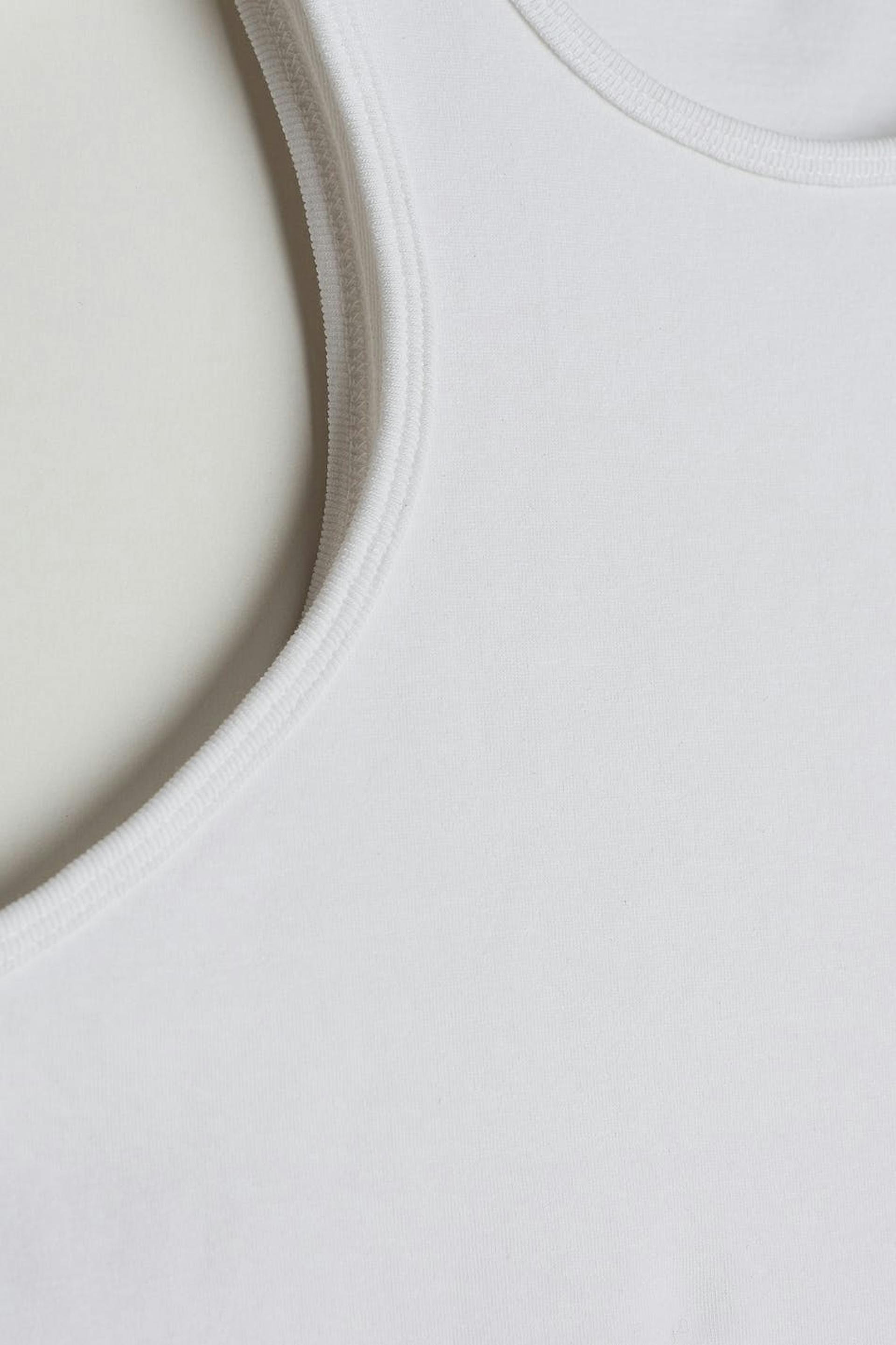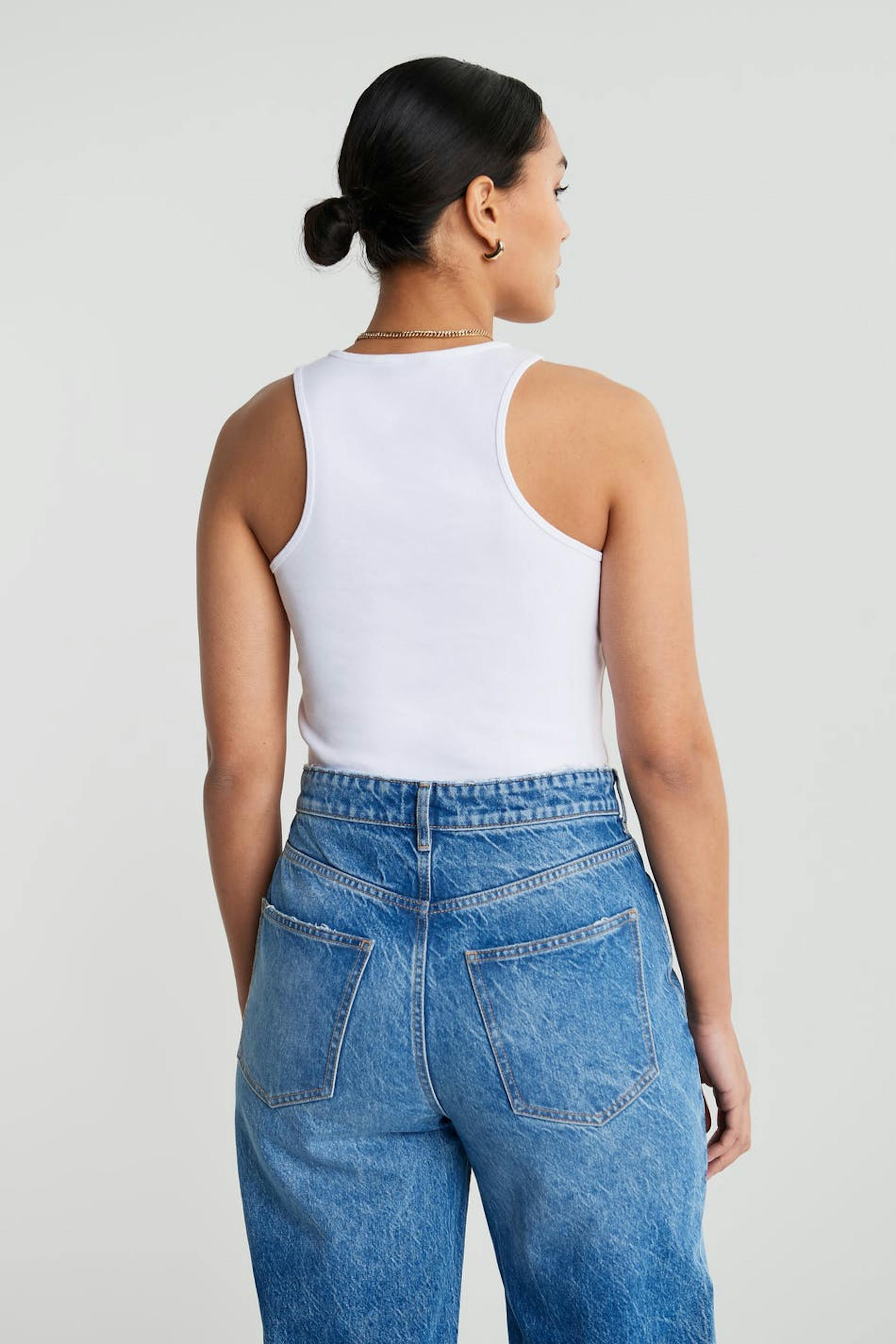 Joustava toppi vartalonmyötäisellä istuvuudella. Toppi on valkoinen ja siinä on urheilullinen leikkaus edessä ja takana. Siinä on hieman lyhempi pituus.