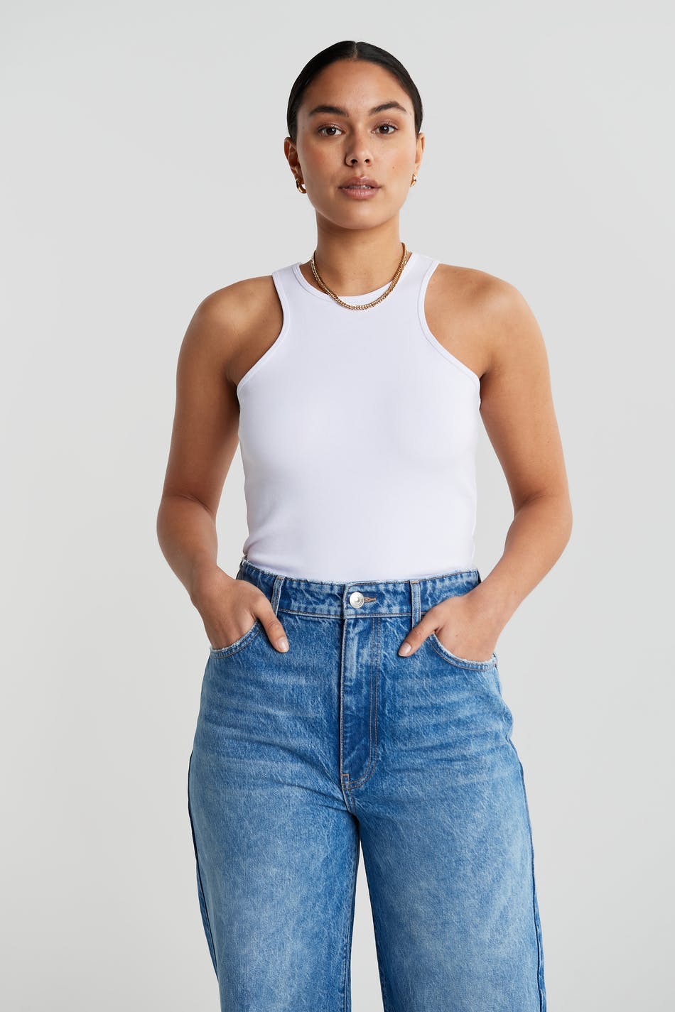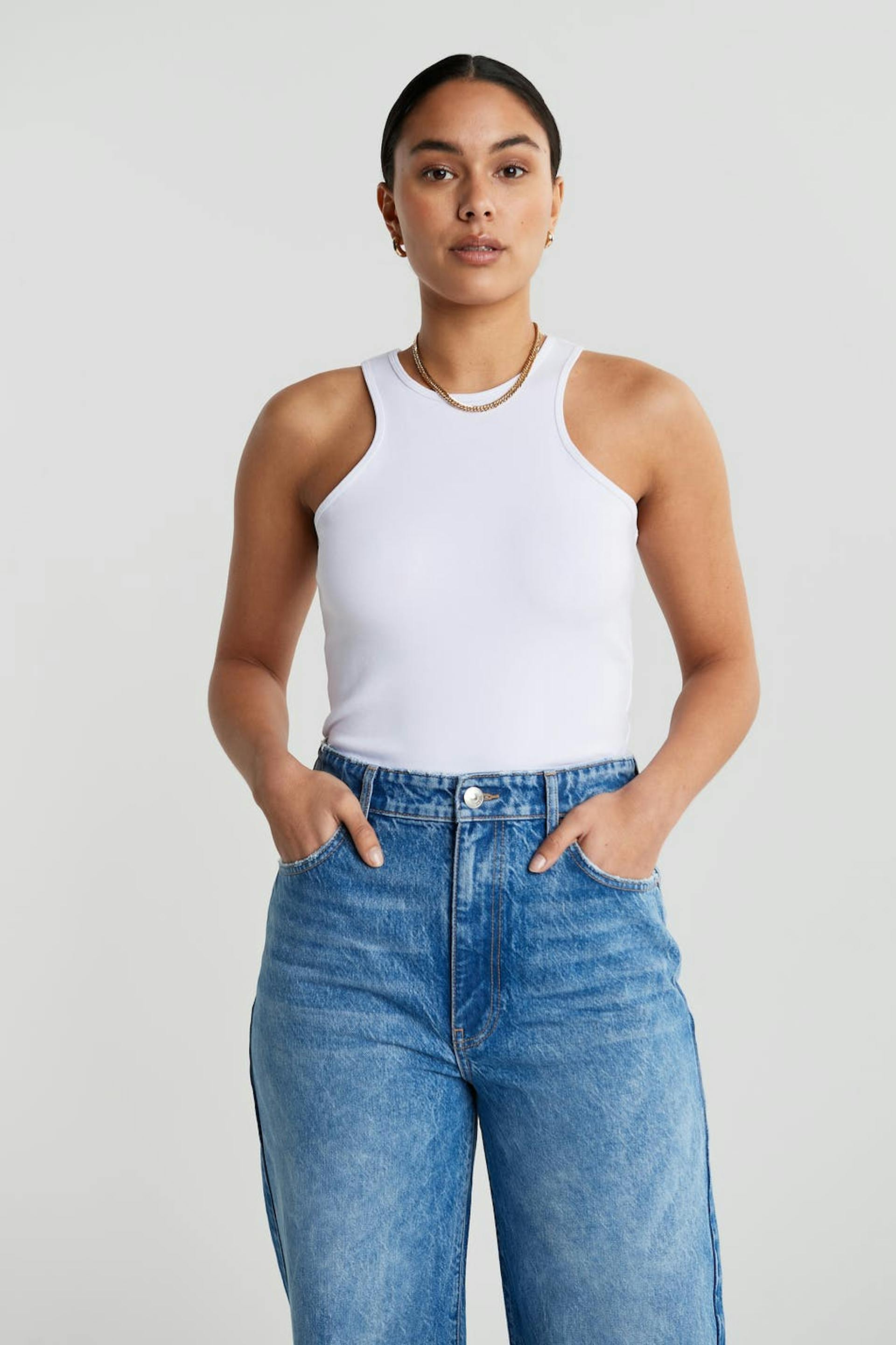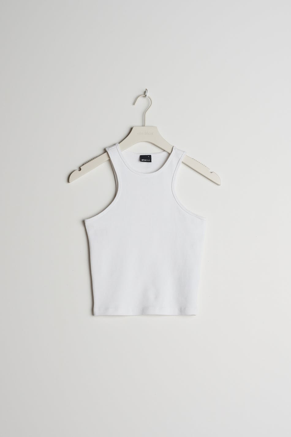 Joustava toppi vartalonmyötäisellä istuvuudella. Toppi on valkoinen ja siinä on urheilullinen leikkaus edessä ja takana. Siinä on hieman lyhempi pituus.