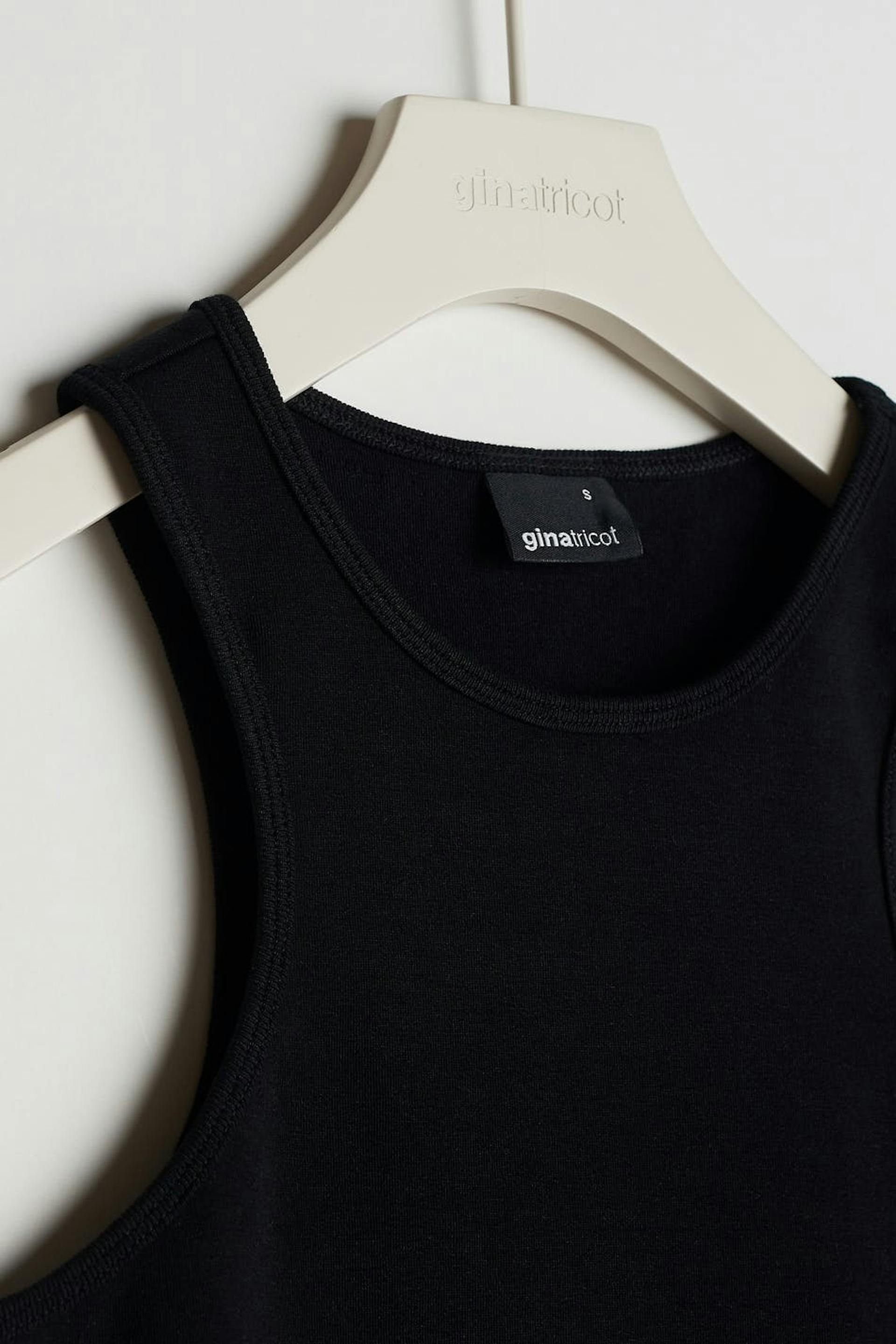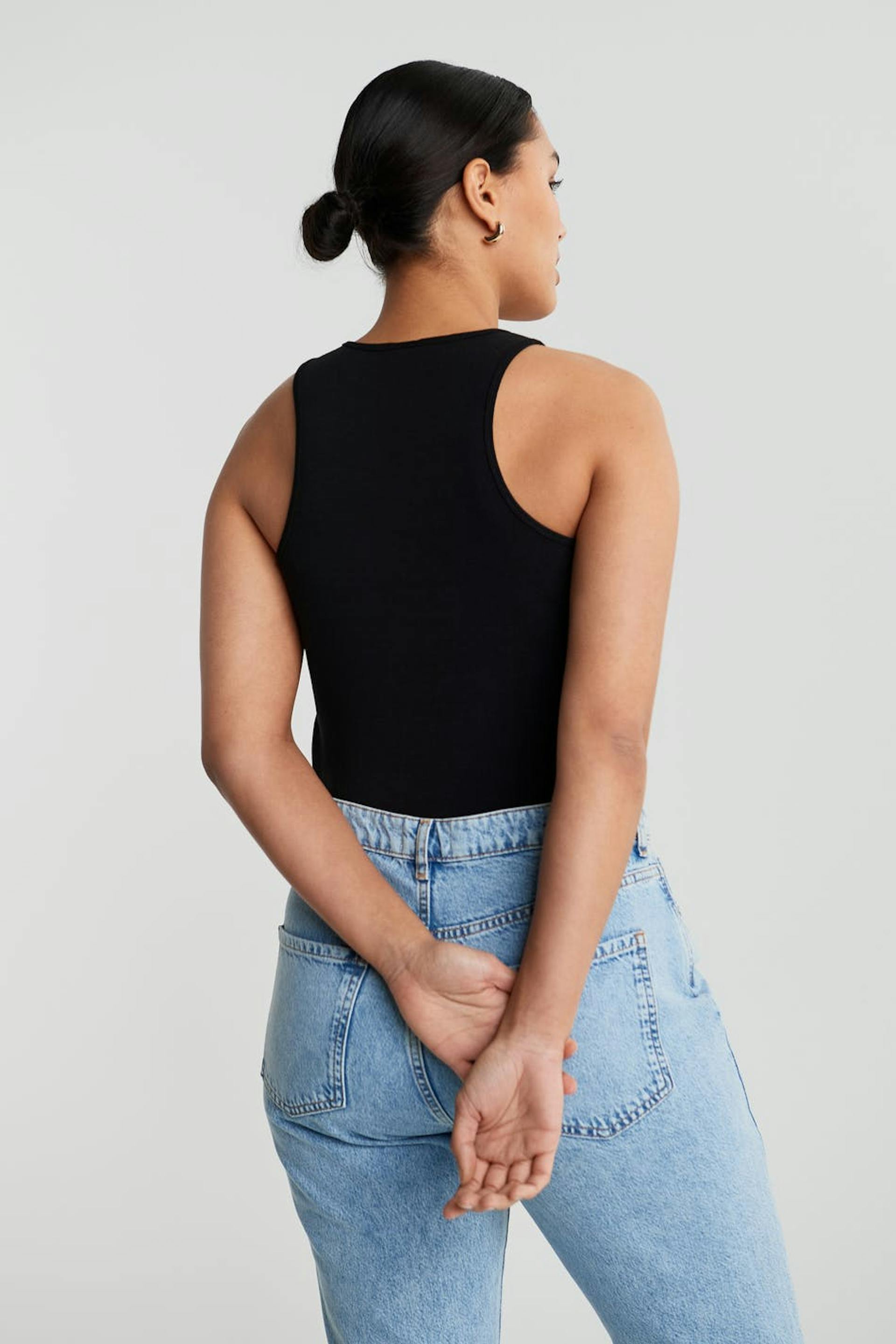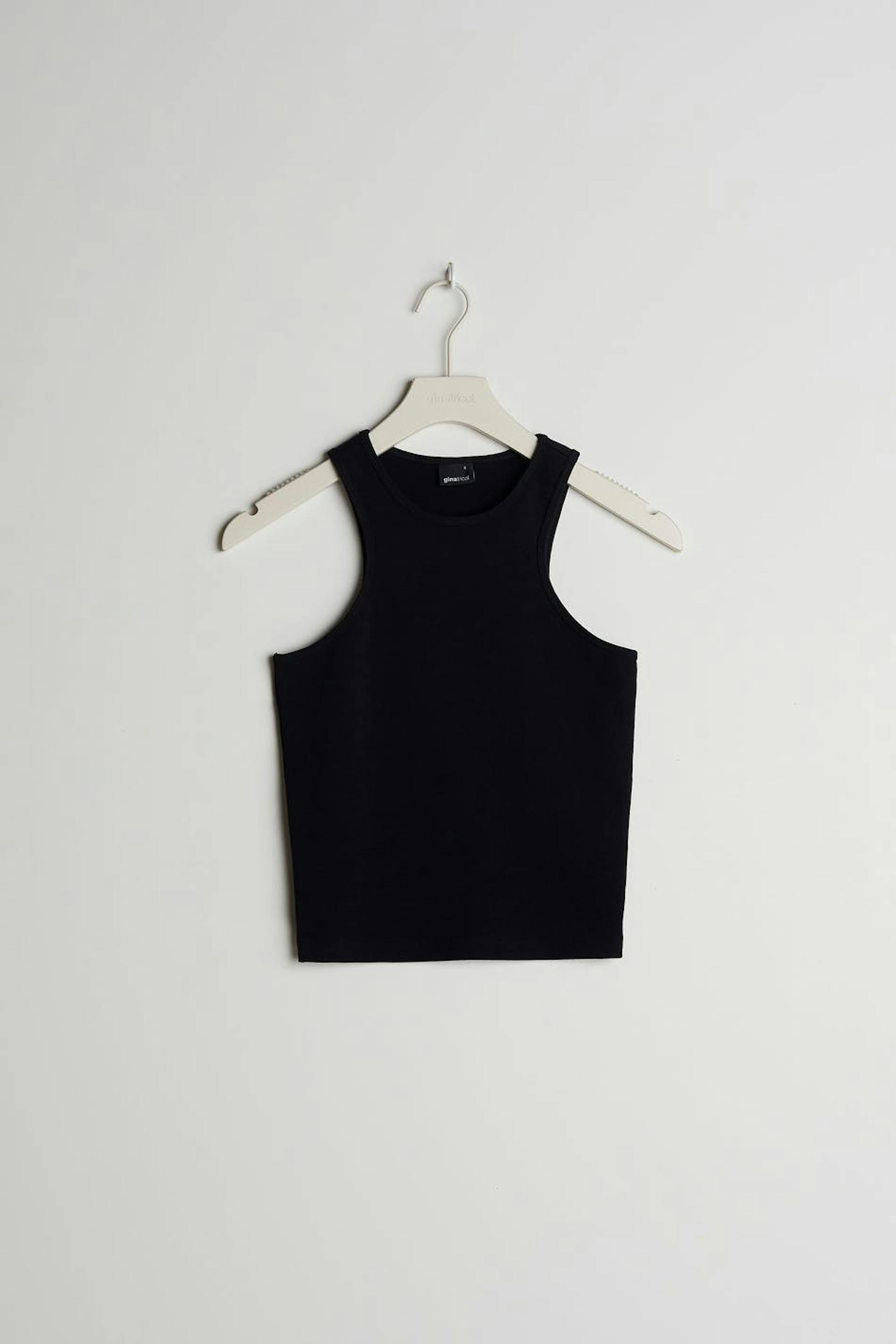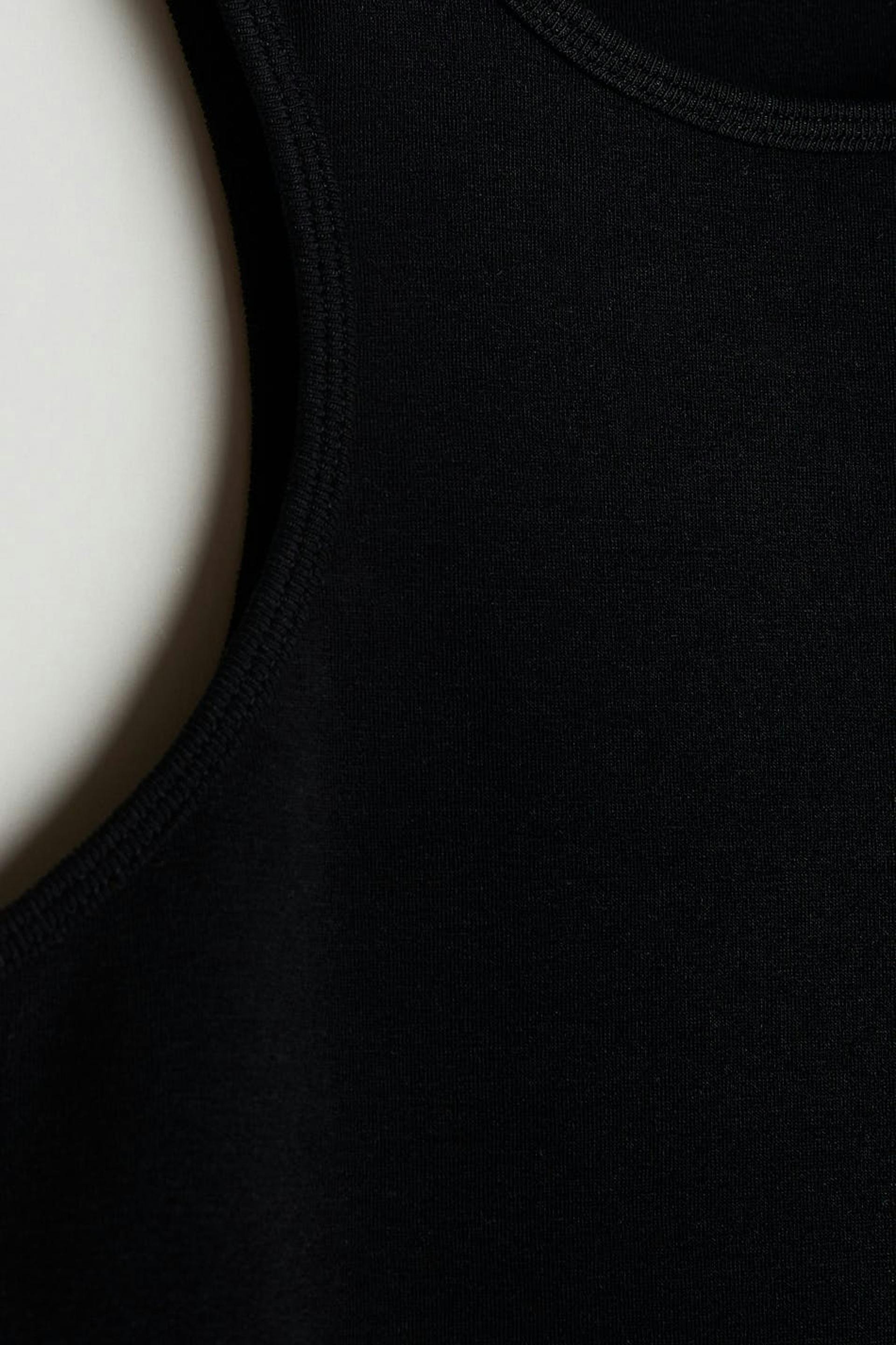 Joustava toppi vartalonmyötäisellä istuvuudella. Toppi on musta ja siinä on urheilullinen leikkaus edessä ja takana. Siinä on hieman lyhempi pituus.