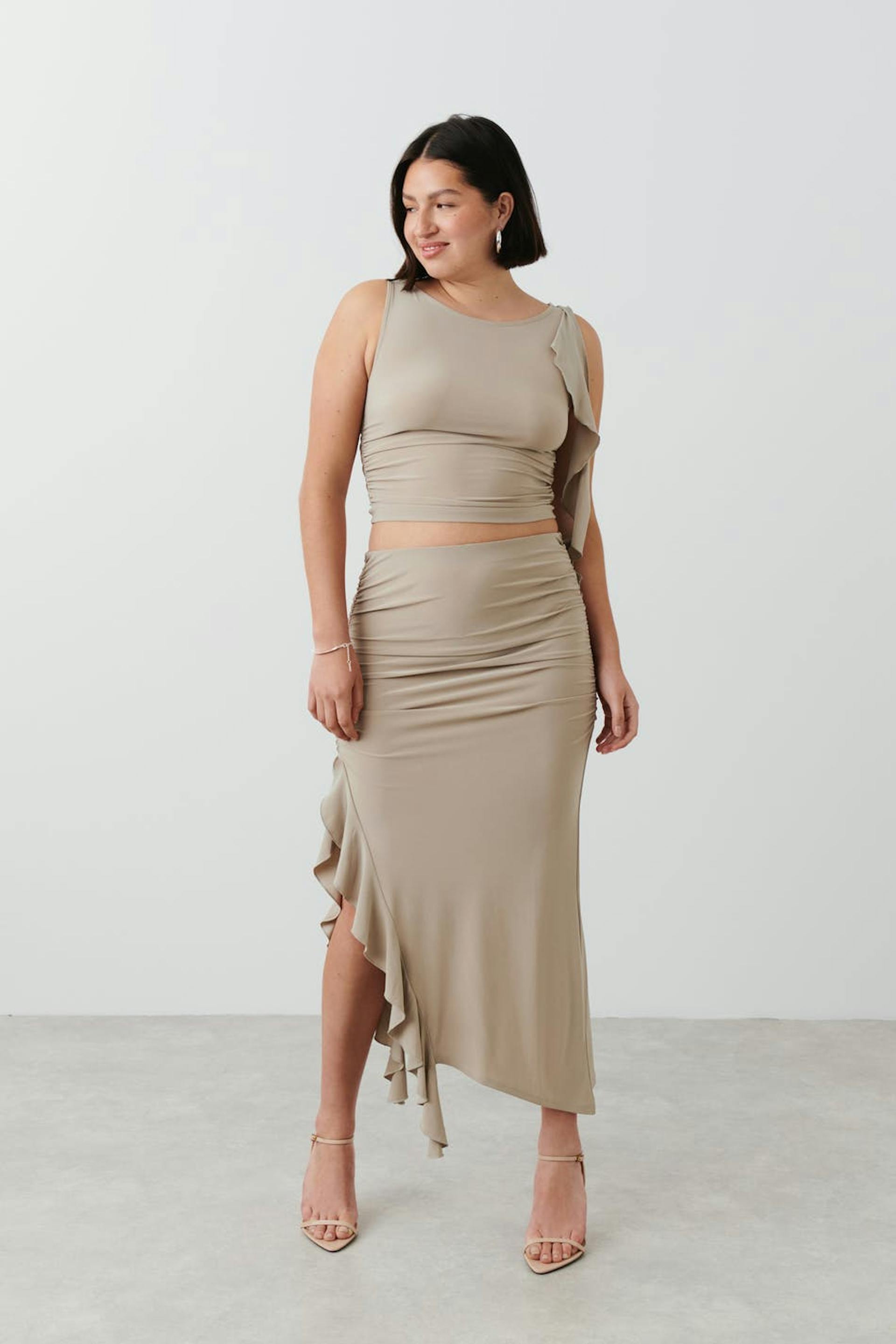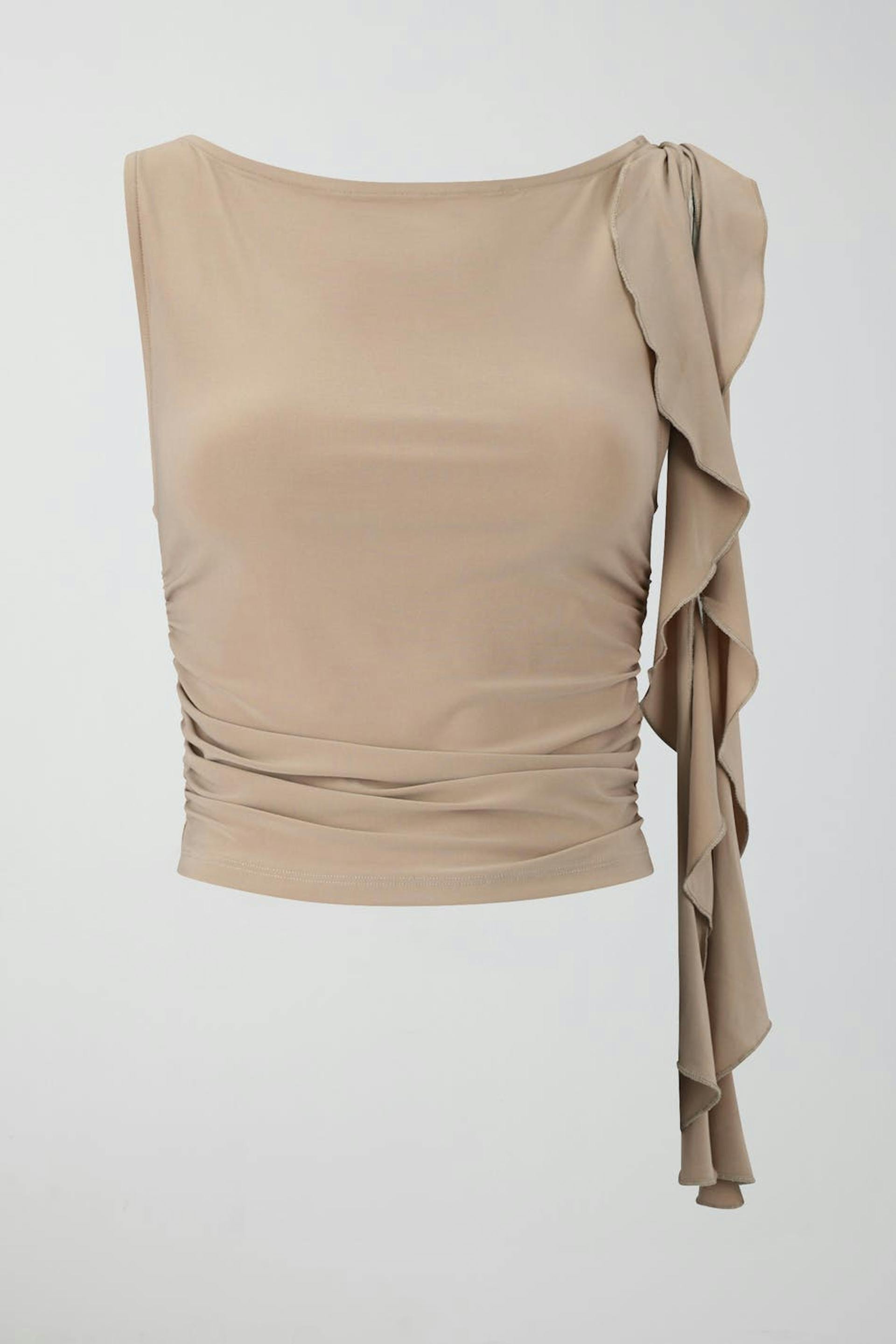 Toppi trikoosta rypytystyylillä. Toppi on beige ja siinä on röyhelöyksityiskohta sivulla.