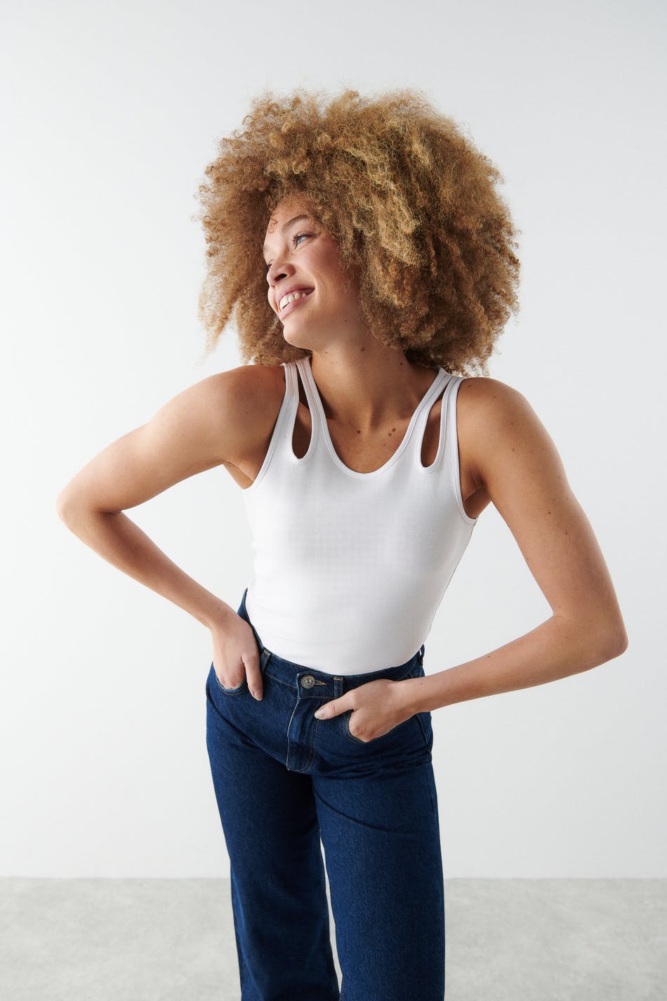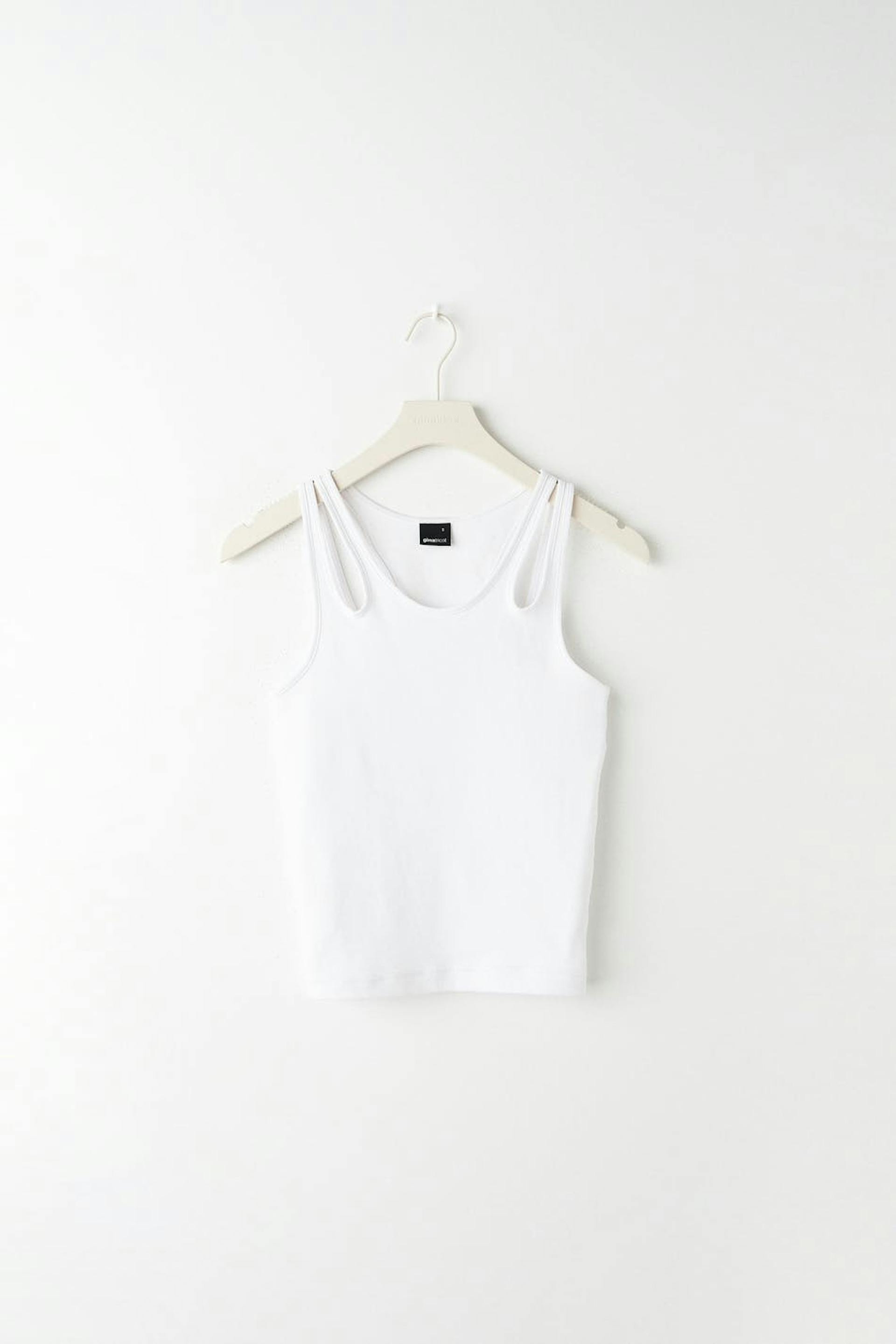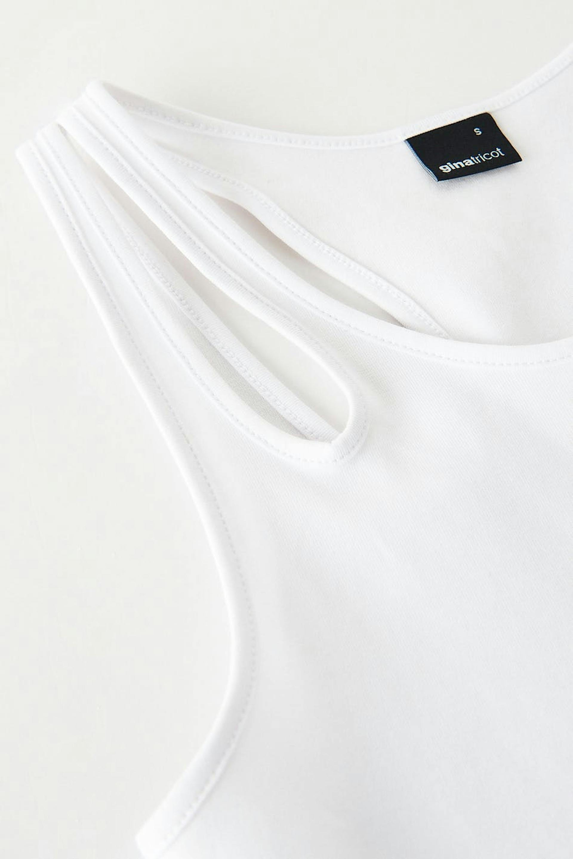 Toppi trikoosta vartalonmyötäisellä istuvuudella. Toppi on valkoinen ja siinä on olkaimet leikeyksityiskohdilla.
