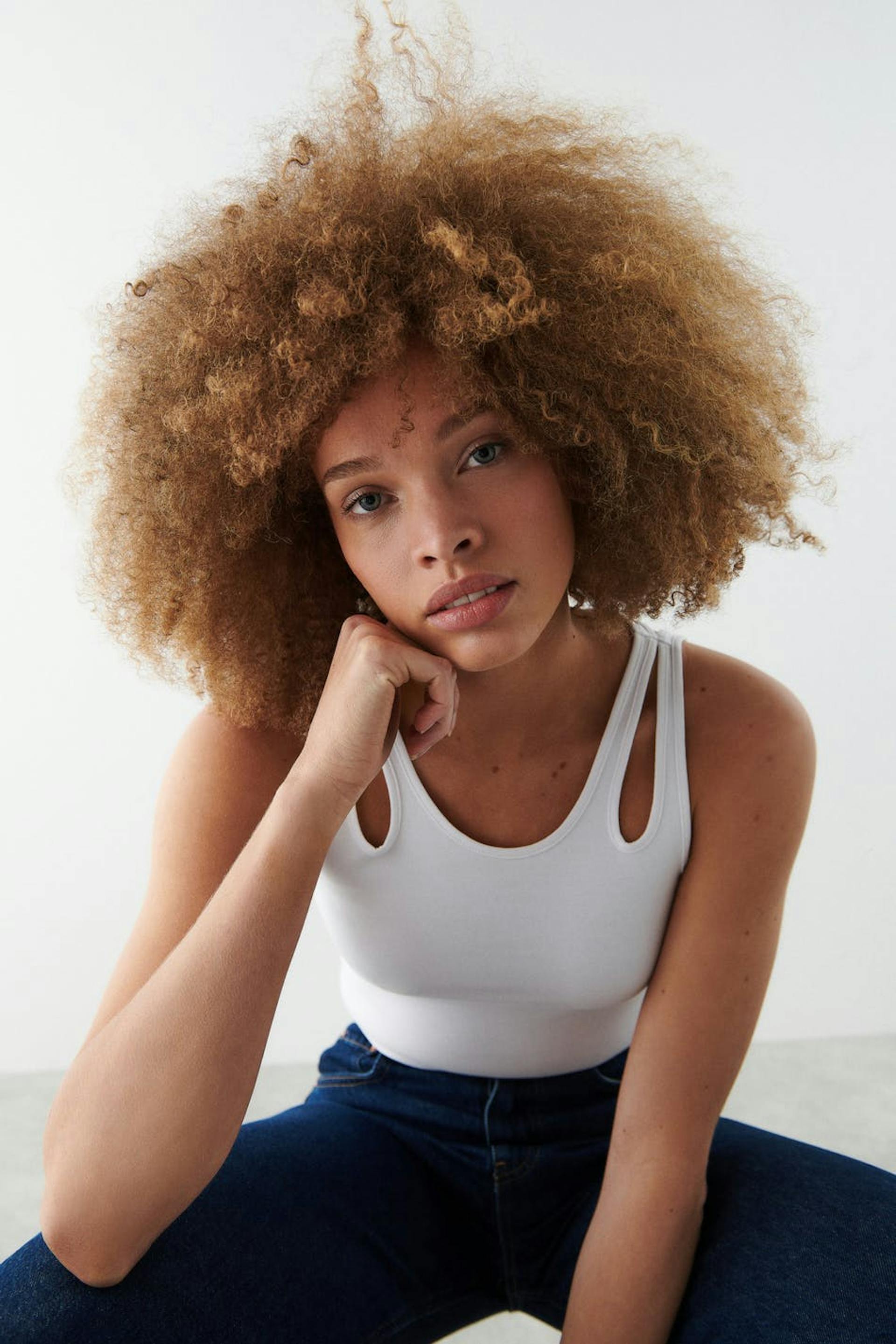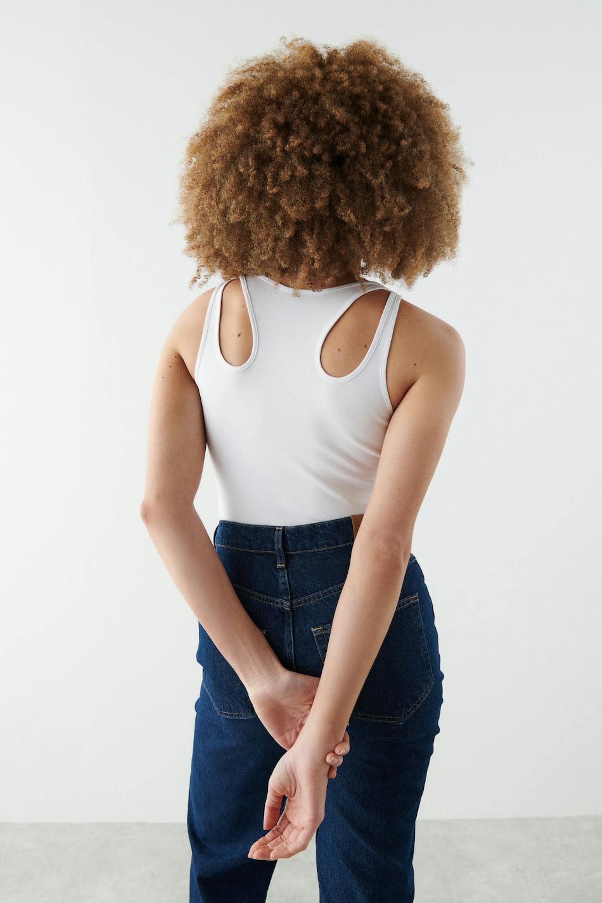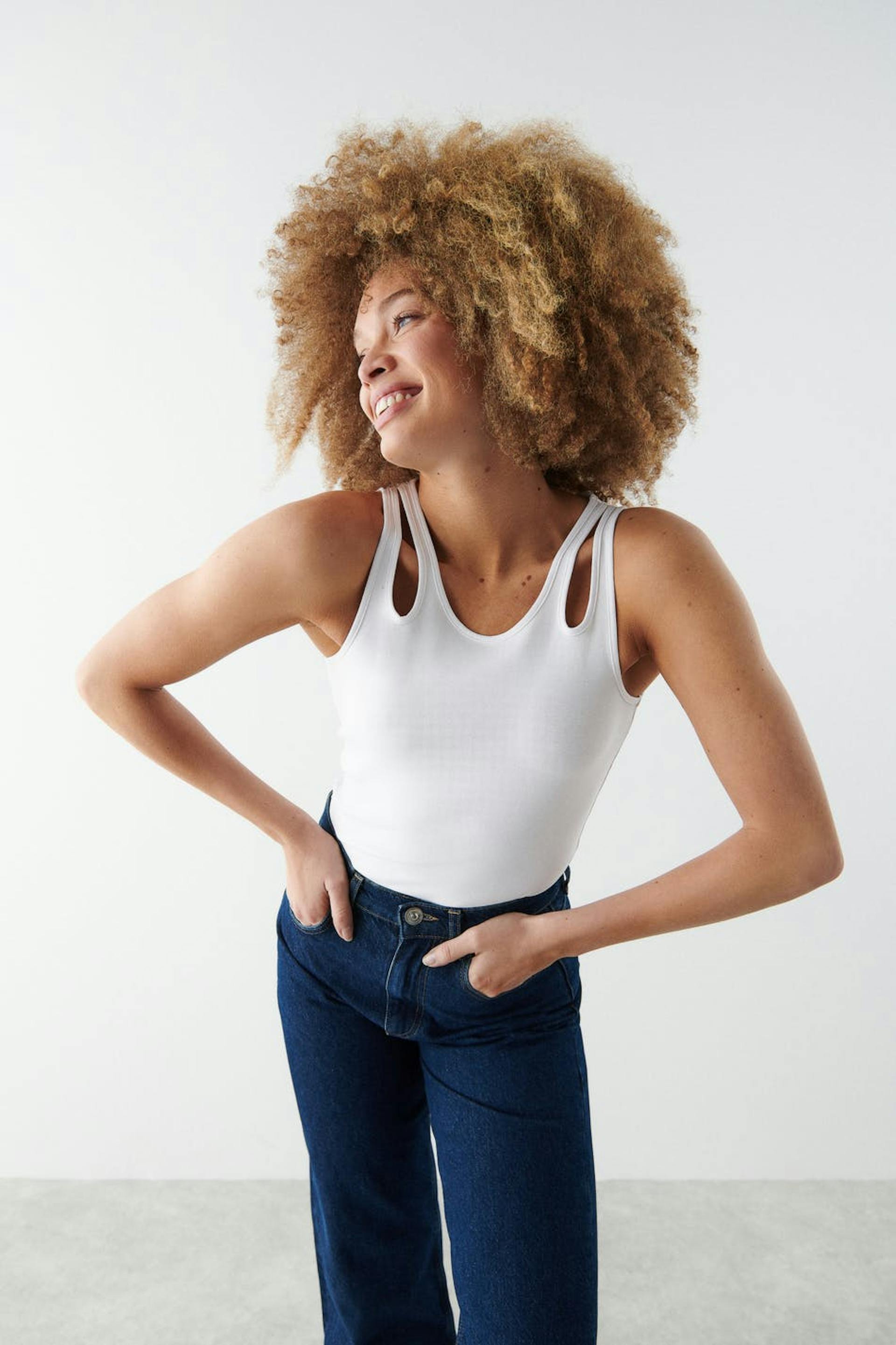 Toppi trikoosta vartalonmyötäisellä istuvuudella. Toppi on valkoinen ja siinä on olkaimet leikeyksityiskohdilla.