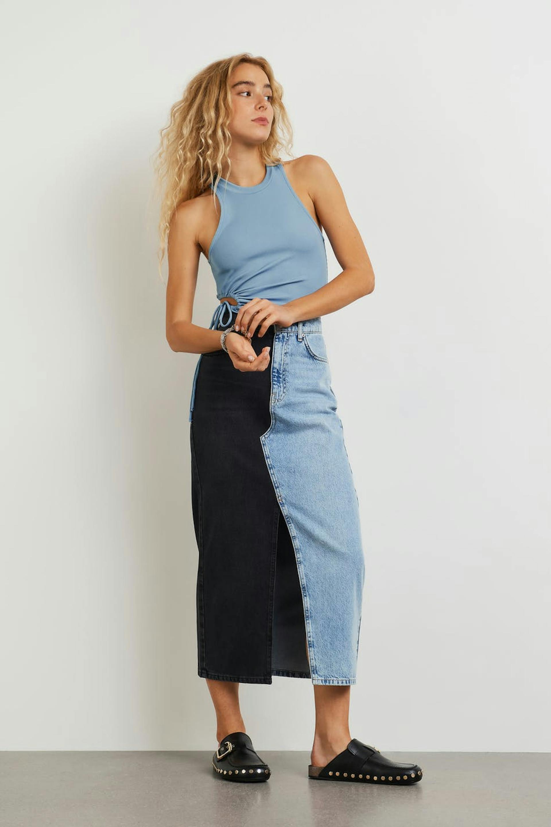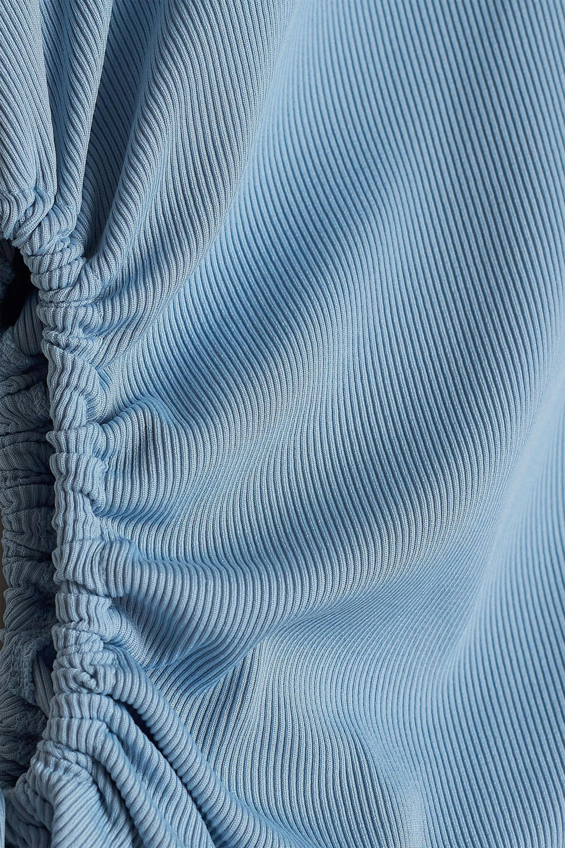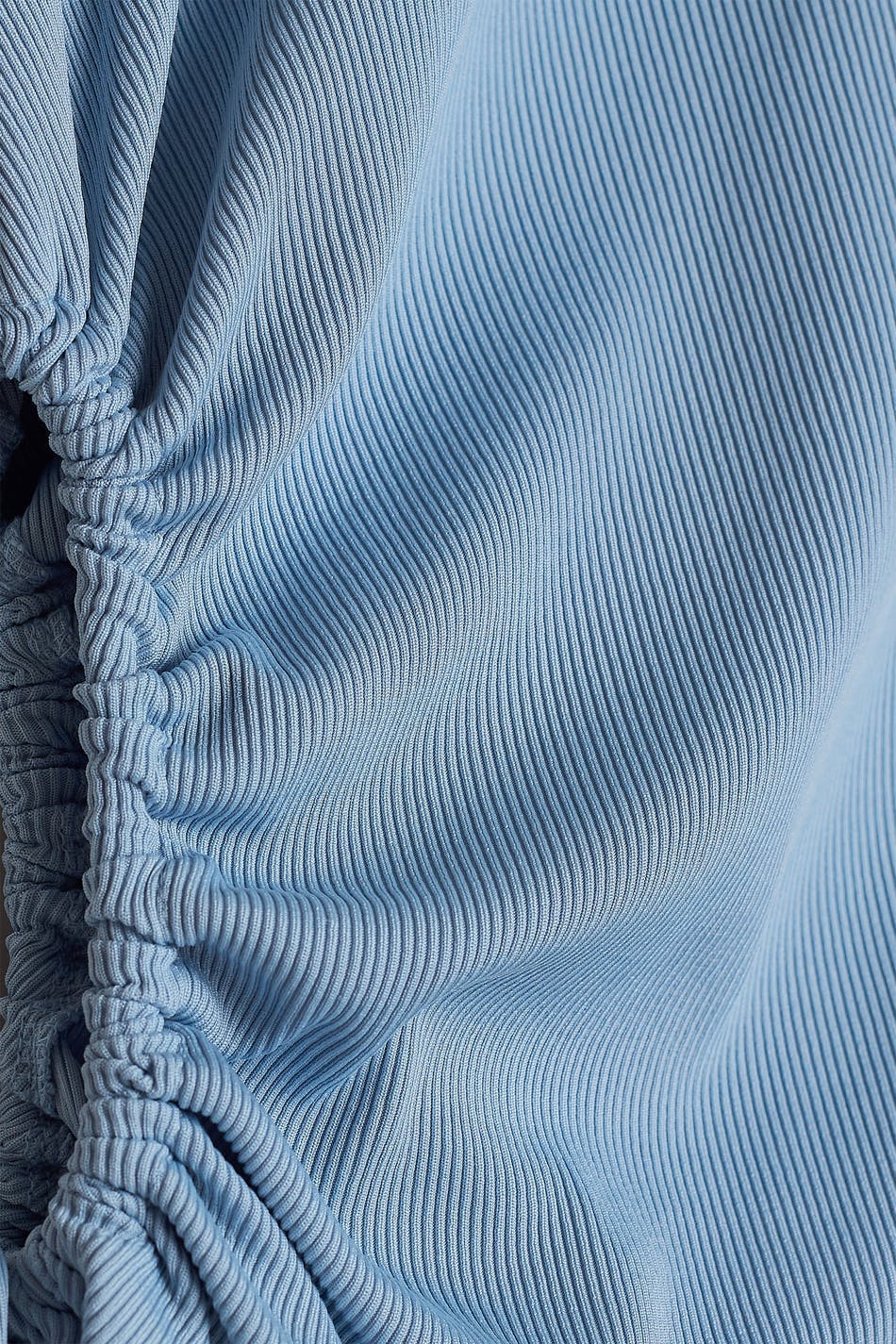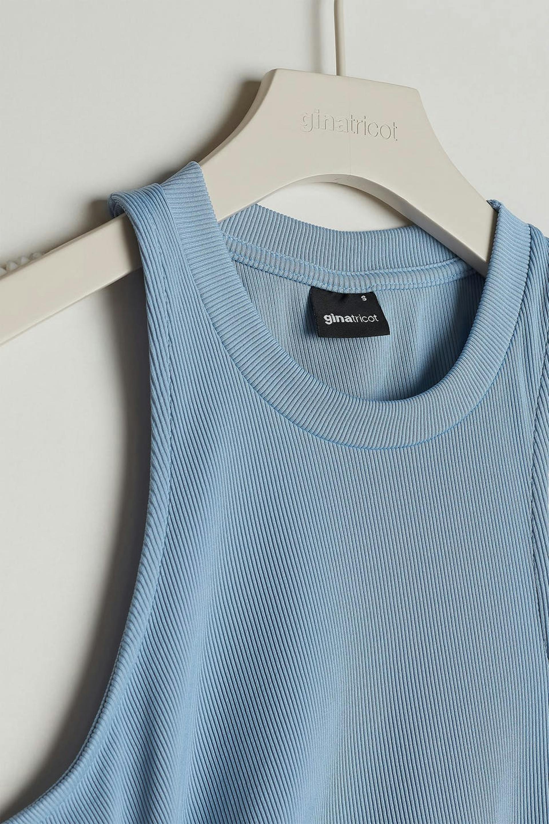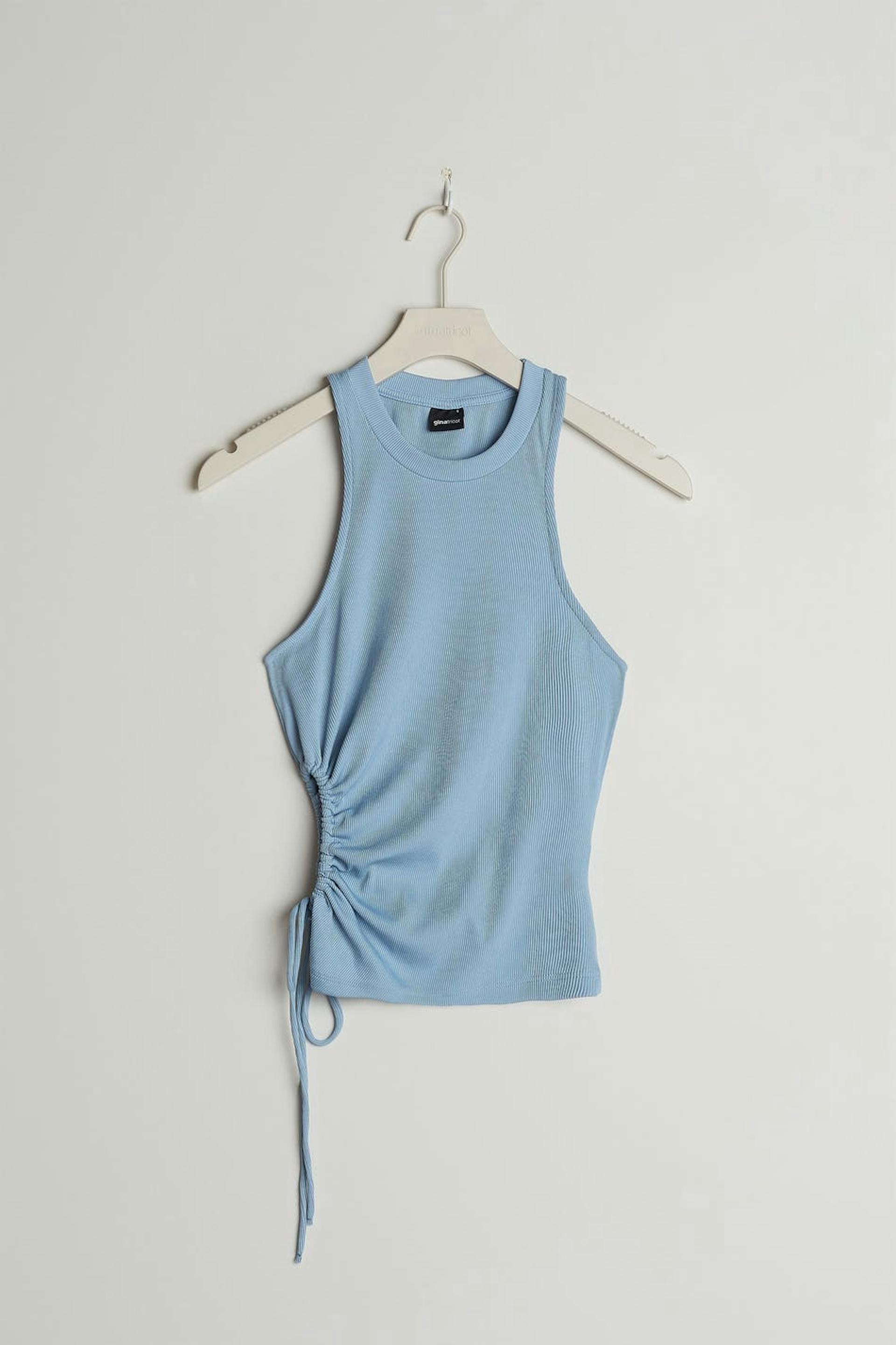 Hihaton toppi vartalonmyötäisellä istuvuudella. Toppi on sininen ja resorimainen. Siinä on leikattu yksityiskohta yhdellä sivulla kiristysnyörillä.